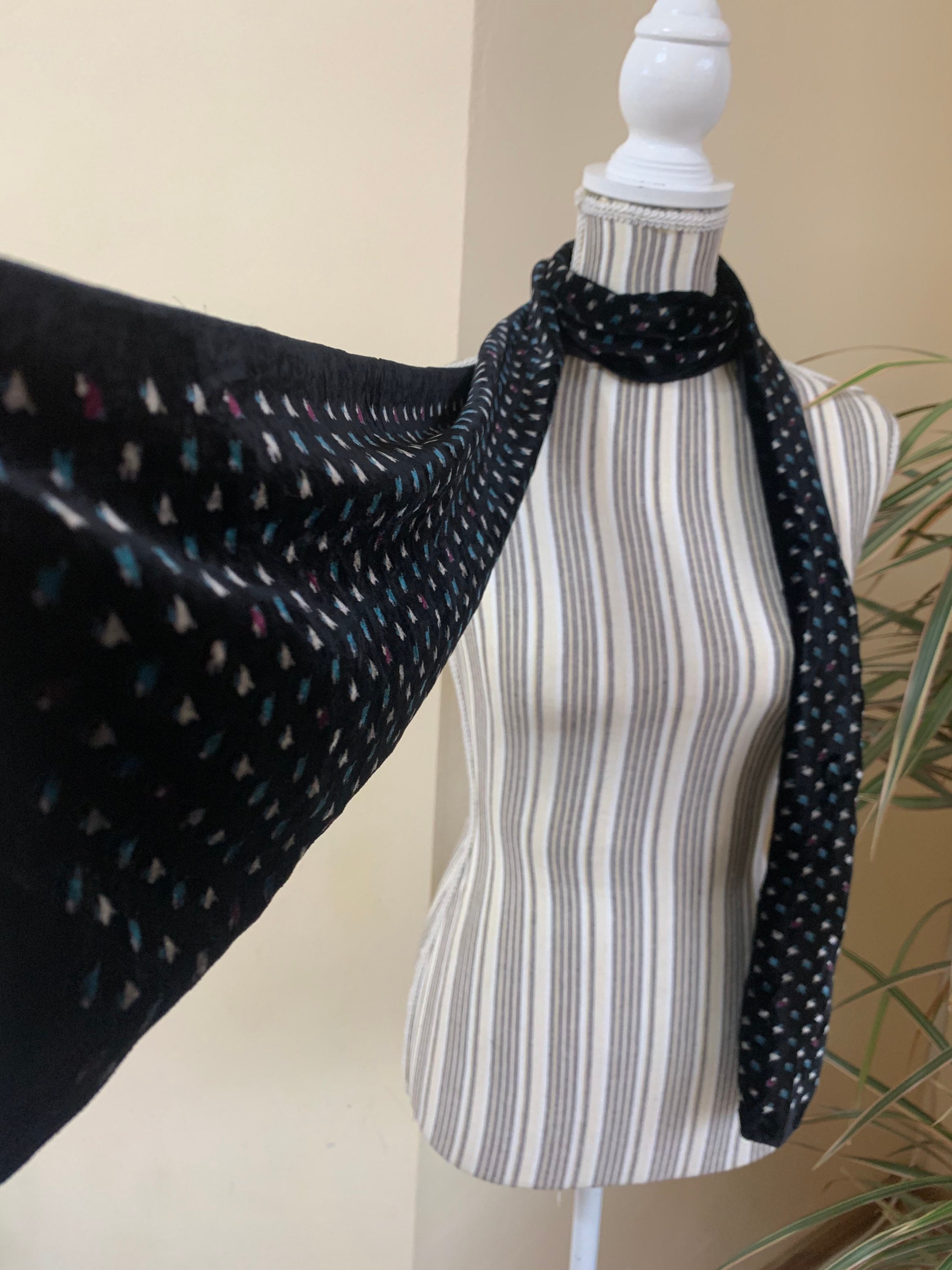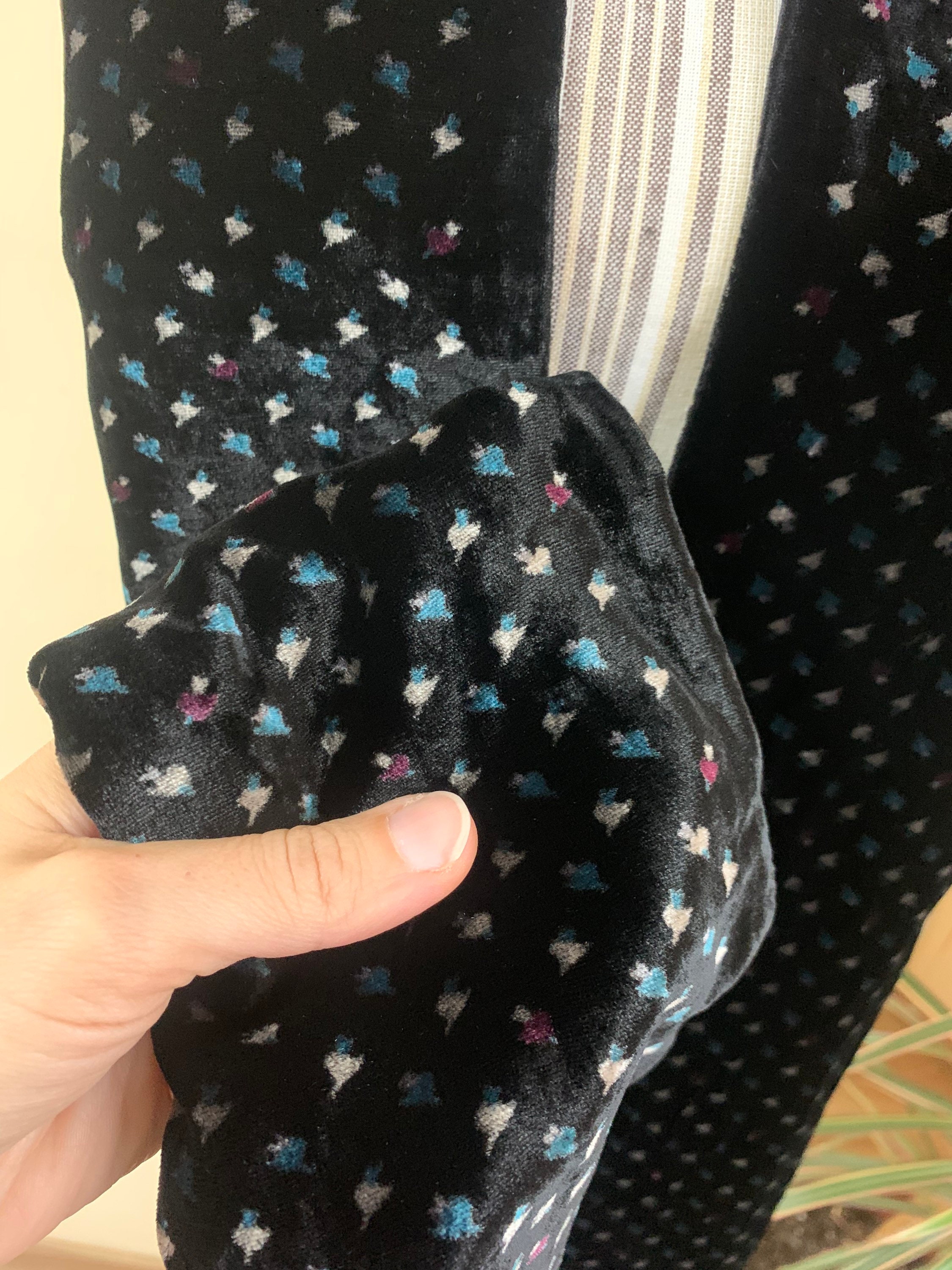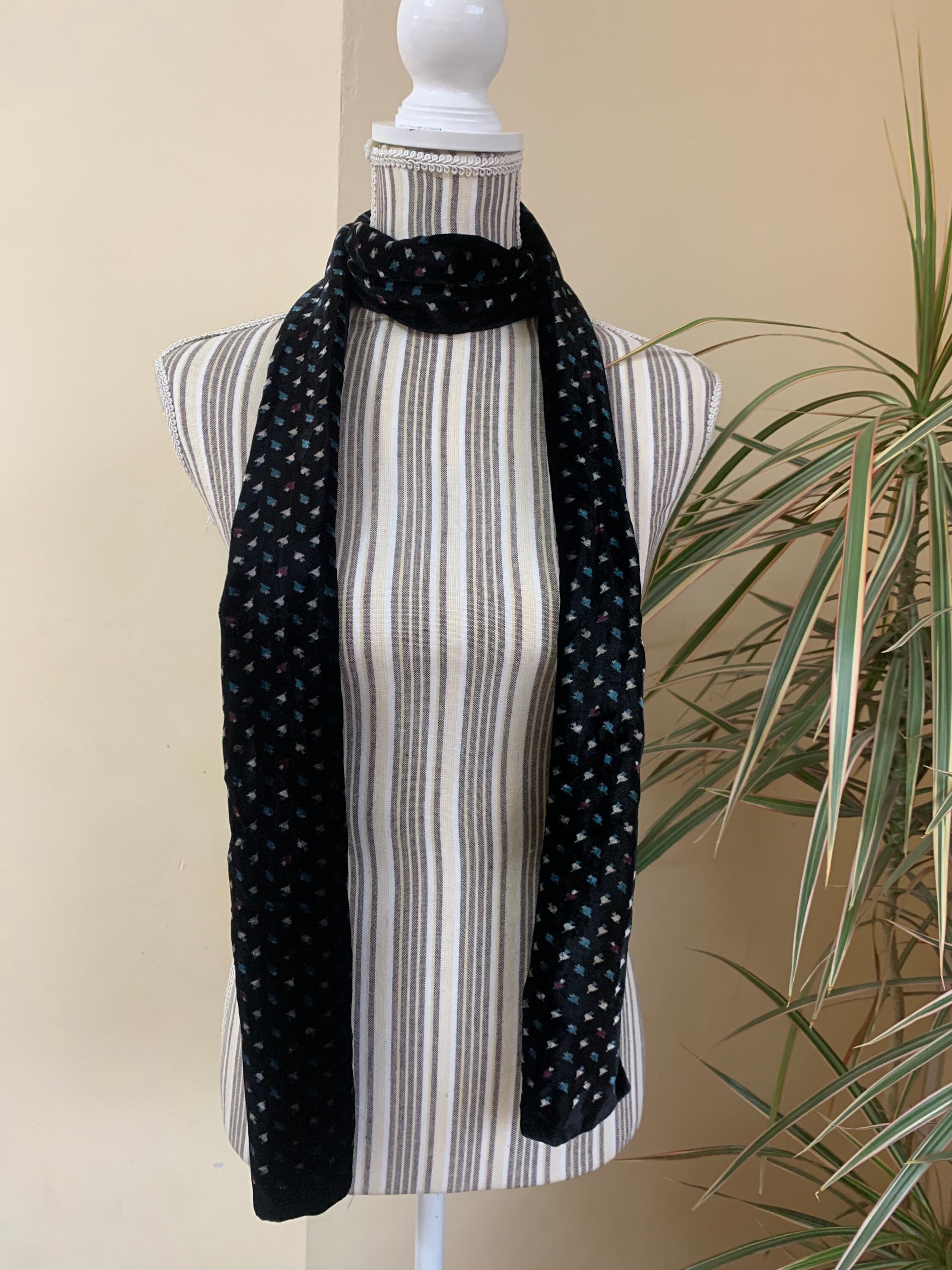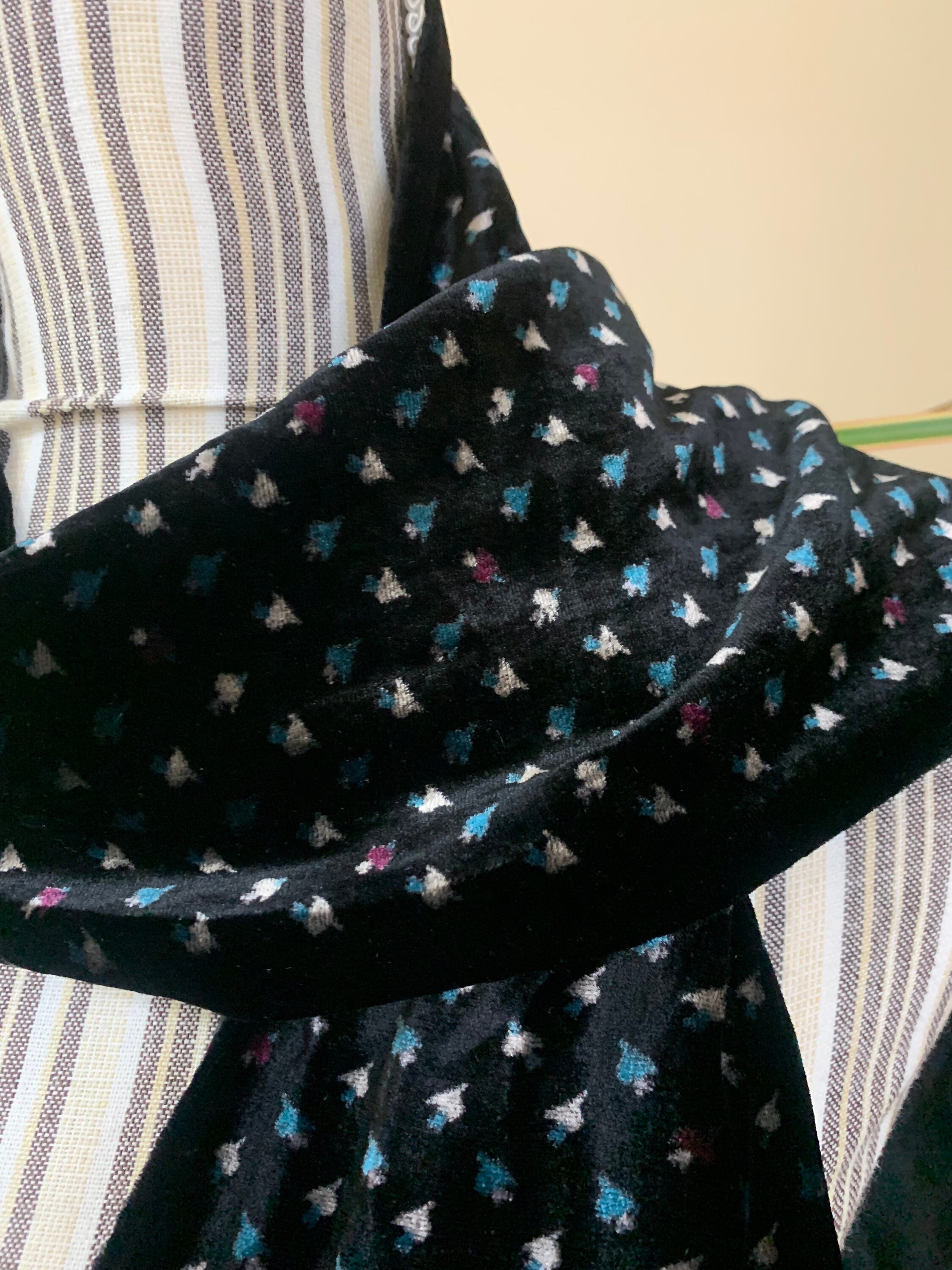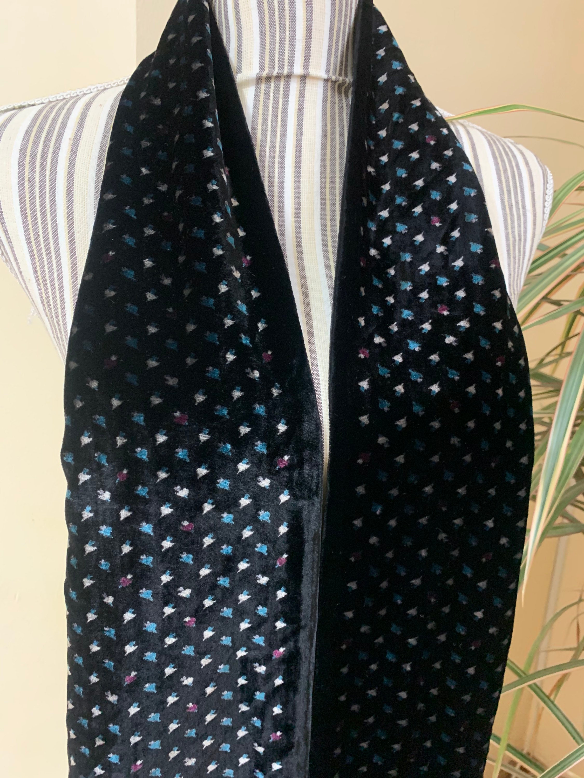 This is a beautiful vintage 90s long black velvet scarf with beautiful tiny floral geometric print with tiny flowers in shades of grey, blue and purple. This slim velvet scarf has black polyester lining. You can wear this velvet accessory as a neck scarf or as a chocker scarf. This evening black velvet scarf shines beautifully when exposed to light. This elegant evening scarf is the perfect accessory for any cocktail party.