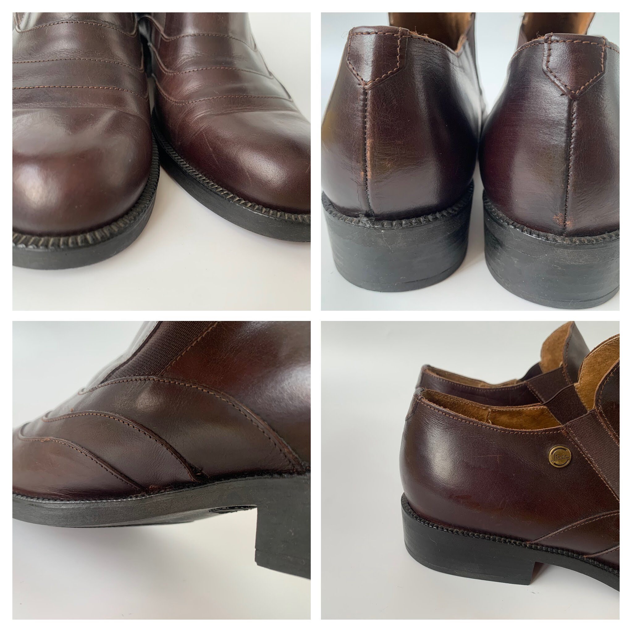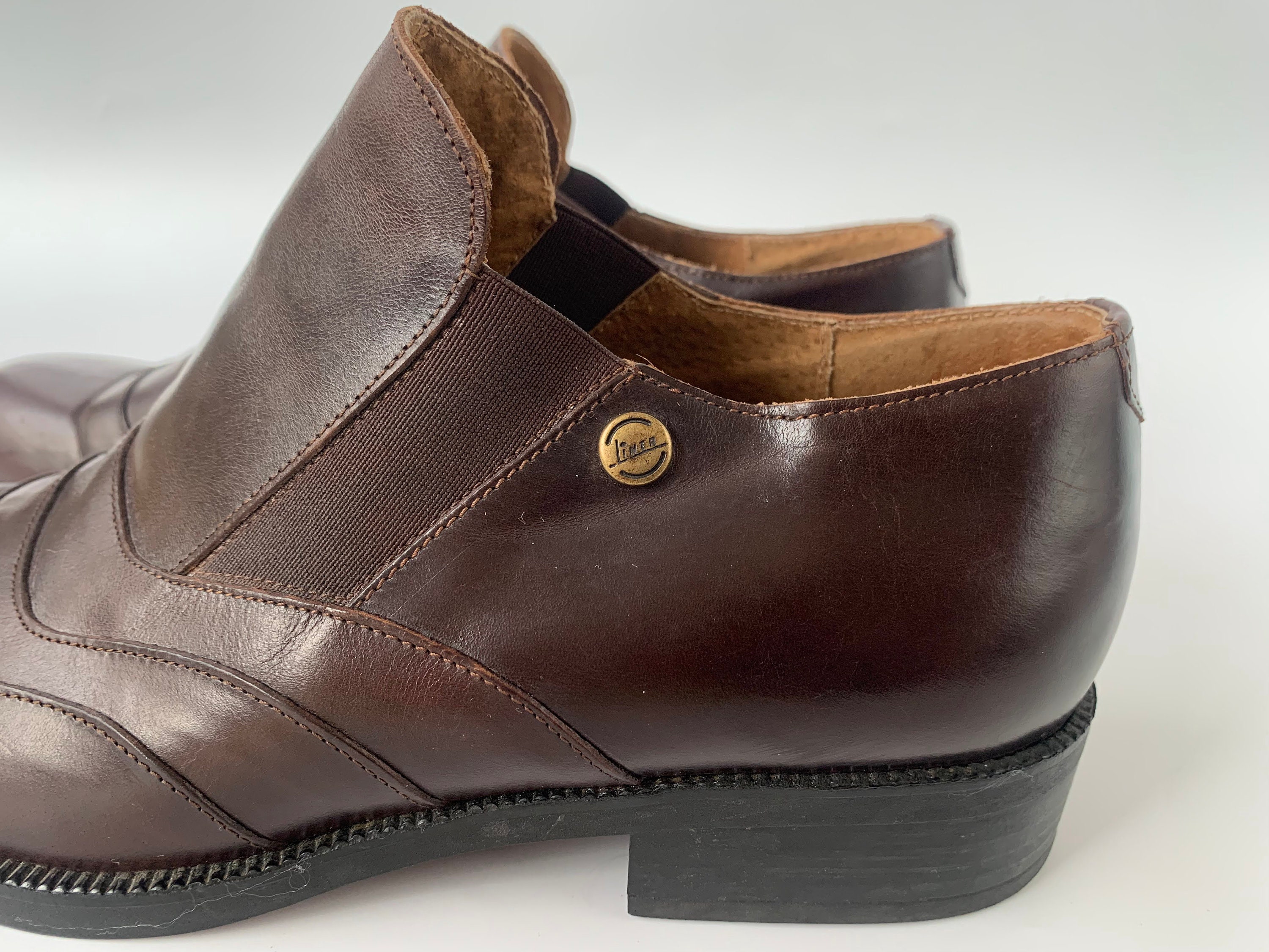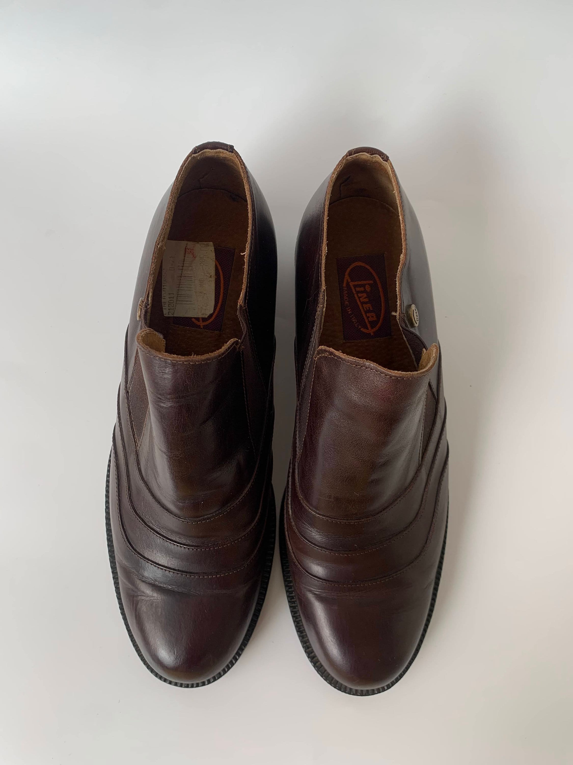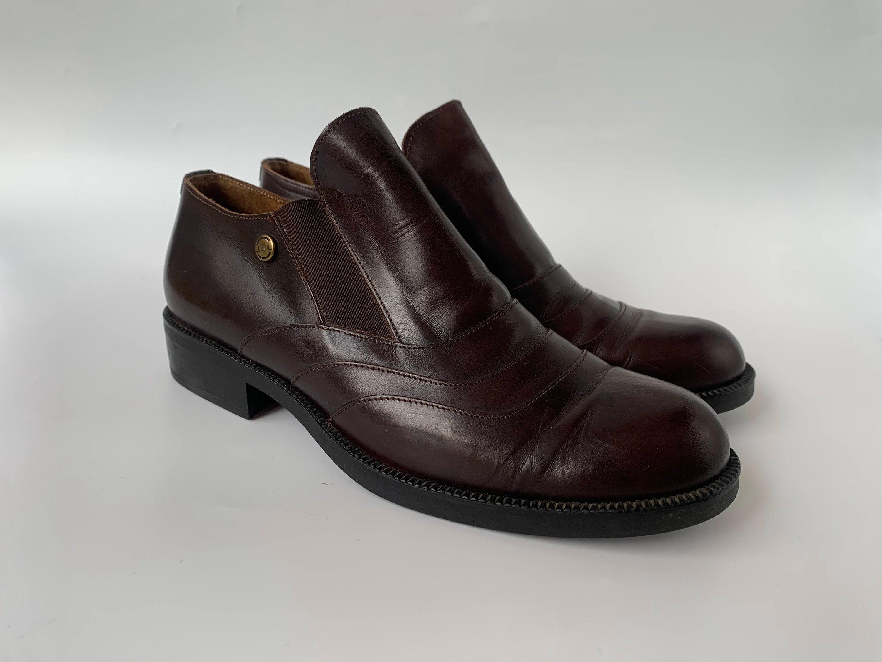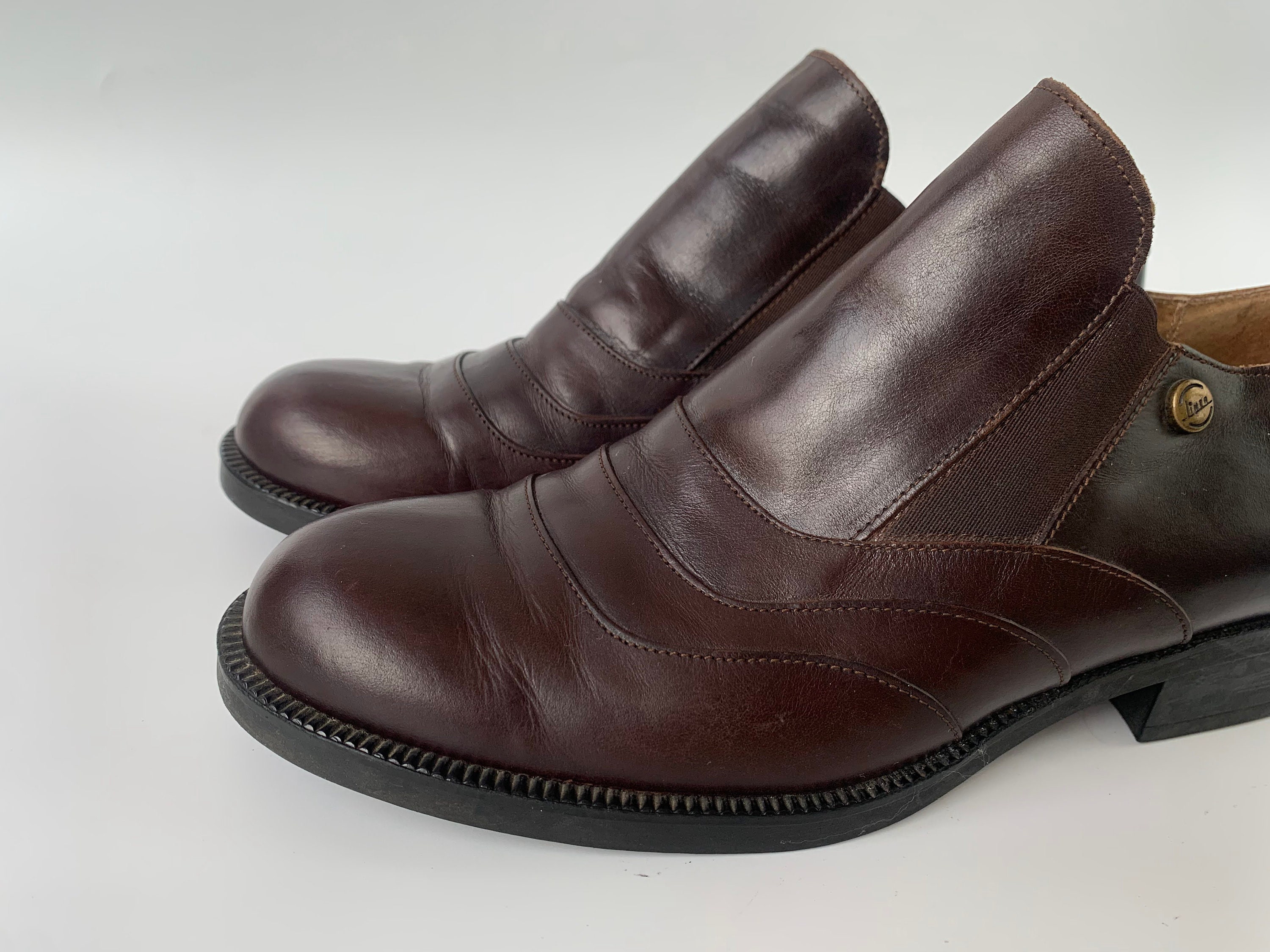 These are vintage 90s flat leather shoes for women made of genuine leather with elastic detailing and rubber soles. These monk style shoes are perfect for the office or academia. With these low heeled oxford shoes you will achieve a business professional look. They will elevate your look no matter what you are wearing. These leather brogue shoes are classic and timeless. These brown leather shoes are by the brand Linea. They were made in Italy. The size marked is 39. They fit like UK 6, US 8. Please check the measurements below.