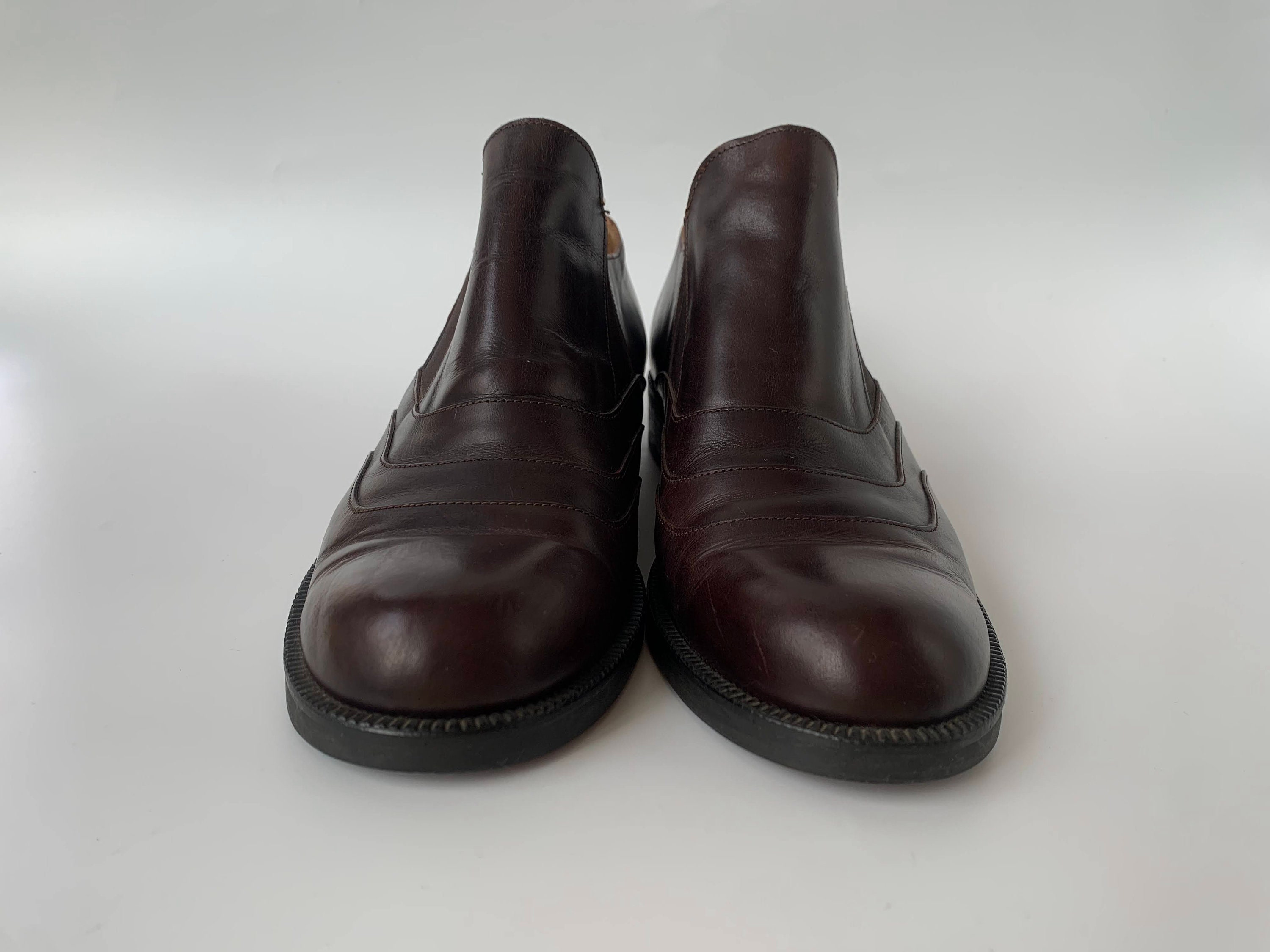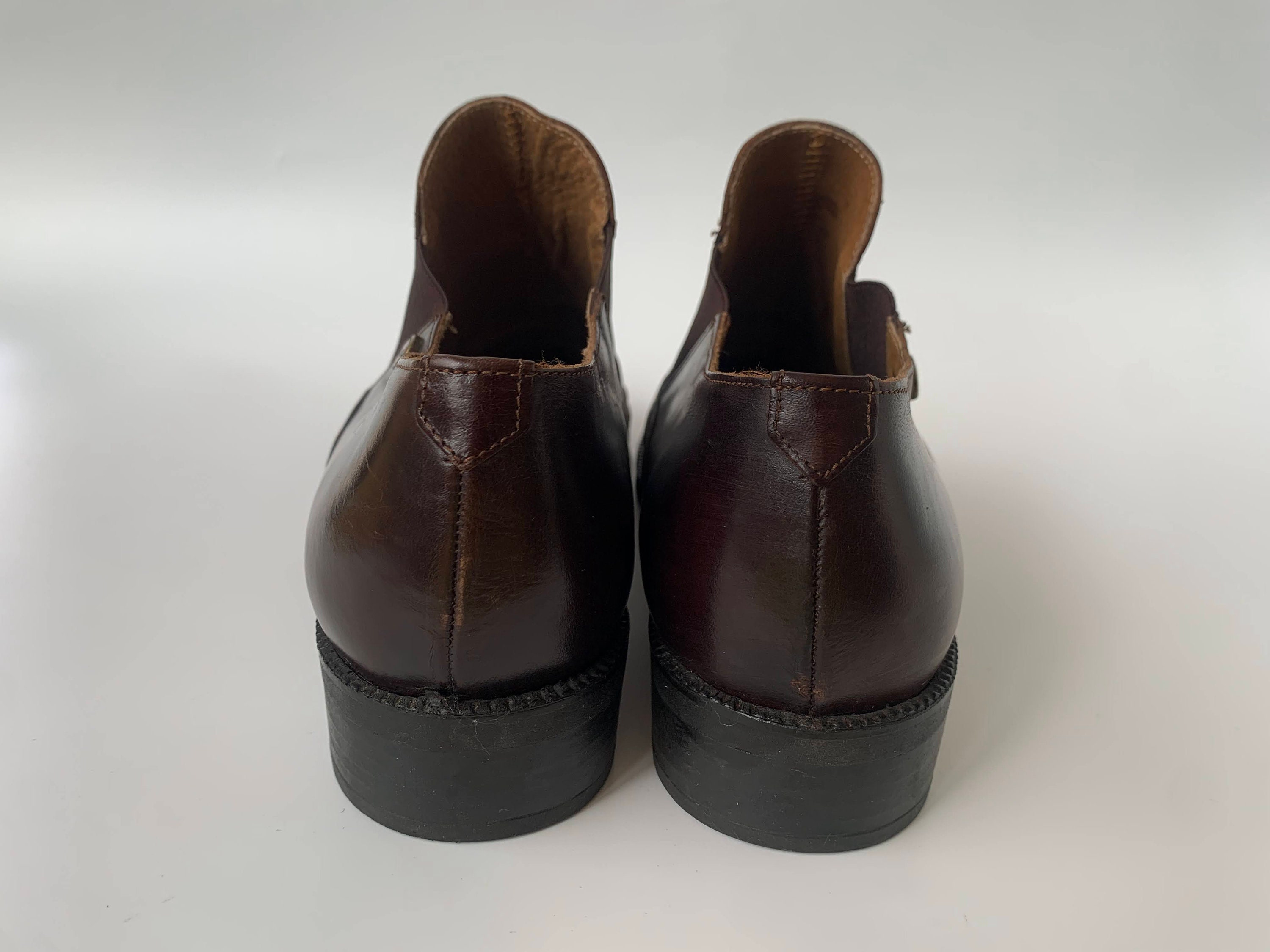 Condition: These flat leather shoes show some signs of wear. The leather has some scratches here and there on the leather surface, especially around he toes and the heels. There is a tiny bit of loose thread on the inner side of the right shoe (about 0.5 cm/ 0.2"). I have tried to capture these signs of wear in the close up photos.