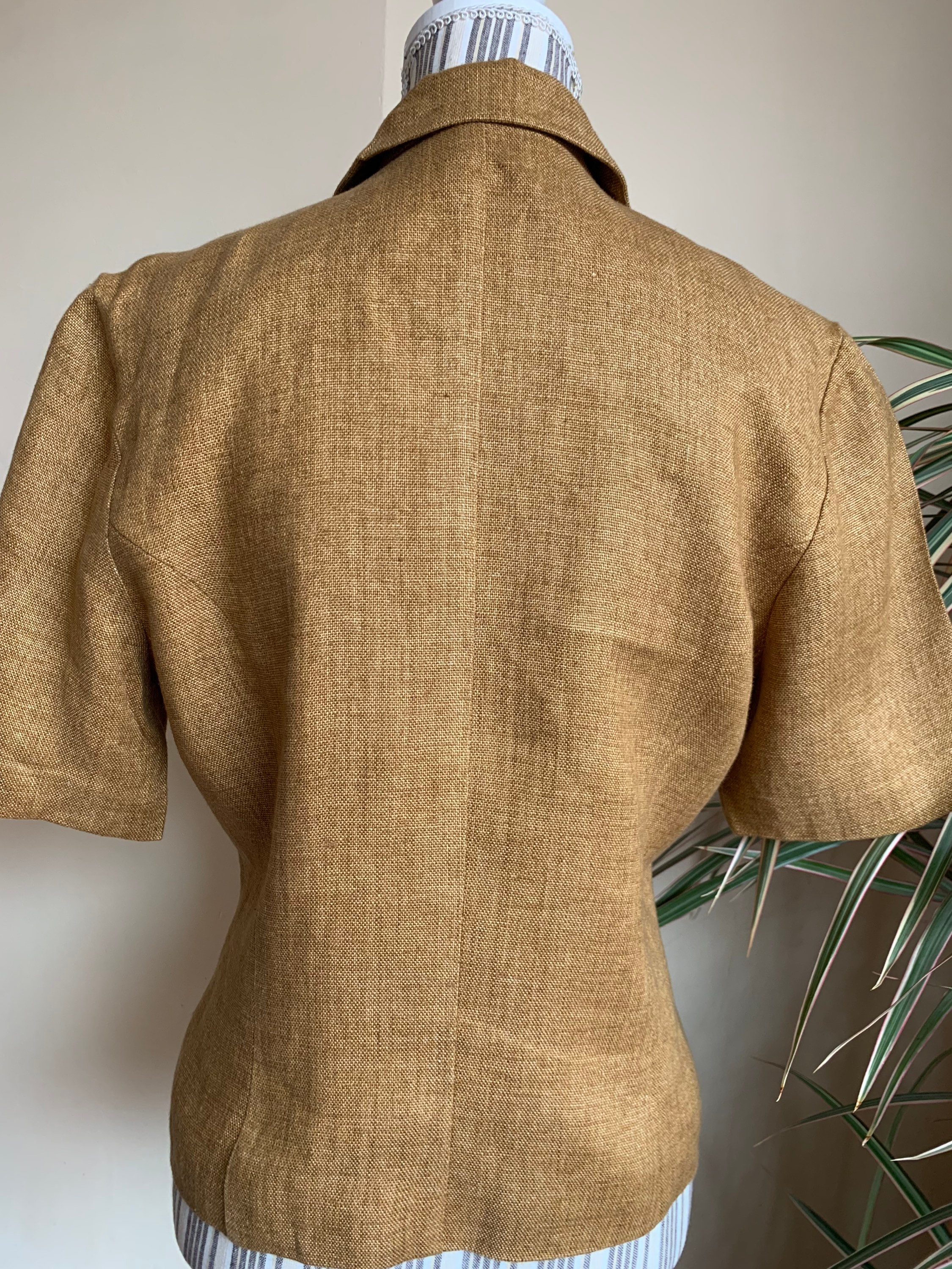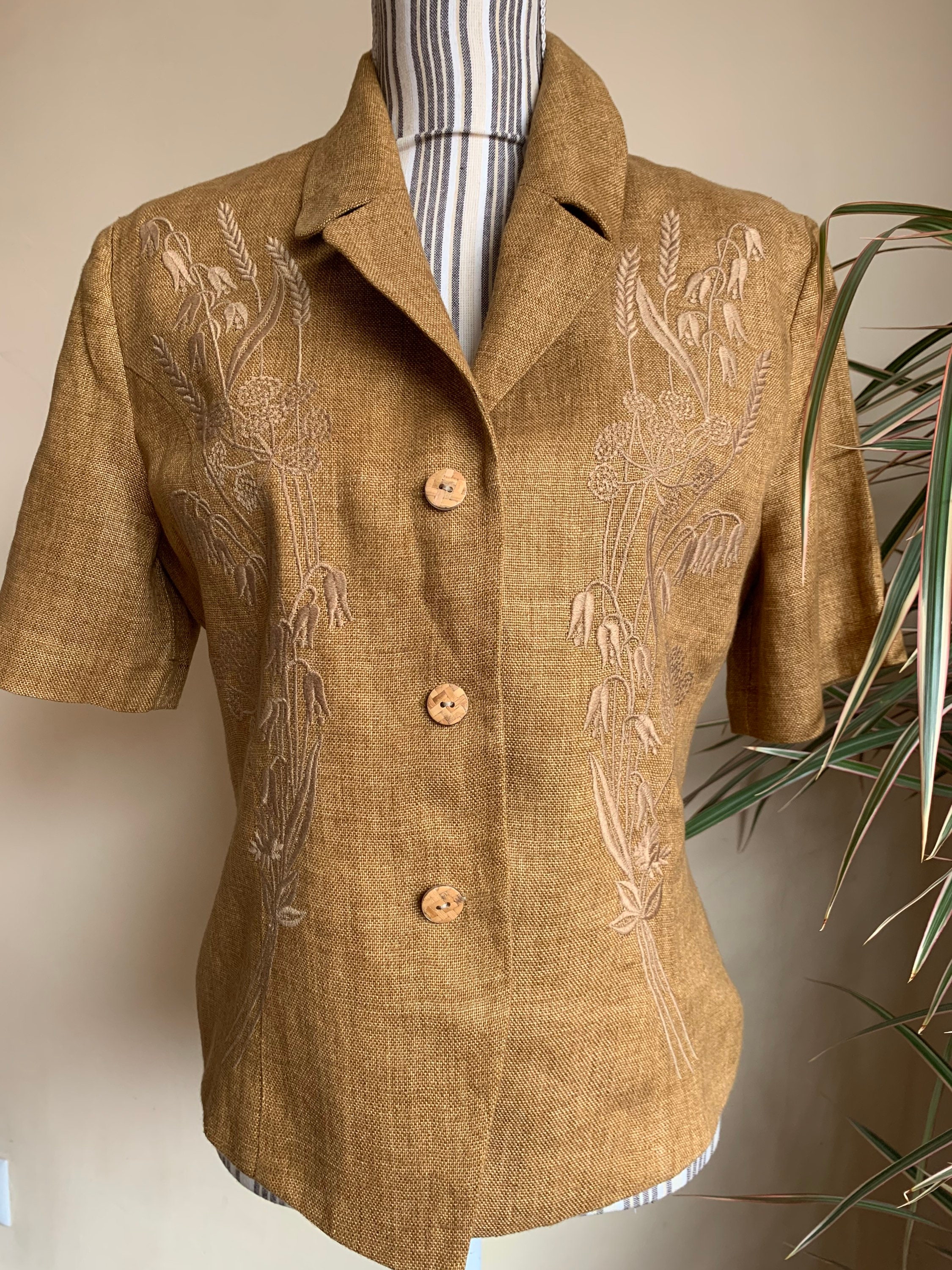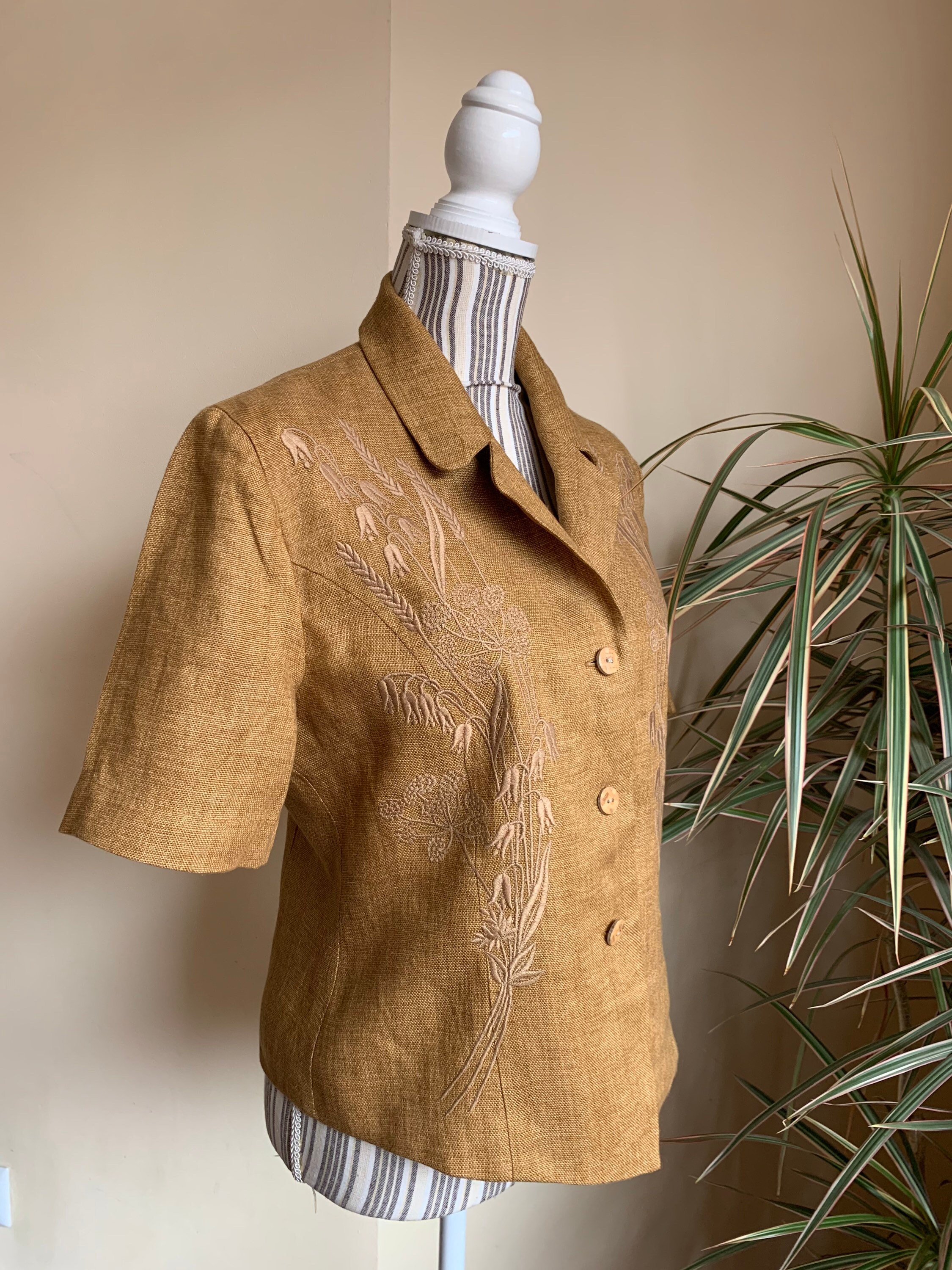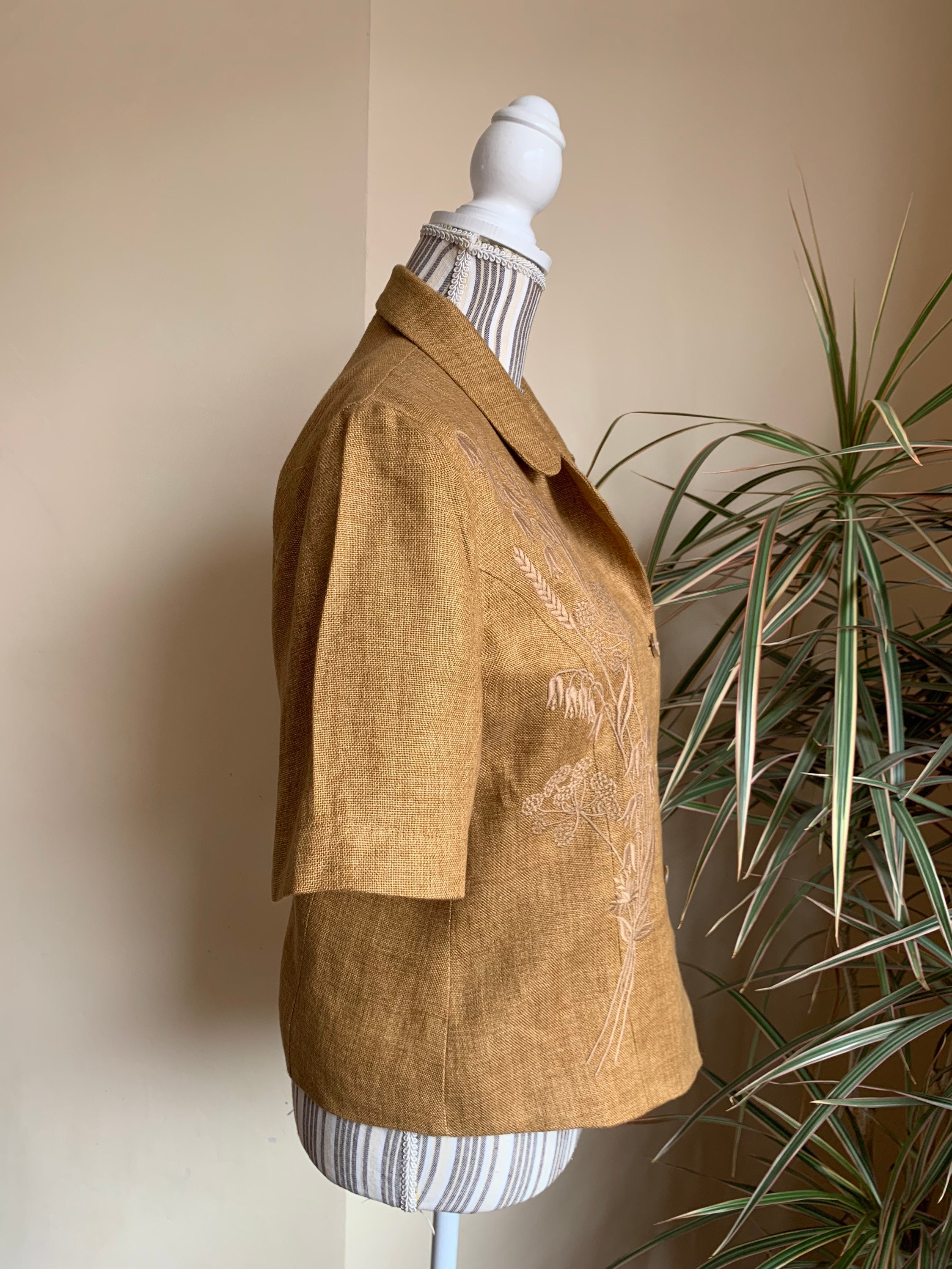 This is a beautiful vintage 90s short sleeve linen blazer by Betty Barclay. This tobacco brown summer coat is made of linen blend fabric. This summer linen jacket has no other label besides the brand, but the fabric feels like linen or linen blend. This lightweight summer coat has beautiful embroidery decoration at the front and button front closure. There is no size marked, it fits like size L, please check the measurements below.