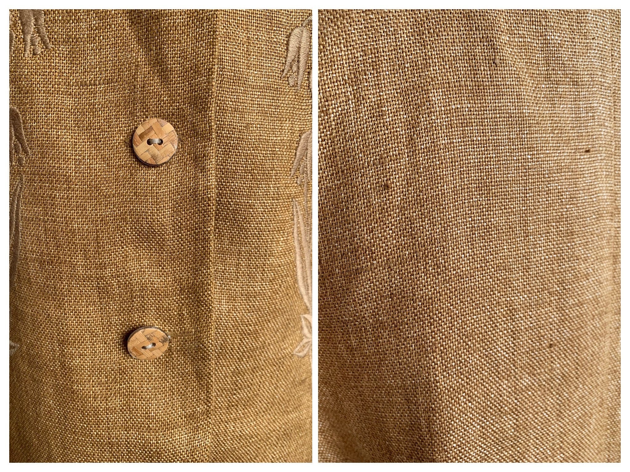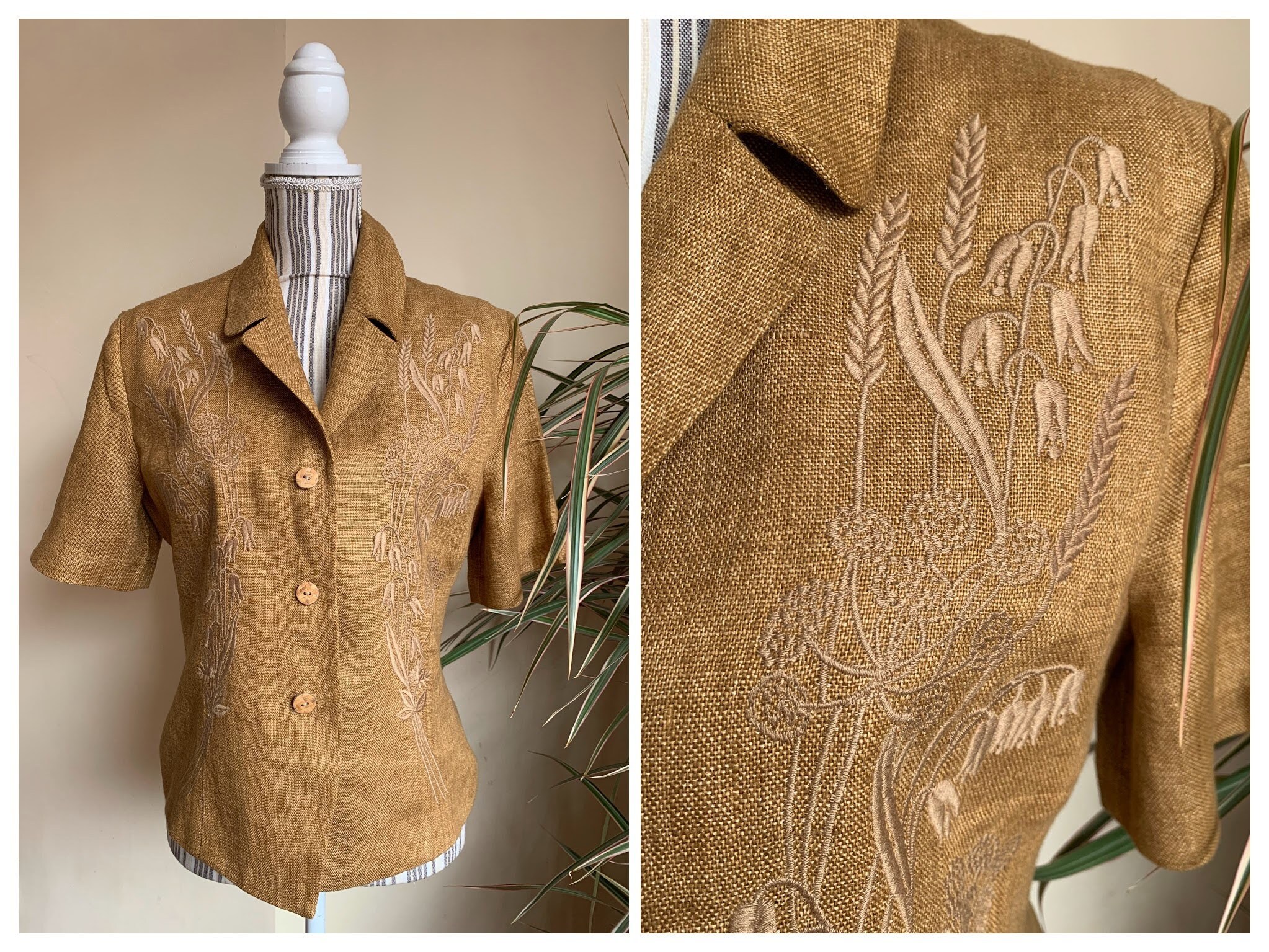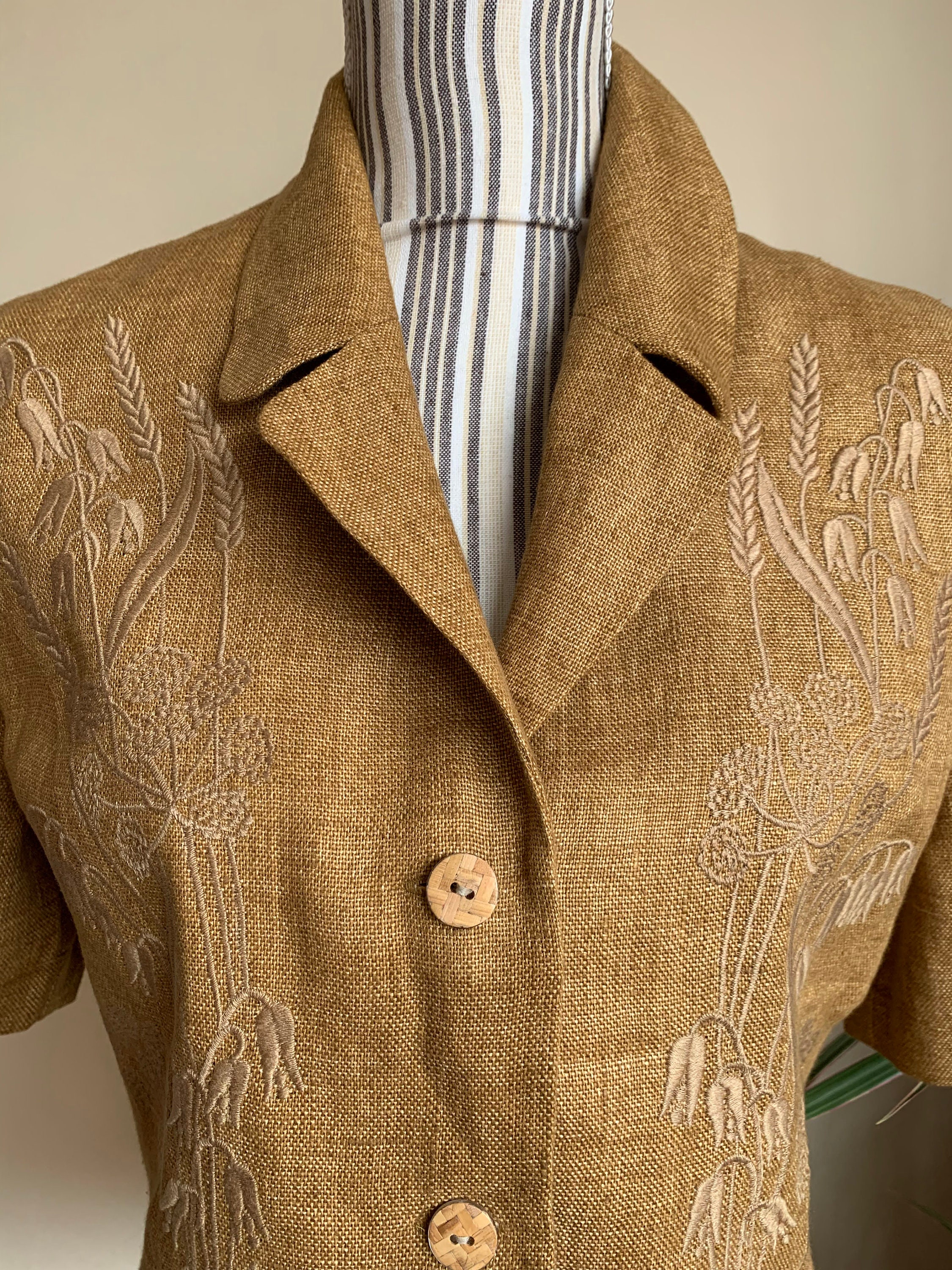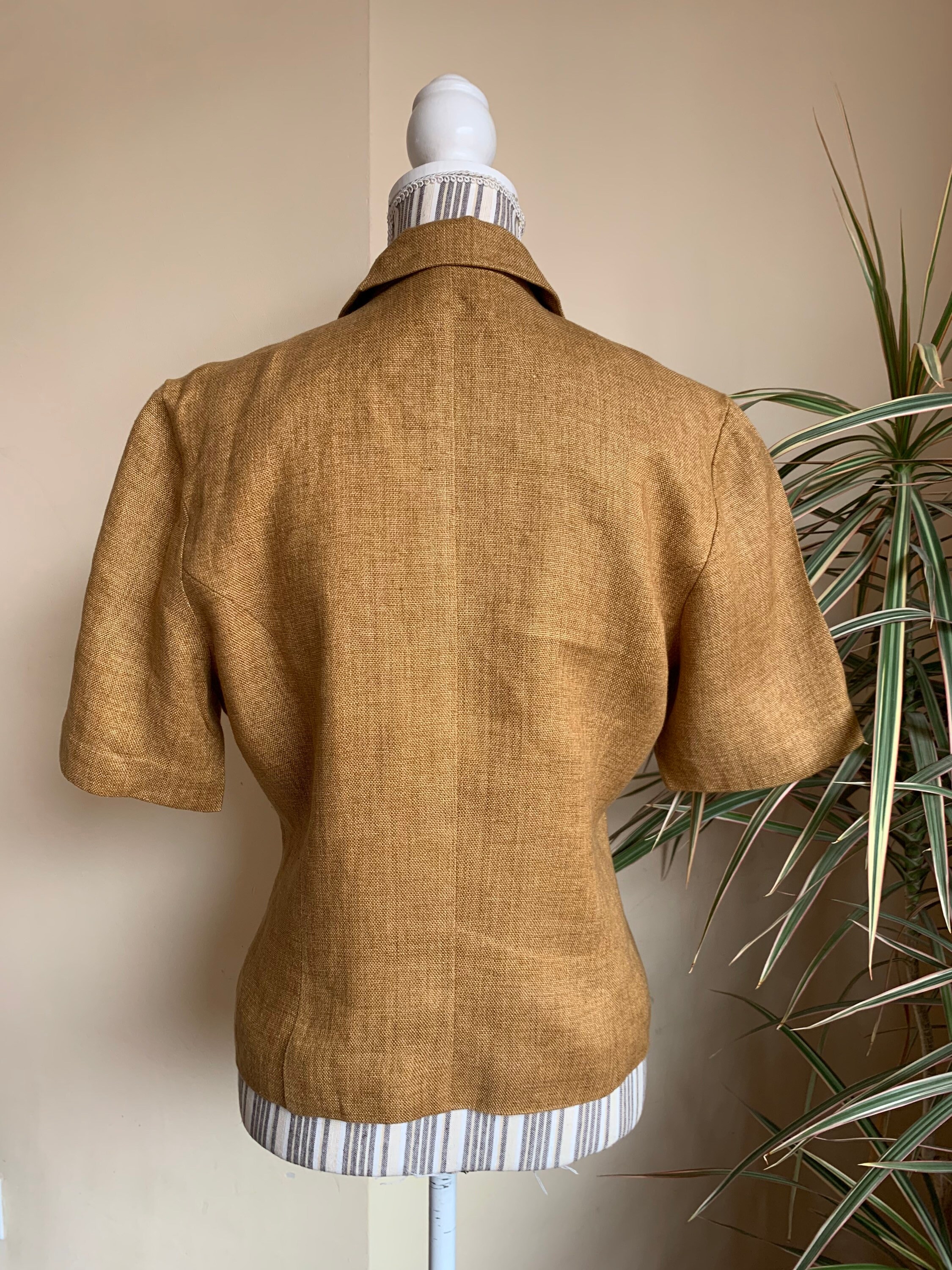This is a beautiful vintage 90s short sleeve linen blazer by Betty Barclay. This tobacco brown summer coat is made of linen blend fabric. This summer linen jacket has no other label besides the brand, but the fabric feels like linen or linen blend. This lightweight summer coat has beautiful embroidery decoration at the front and button front closure. There is no size marked, it fits like size L, please check the measurements below.