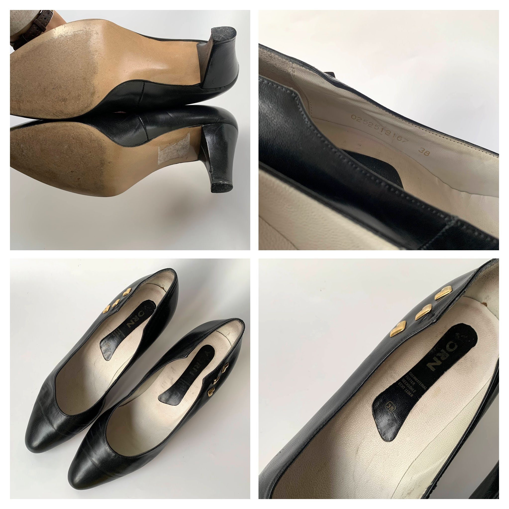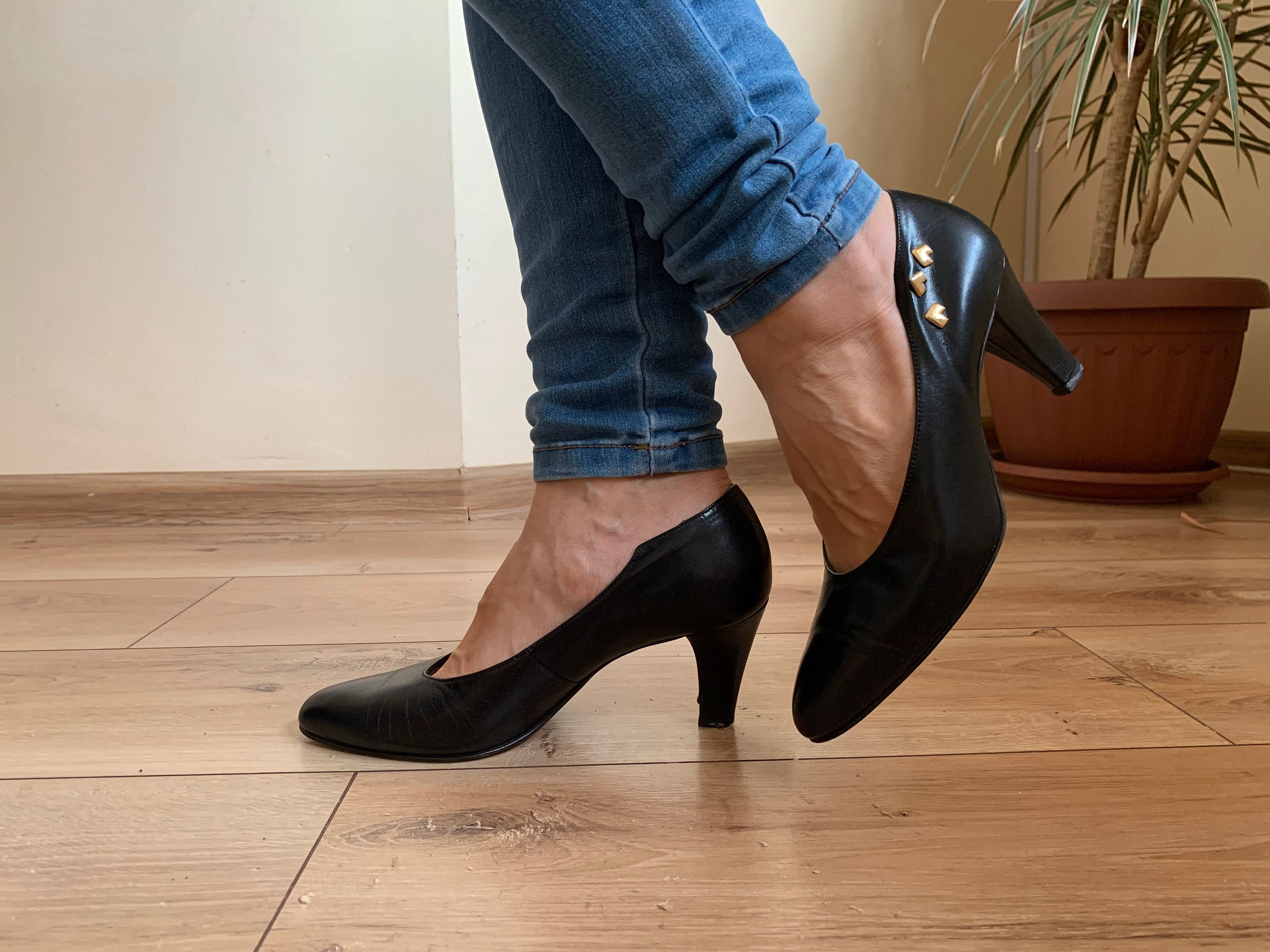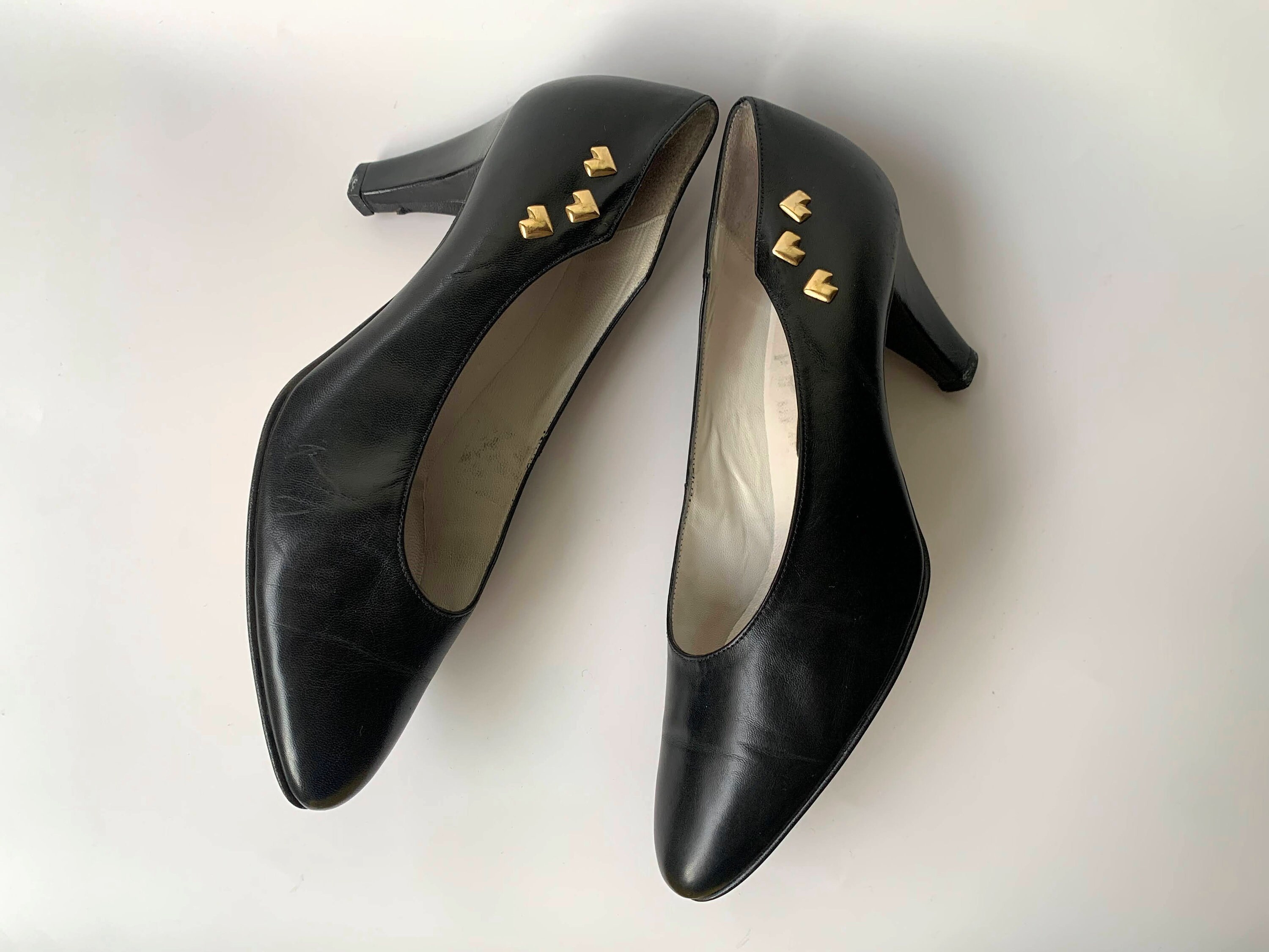 These are vintage black leather shoes with pointy toes and kitten heels. These high heel shoes are made of black genuine leather with gold heart shaped accents. These elegant pumps are size 38, they fit like UK 5, US 7. Please check the measurements below.