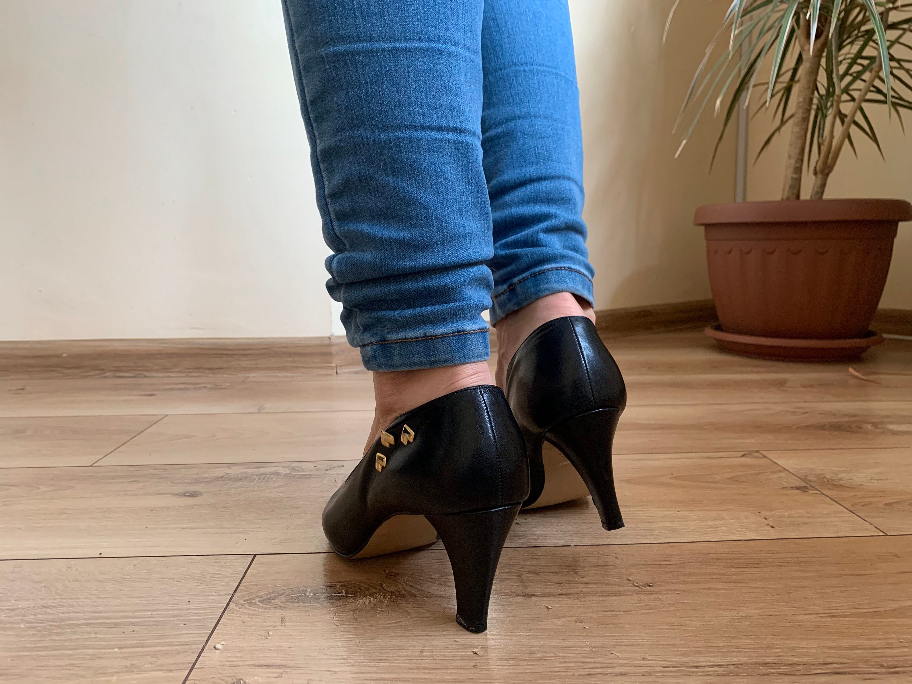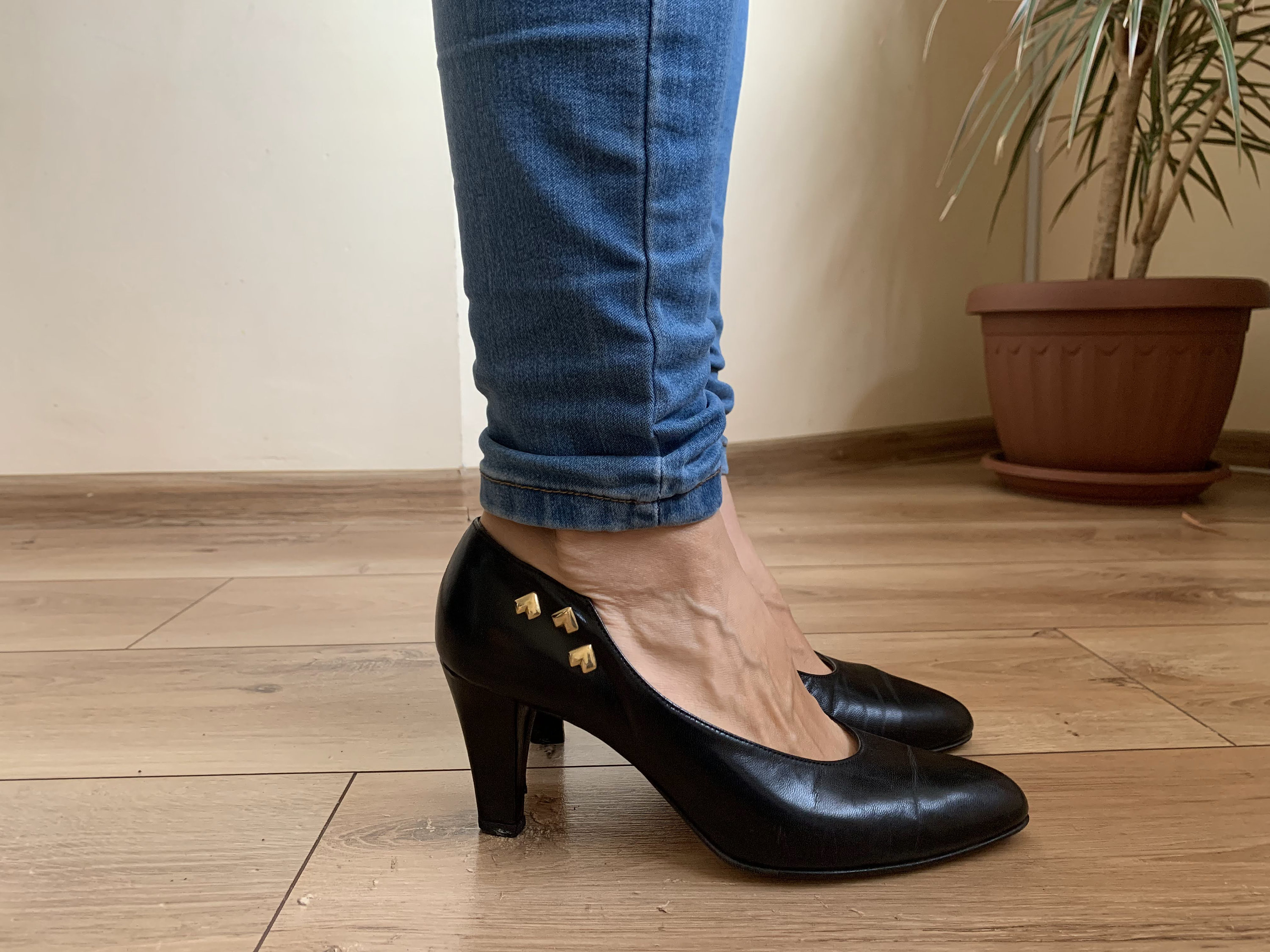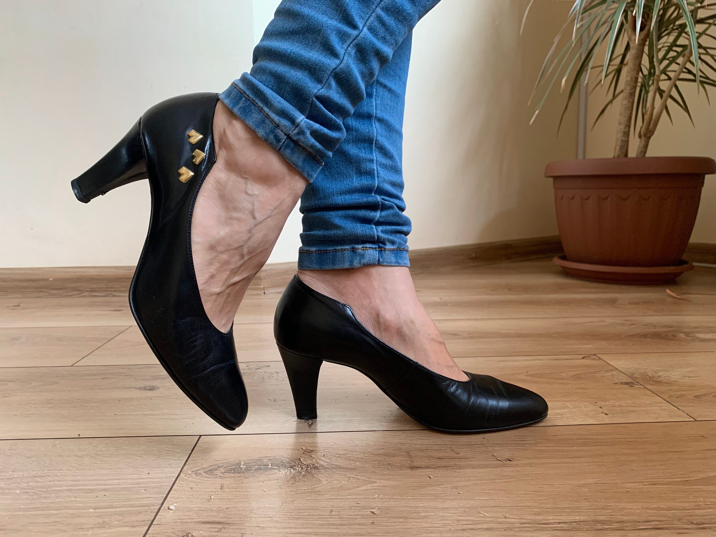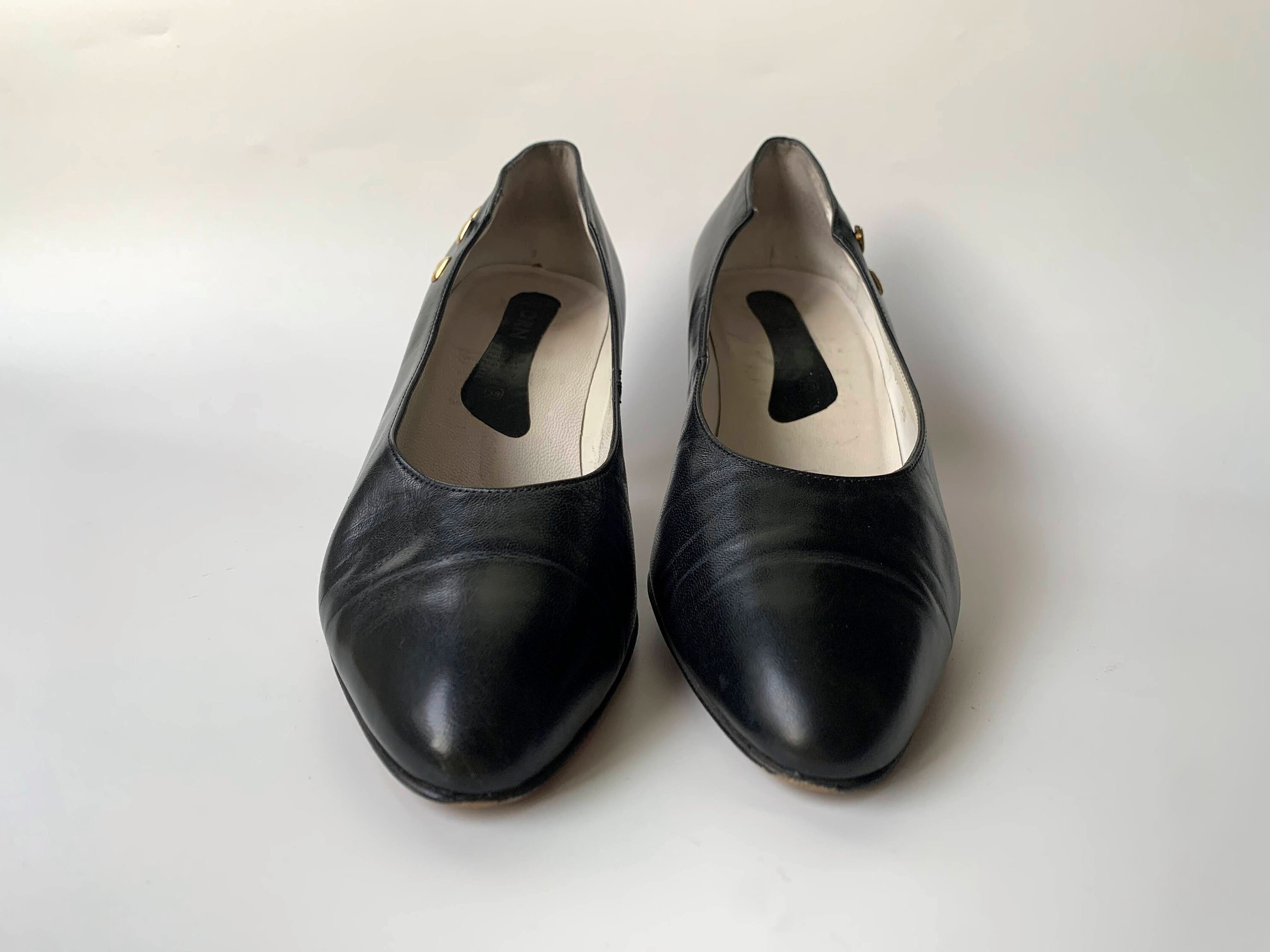 These are vintage black leather shoes with pointy toes and kitten heels. These high heel shoes are made of black genuine leather with gold heart shaped accents. These elegant pumps are size 38, they fit like UK 5, US 7. Please check the measurements below.