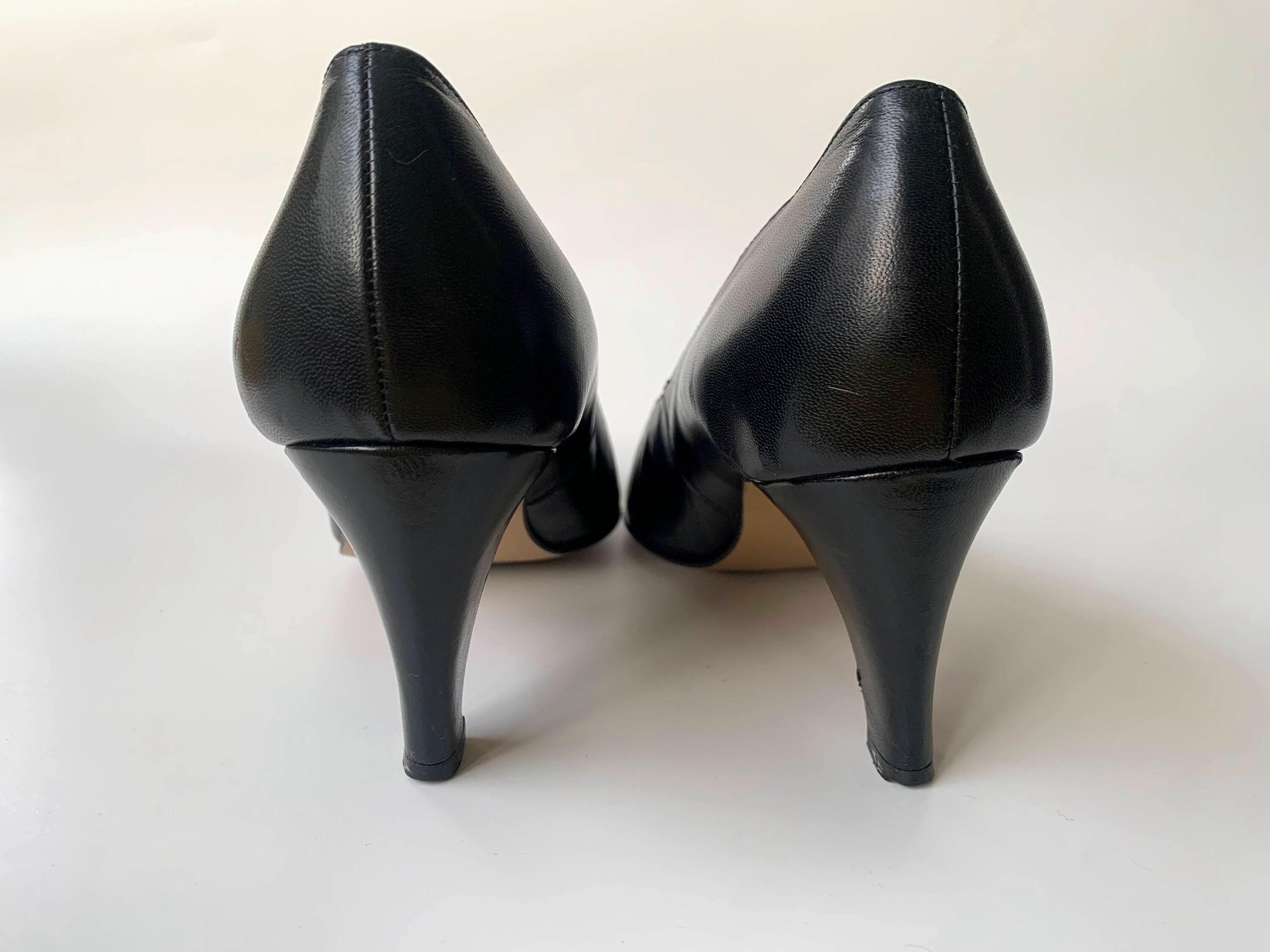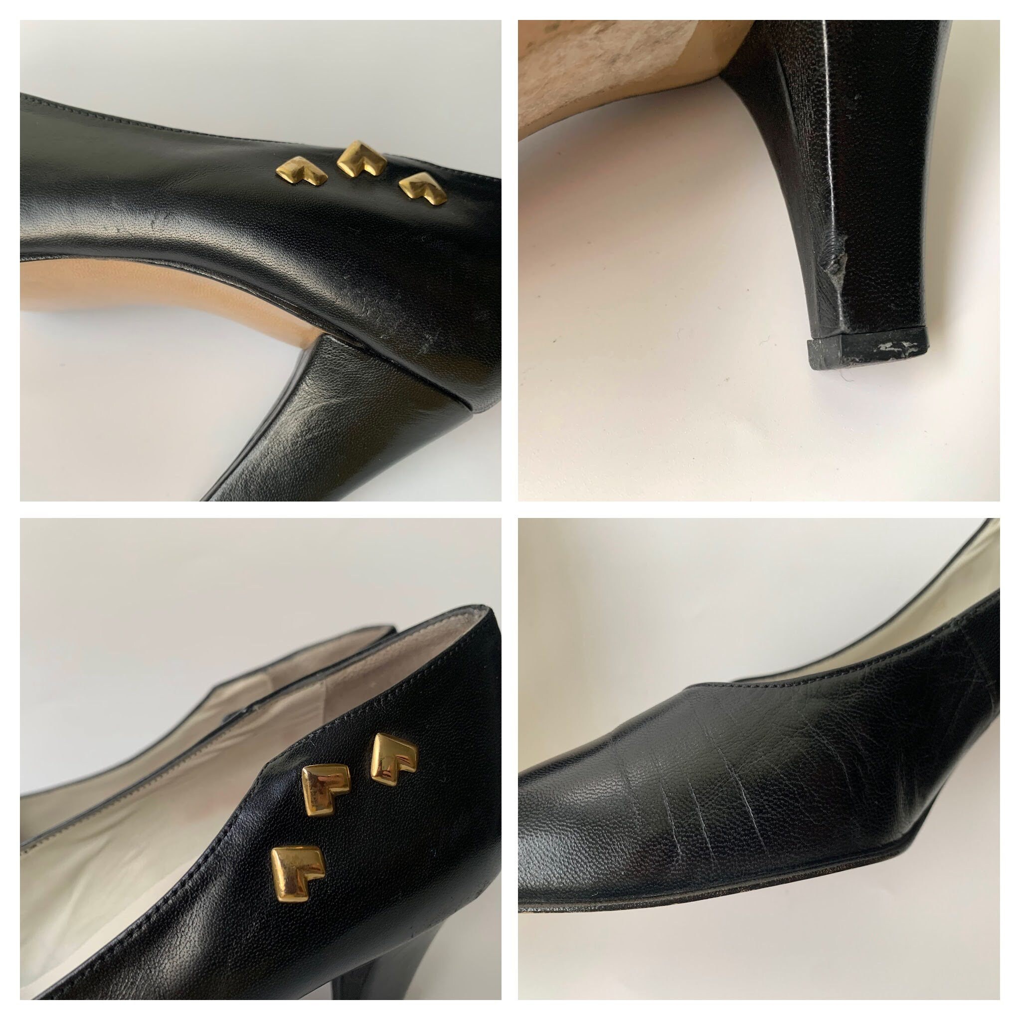 Condition: Time has left its marks on these lovely leather shoes - there are some scratches on the leather. There is slight peel of the leather on the heel. One of the gold tone studs moves a bit more than the rest, but it's still securely attached to the shoe.