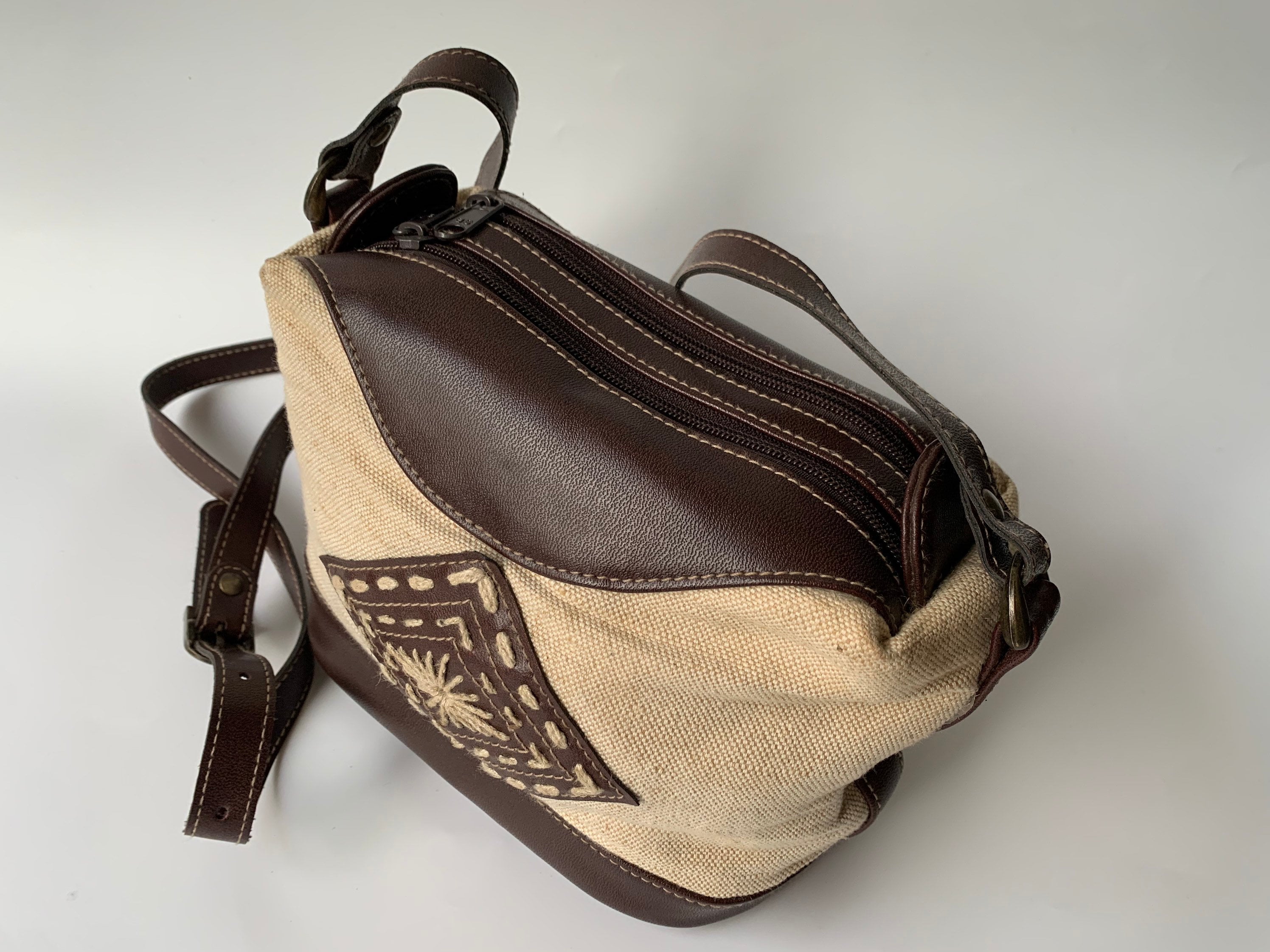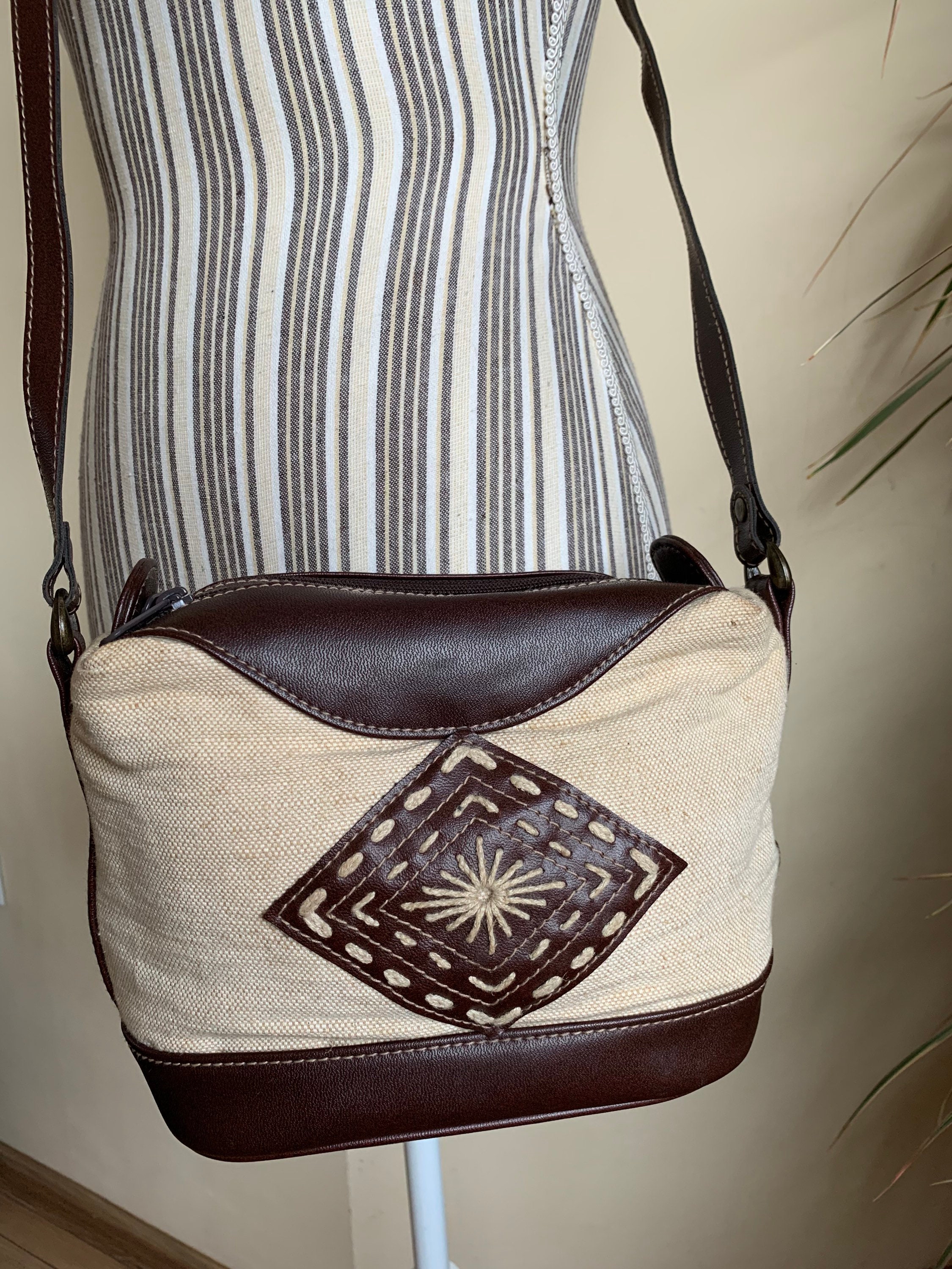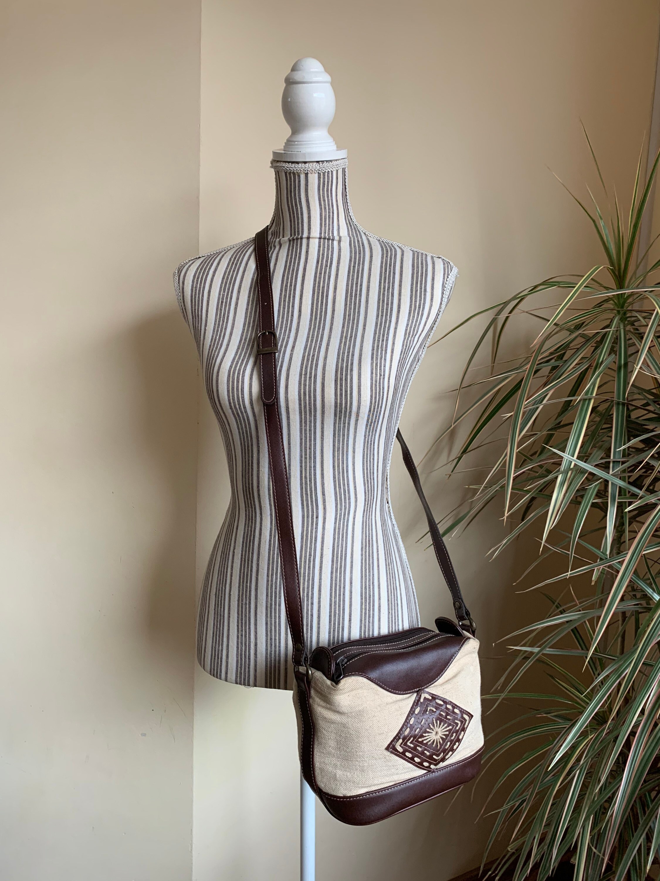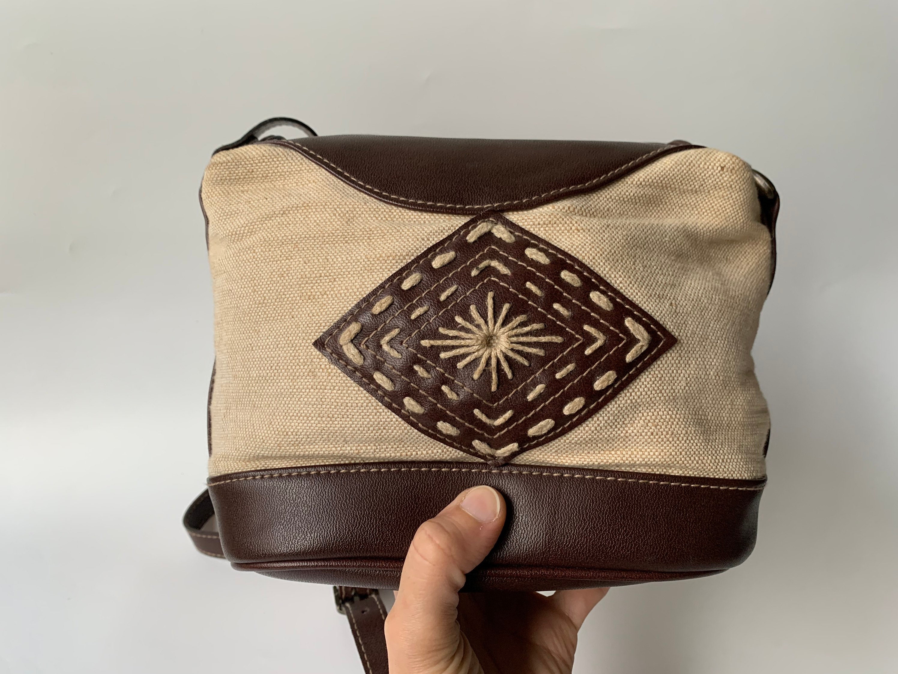 This is a vintage 90s canvas crossbody bag with beautiful geometric embroidery at the front. This canvas shoulder purse is made of natural fabric which feels like cotton or linen. This small crossbody bag has brown faux leather bottom and adjustable strap. This tan beige canvas handbag has two compartments with top zip closure and one zipper pocket. This small shoulder bag is the perfect size purse that will fit just what you need. It is just the right size to fit your wallet, phone and essential make up.