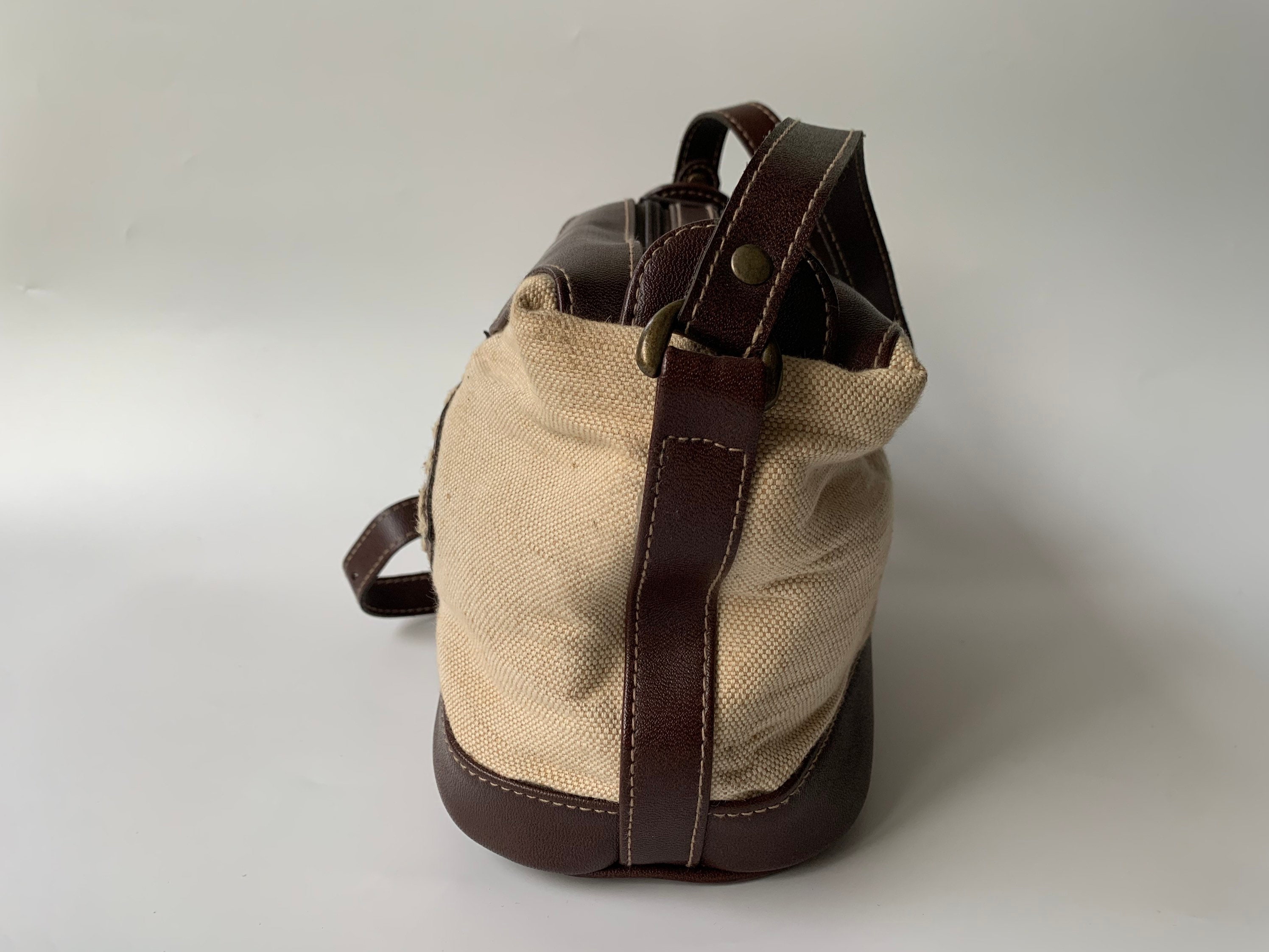 Material: canvas fabric, feels like a natural material probably cotton or linen, faux leather bottom and strap, cotton lining