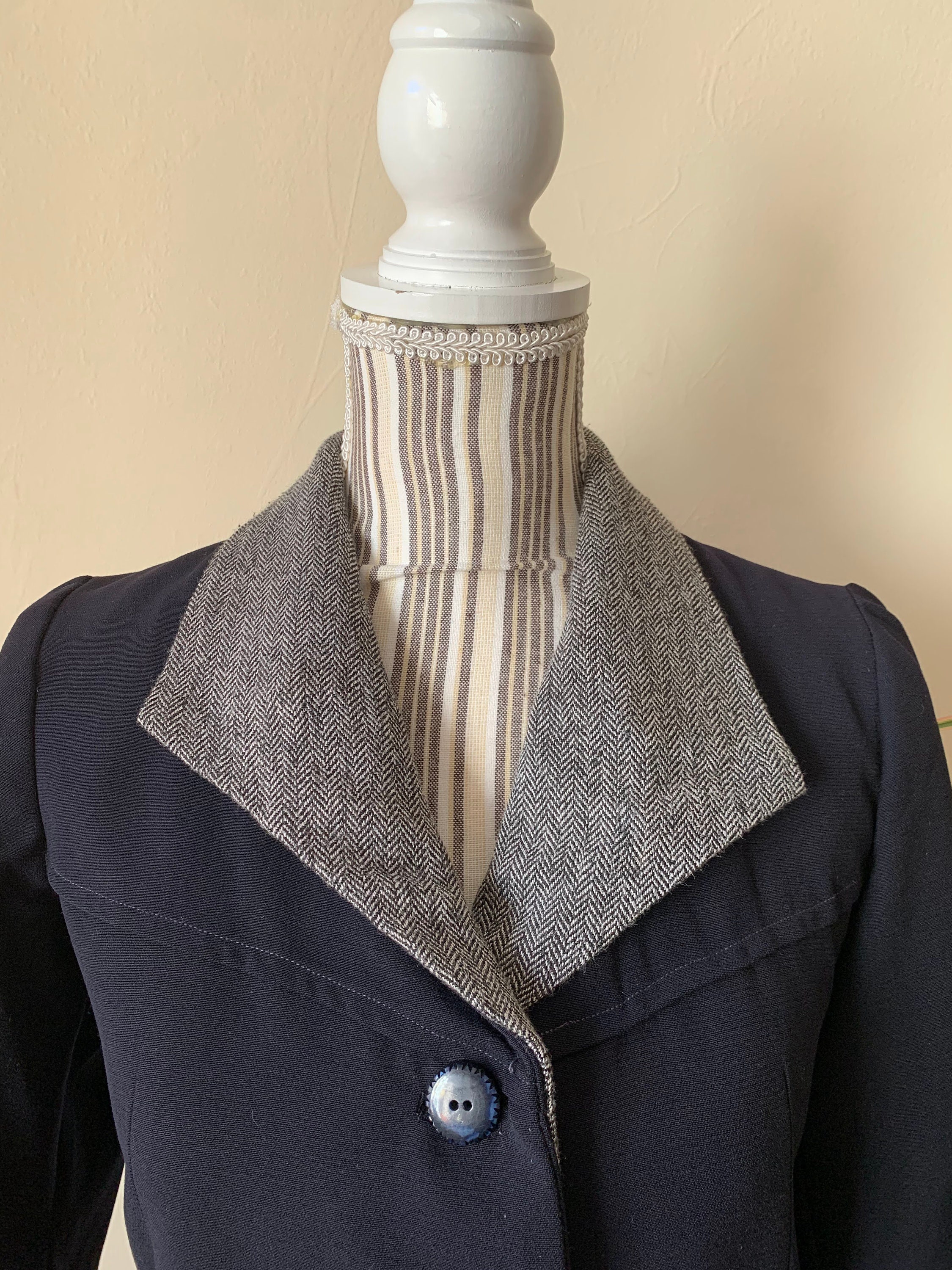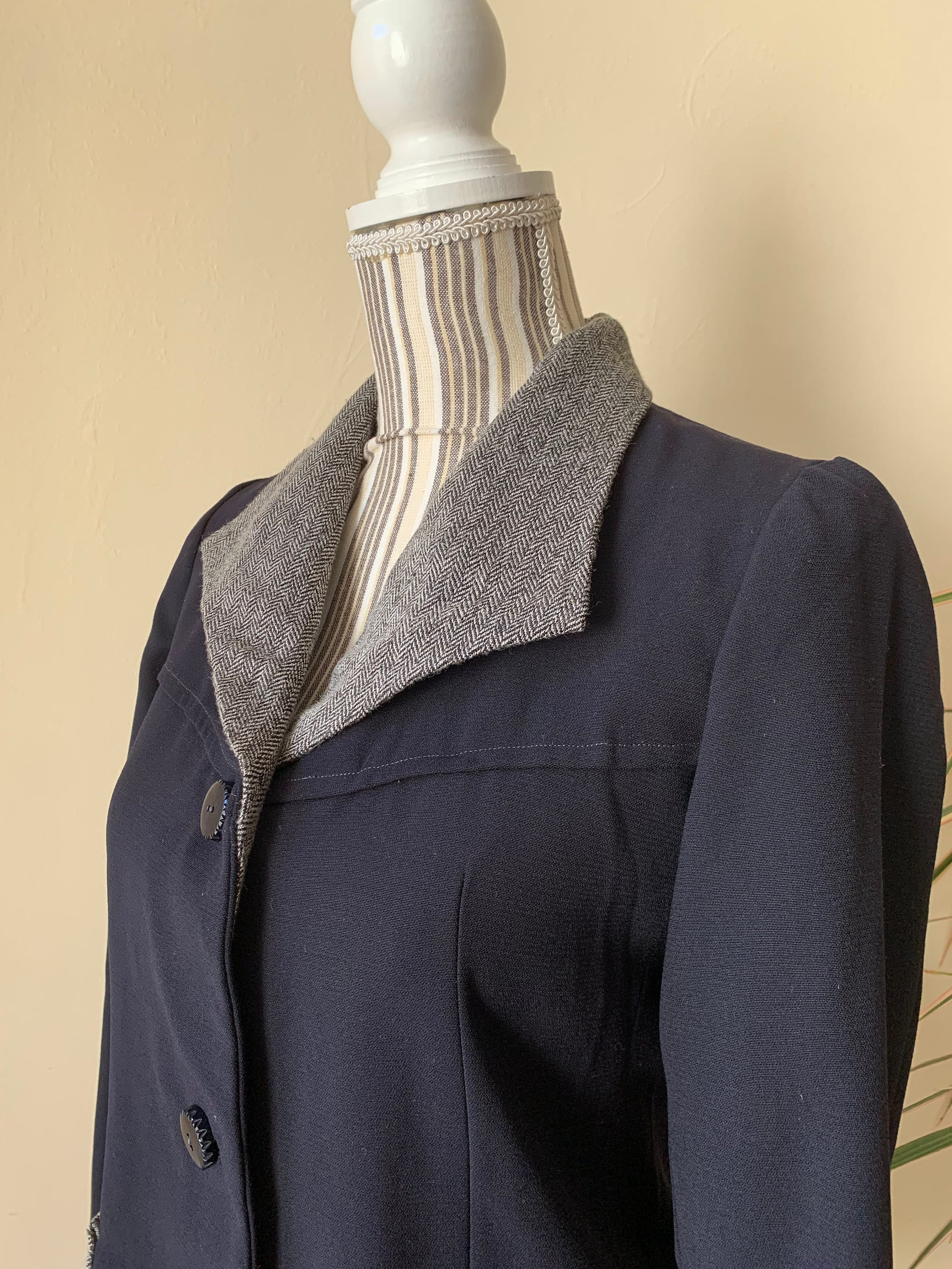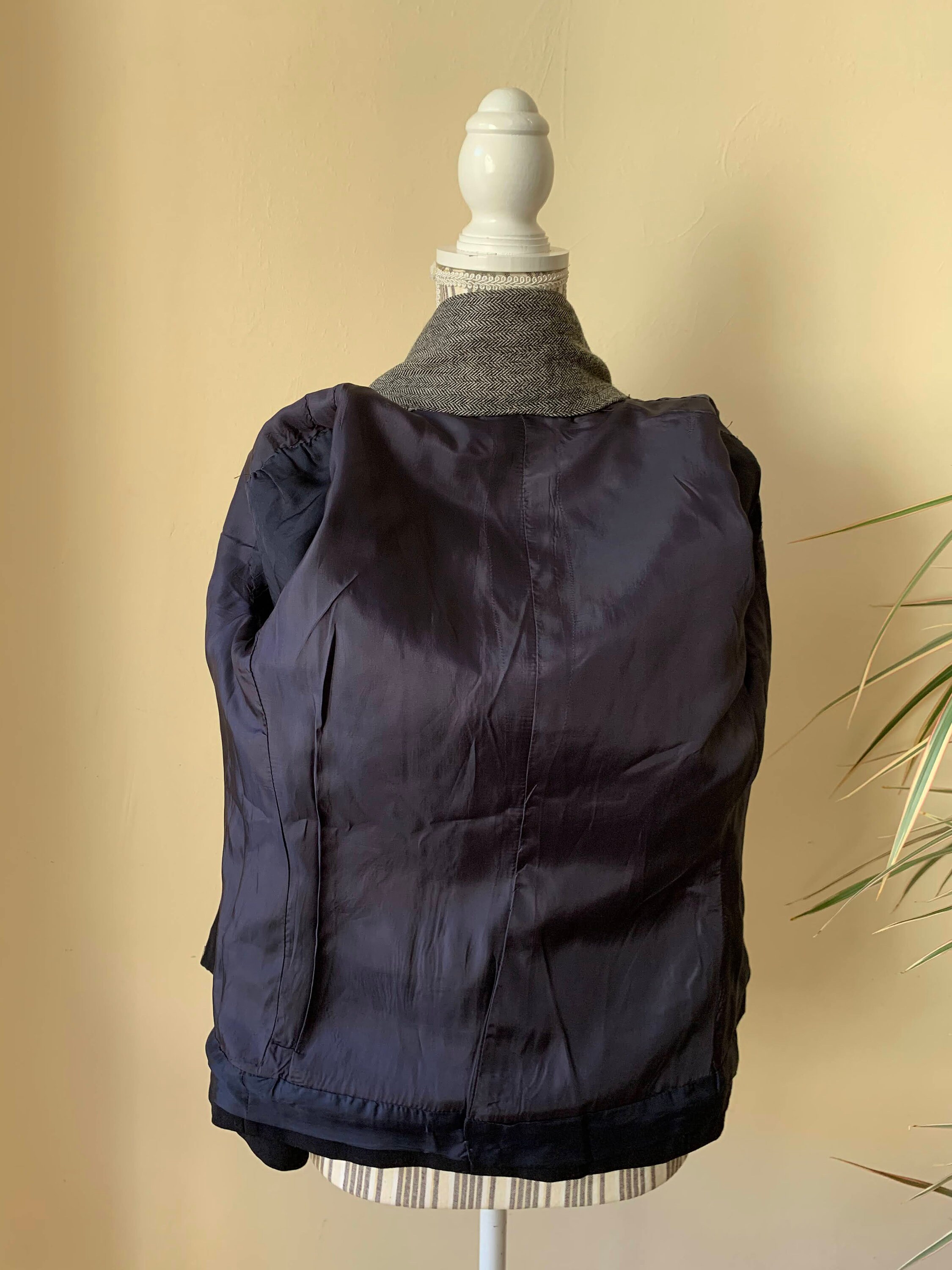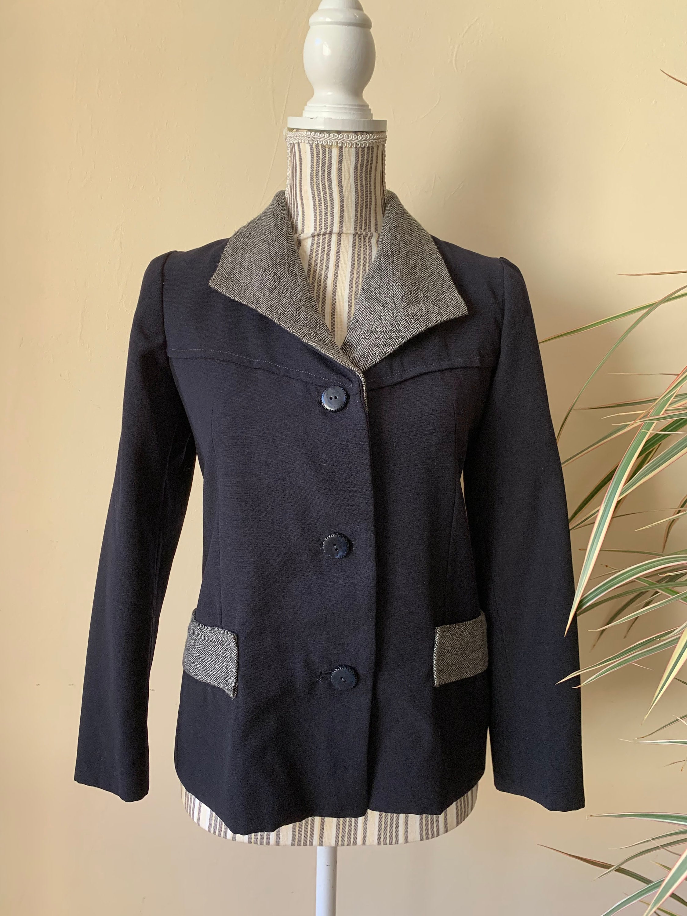 This is a beautiful vintage 80s black button up blazer jacket for women with herringbone print collar and pockets. This stylish blazer coat is made of thick synthetic fabric with polyester lining. It has beautiful navy buttons. The sleeves are a little longer than 3/4 length sleeves and a bit shorter than long sleeves. As this classic suit jacket was handmade, there is no label and no size marked. It fits like size XS / S. Please check the measurements below.