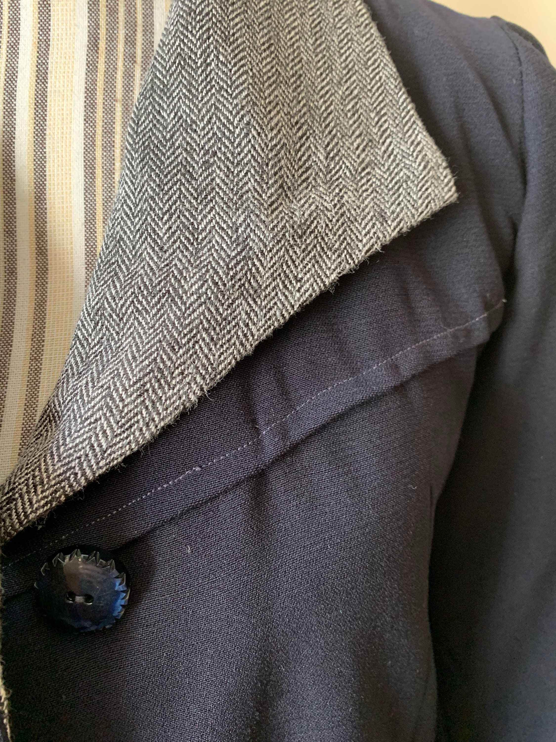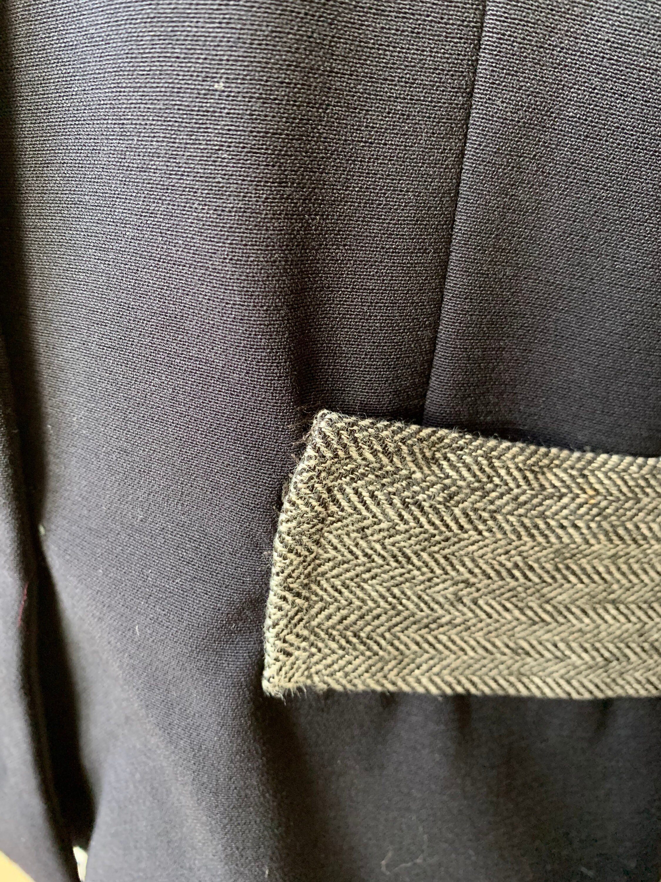 Material: not marked, feels like synthetic with wool herringbone detailing, polyester lining.