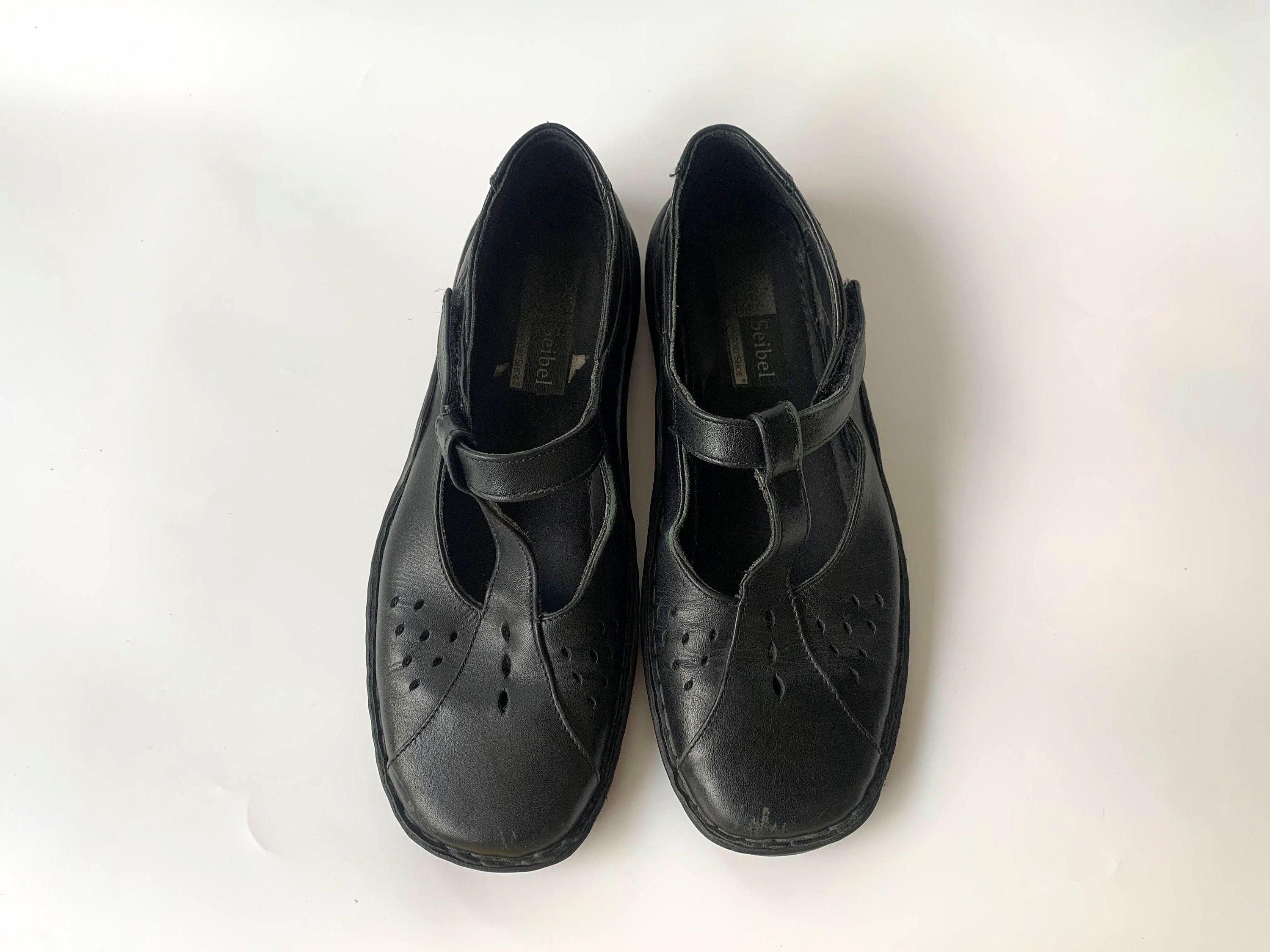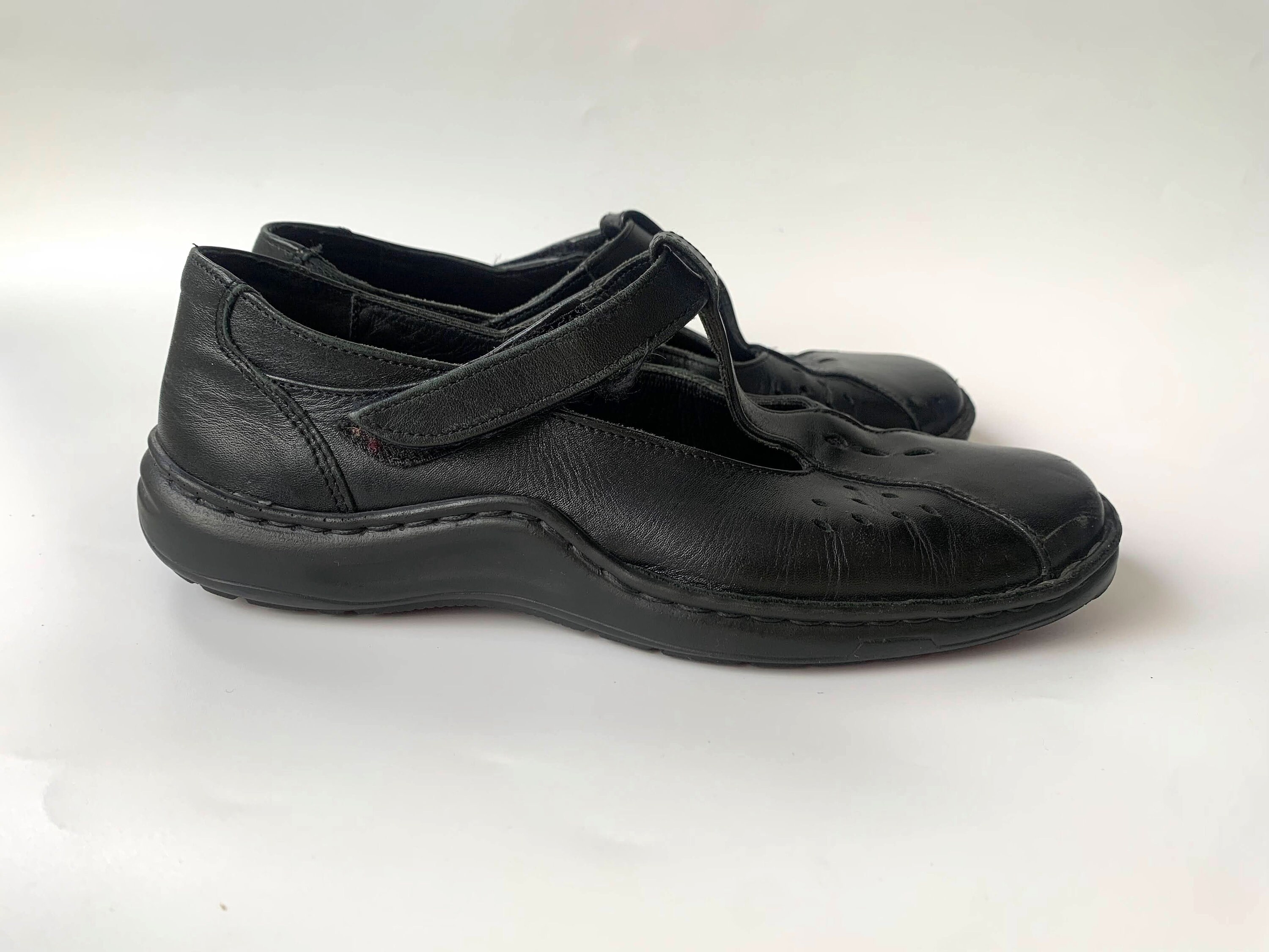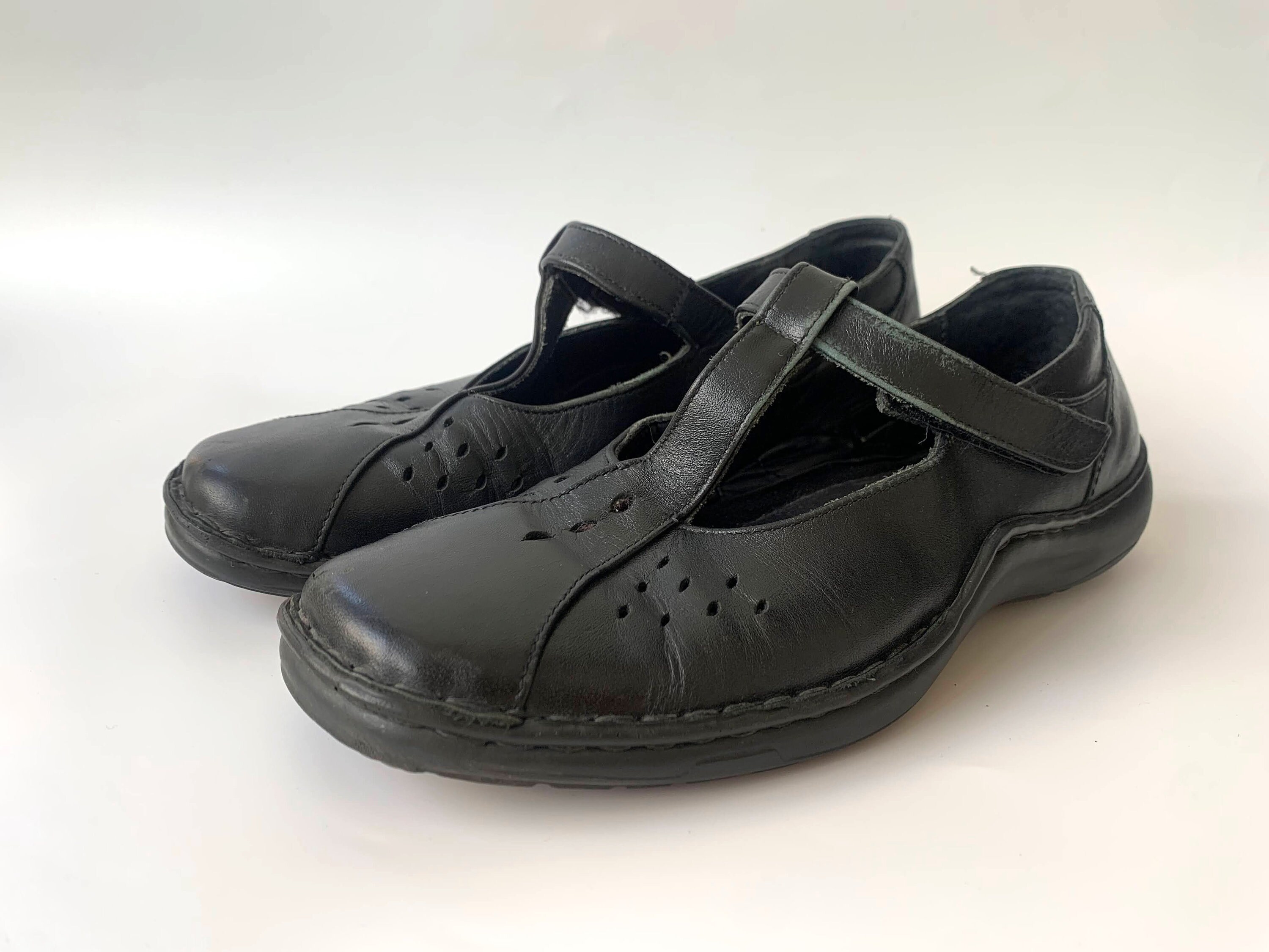 These are vintage black leather flats for women by Josef Siebel. These chunky shoes are size 38, which fits like UK 5, US 7. Please check the measurements below. These low walking shoes have a t-strap. You can easily put them on and take them off. These black leather loafers are made of genuine leather with leather insoles and rubber soles.