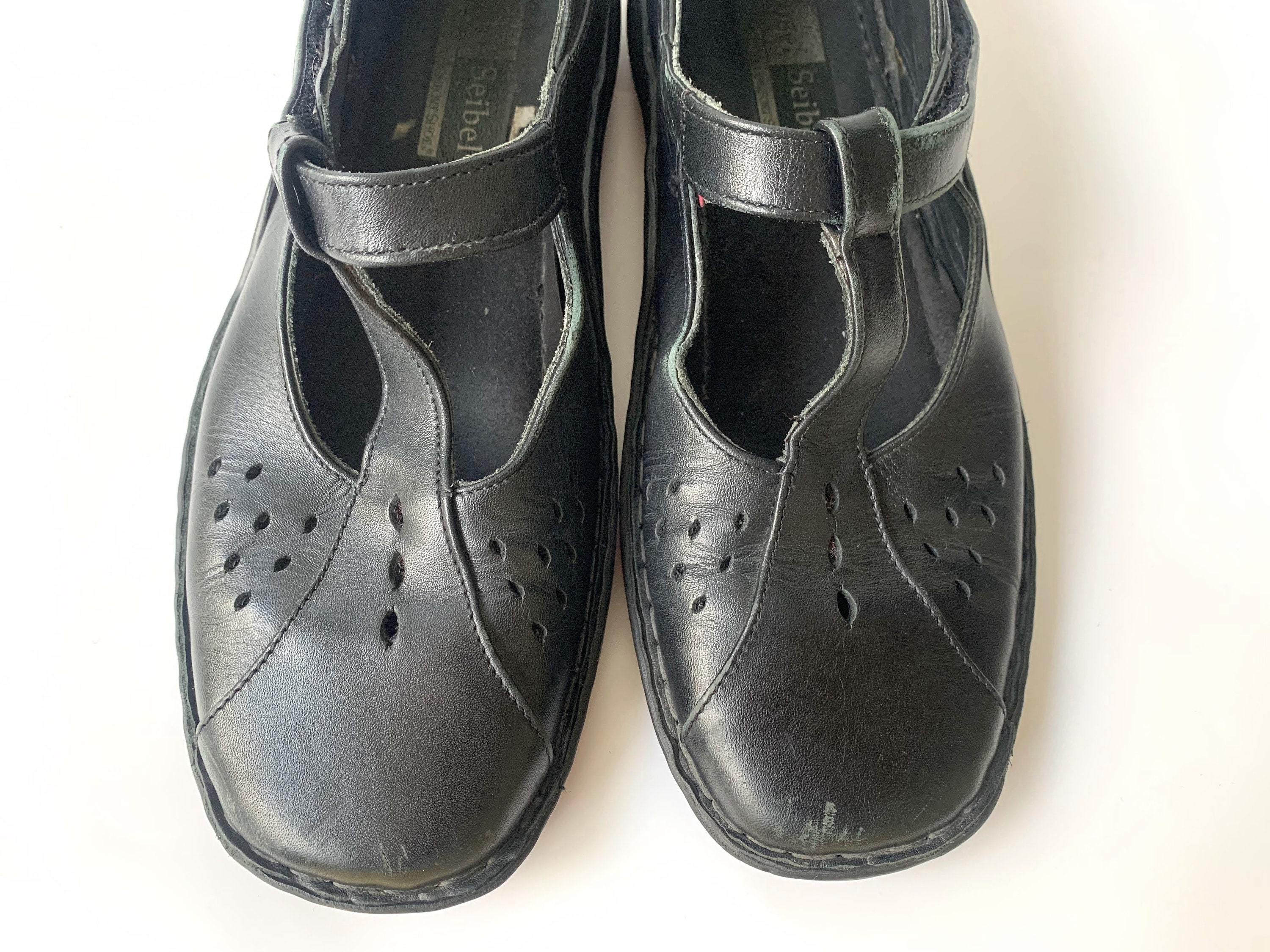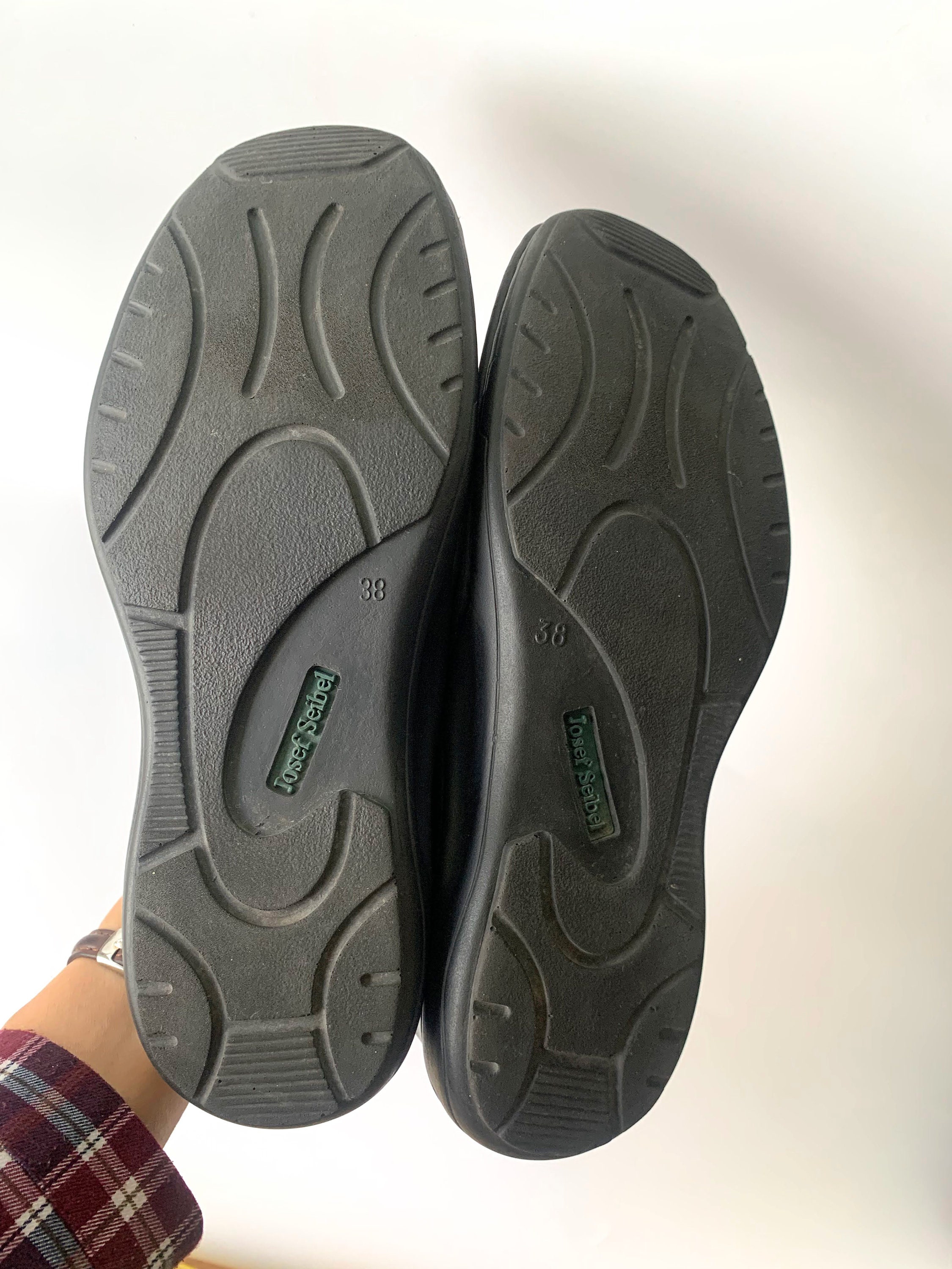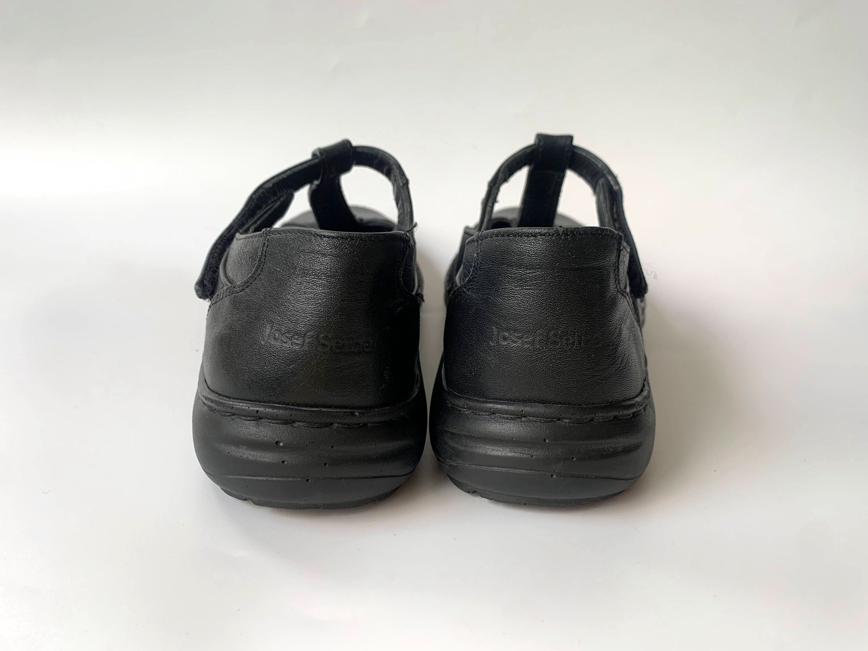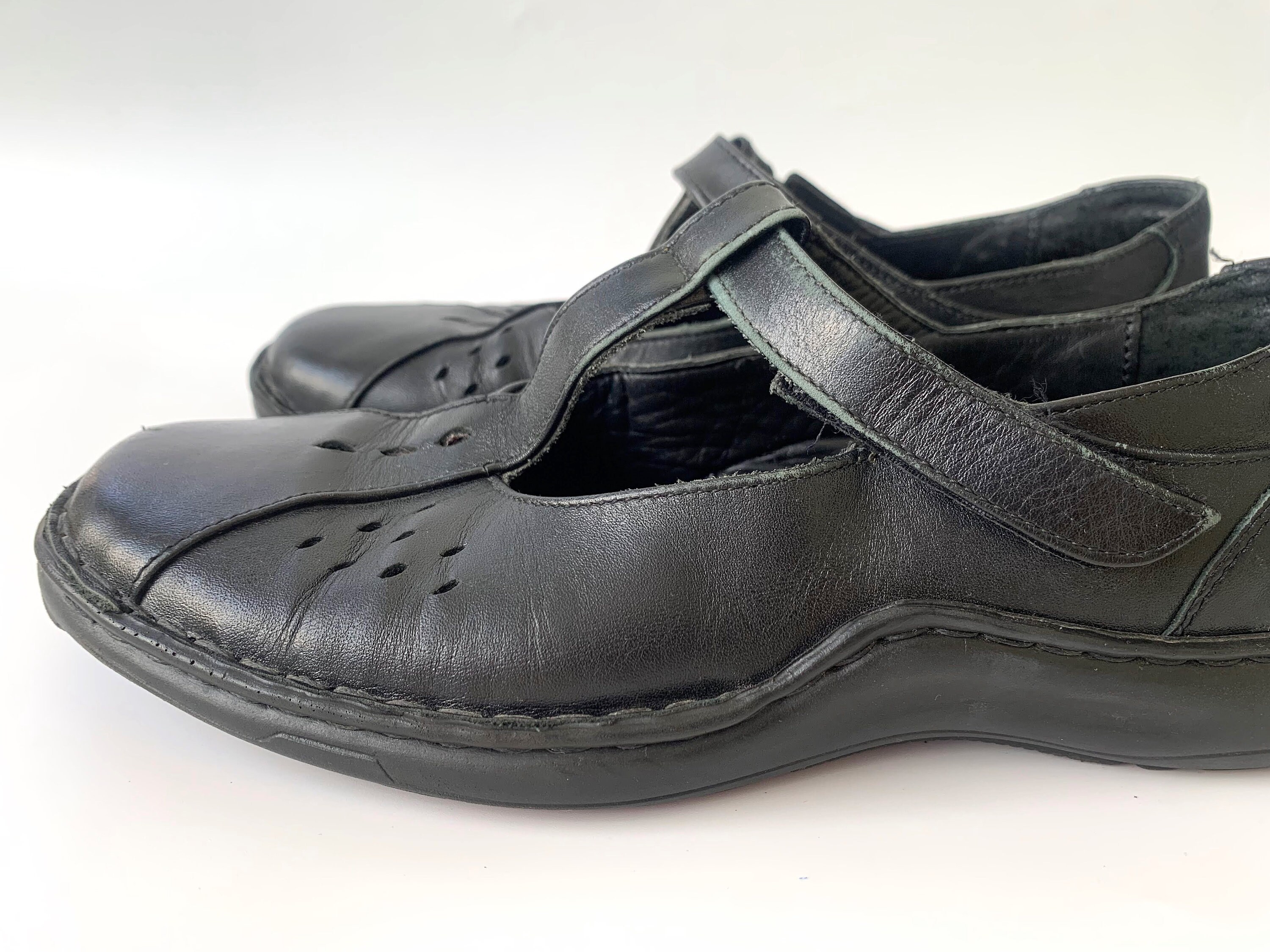 These are vintage black leather flats for women by Josef Siebel. These chunky shoes are size 38, which fits like UK 5, US 7. Please check the measurements below. These low walking shoes have a t-strap. You can easily put them on and take them off. These black leather loafers are made of genuine leather with leather insoles and rubber soles.