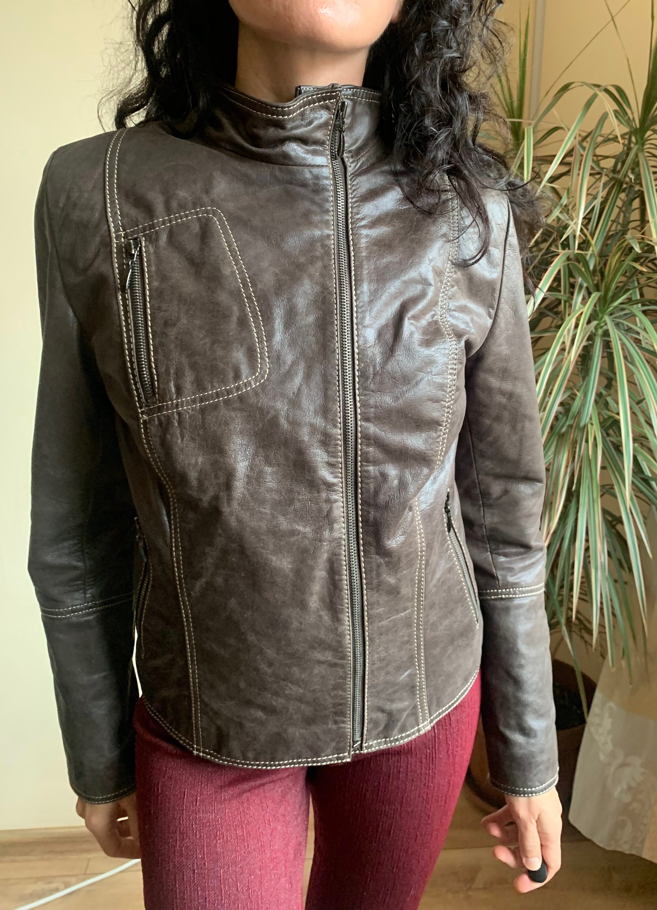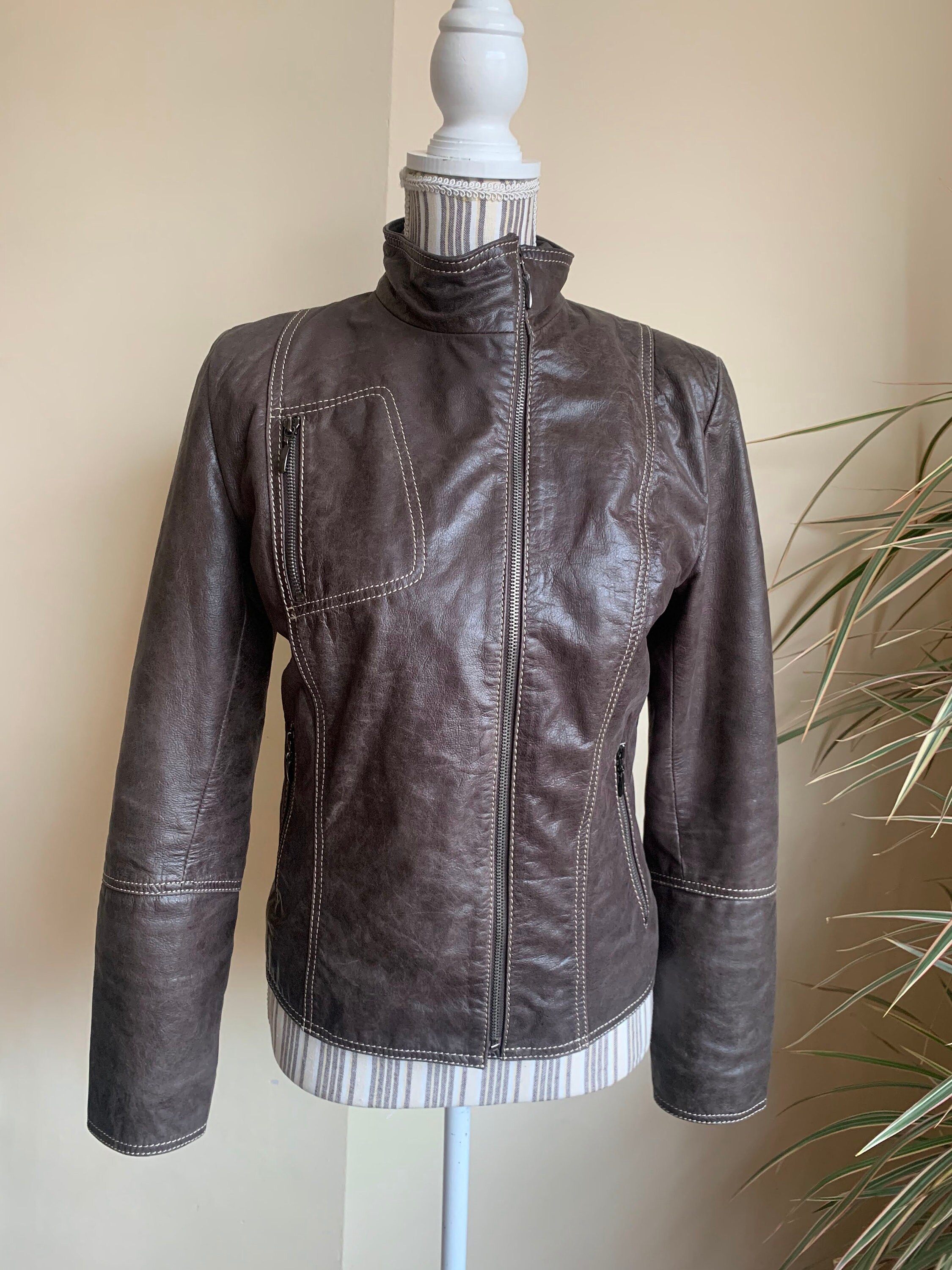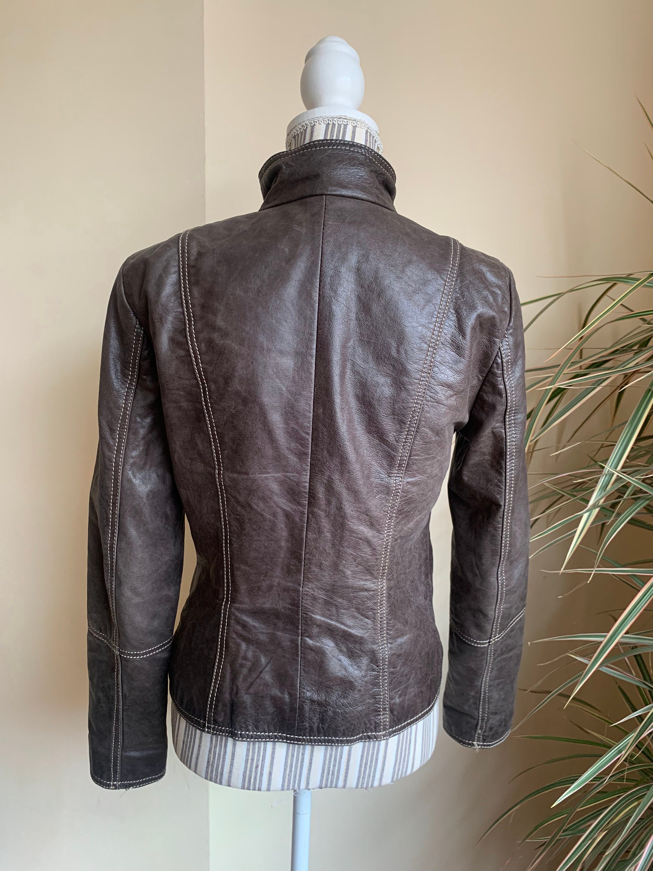 This is a beautiful vintage 00s brown leather zip up motorcycle jacket for women with high collar. This vintage leather jacket has three zip up pockets. It is made of soft genuine leather in brown color. The leather was much loved and well worn, it has an aged leather look due to the multiple scratches and creases on the leather surface. The size marked is 36, which fits like S, US 6, UK 10. I am modelling this brown leather motorcycle jacket and I wear size S, EU 36, US 6, UK 10. I am 5'3" /160 cm tall. Please check the measurements below.