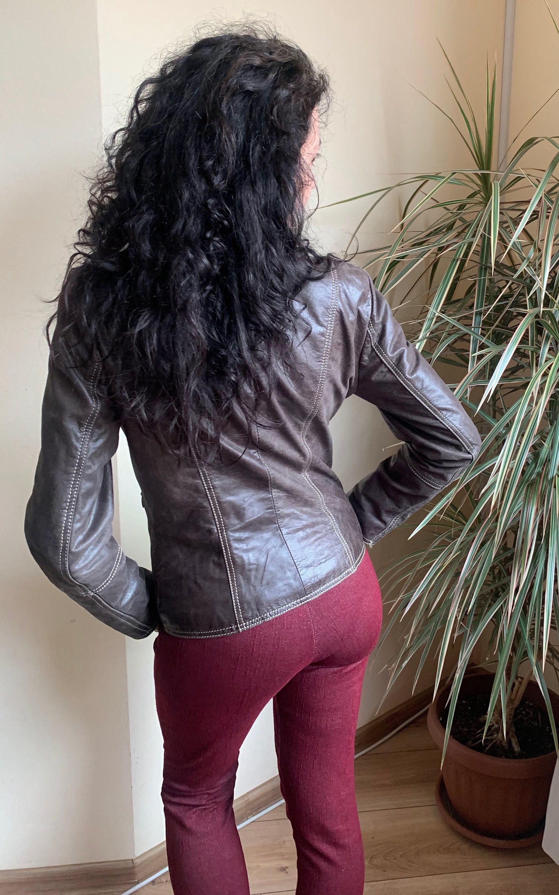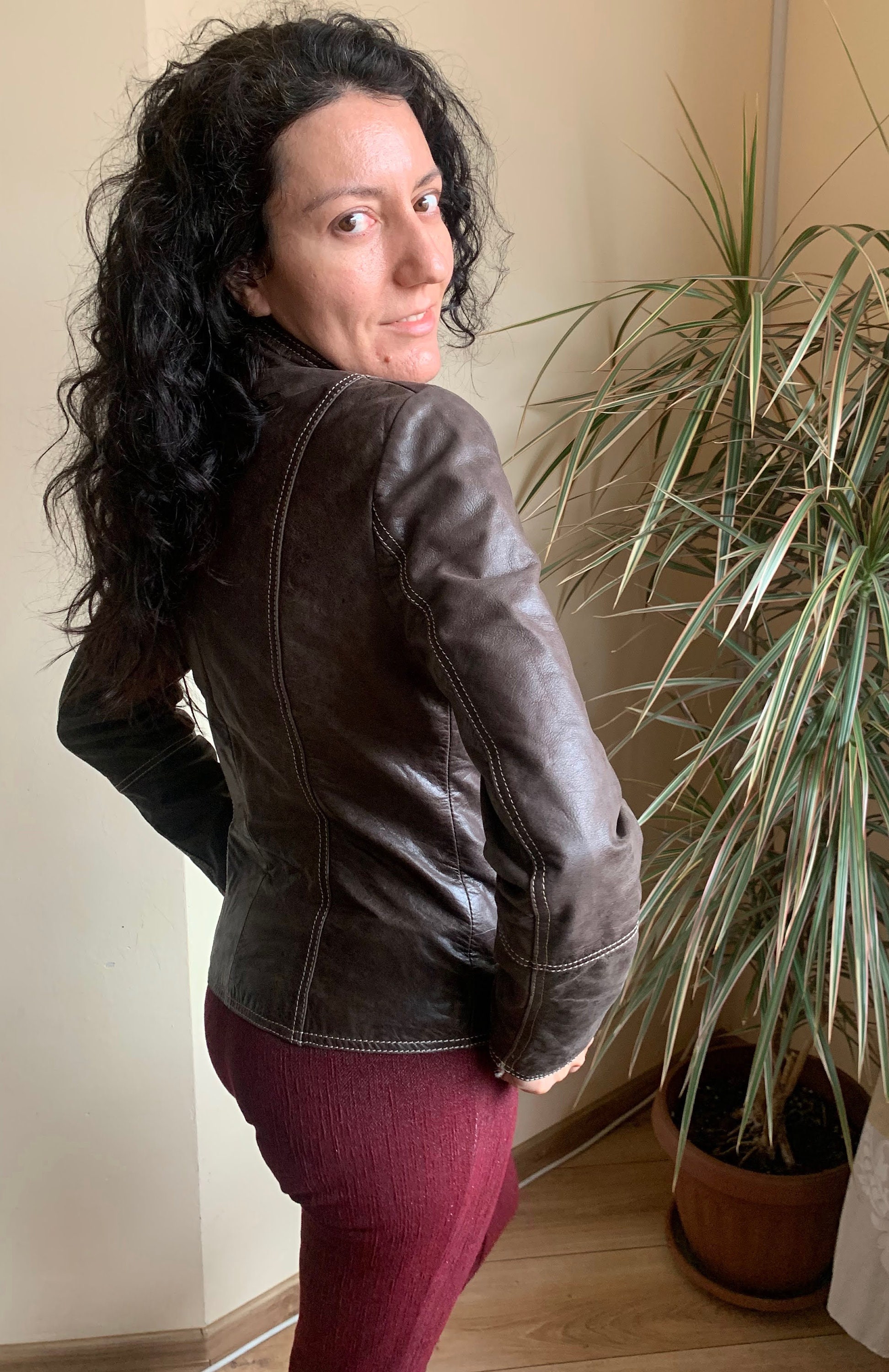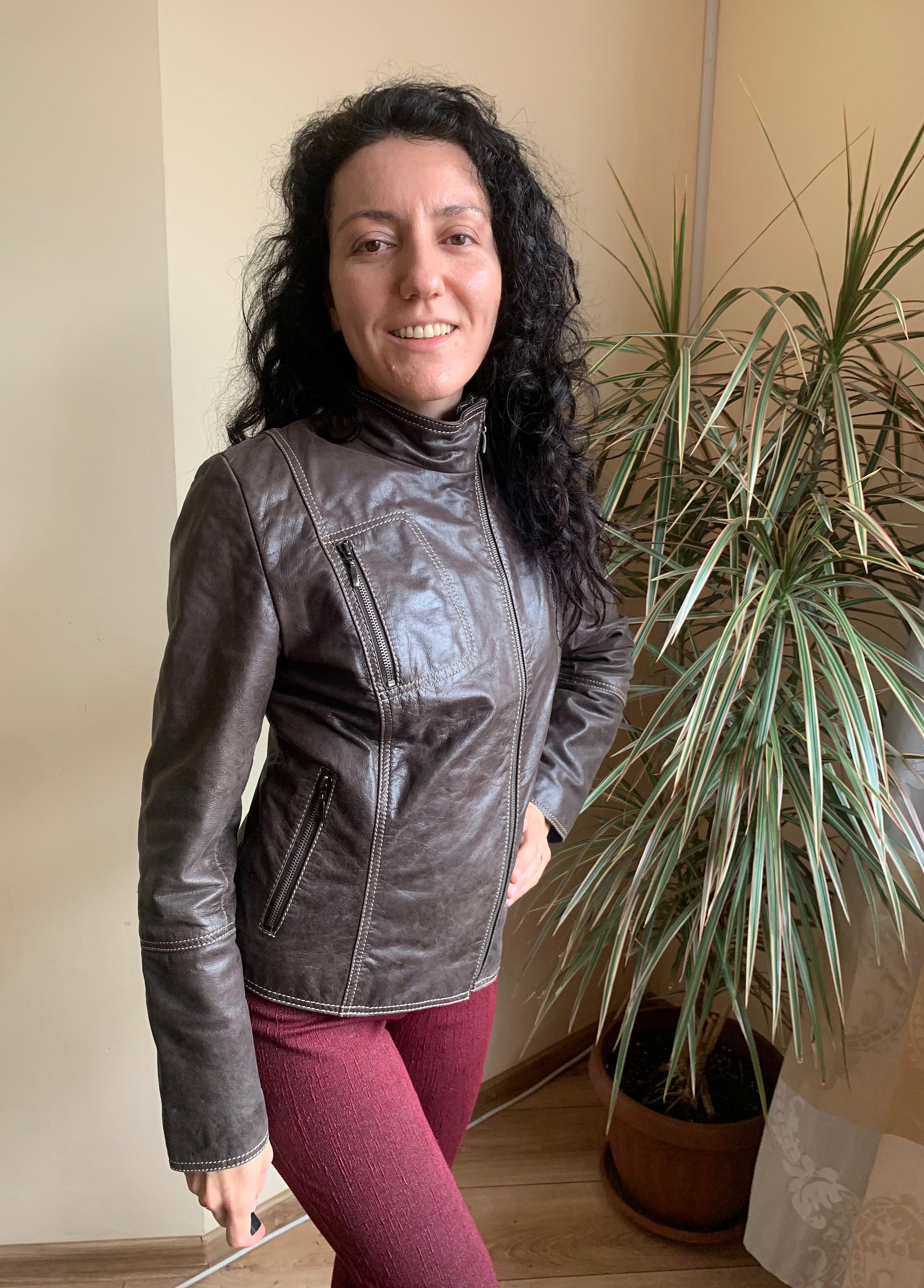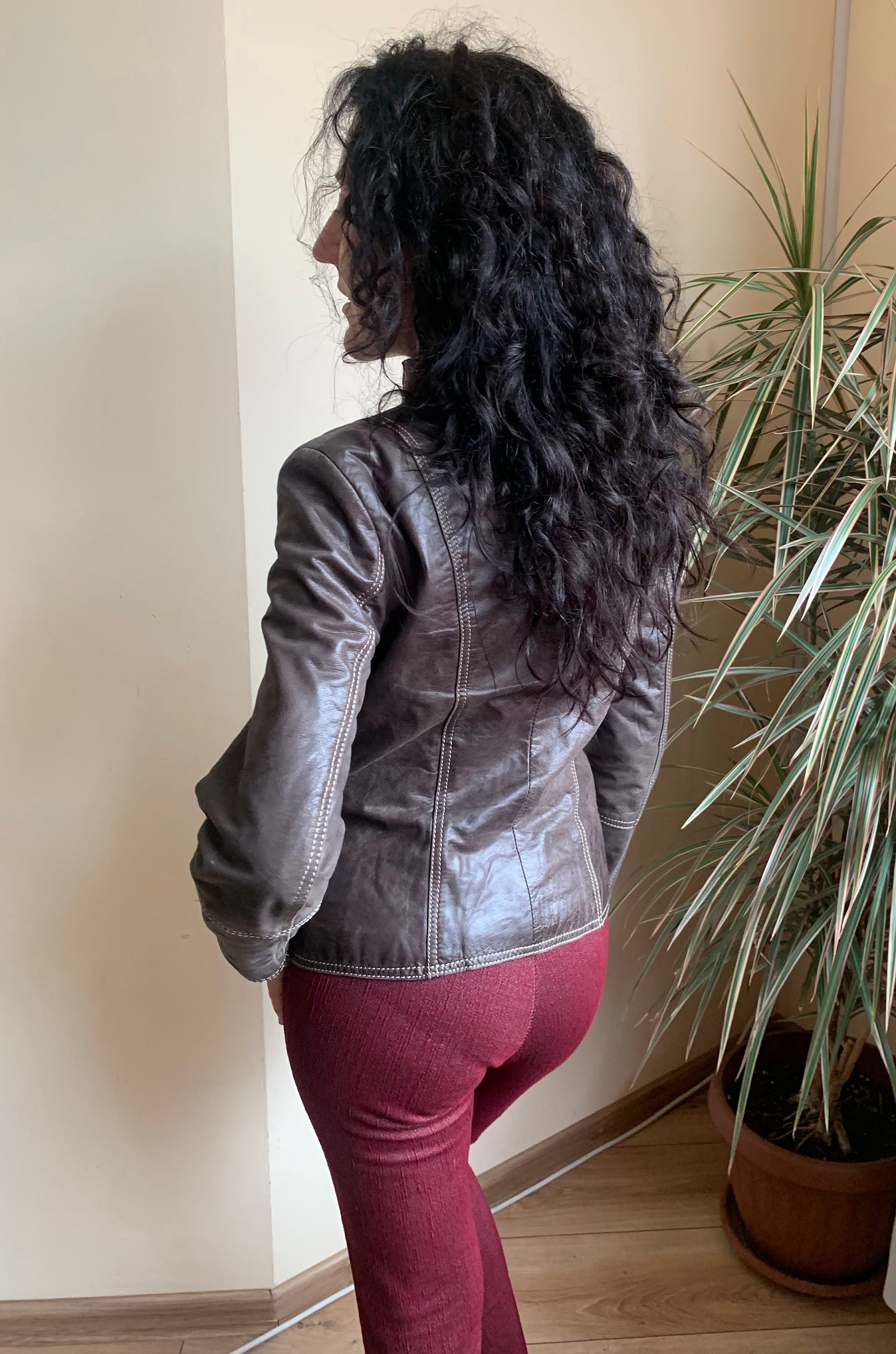 This is a beautiful vintage 00s brown leather zip up motorcycle jacket for women with high collar. This vintage leather jacket has three zip up pockets. It is made of soft genuine leather in brown color. The leather was much loved and well worn, it has an aged leather look due to the multiple scratches and creases on the leather surface. The size marked is 36, which fits like S, US 6, UK 10. I am modelling this brown leather motorcycle jacket and I wear size S, EU 36, US 6, UK 10. I am 5'3" /160 cm tall. Please check the measurements below.