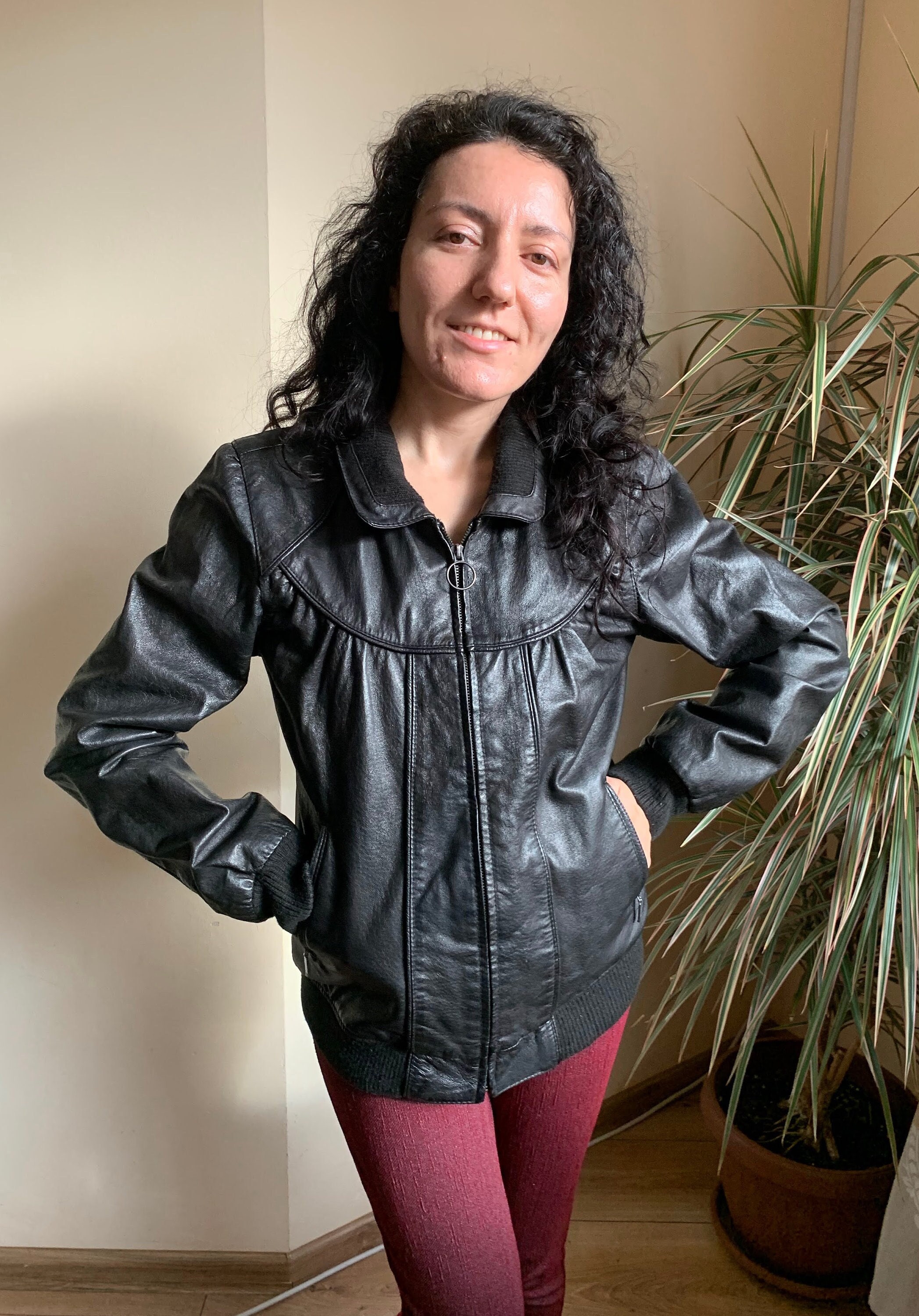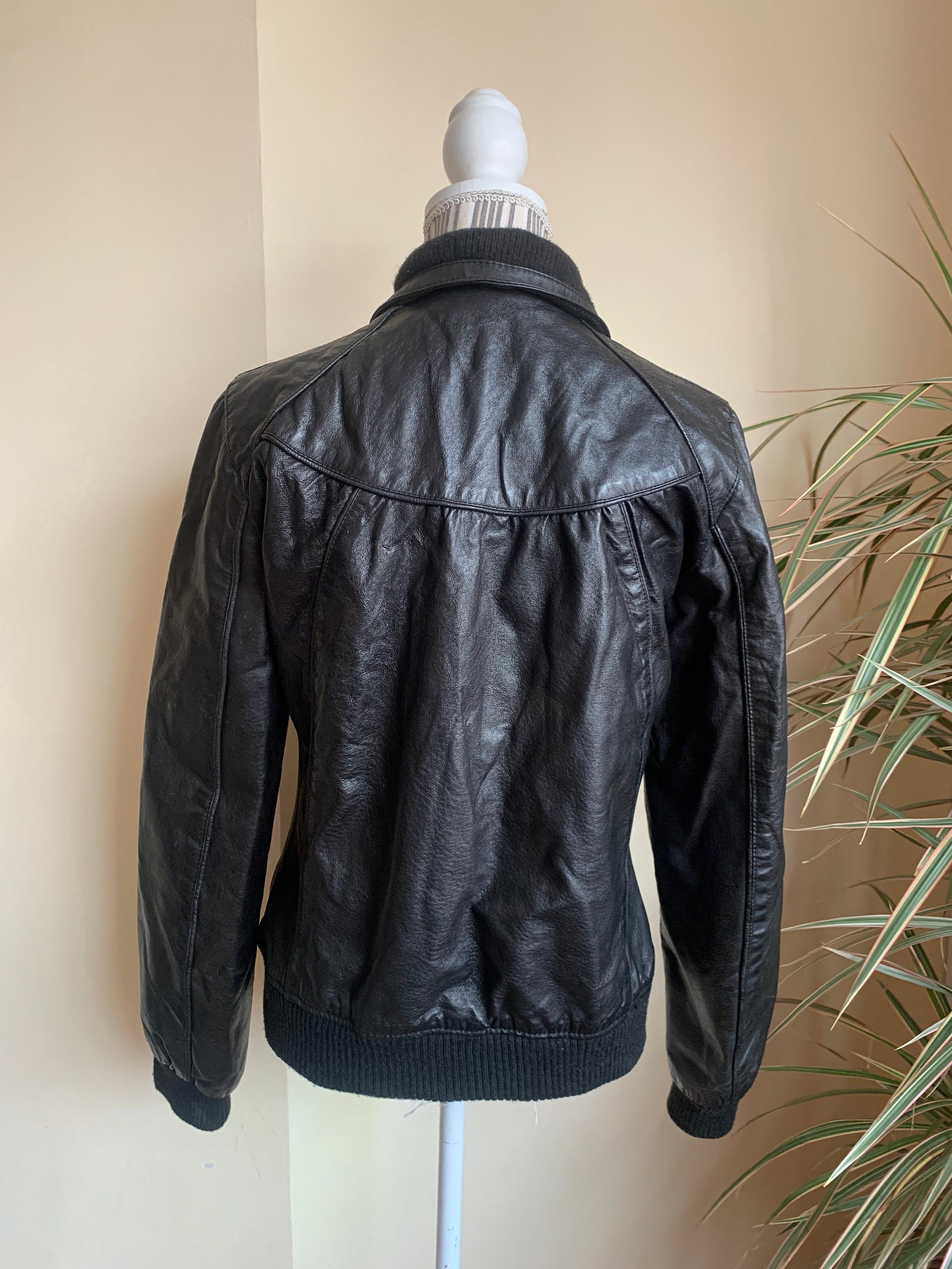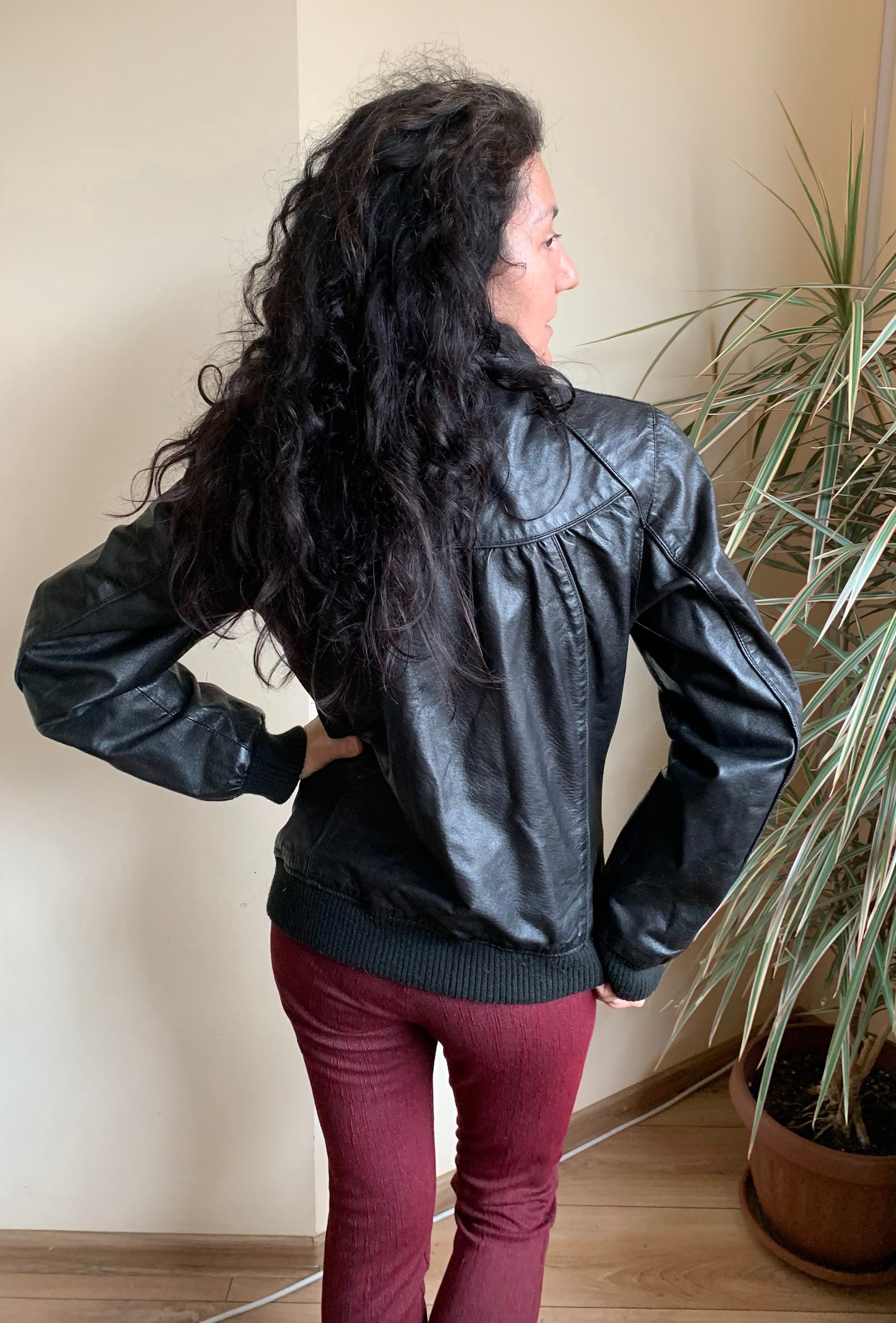 This is a vintage 90s genuine leather bomber jacket for women with zip up closure and collar. This black leather bomber for women has two zip up pockets. This leather bomber has an oversized loose fit cropped silhouette, perfect for every day. Ideal motorcycle leather jacket for the fall/spring season. This biker jacket has polyester lining underneath. The size marked is L , it fits like size M/L. I am modelling this bomber leather jacket. I wear size S, EUR 36, US 6, UK 10. I am 5'3" (160 cm) tall. Please check the measurements below.