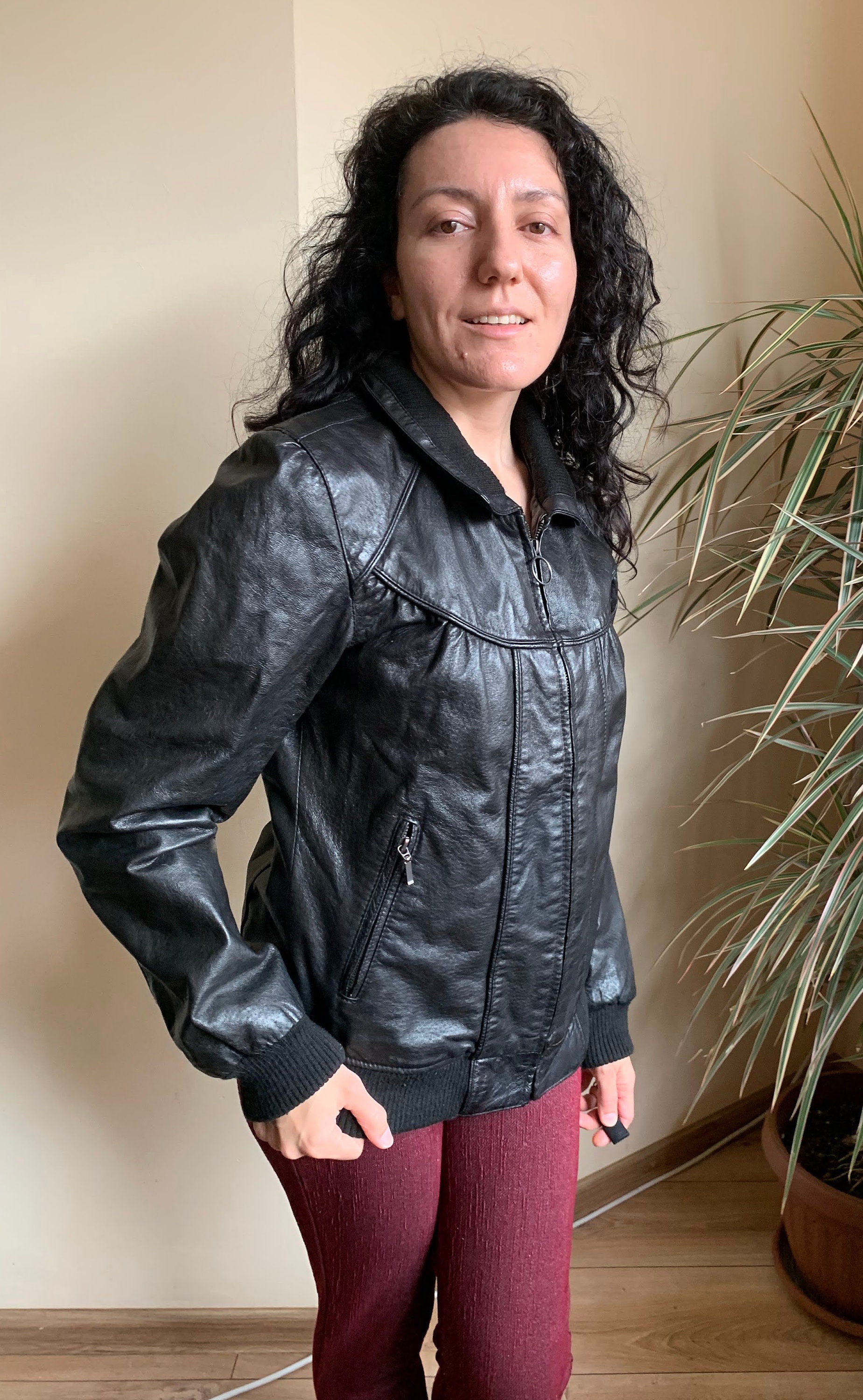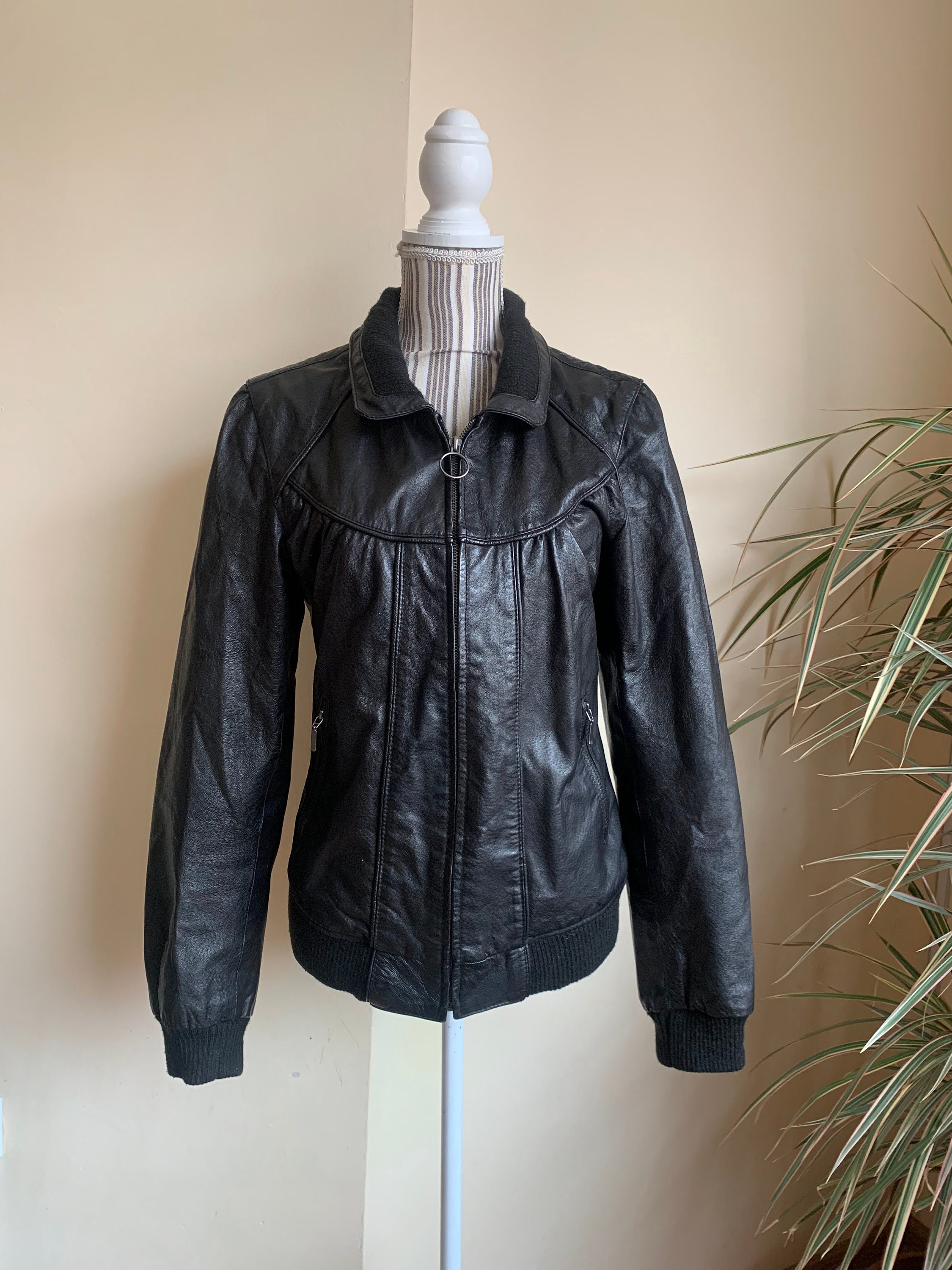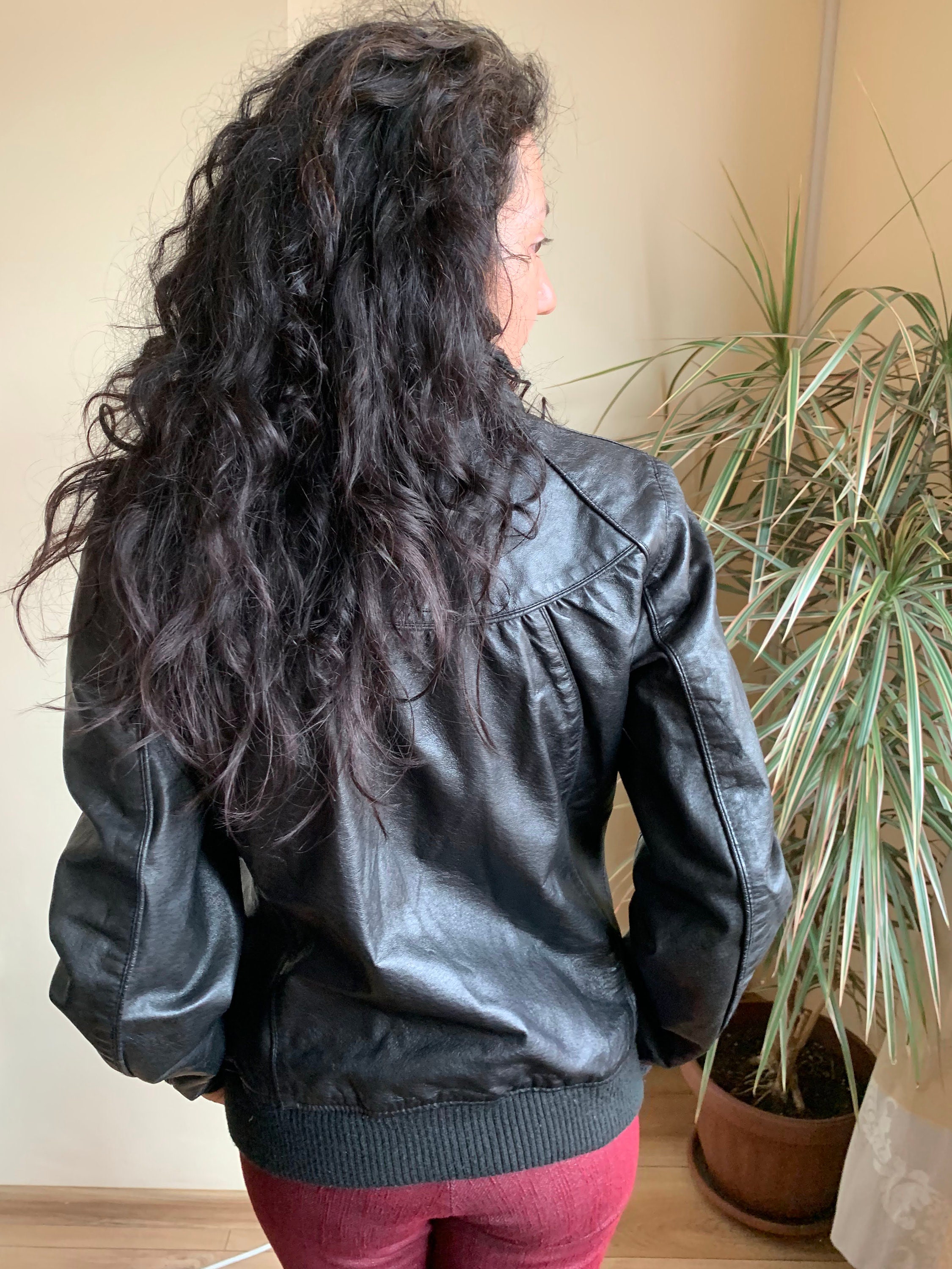 This is a vintage 90s genuine leather bomber jacket for women with zip up closure and collar. This black leather bomber for women has two zip up pockets. This leather bomber has an oversized loose fit cropped silhouette, perfect for every day. Ideal motorcycle leather jacket for the fall/spring season. This biker jacket has polyester lining underneath. The size marked is L , it fits like size M/L. I am modelling this bomber leather jacket. I wear size S, EUR 36, US 6, UK 10. I am 5'3" (160 cm) tall. Please check the measurements below.