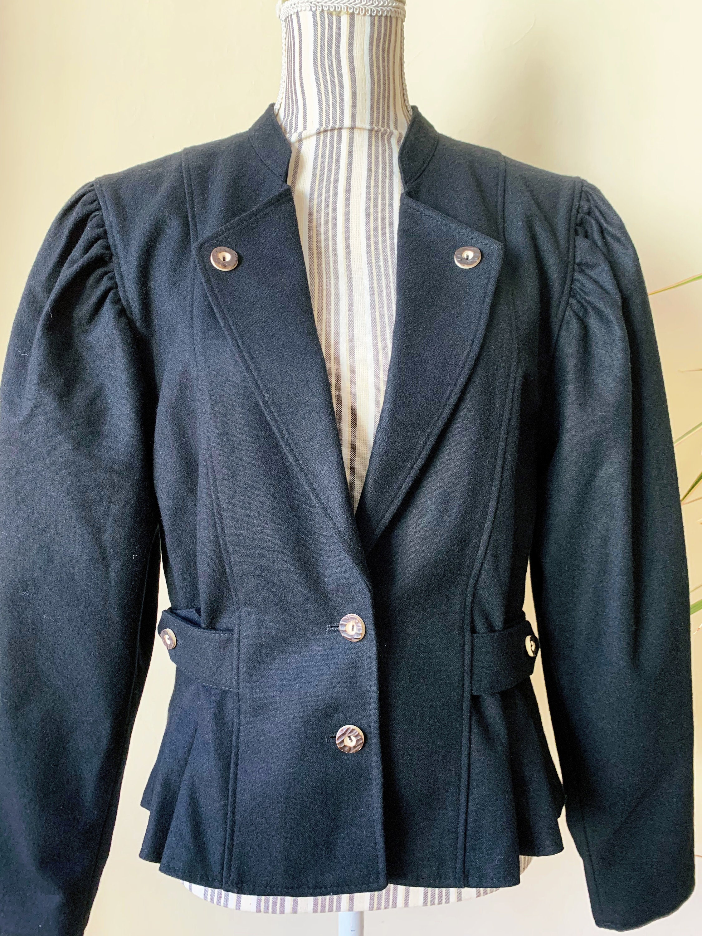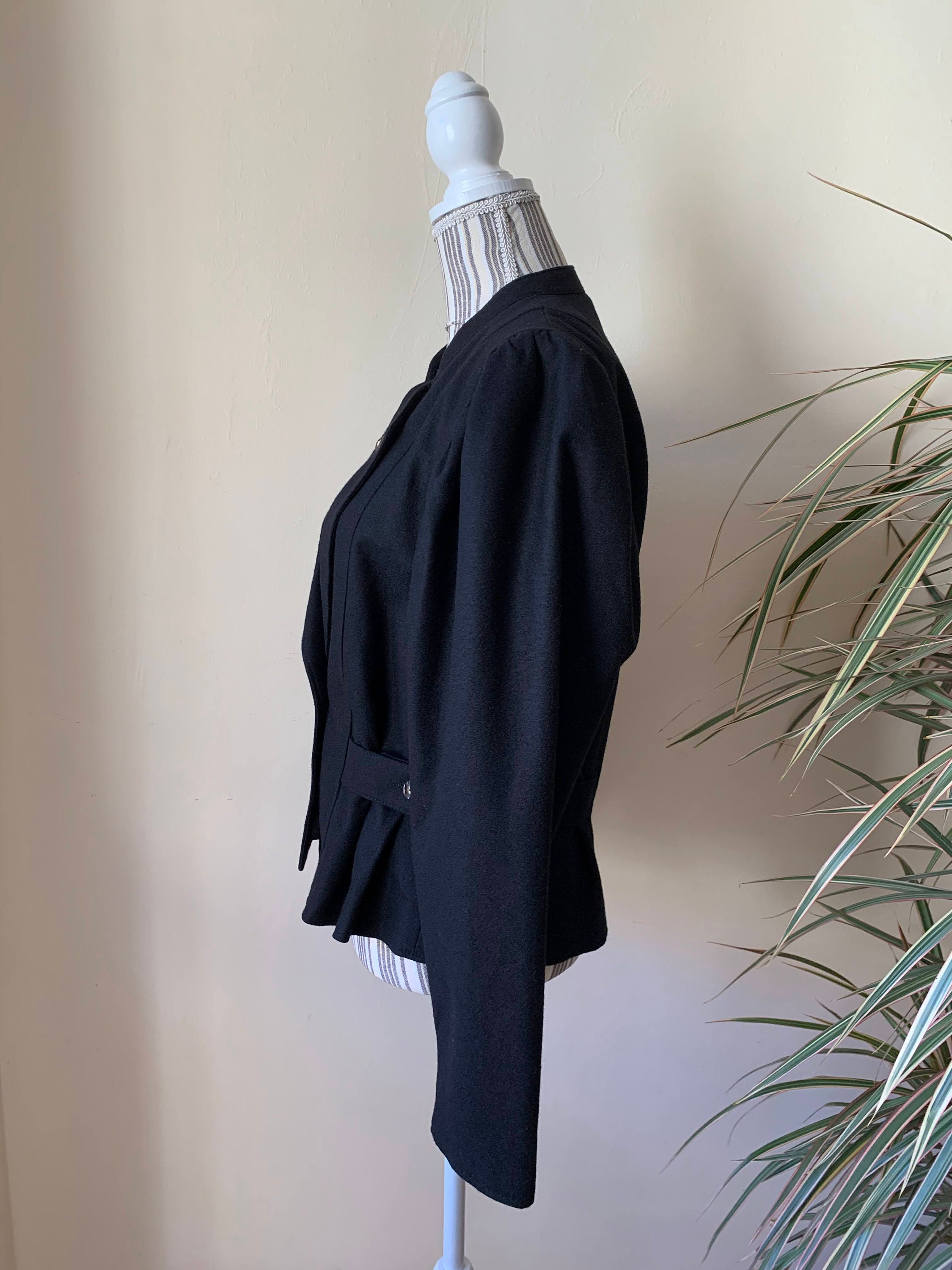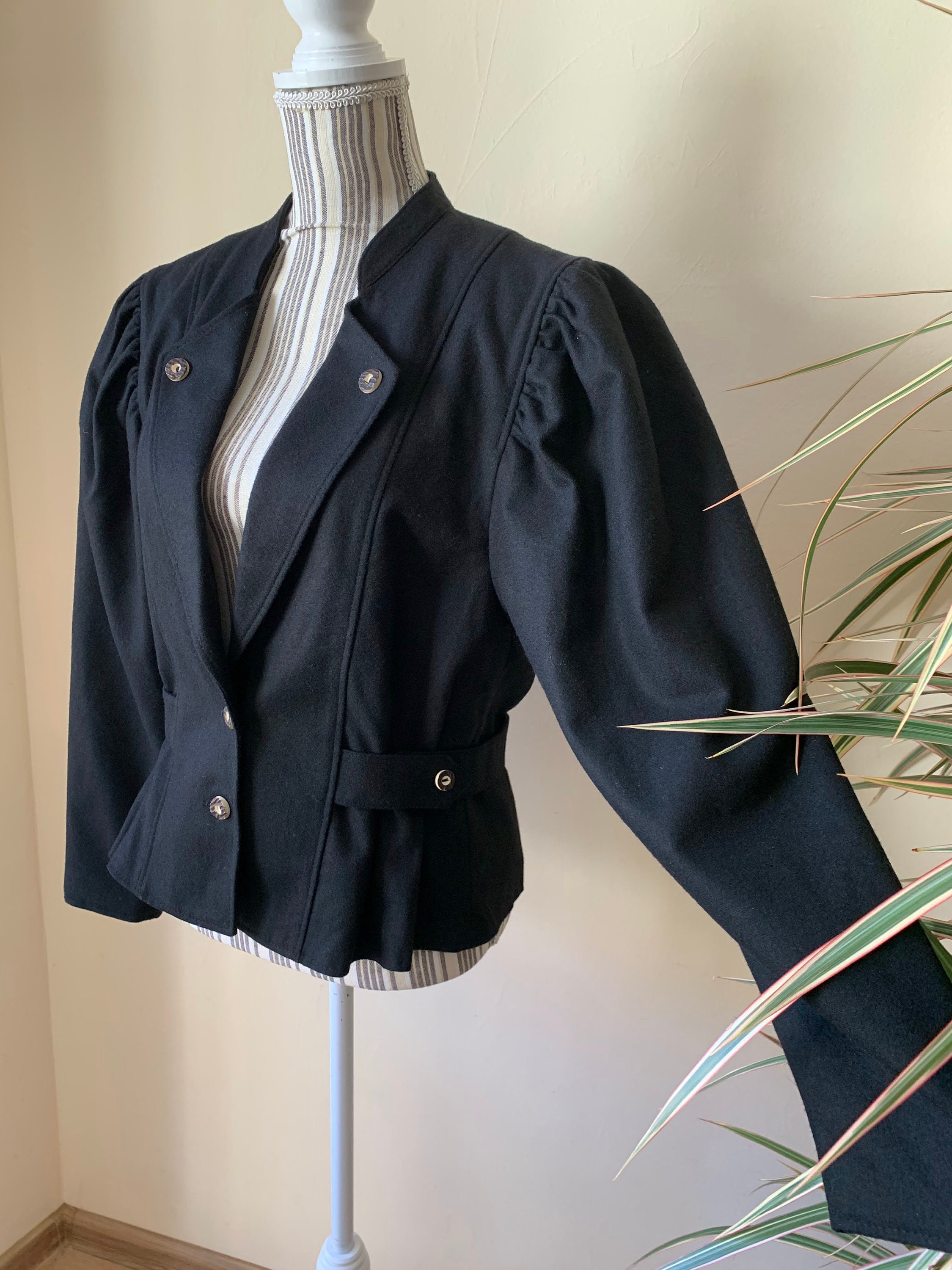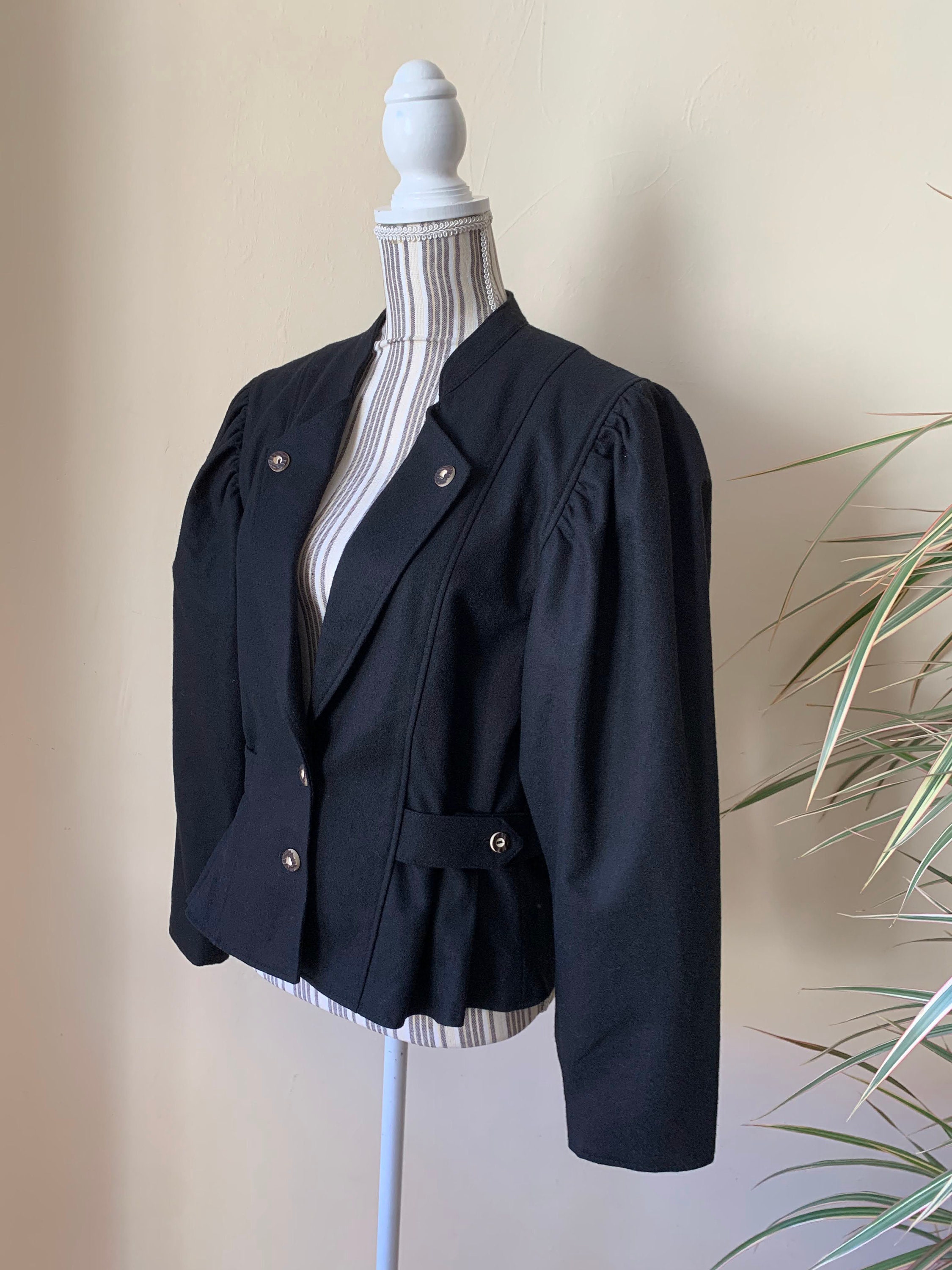 This is s beautiful vintage 80s traditional Trachten jacket in black color. This short dirndl coat is made of warm and cozy wool blend fabric (80% wool, 20% polyamide), it has polyester lining in black color. This Bavarian style cropped wool coat has button up front closure, wide shoulders and puff sleeves. This Tyrolean wool blazer will make a unique and outstanding piece of clothing for any Oktoberfest festival. Great stylish fall/ spring blazer. The size marked is 40, which fits like M. Please check the measurements below.