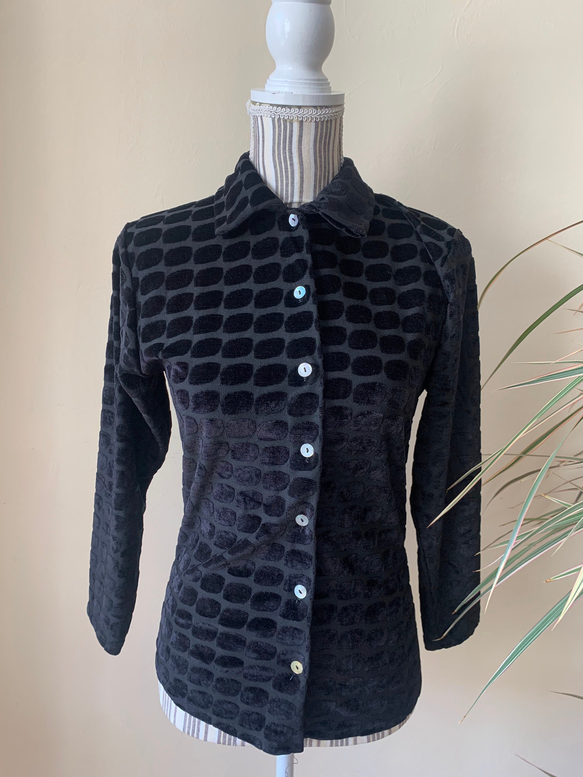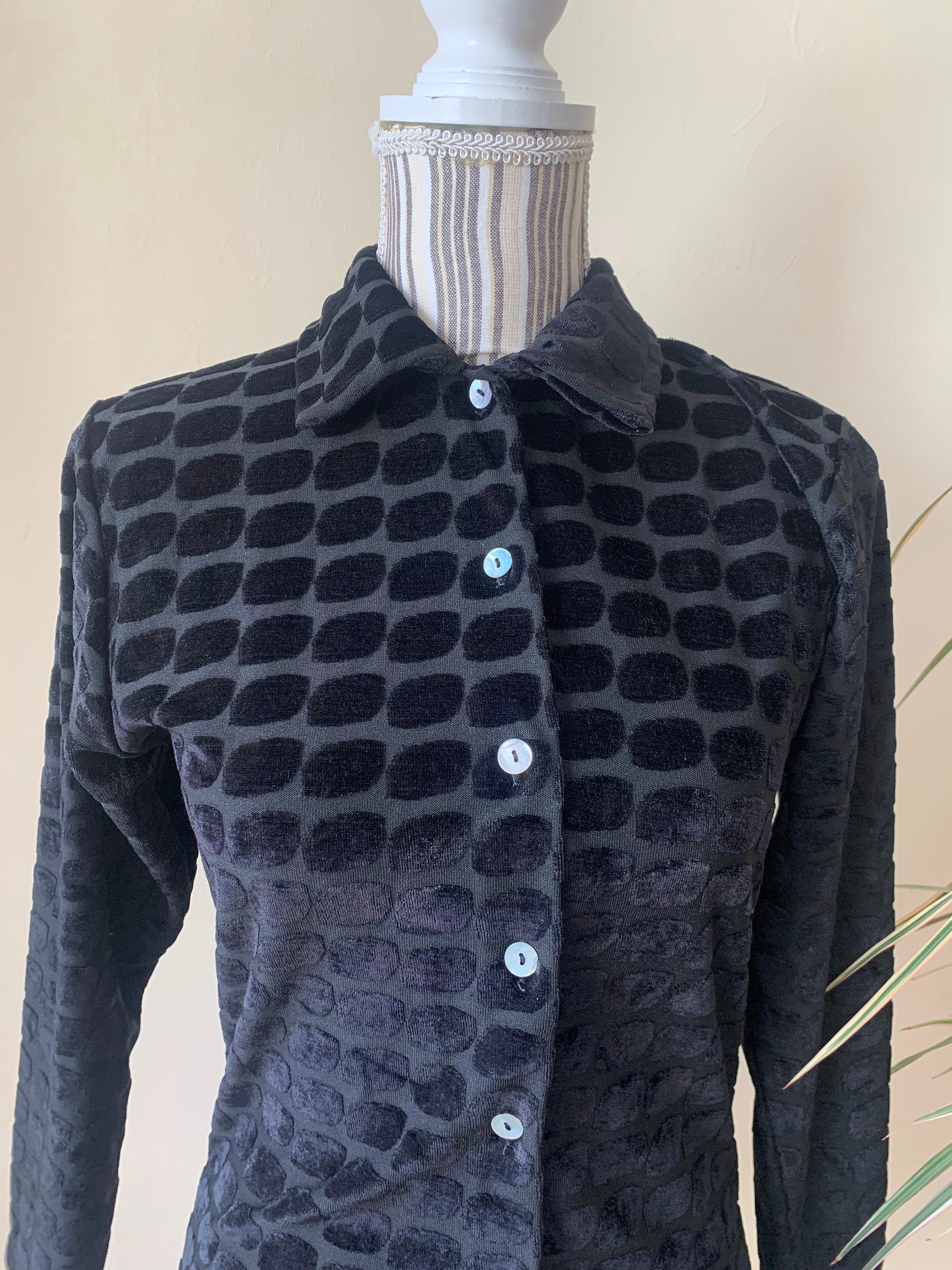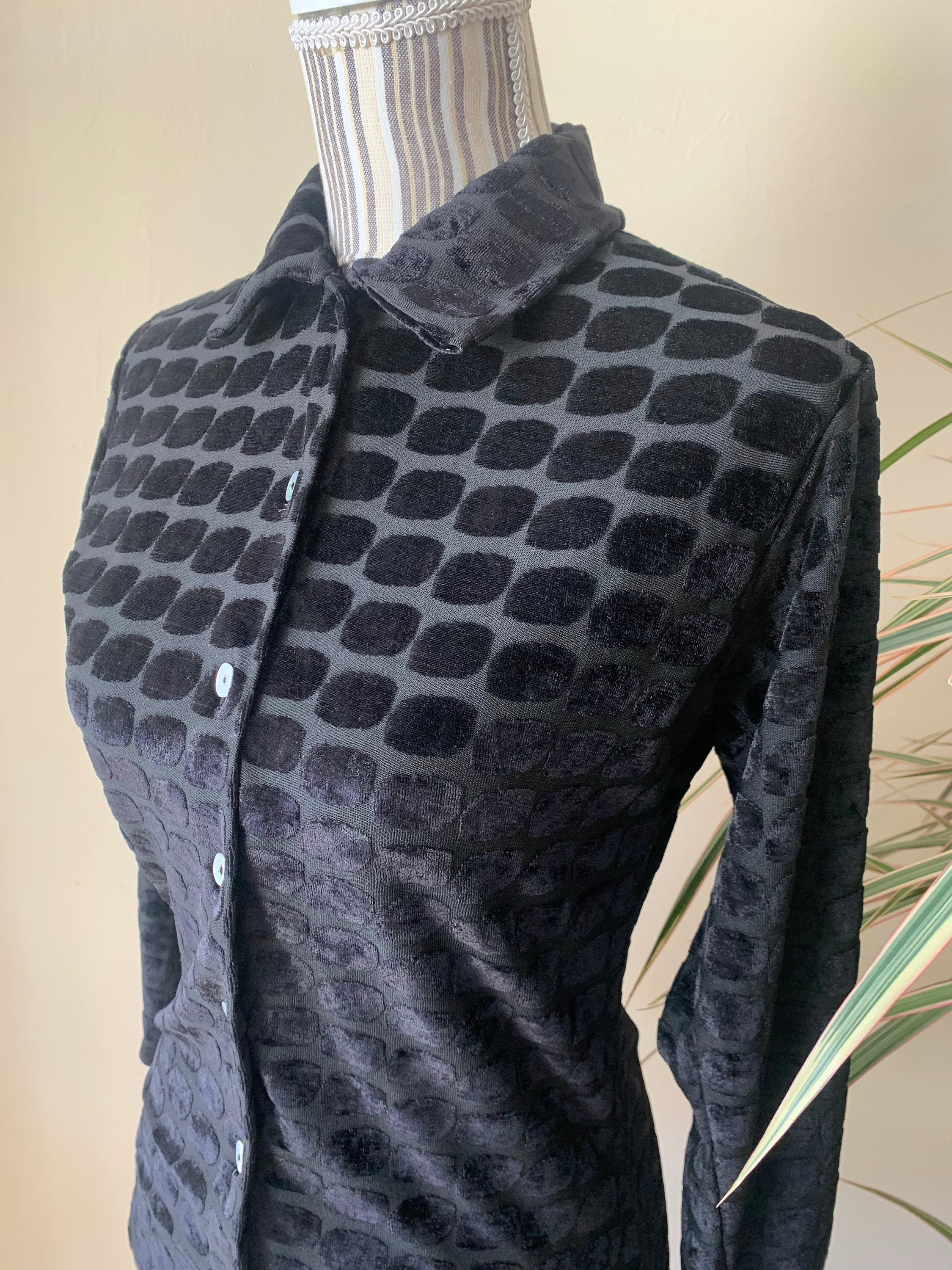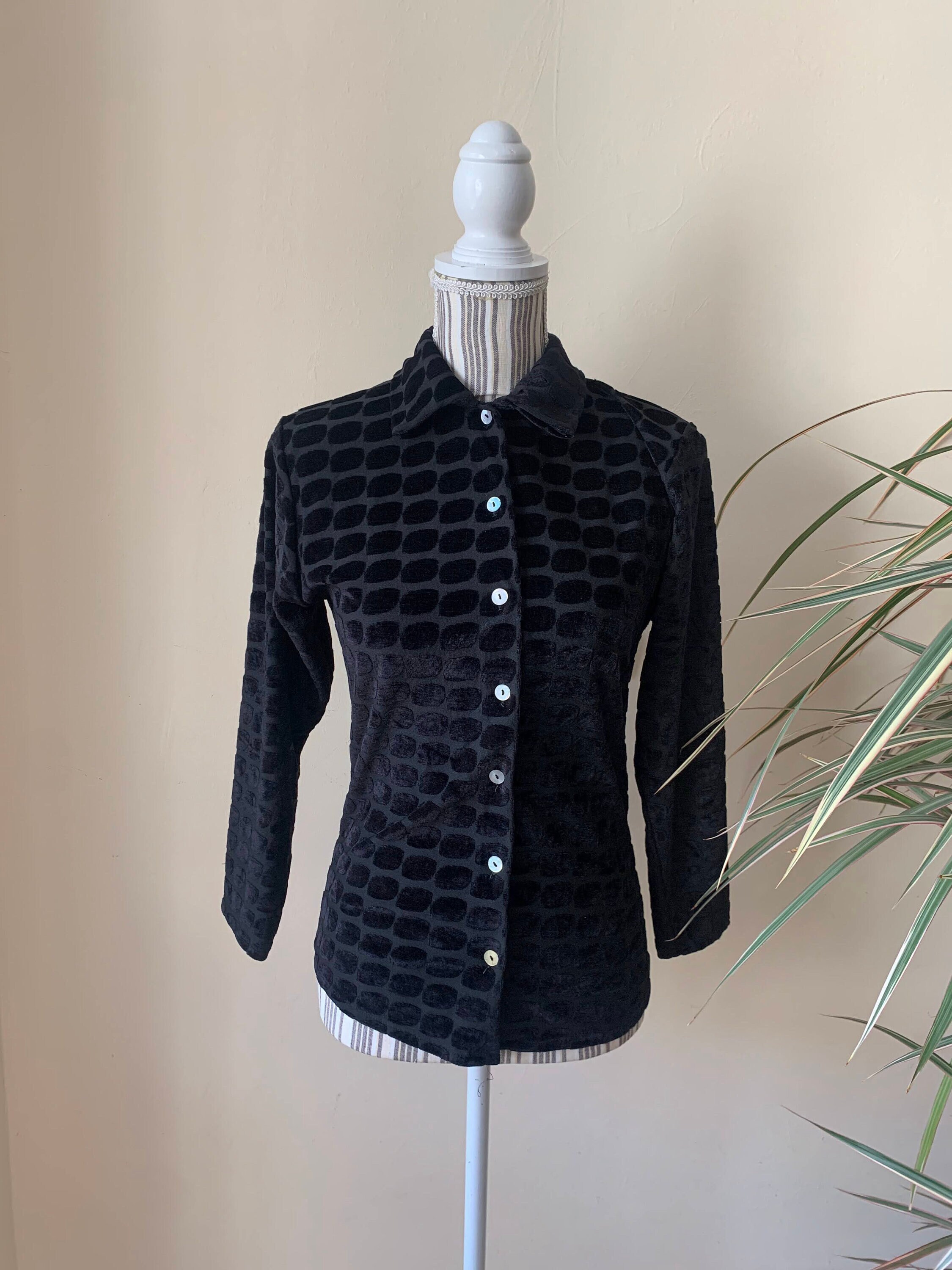 This is vintage 90s black velvet shirt for women with texture. This slim fit velvet button up shirt has a beautiful print with burn out velvet oval shapes. The fabric has some stretch, it is semi sheer. The fabric of this velvet blouse feels like synthetic, it has a silky shine at the velvet parts. This cut out velvet shirt has mother of pearl buttons. As the label has been cut off, there is no size marked on the shirt. It fits like size S / M , please check the measurements below. The sleeves are a bit short for a long sleeve blouse, they fit above the wrist.