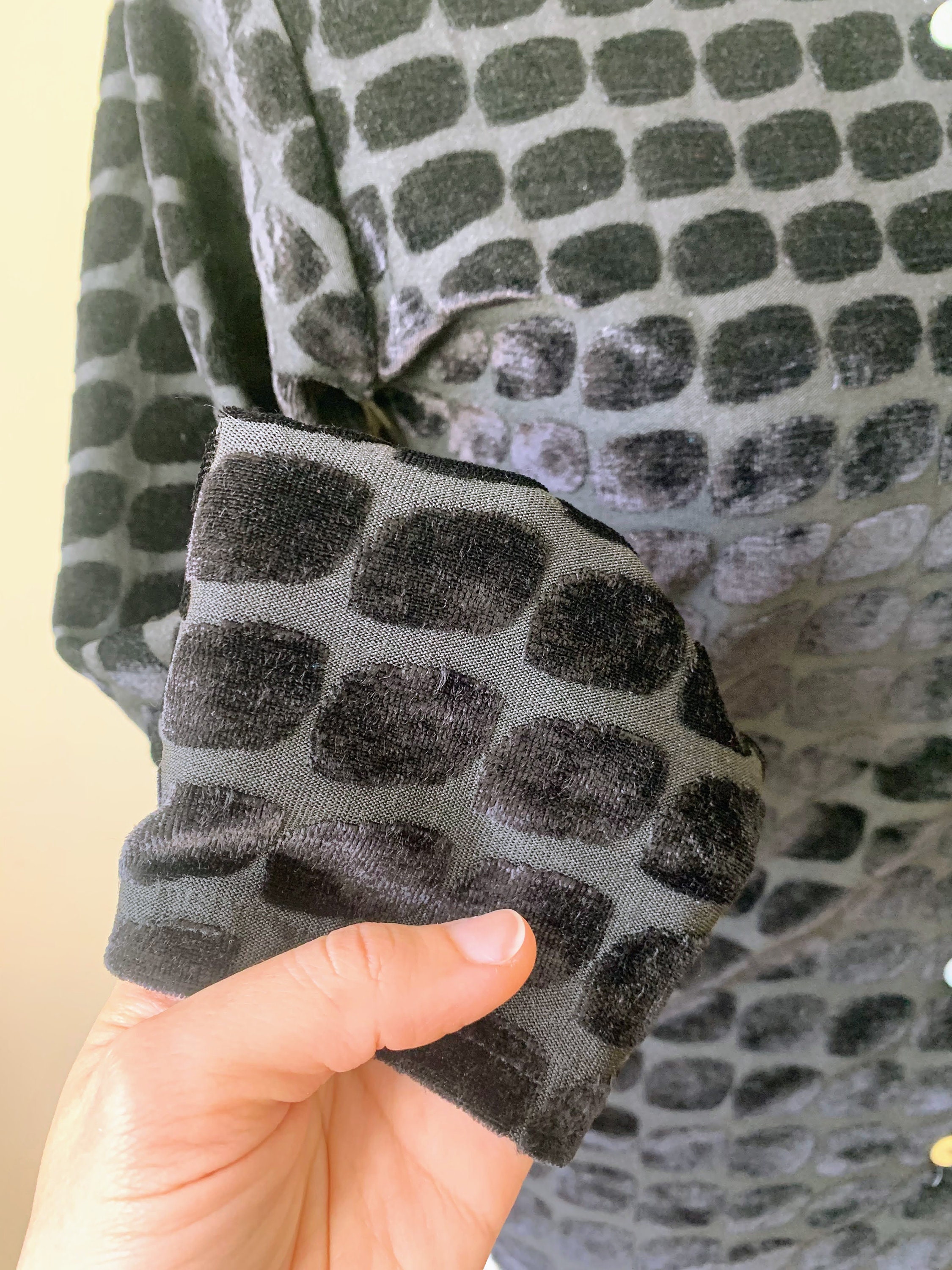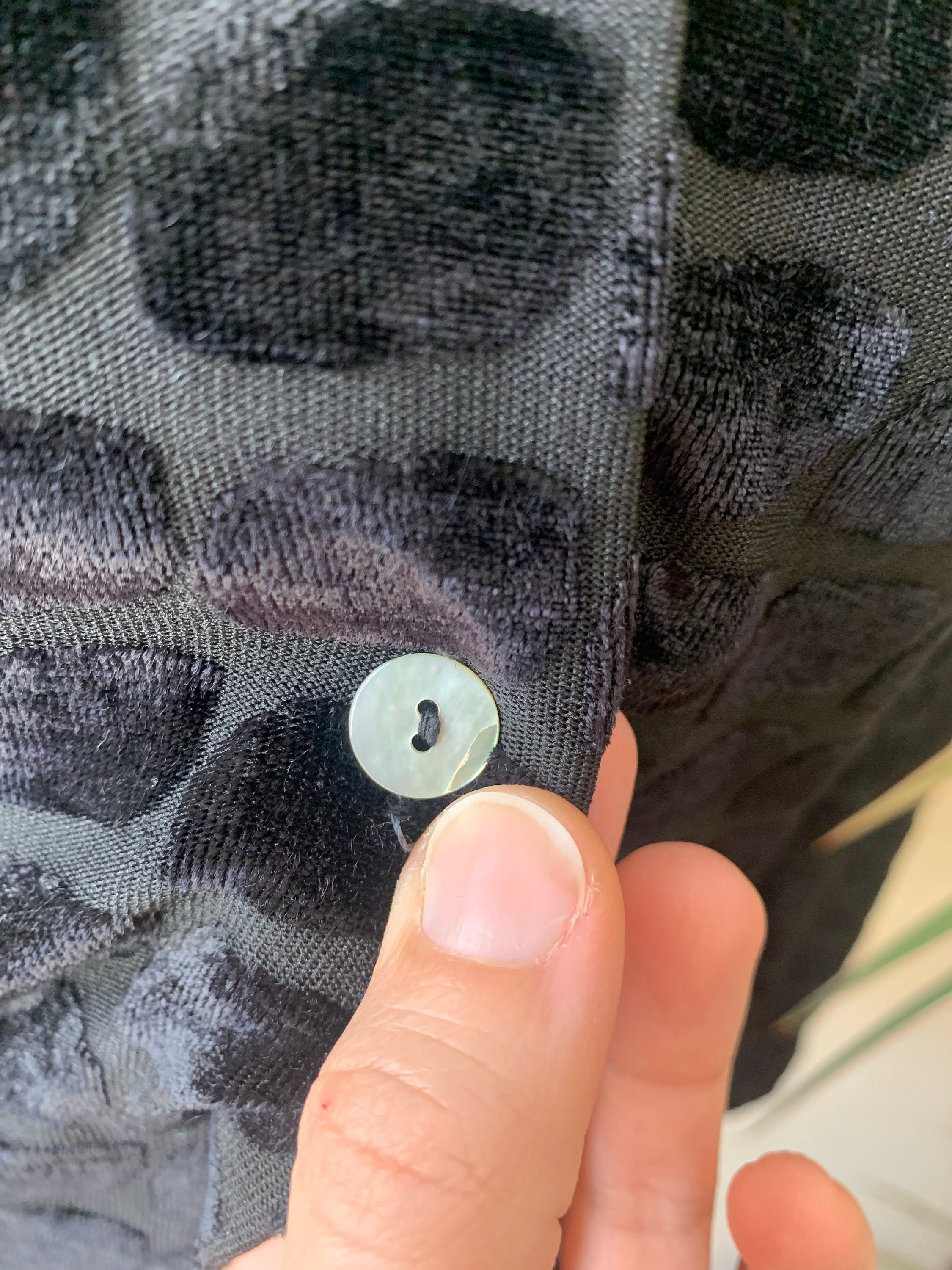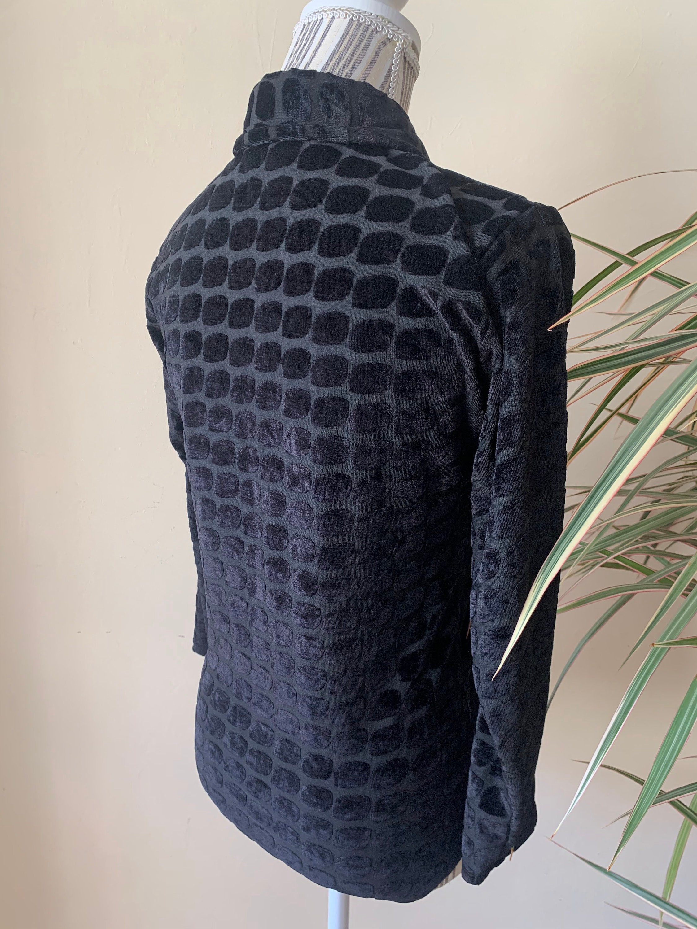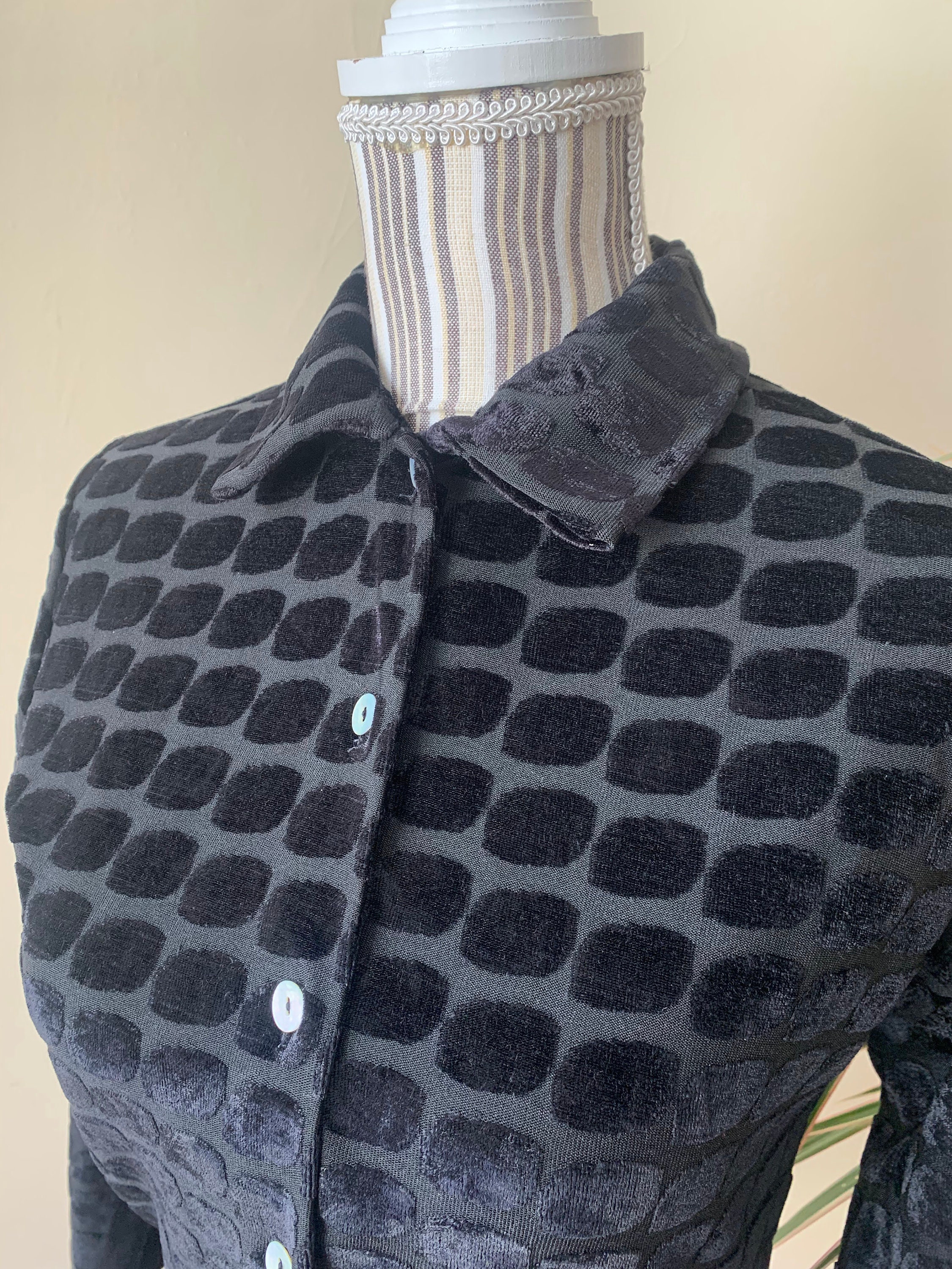 This is vintage 90s black velvet shirt for women with texture. This slim fit velvet button up shirt has a beautiful print with burn out velvet oval shapes. The fabric has some stretch, it is semi sheer. The fabric of this velvet blouse feels like synthetic, it has a silky shine at the velvet parts. This cut out velvet shirt has mother of pearl buttons. As the label has been cut off, there is no size marked on the shirt. It fits like size S / M , please check the measurements below. The sleeves are a bit short for a long sleeve blouse, they fit above the wrist.