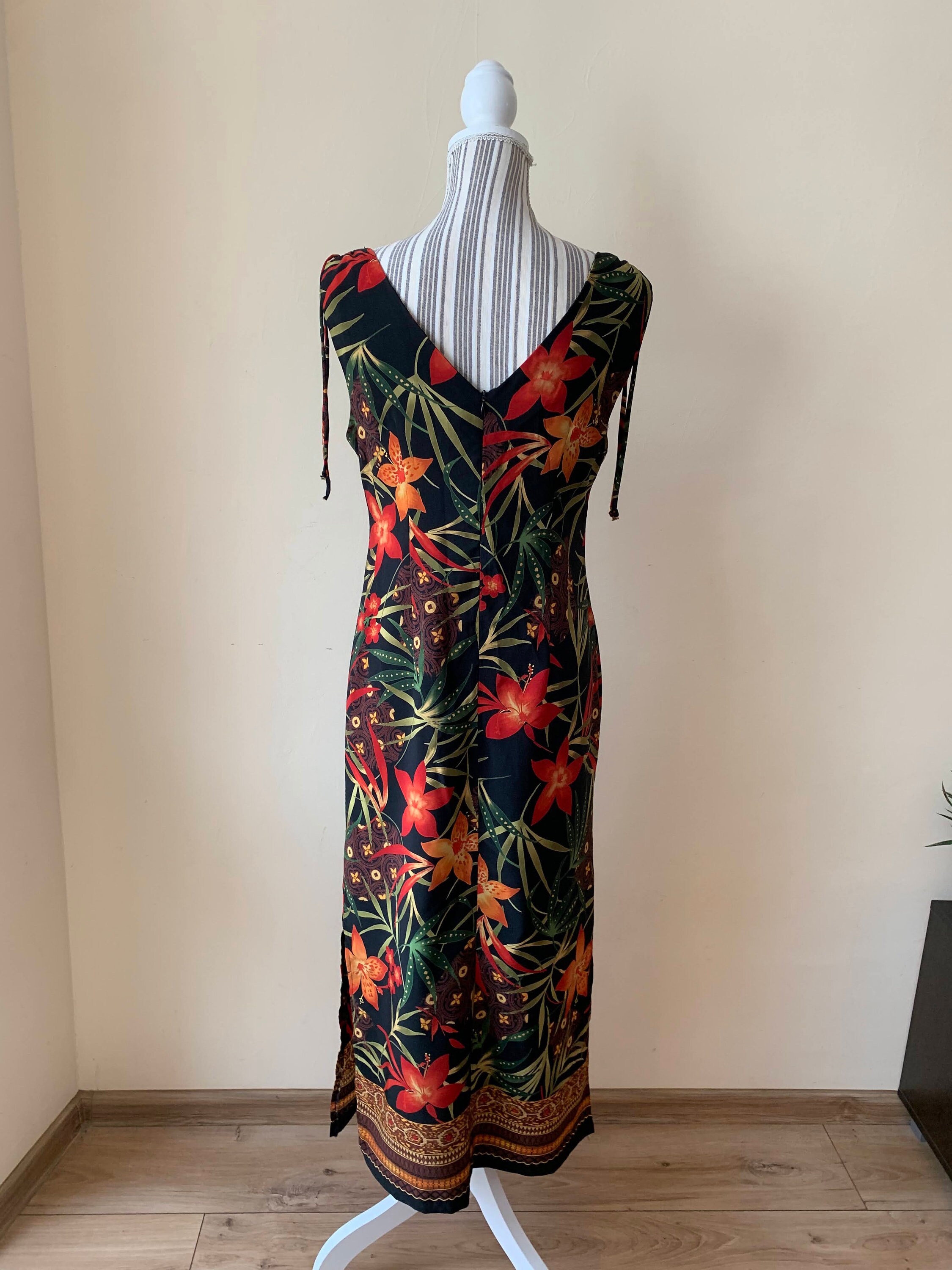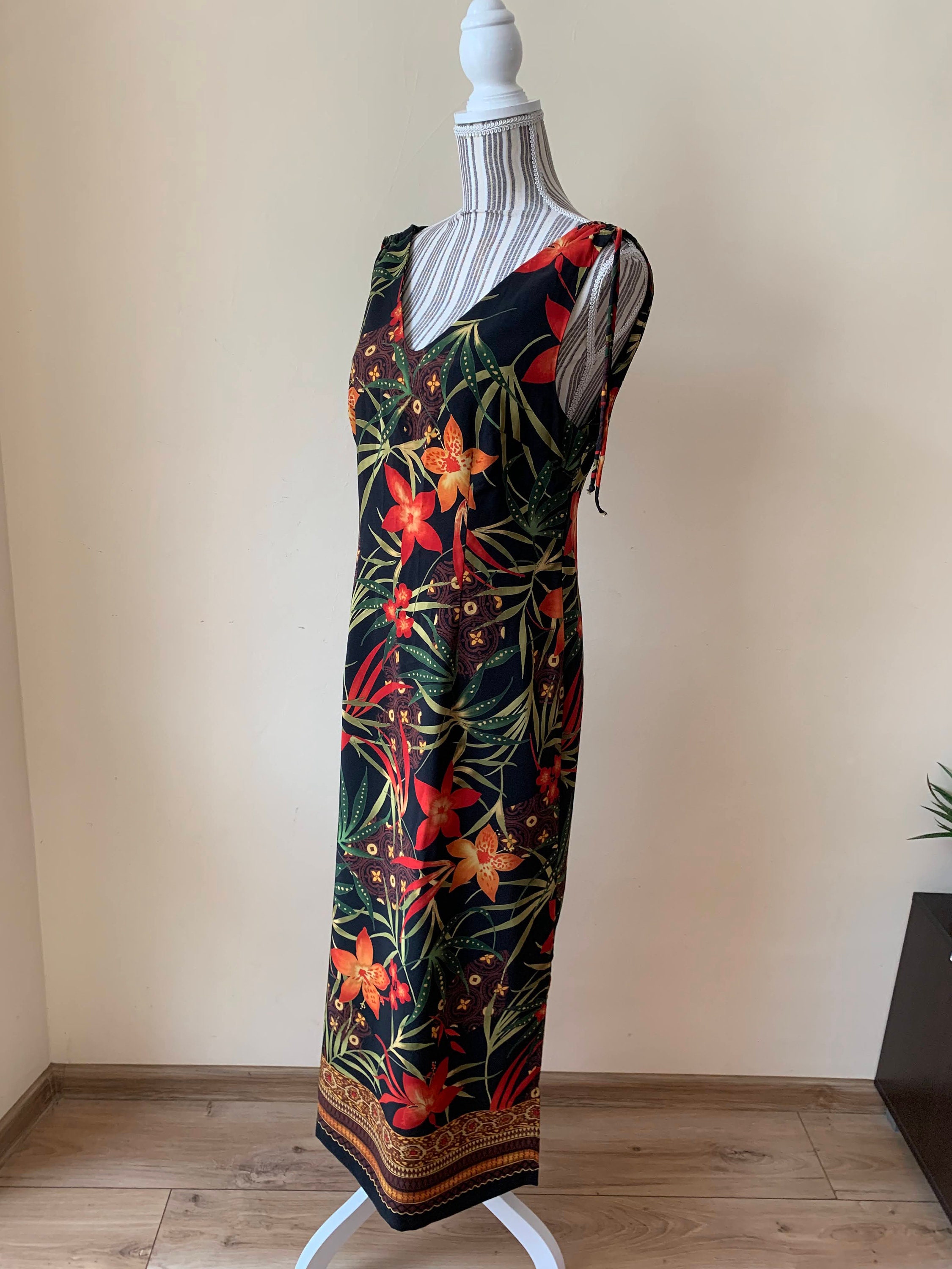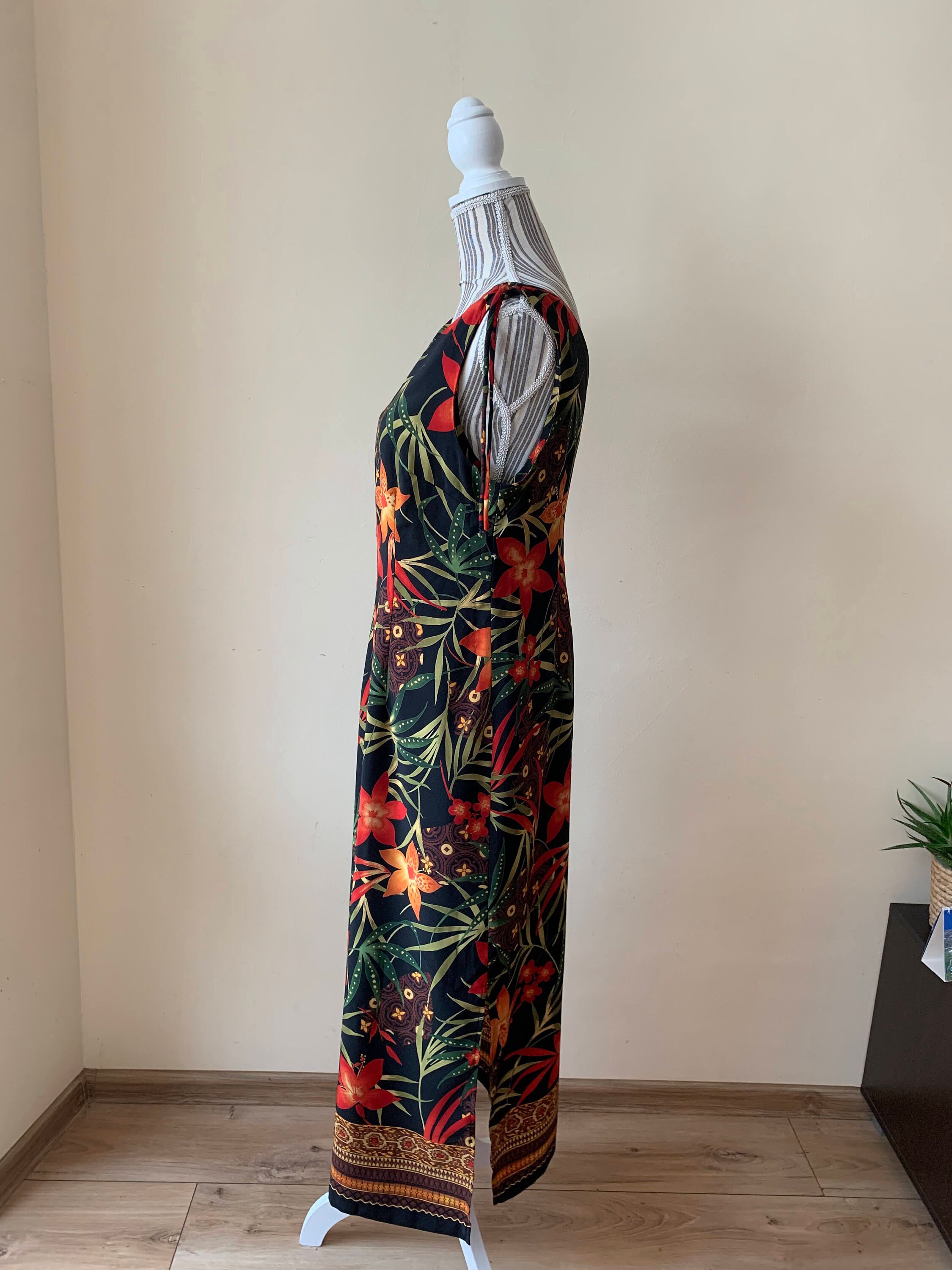 This is a wonderful boho floral maxi dress which dates back to the 90s. This 90s maxi dress is made of polyester fabric with lovely floral tropical print with red and orange flowers and green leaves. This long sun dress has a straight silhouette with side splits on both sides. This long floral dress has ties at the shoulders. This silhouette of this hawaiian boho maxi dress is straight. This 90s resort wear dress has a front and back V neck. The size marked on the label of this sleeveless summer maxi dress is 8, which fits like size M. Please check the measurements below.