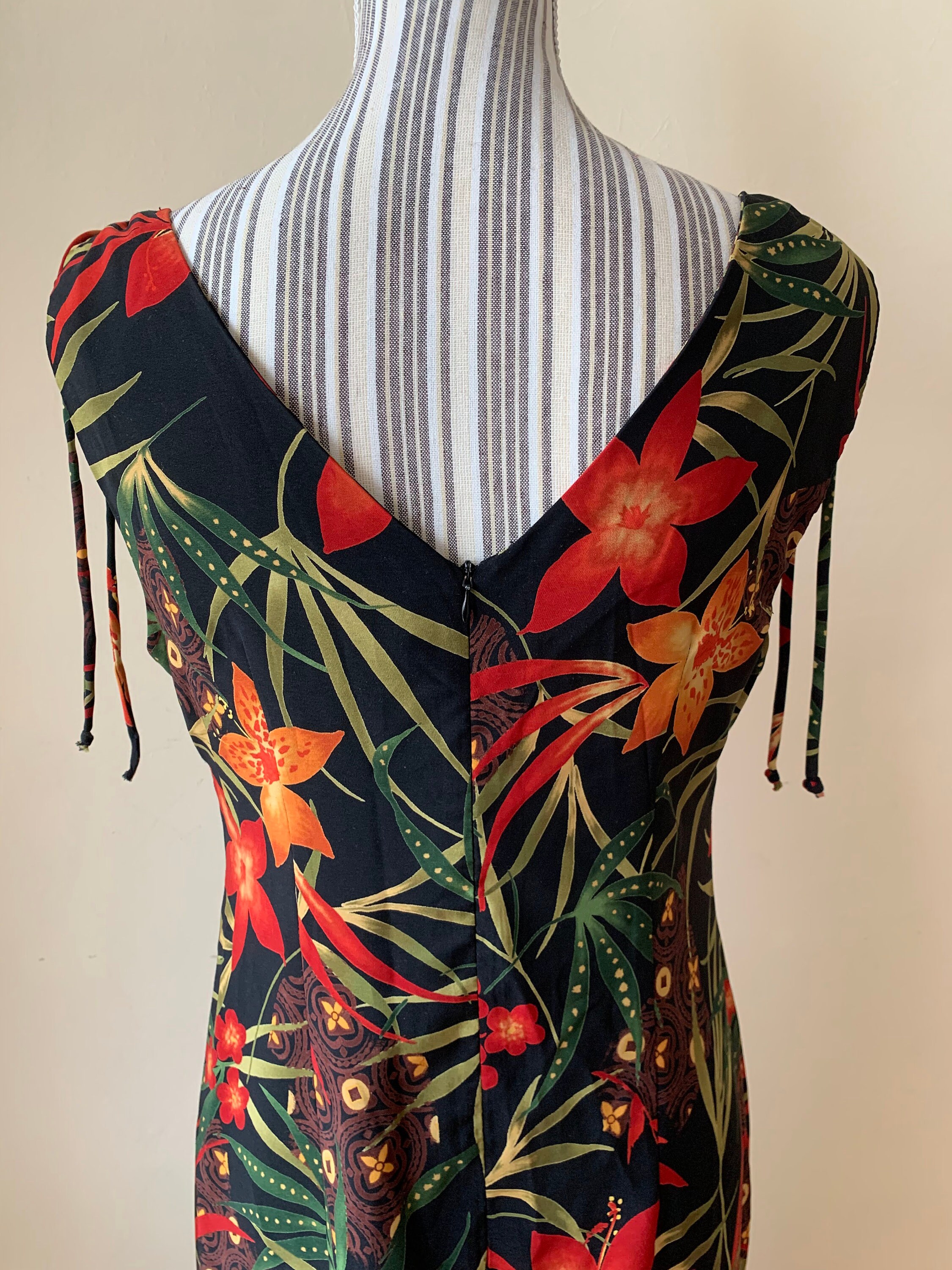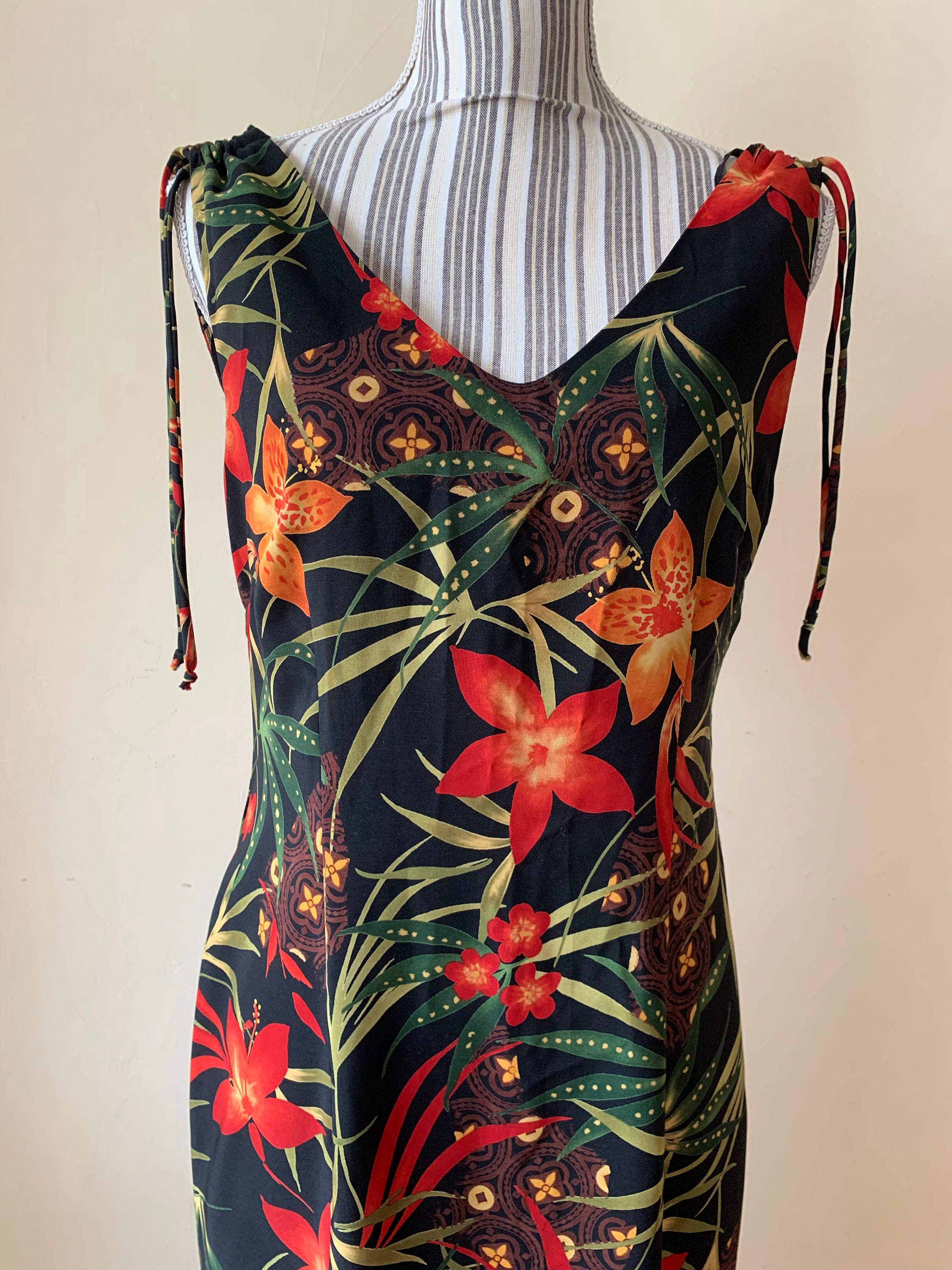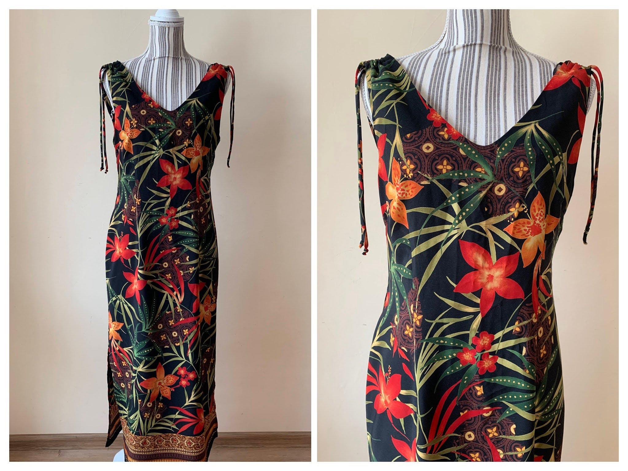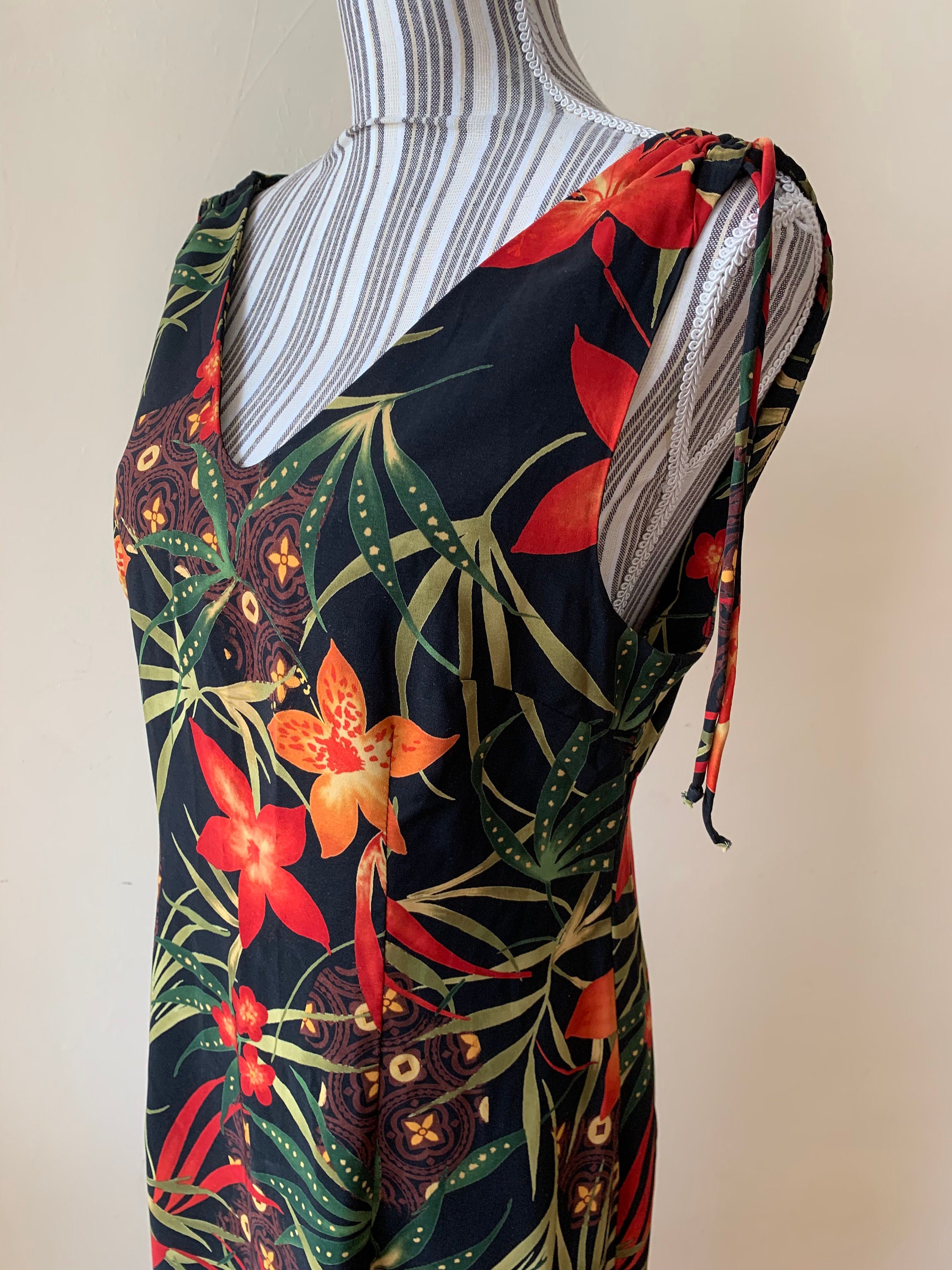 This is a wonderful boho floral maxi dress which dates back to the 90s. This 90s maxi dress is made of polyester fabric with lovely floral tropical print with red and orange flowers and green leaves. This long sun dress has a straight silhouette with side splits on both sides. This long floral dress has ties at the shoulders. This silhouette of this hawaiian boho maxi dress is straight. This 90s resort wear dress has a front and back V neck. The size marked on the label of this sleeveless summer maxi dress is 8, which fits like size M. Please check the measurements below.