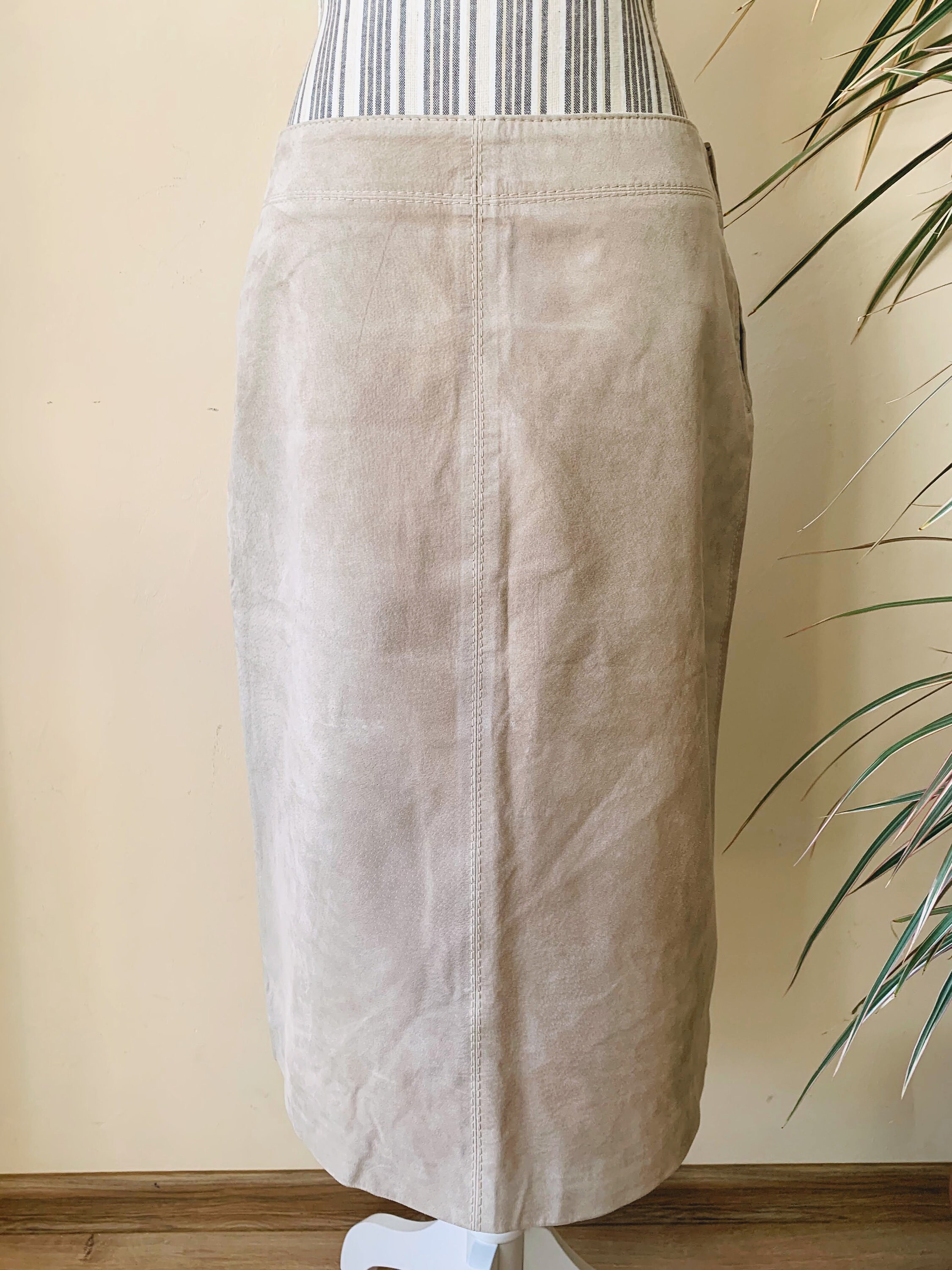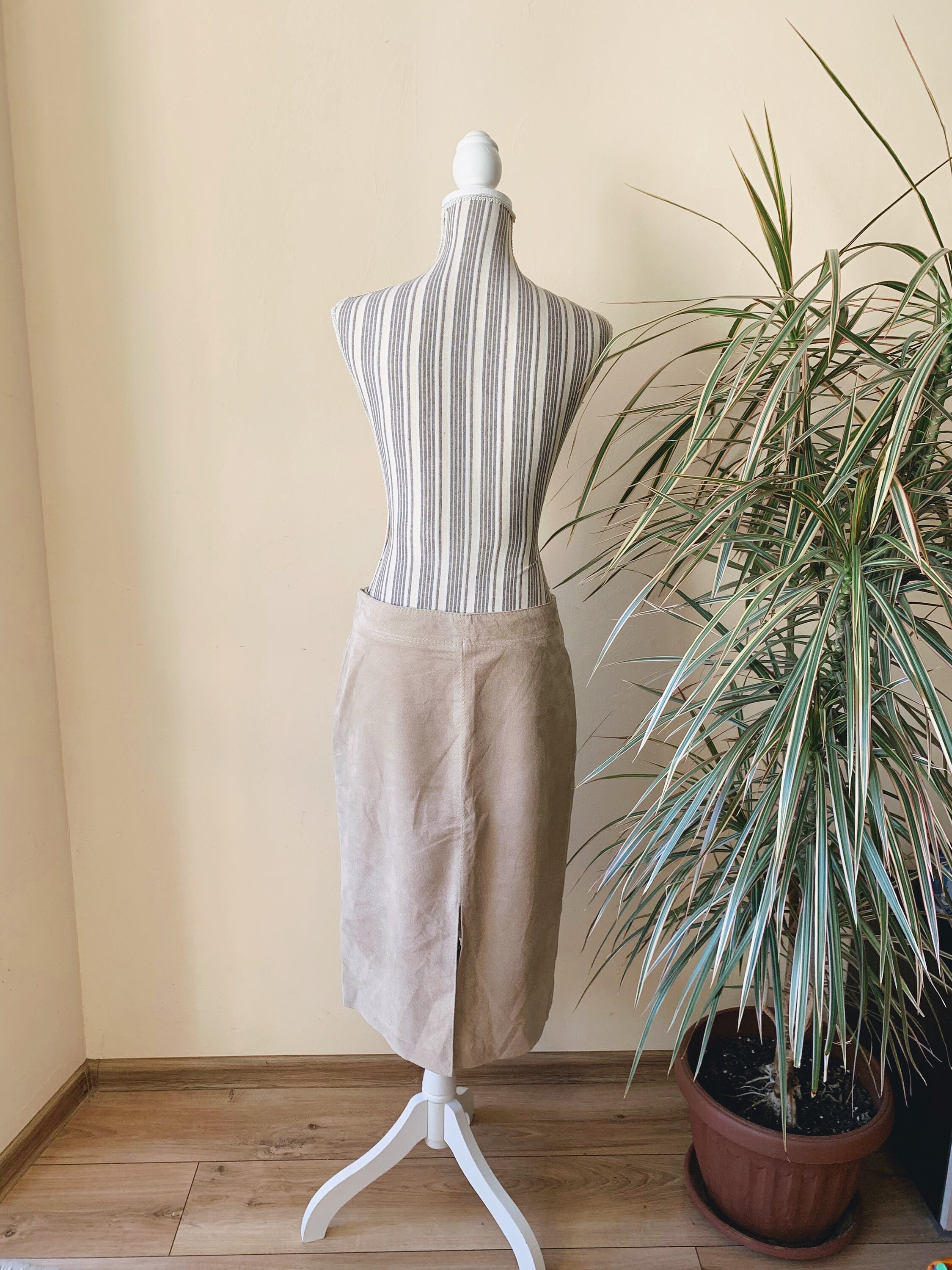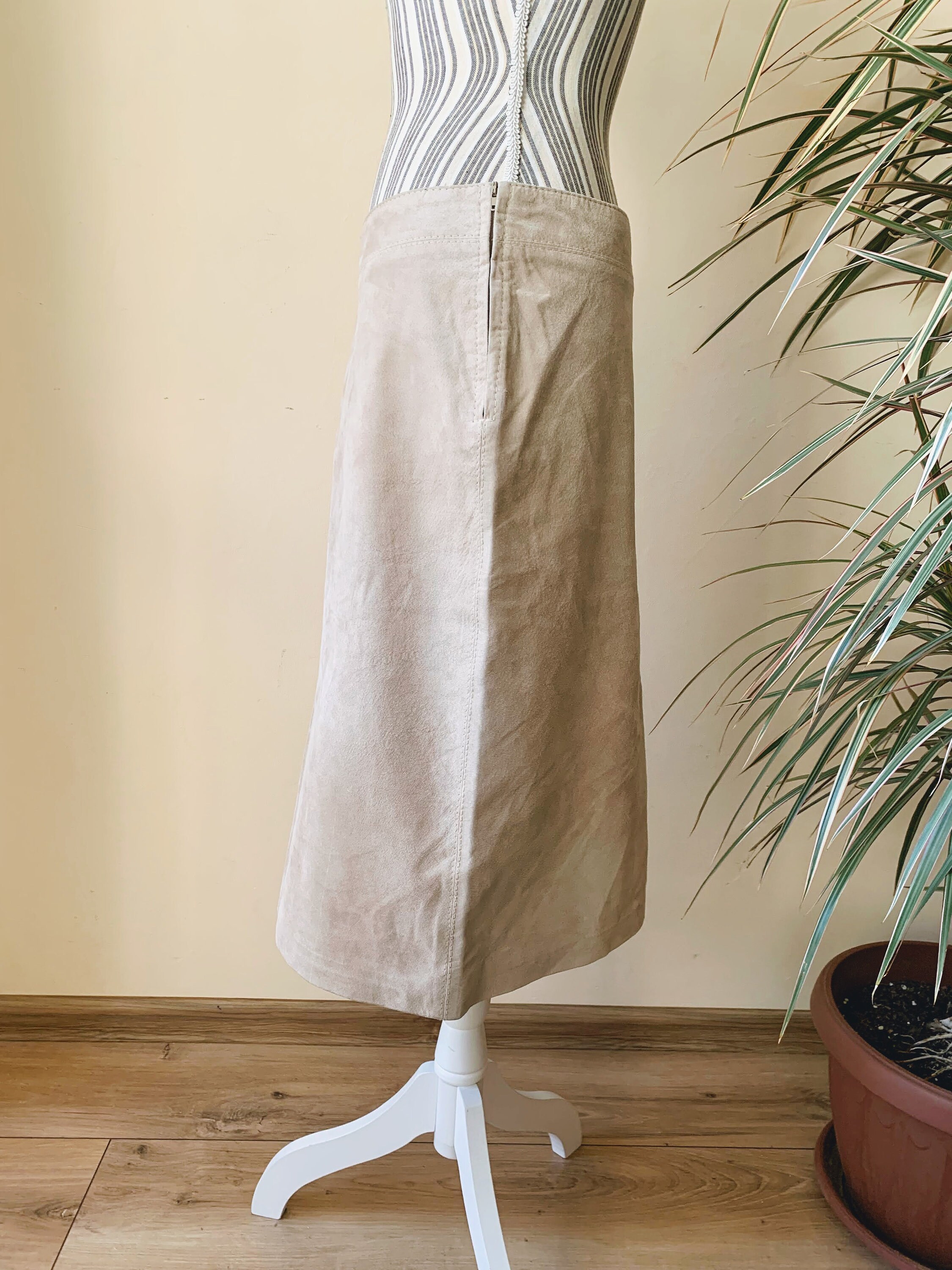 This is a soft suede leather skirt in tan beige color by the brand Haust. This straight skirt has a back zip closure and back split. This genuine leather pencil skirt falls below the knee, it reaches down to the mid calf. This boho chic suede skirt has a straight silhouette. It has polyester lining underneath. This festival bohemian skirt is perfect for daily wear. You can pair this suede leather skirt with a simple white t-shirt or an elegant flowy shirt, it will look amazing anyway you decide to pair it. The size marked on the label is EUR 38. It corresponds to size S/M. Please check the measurements below