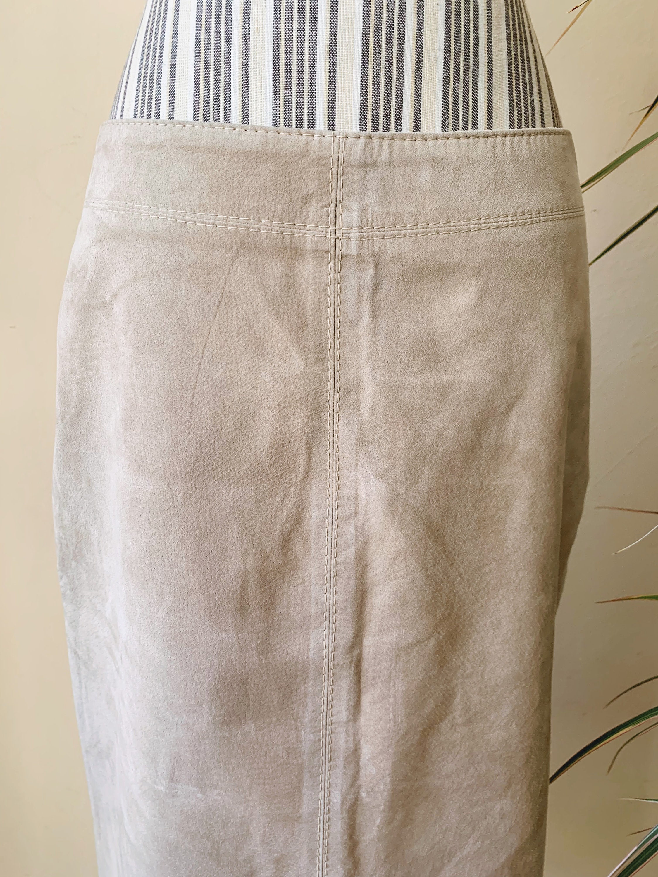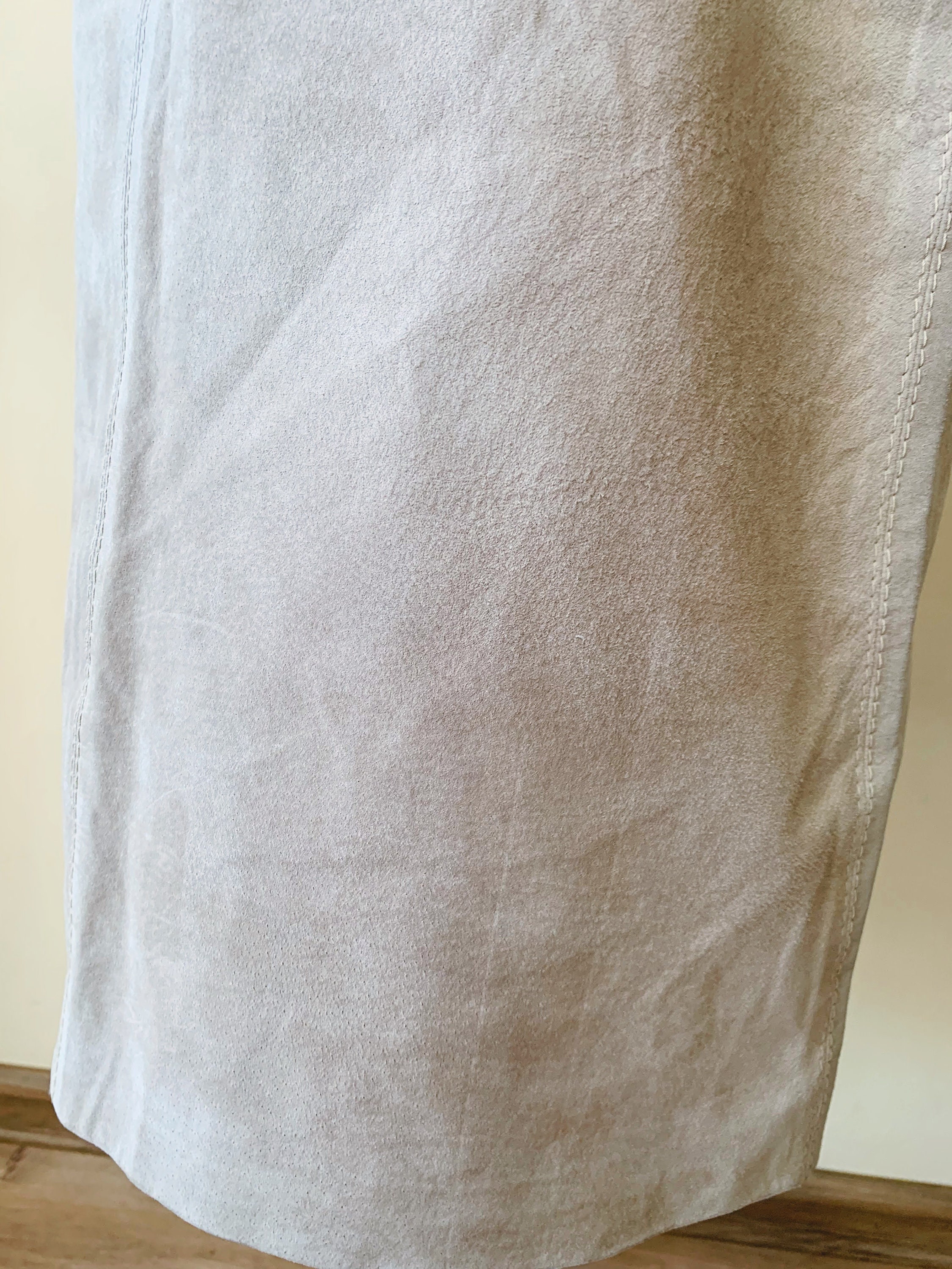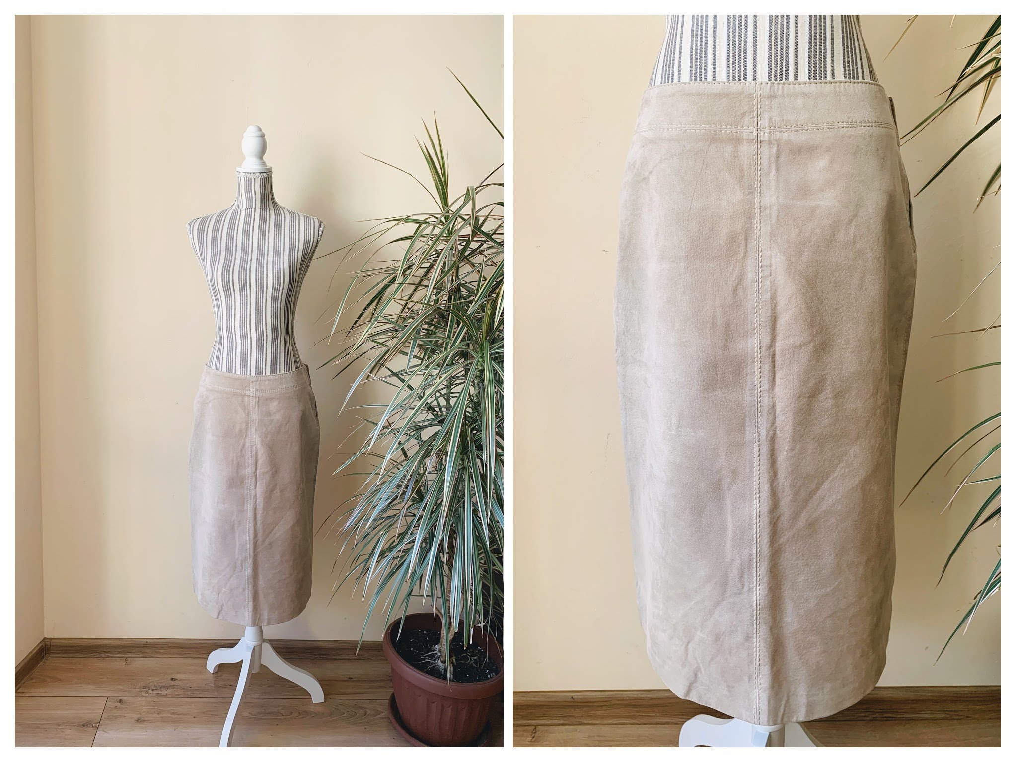 This is a soft suede leather skirt in tan beige color by the brand Haust. This straight skirt has a back zip closure and back split. This genuine leather pencil skirt falls below the knee, it reaches down to the mid calf. This boho chic suede skirt has a straight silhouette. It has polyester lining underneath. This festival bohemian skirt is perfect for daily wear. You can pair this suede leather skirt with a simple white t-shirt or an elegant flowy shirt, it will look amazing anyway you decide to pair it. The size marked on the label is EUR 38. It corresponds to size S/M. Please check the measurements below
