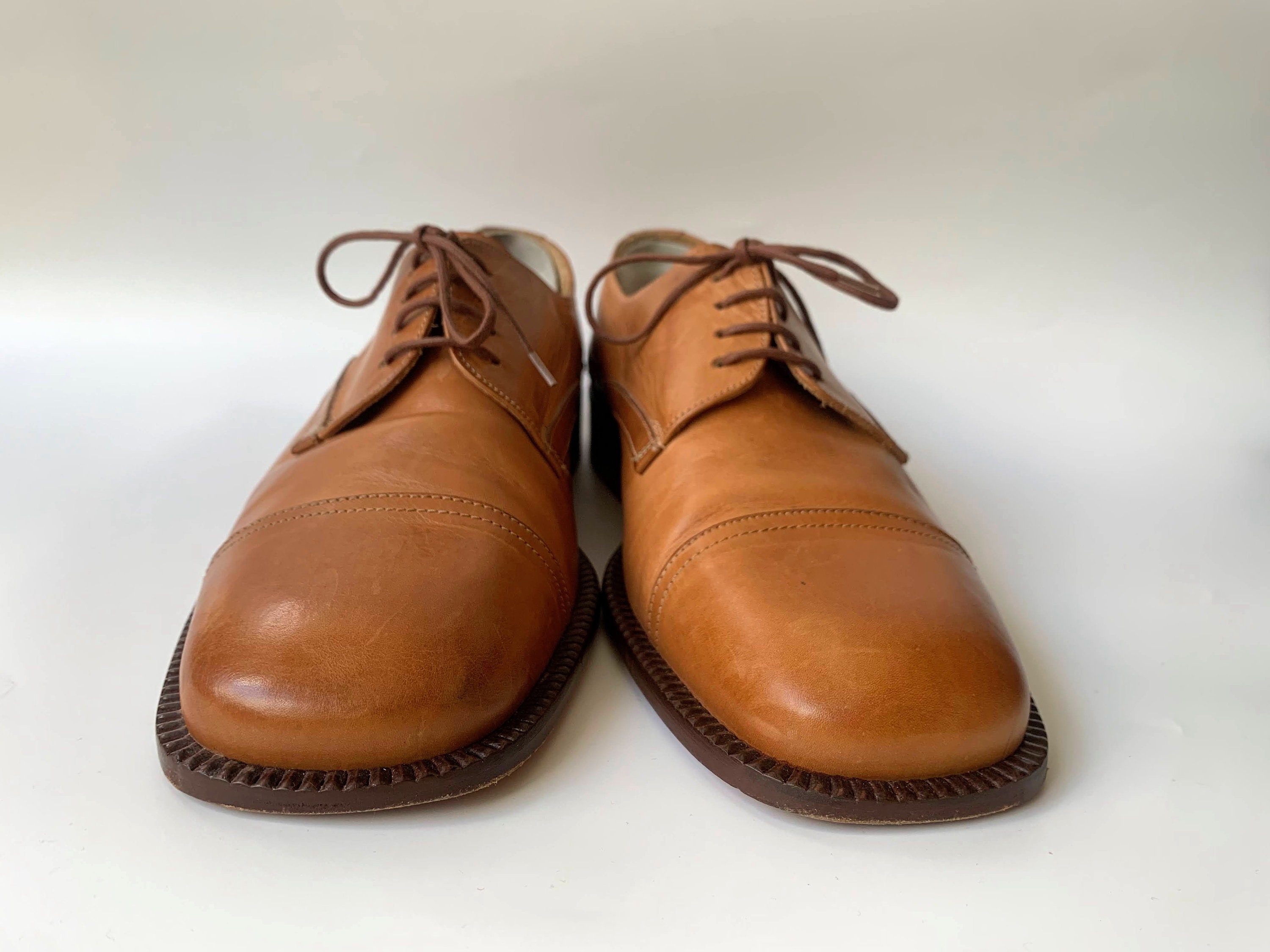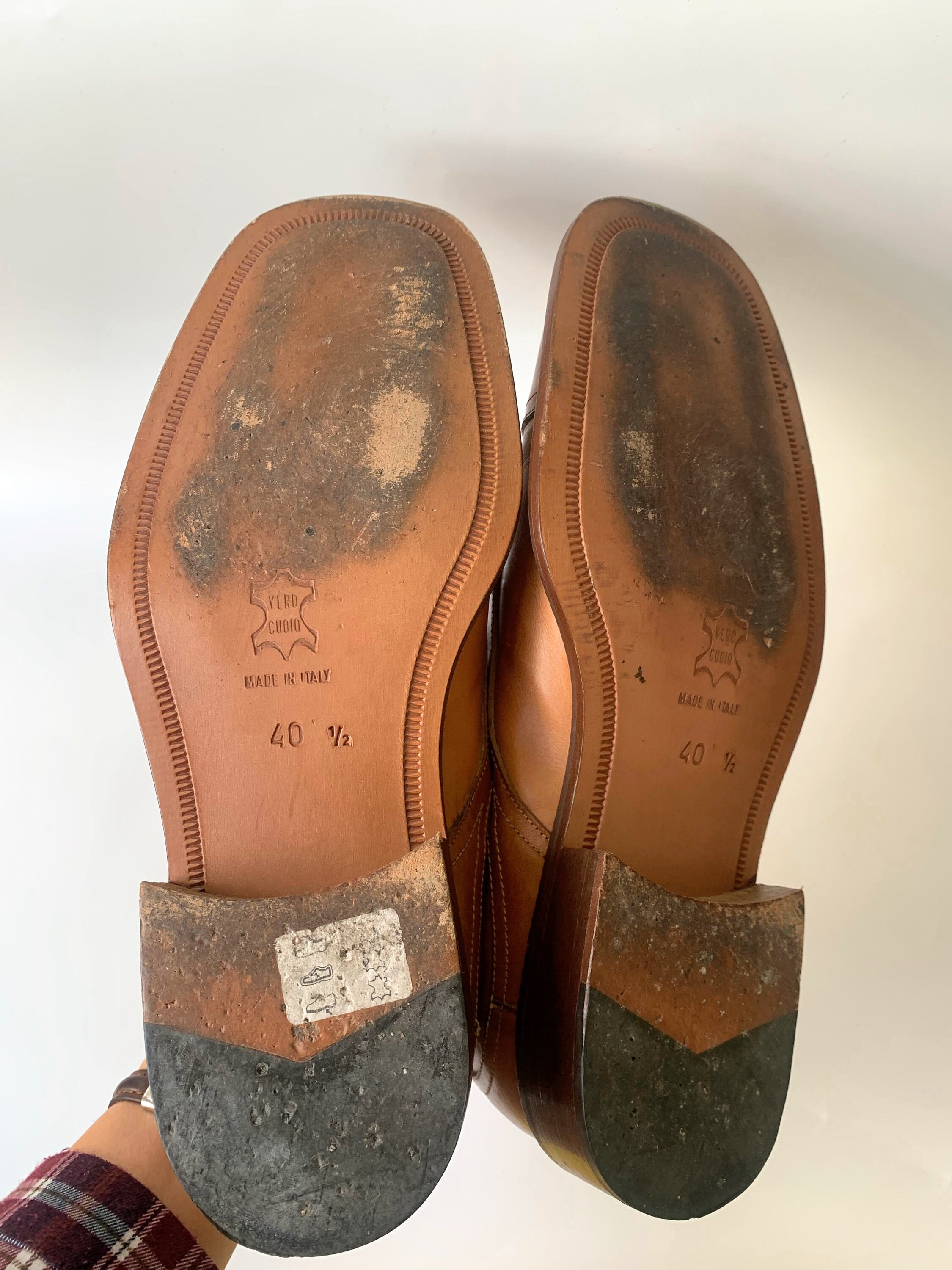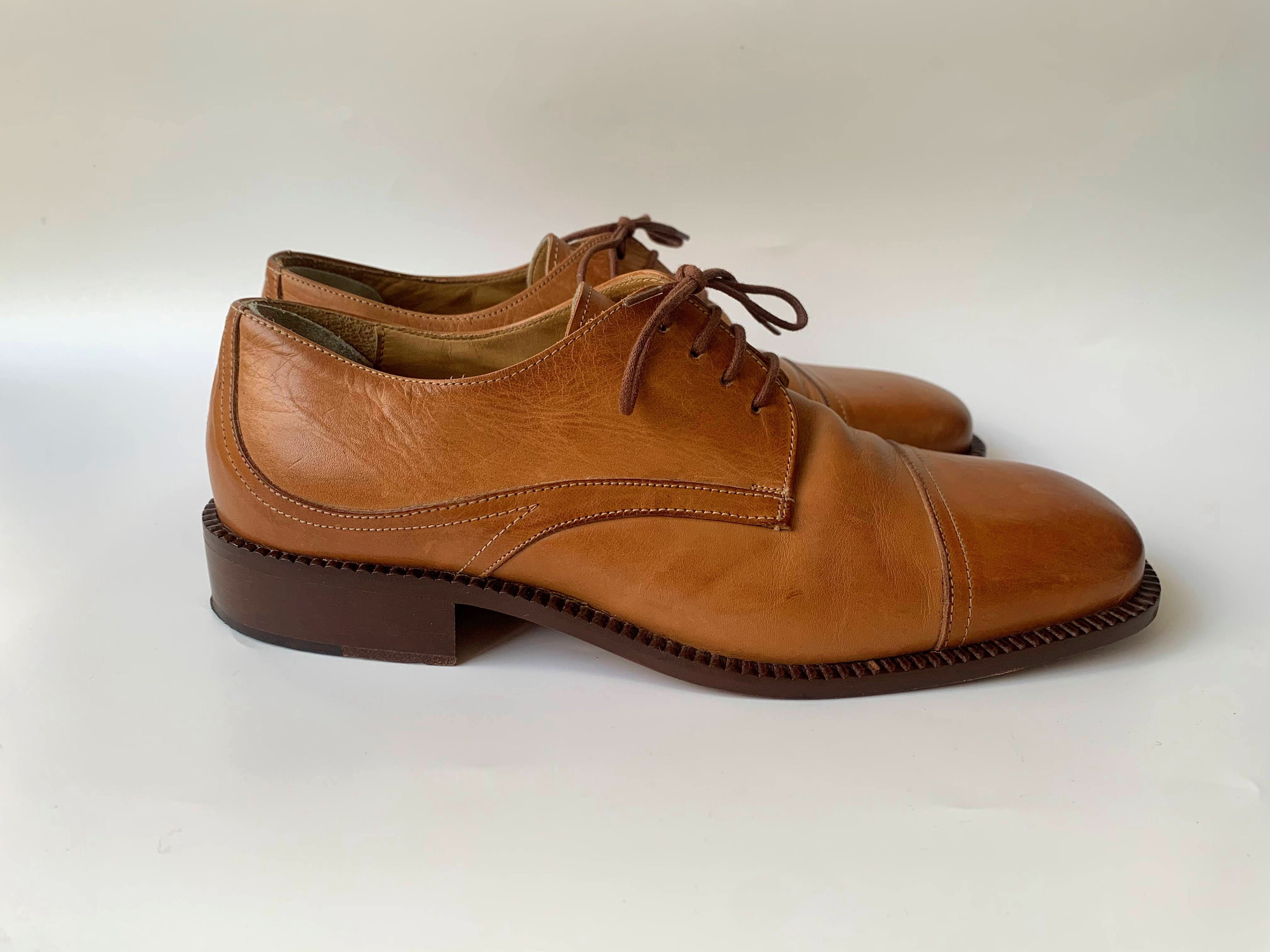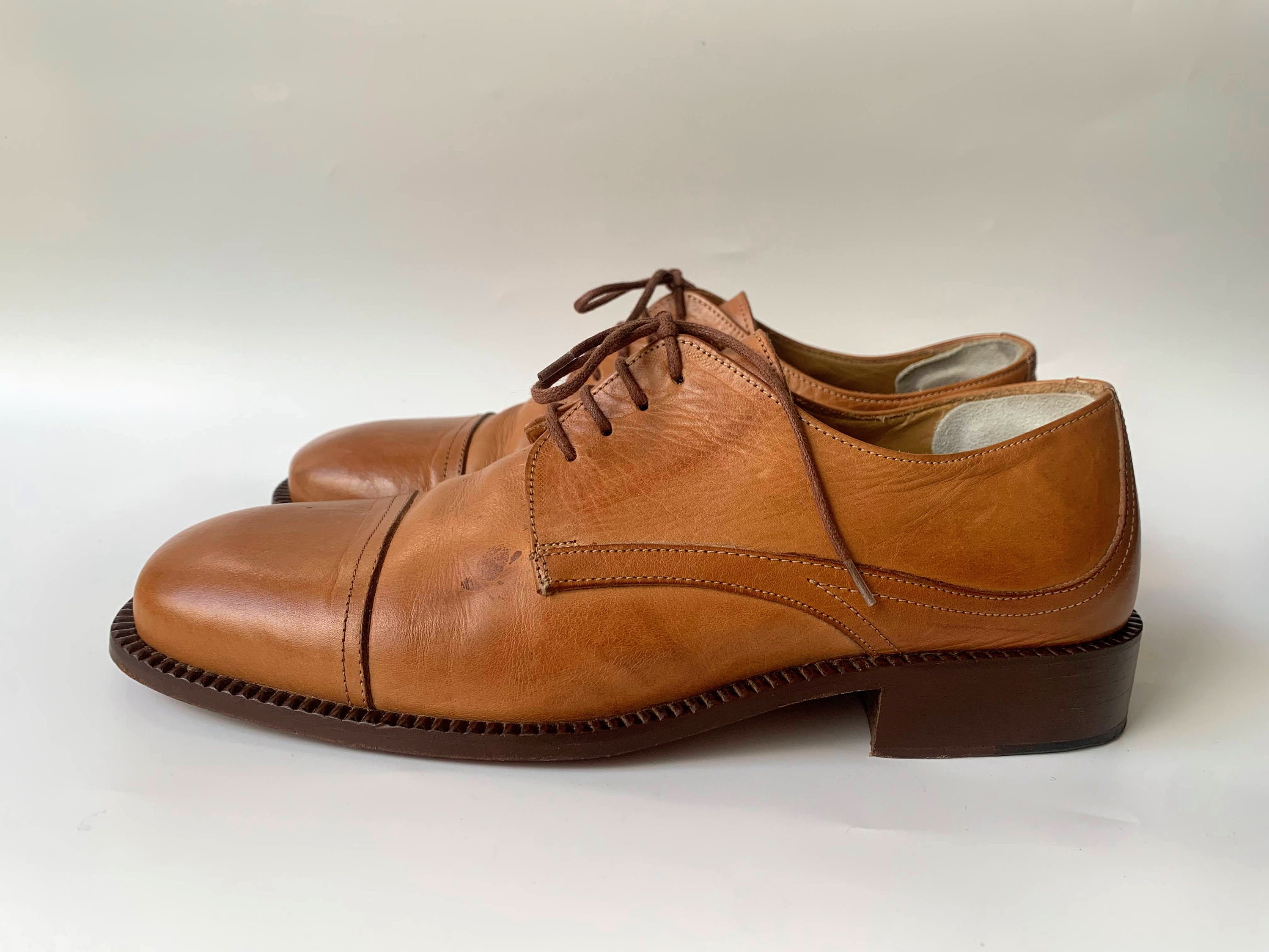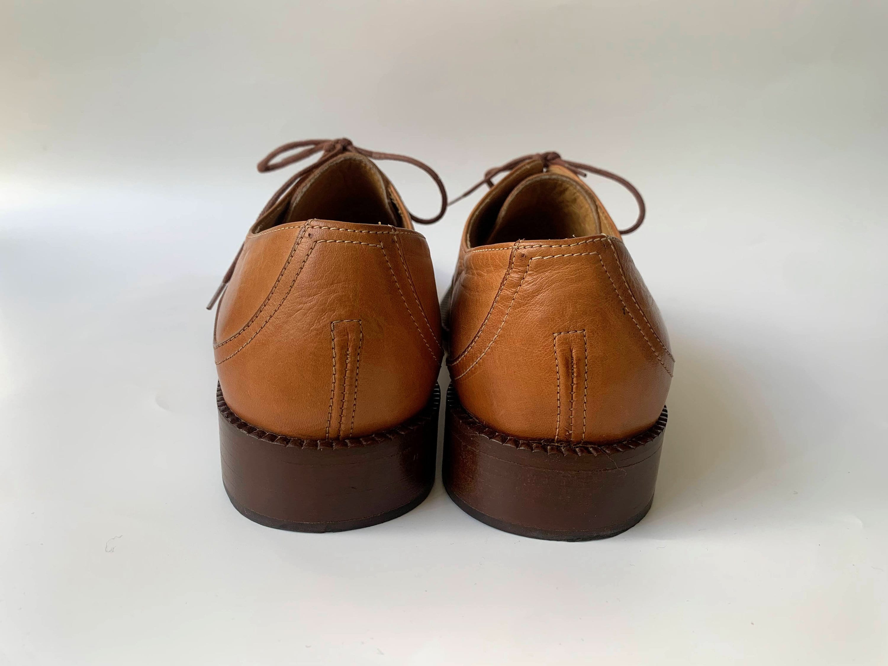 These are vintage Italian leather dress shoes for men in camel brown color. These light brown dress shoes date back to the 90s. They are by the brand Noir&Co. These office oxford shoes for men are made of genuine leather with leather soles. These casual office shoes are size 40 1/2, which fits like UK 7 or US 8 Mens. Please check the measurements below.