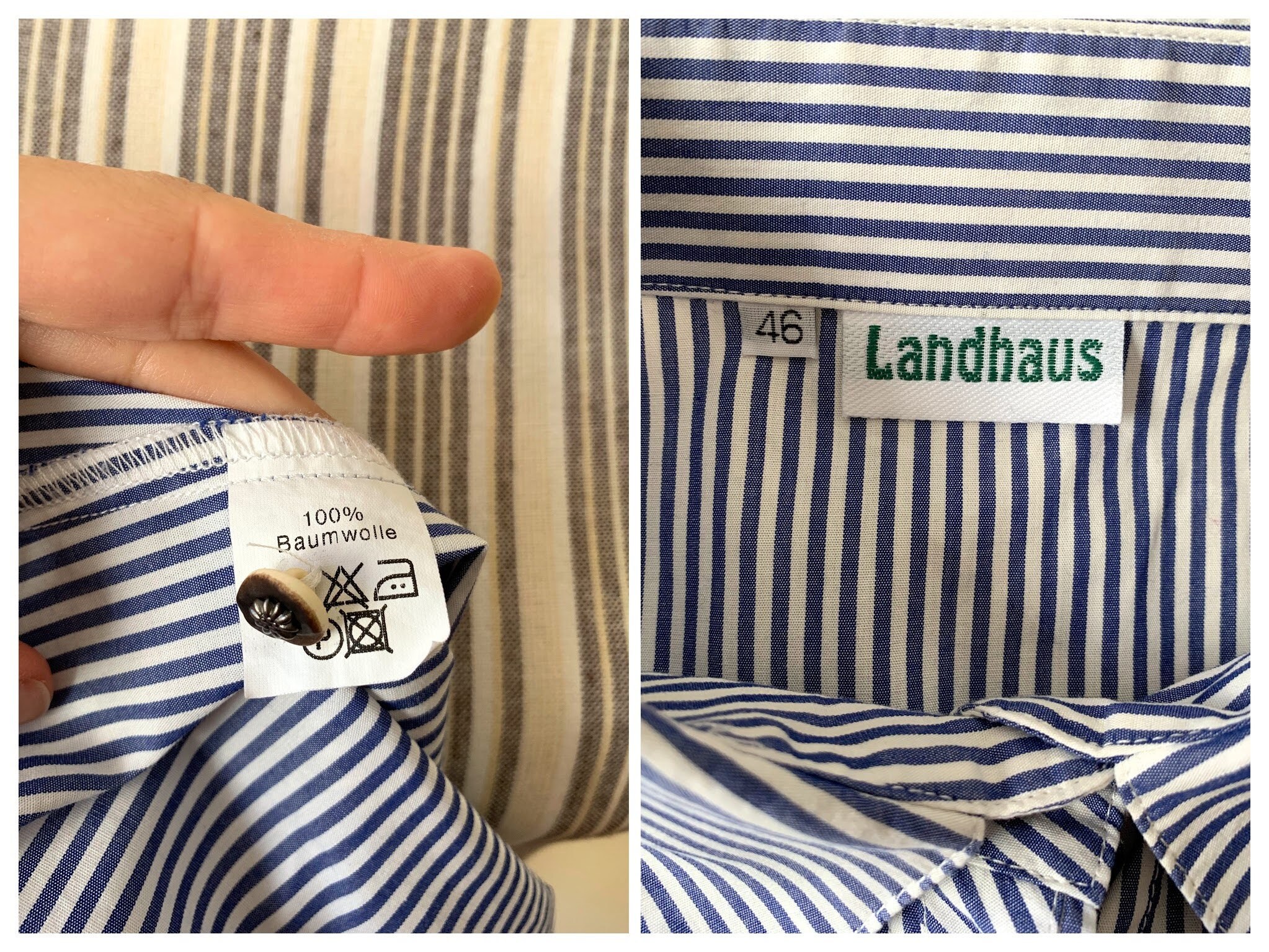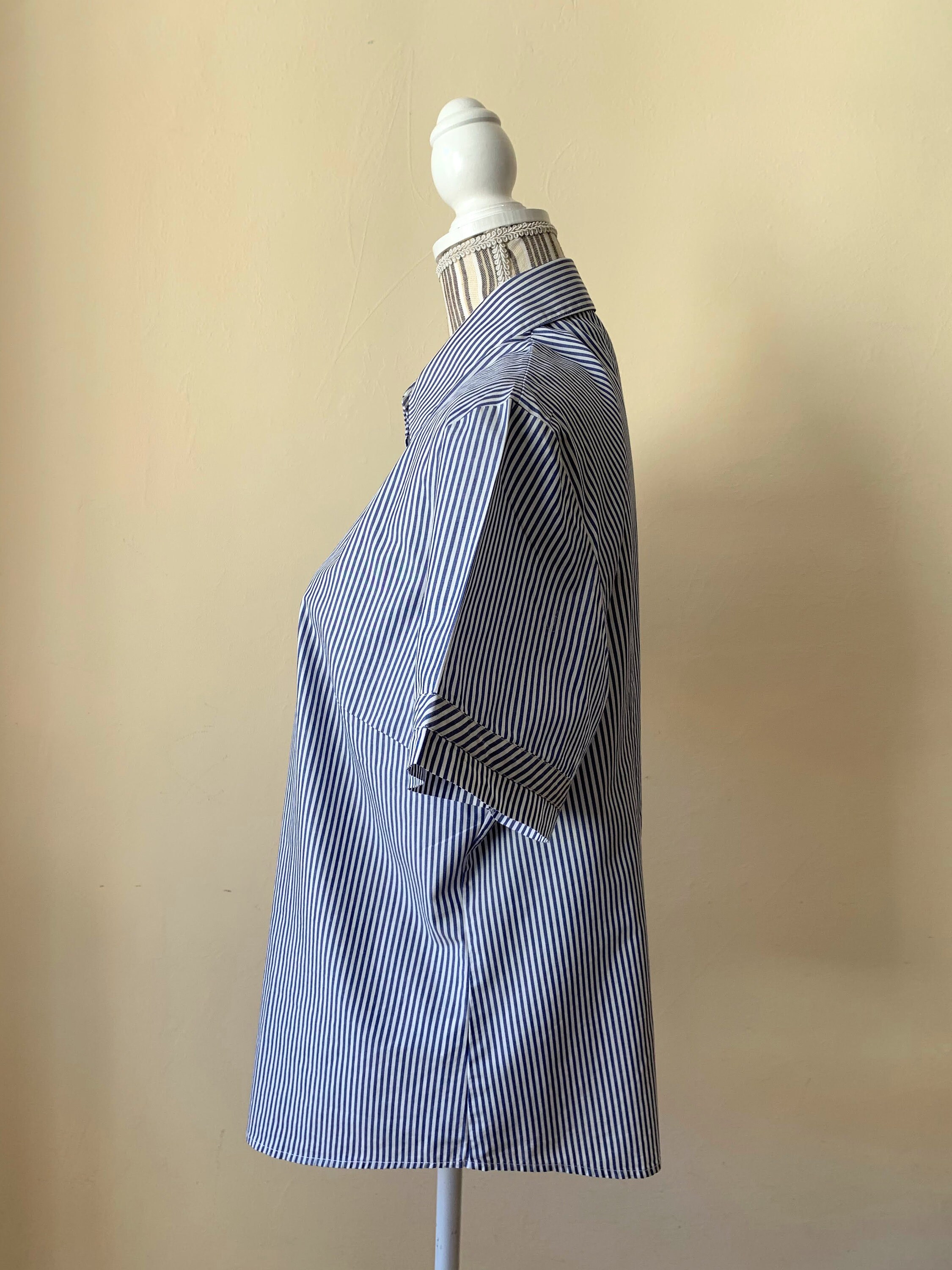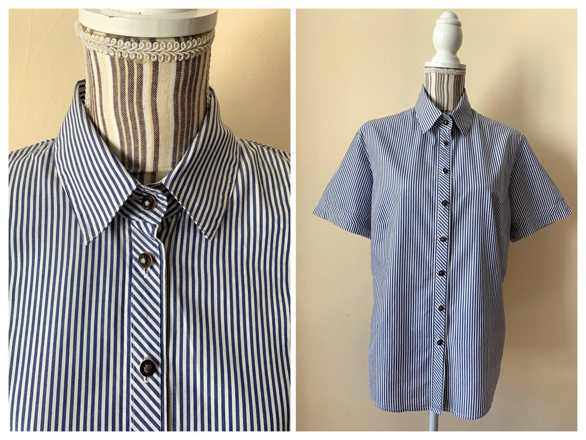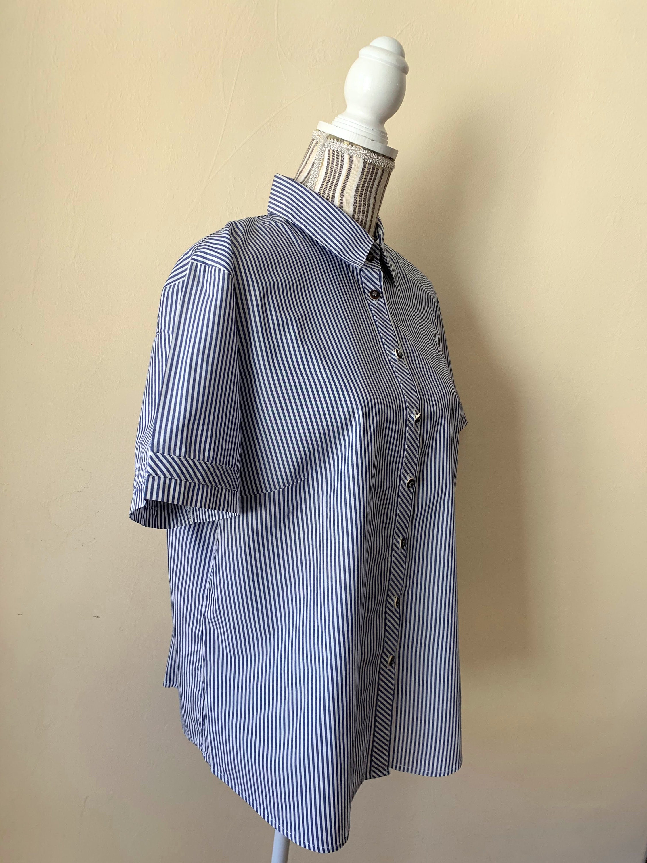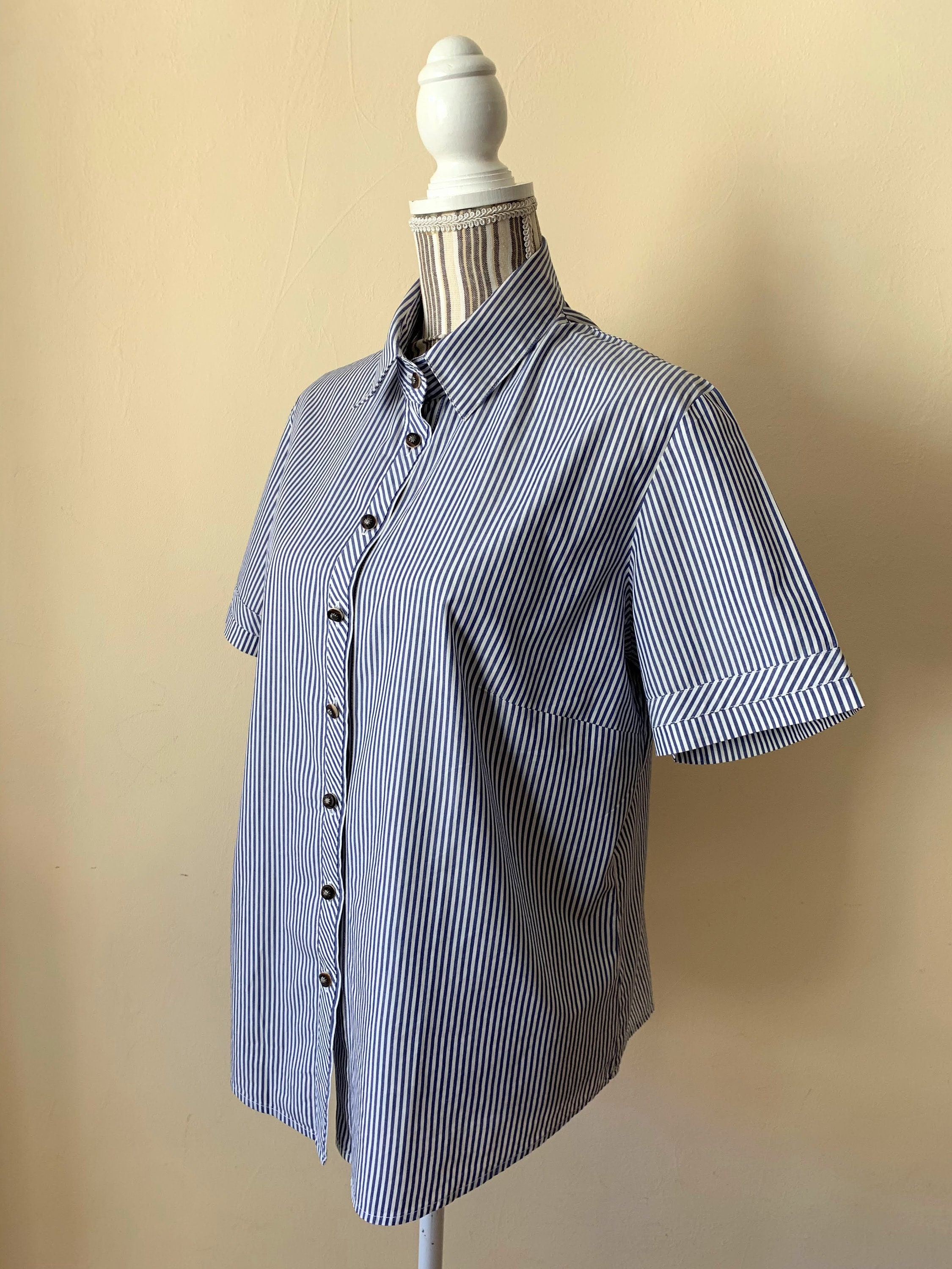 This is a vintage 80s stripped button up shirt for women with white and navy blue vertical stripes. This modest collared button down shirt has a loose fit shape and short sleeves. This loose fit shirt for women is by the brand Landhaus. It is made of 100% cotton fabric which is perfect for the summer season. This cotton summer top has beautiful edelweiss flower buttons at the front which add an interesting detail to this retro modest shirt. You can wear this short sleeve blouse in so many different ways - as an office shirt, or as a comfy summer overshirt with a sleeveless top undearneath. The size marked on this collared blouse is 46, which fits like size L or XL. Please check the measurements below.