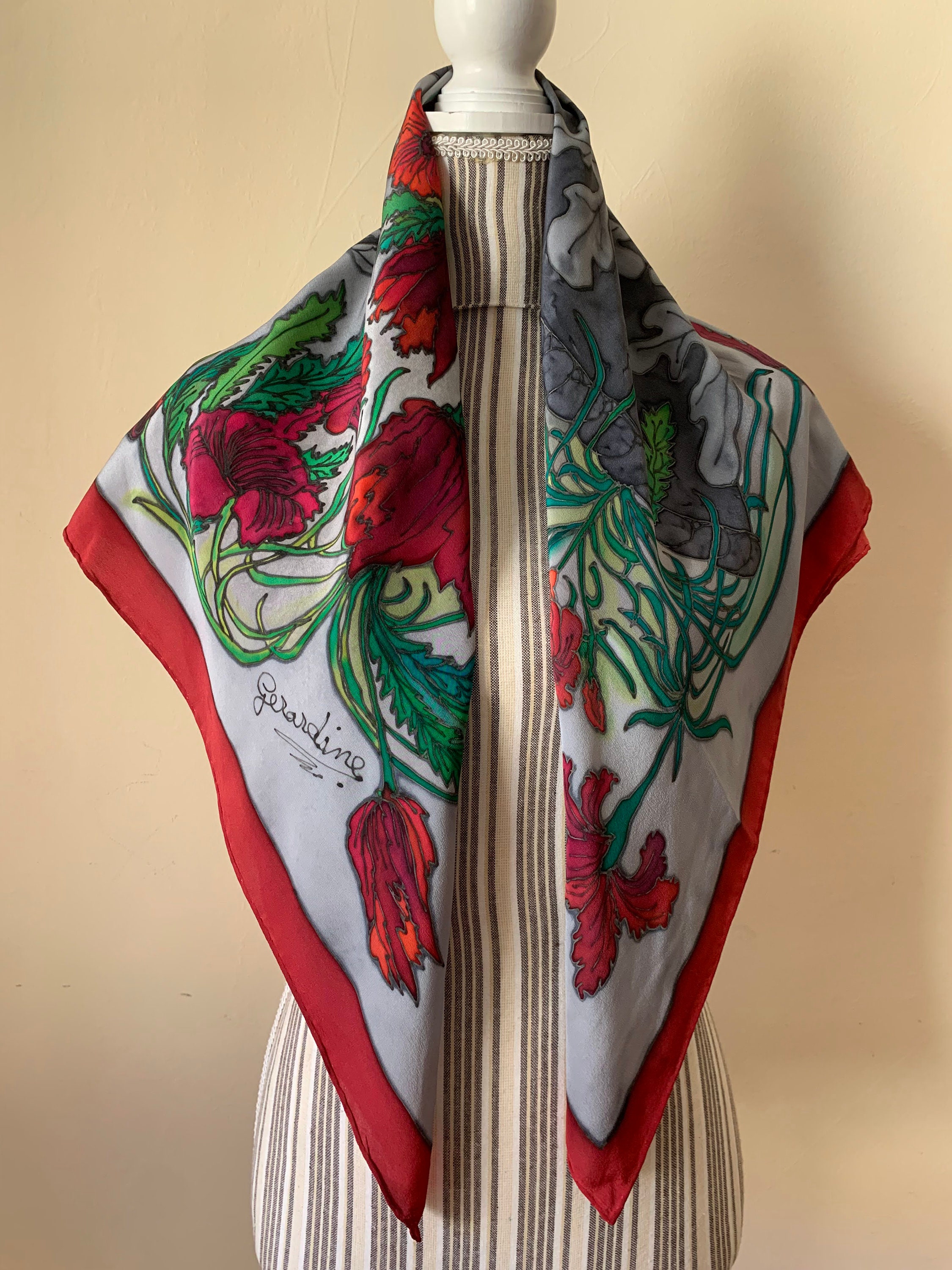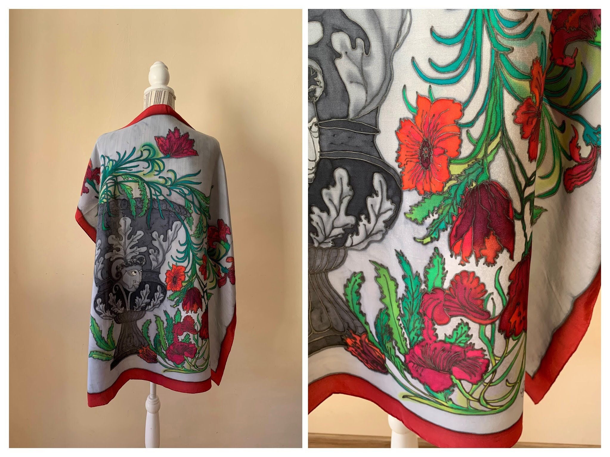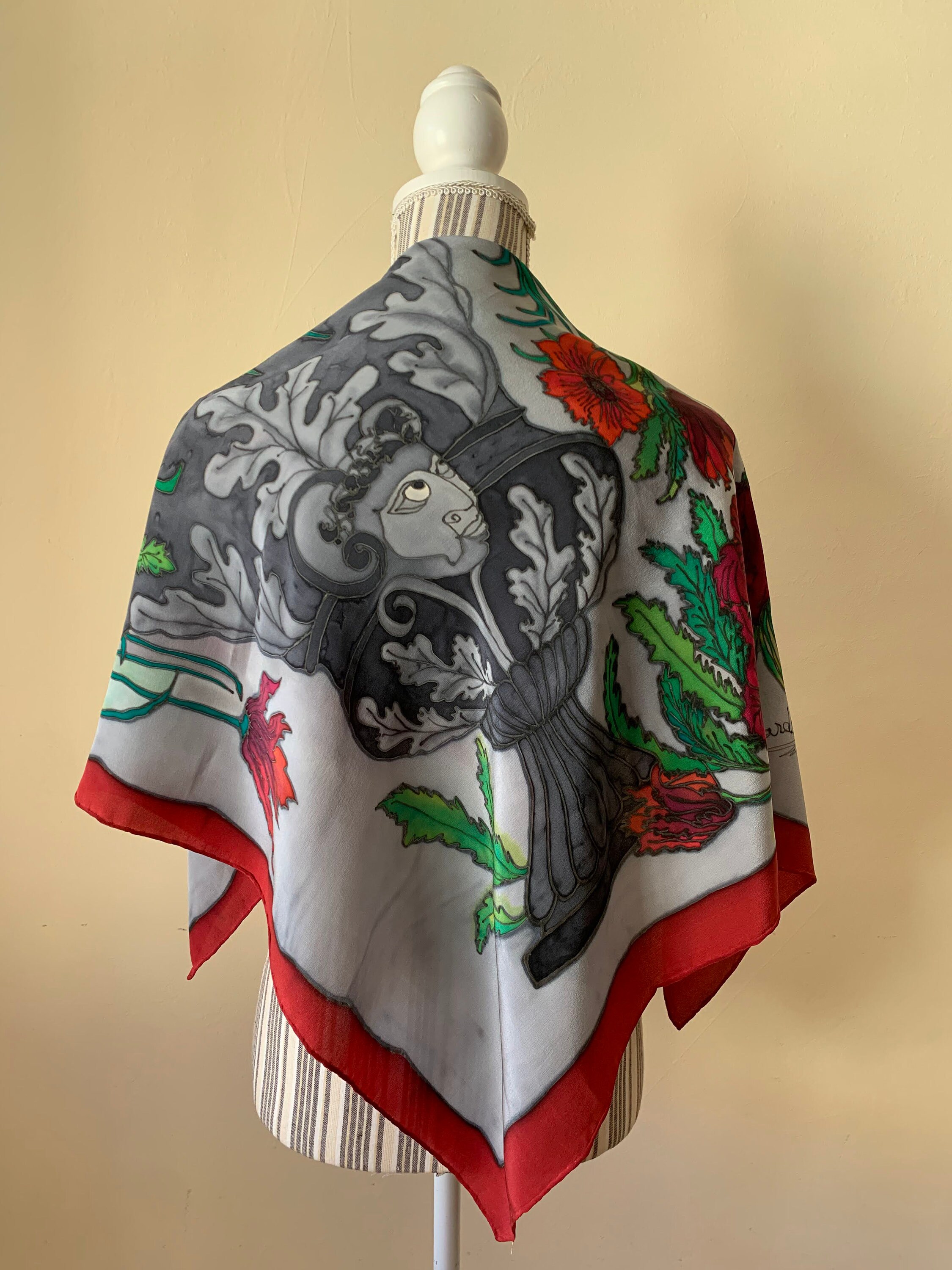 This is a beautiful pure silk square neck scarf in shades of grey, red and green. This silk handpainted scarf has a beautiful abstract floral print. This vintage pure silk scarf is made of semi sheer silk fabric which has a lovely flow. This painted silk scarf would make a great vintage gift for your mom, sister, best friend or wife.