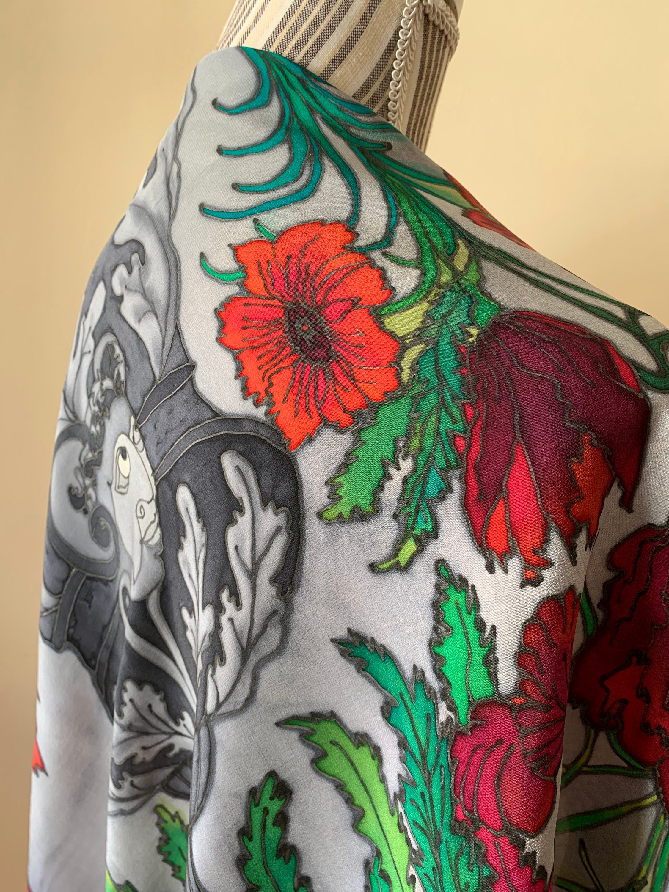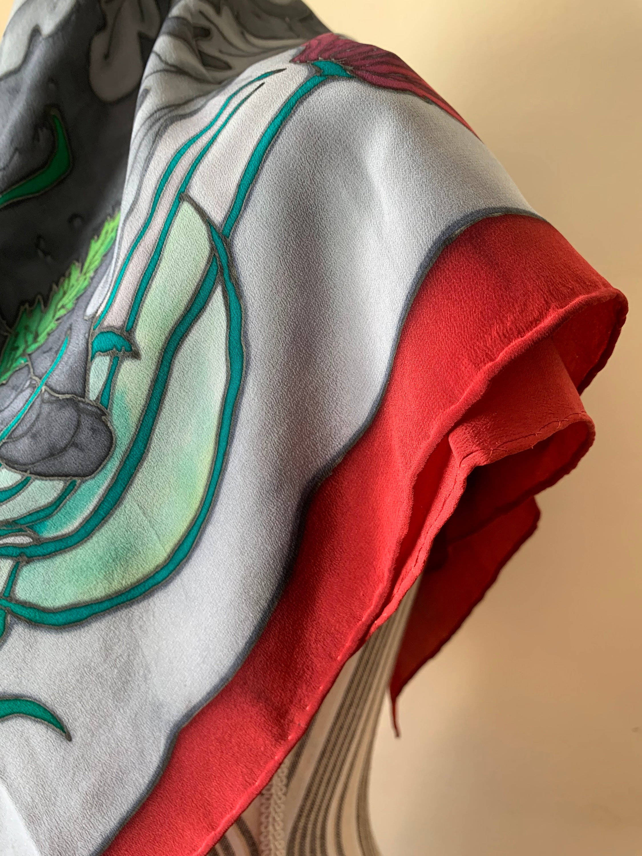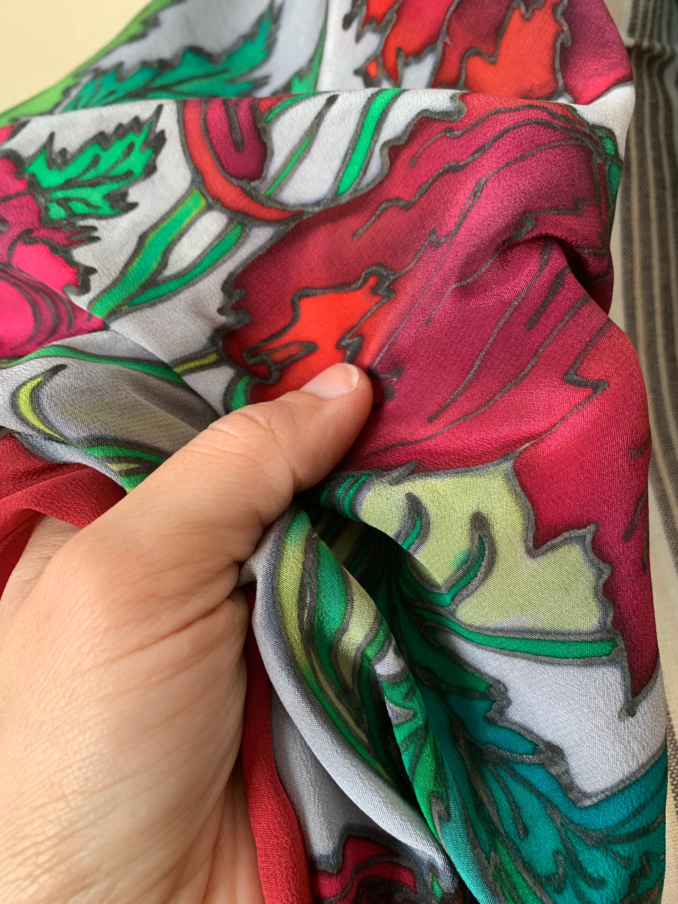 This is a beautiful pure silk square neck scarf in shades of grey, red and green. This silk handpainted scarf has a beautiful abstract floral print. This vintage pure silk scarf is made of semi sheer silk fabric which has a lovely flow. This painted silk scarf would make a great vintage gift for your mom, sister, best friend or wife.
