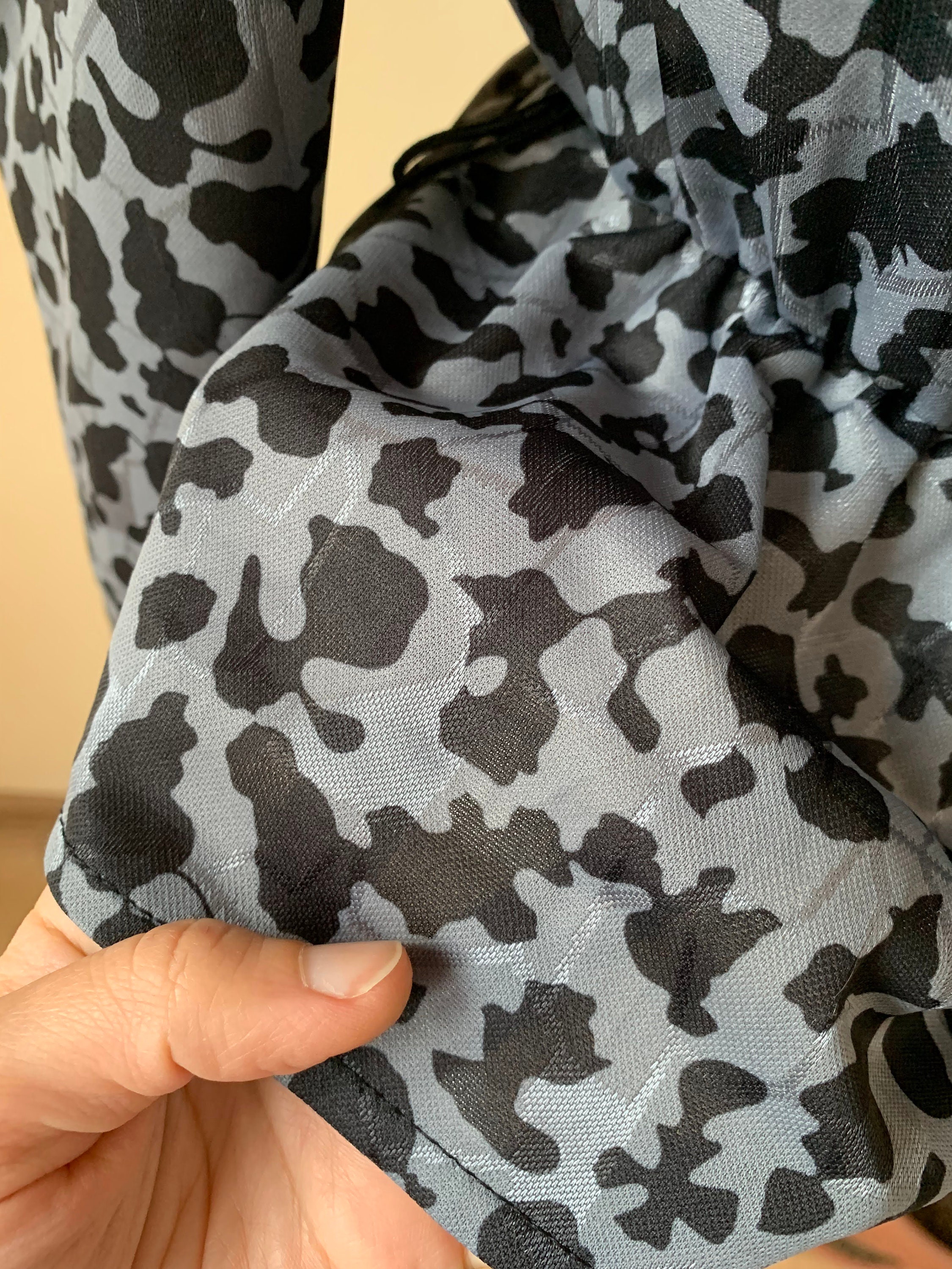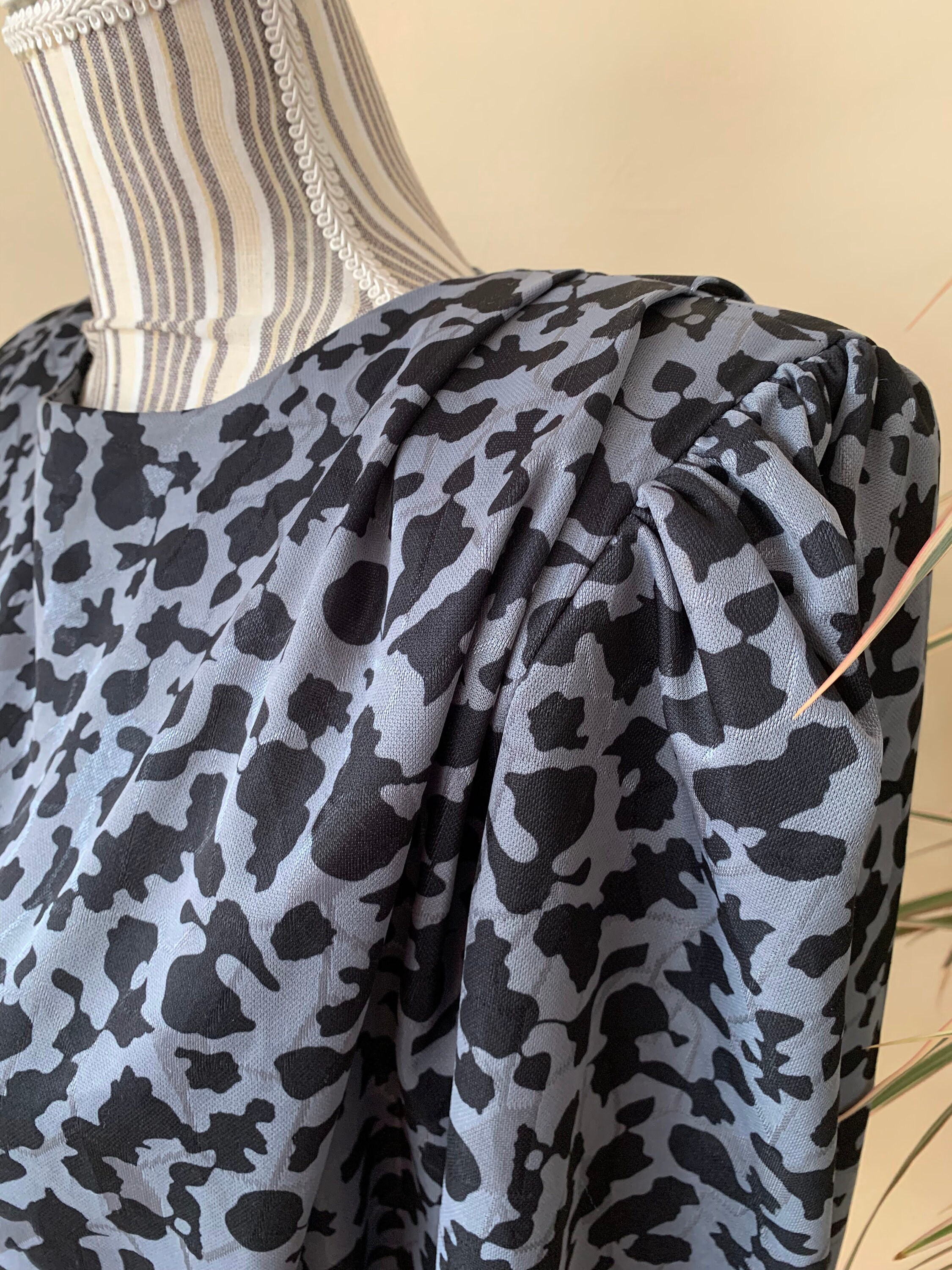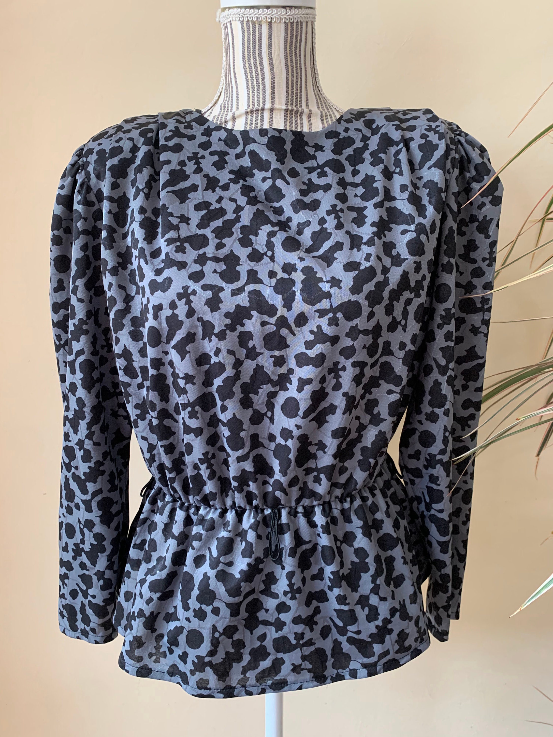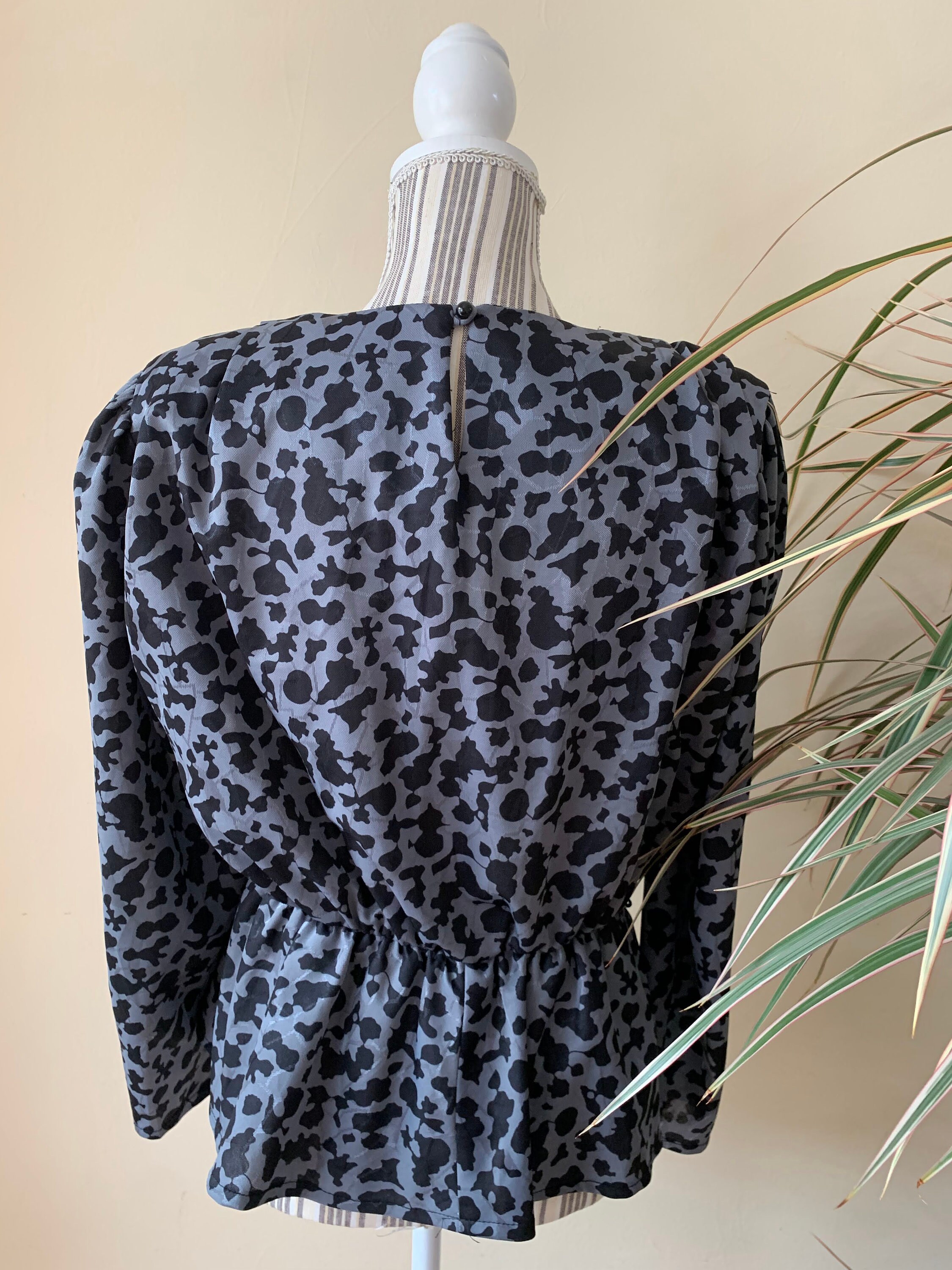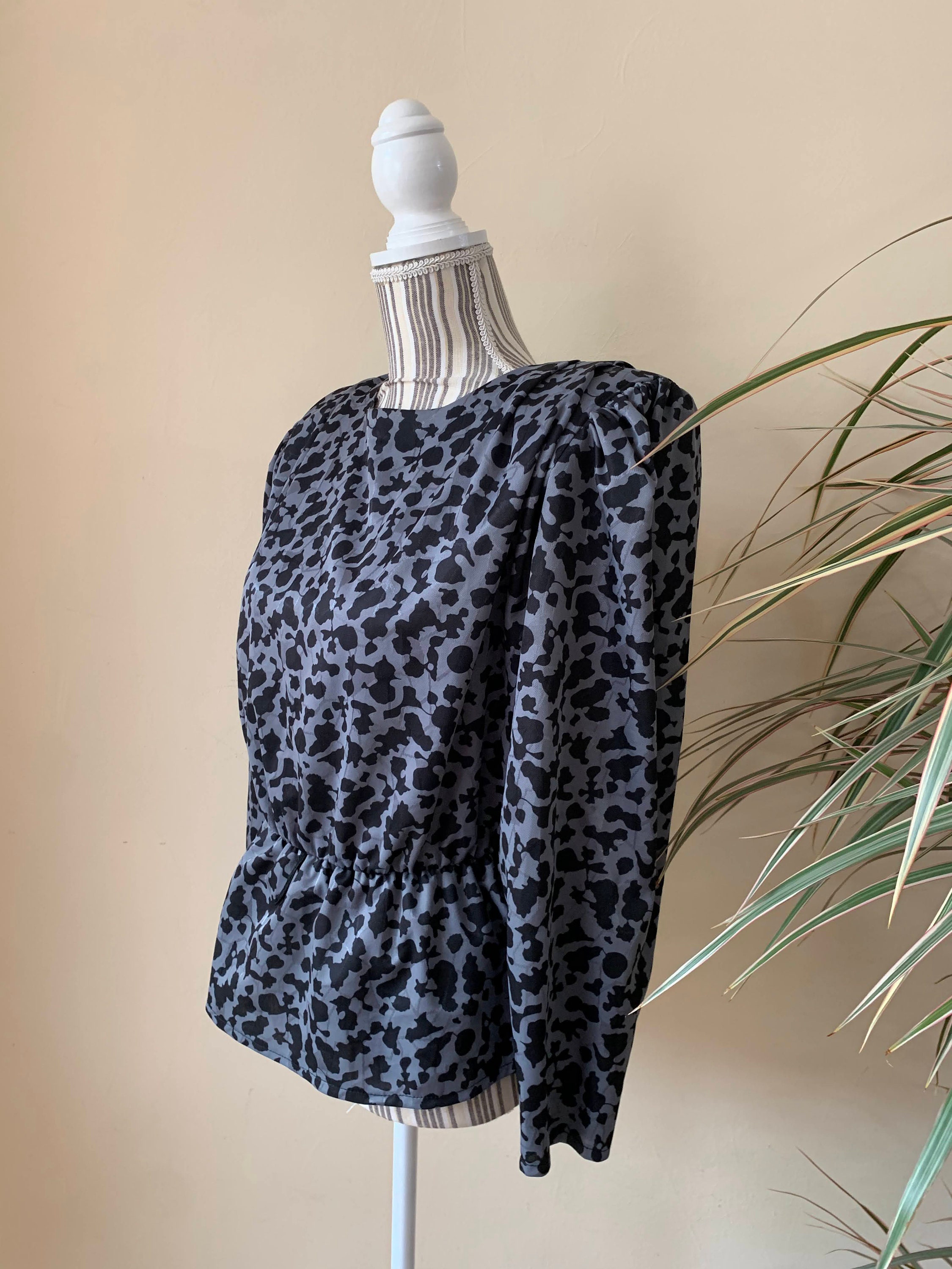 This is a beautiful vintage 80s peplum blouse with long puff sleeves, wide shoulders and gathered elastic waistline. This shoulderpad top is made of black grey fabric with shiny elements and abstract print. As this 80s wide shoulders shirt was handmade, it has no label to state the size or the materials. The fabric feels like viscose or rayon, it has no stretch. This retro shirt fits like size M. Please check the measurements below.