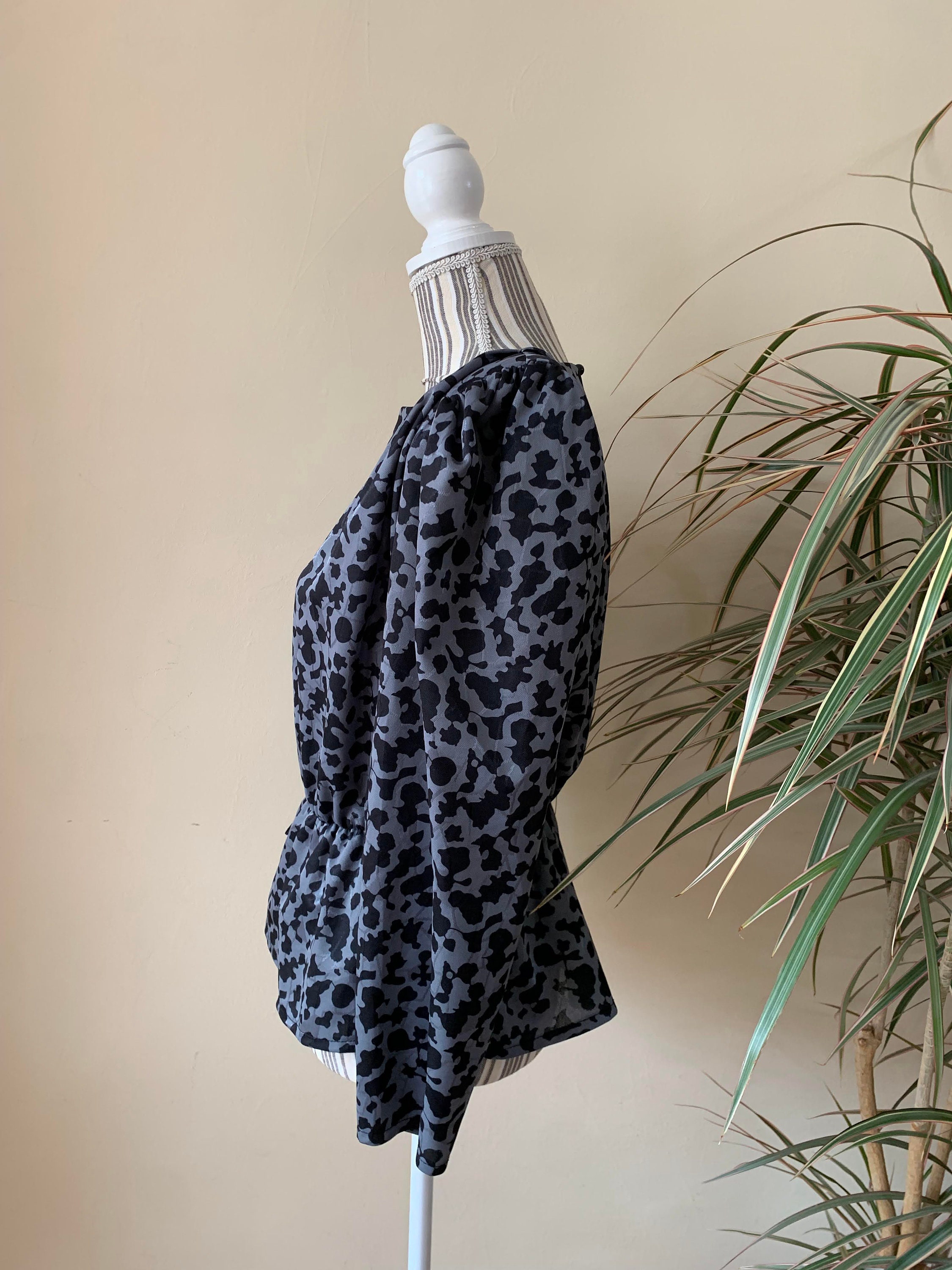 Condition: This black grey peplum blouse is in great vintage condition. The only thing I could spot is that i has belt loops, however there was no belt when I got this retro shirt. Otherwise great condition with no visible signs of wear.