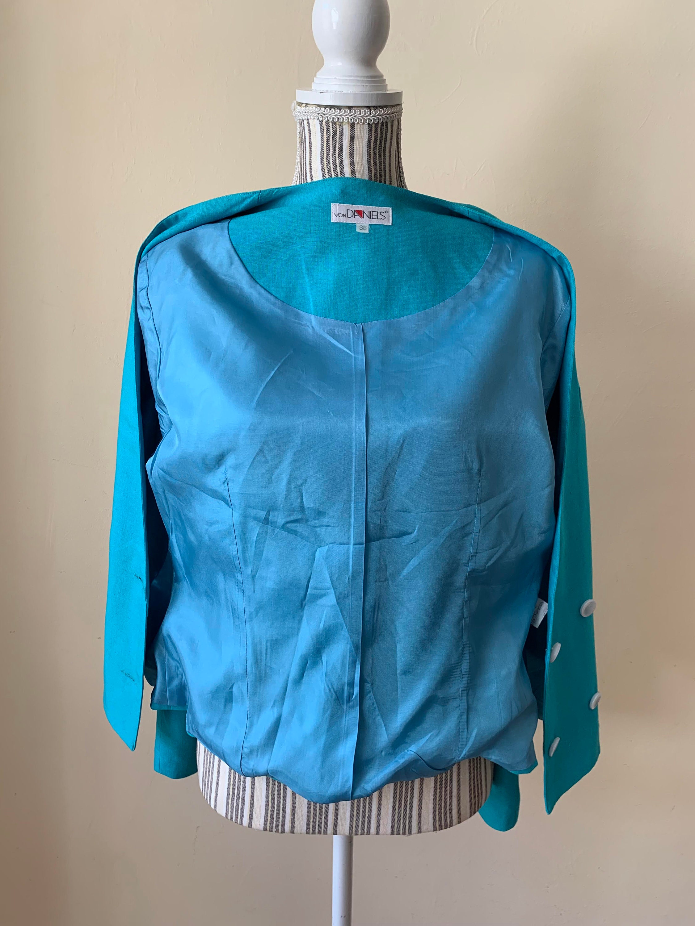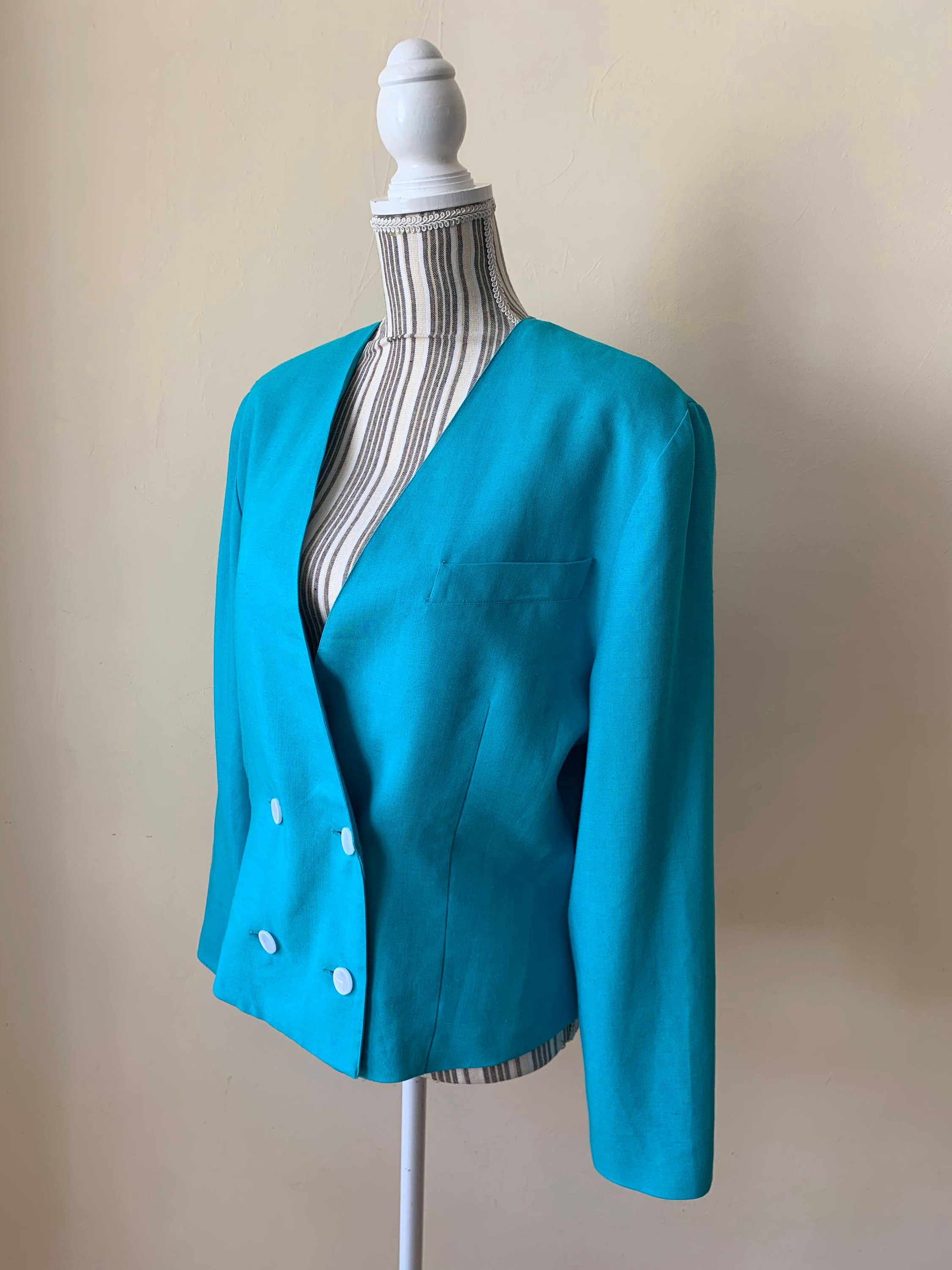 This is a beautiful vintage 90s light blue linen blend blazer for women with double breasted closure and a chest pockets. This casual cyan blue blazer is made of lightweight linen blend fabric (80% viscose, 20% linen). Elegant and yet casual cropped blazer that will instantly elevate your monochromatic look. This light summer cropped coat has polyester lining underneath. This lightweight v neck blazer jacket is perfect for the spring or summer season. The size marked is 38, it fits like size M L. Please check the measurements below.