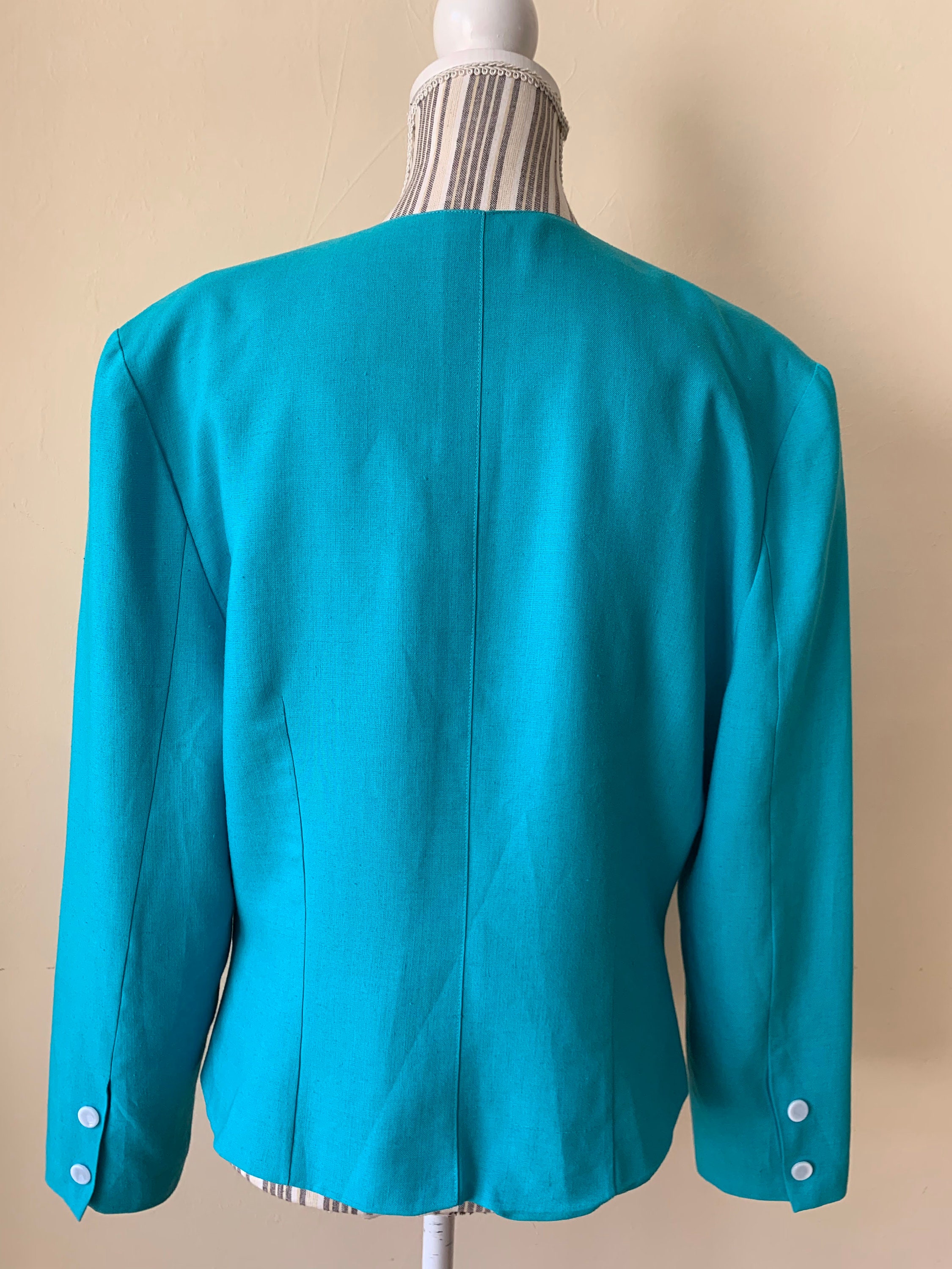 Vintage 90s Cyan Blue Linen Blend Blazer for Women Size M L, Spring Summer Double Breasted Jacket, Long Sleeve V Neck Casual Linen Crop Coat