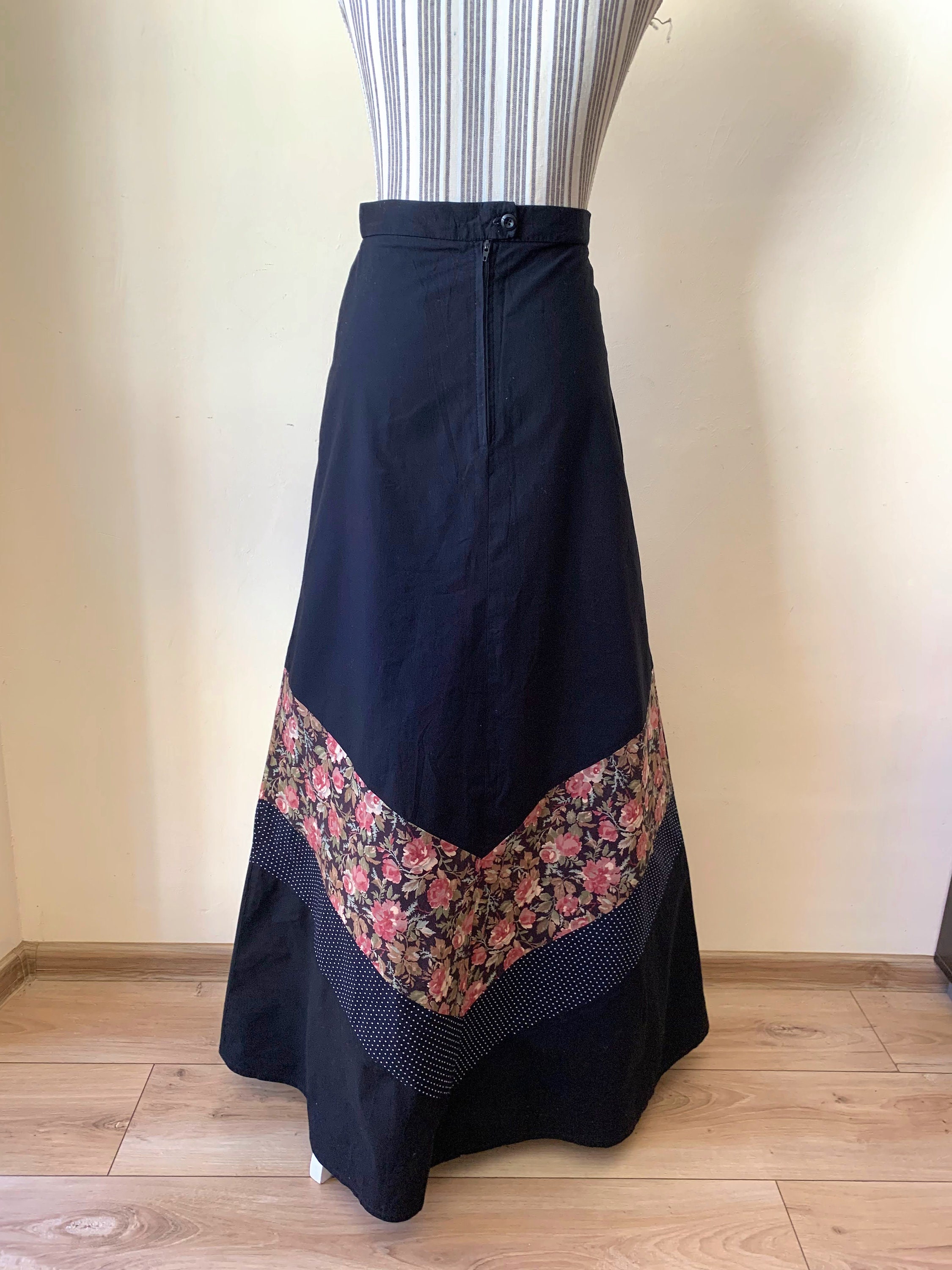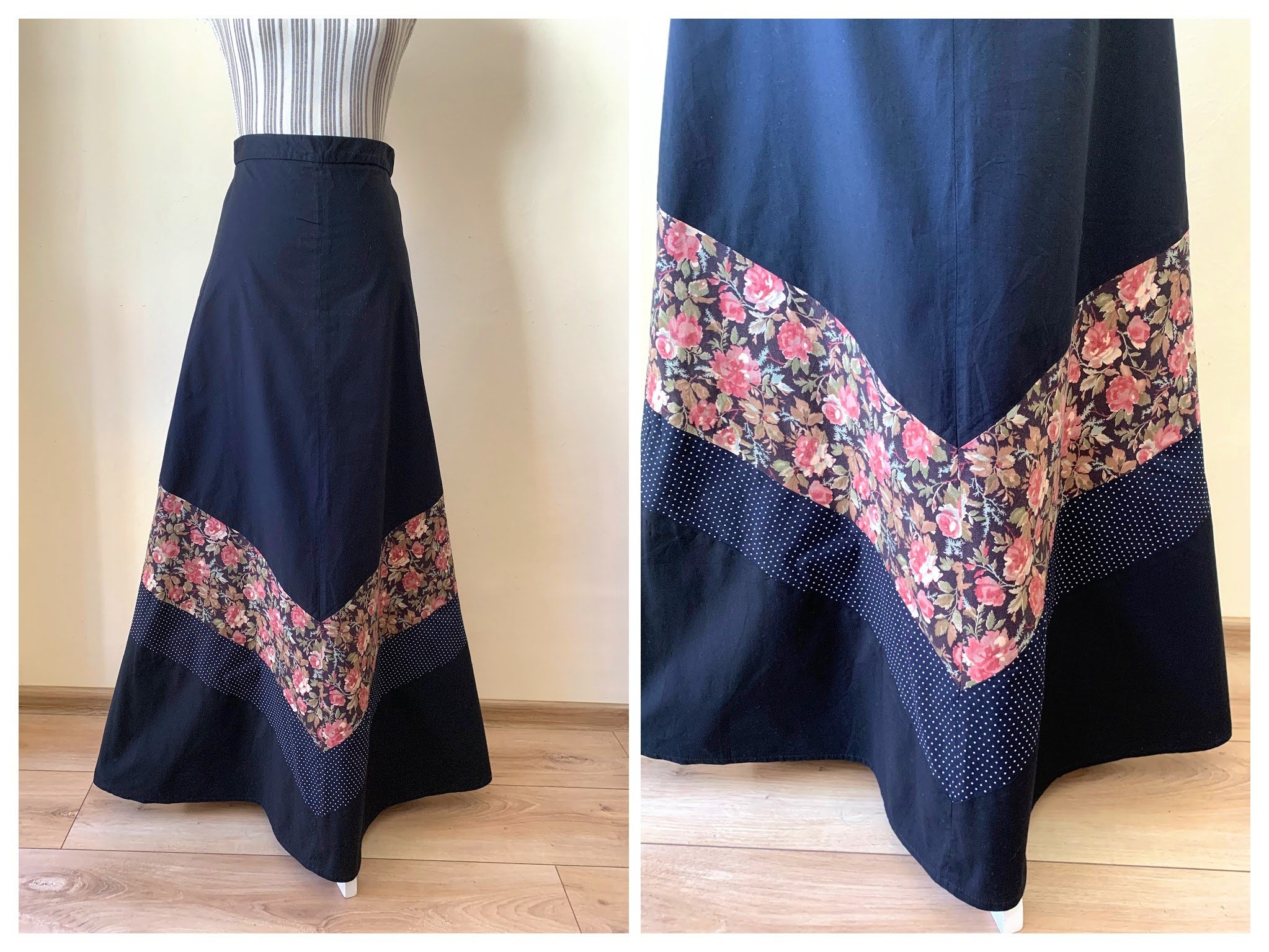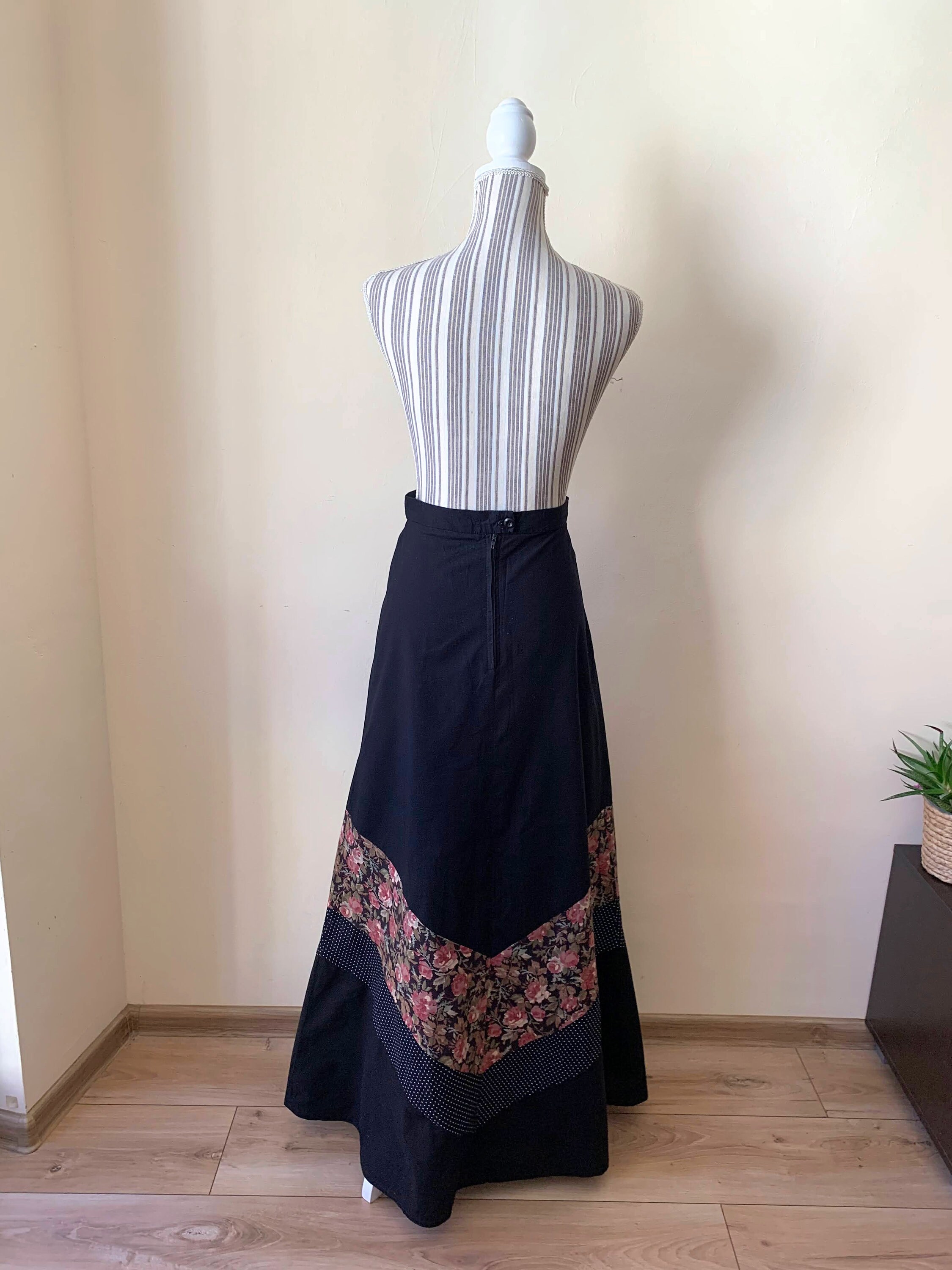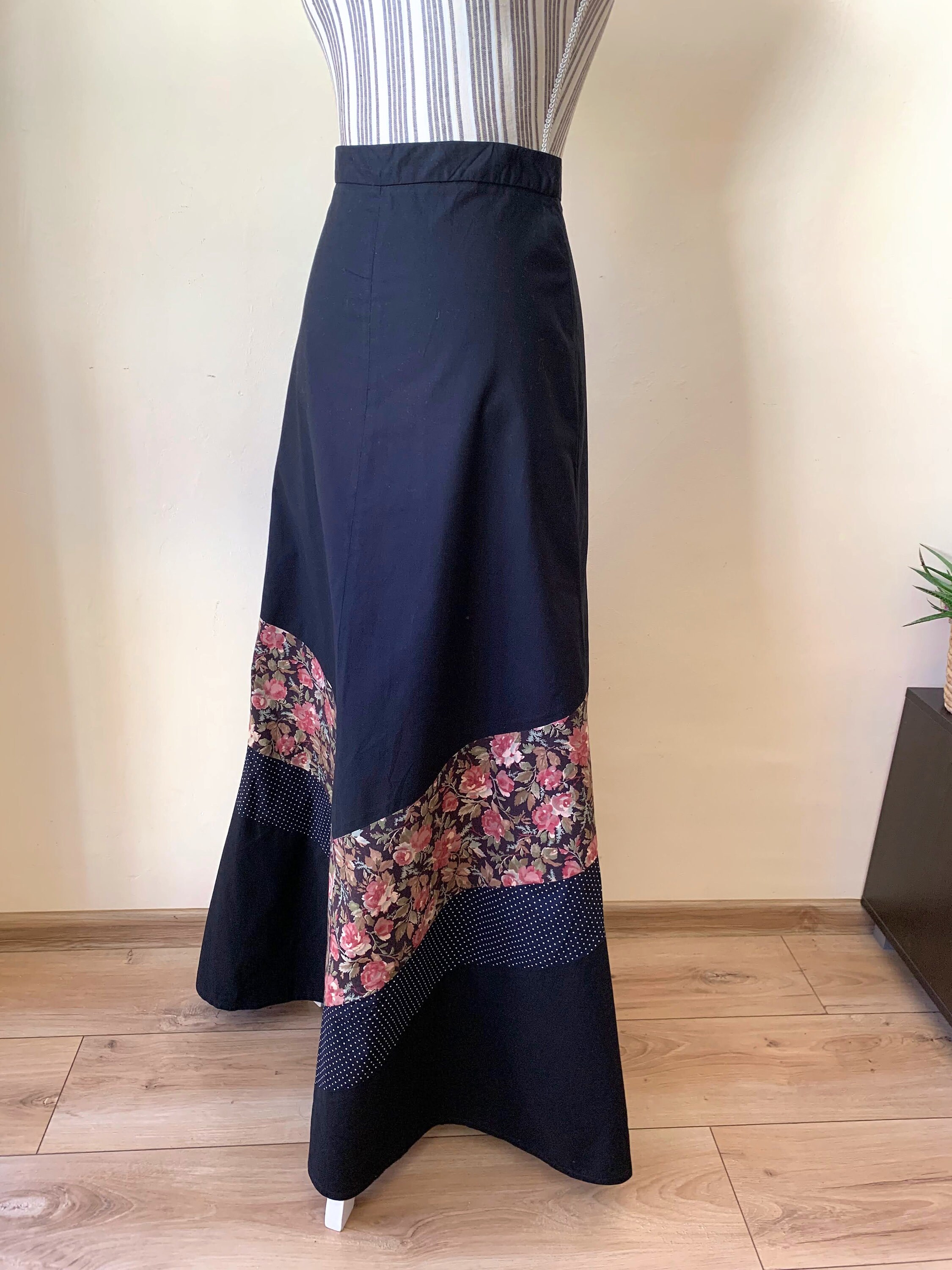 This is a lovely vintage A line maxi skirt made of pure cotton fabric, which has no stretch. This bohemian skirt has a back zipper and button closure. This pretty black maxi skirt falls down to the floor. This long a line skirt combines three different prints - solid black color, polkadots and floral print fabric which compliment each other beautifully. This 90s maxi skirt was made in Denmark by the brand Miss Karina. The size marked is 40, which fits like S/ M. Please check the measurements below.
