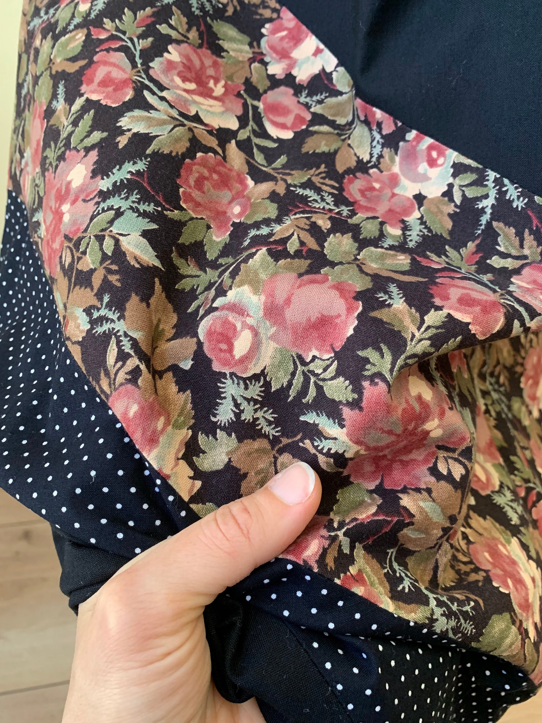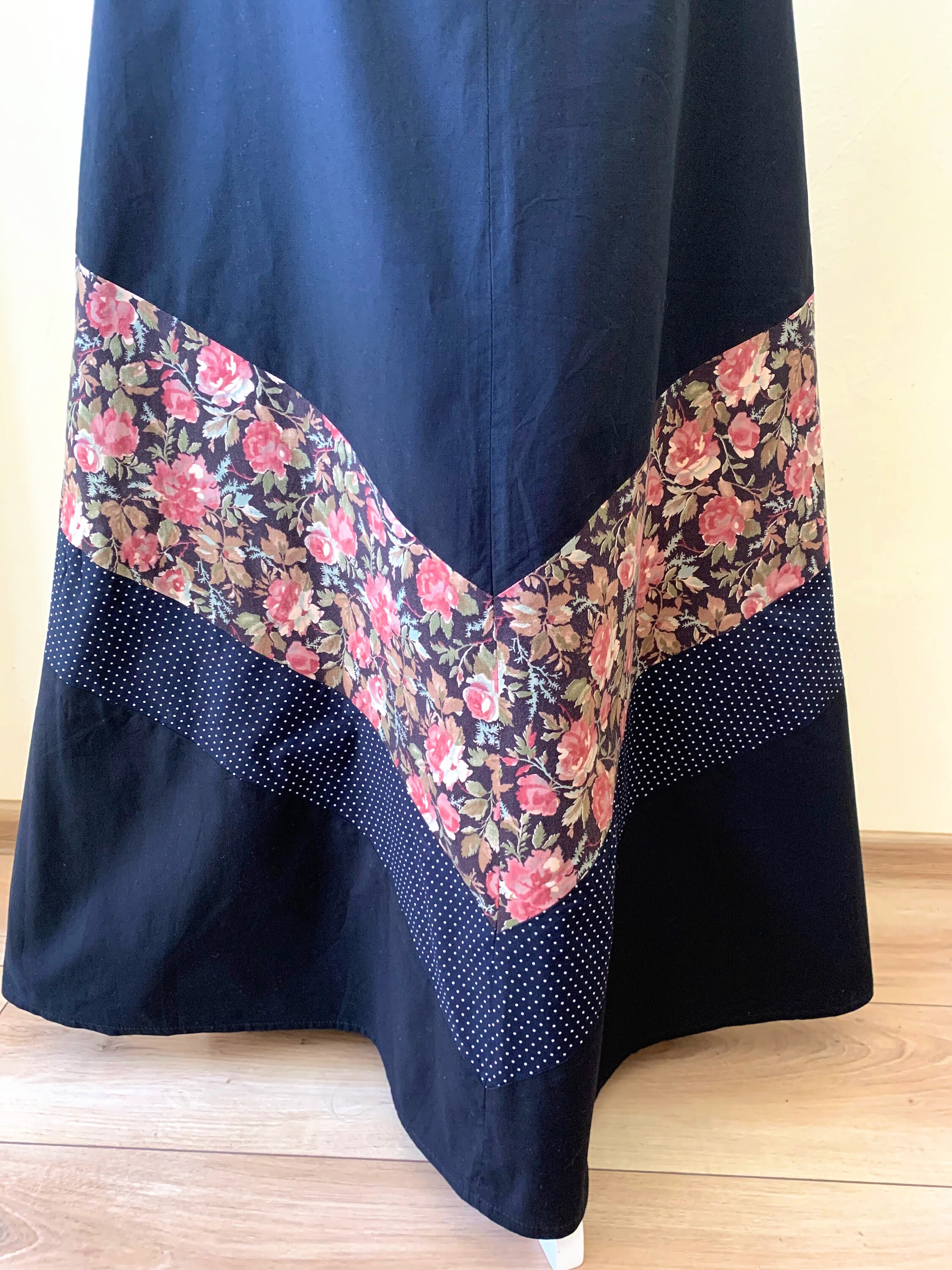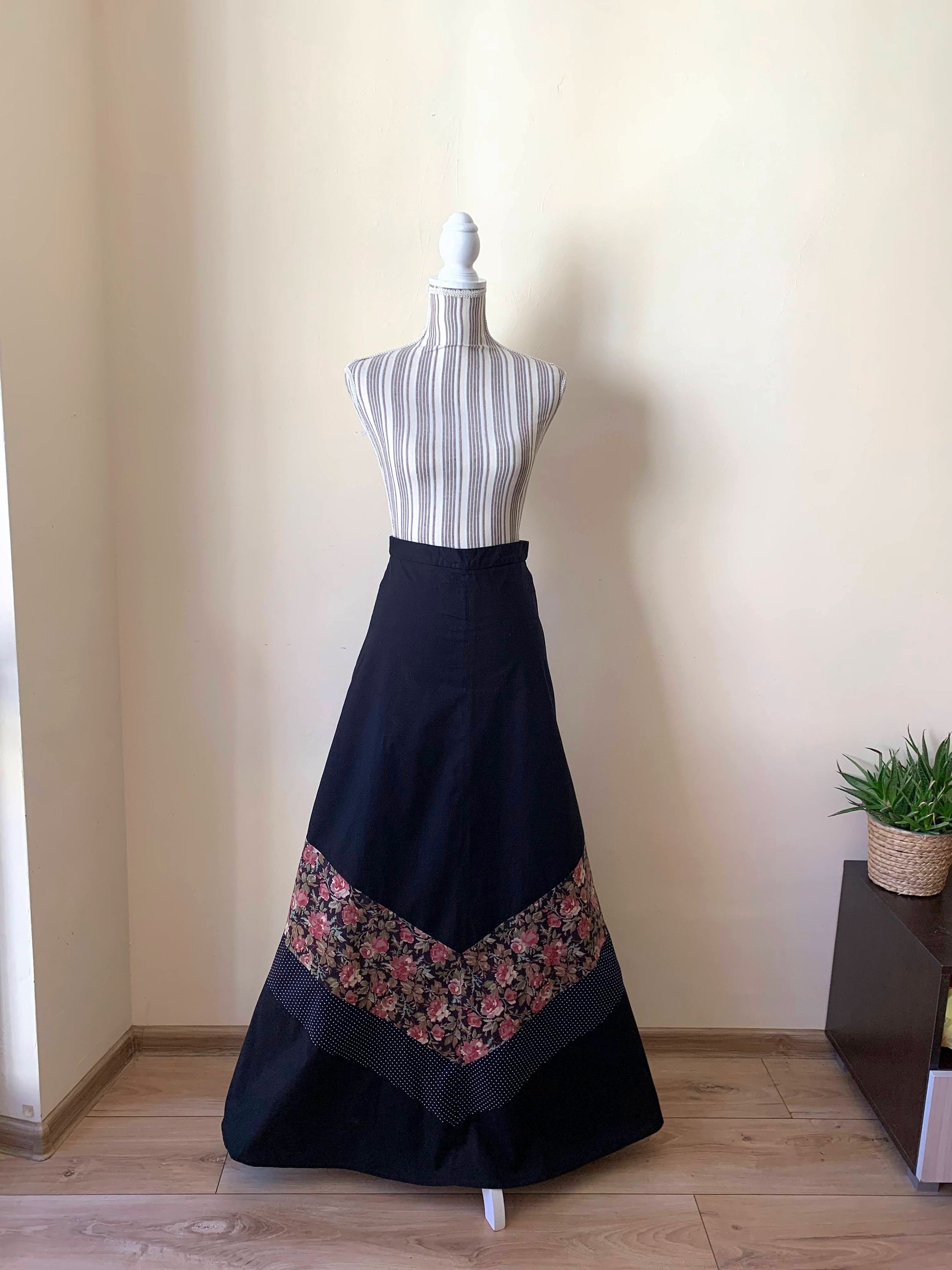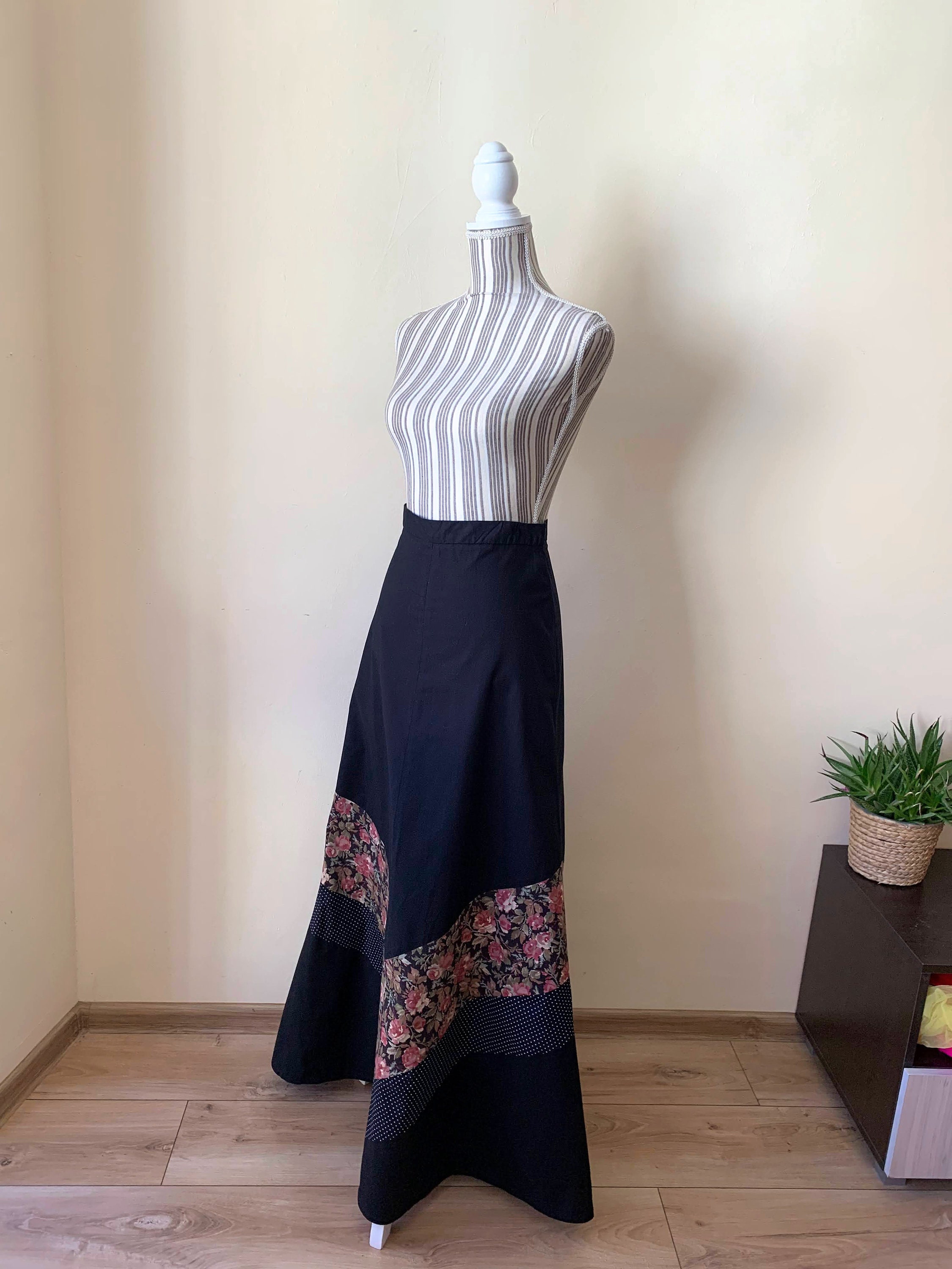 This is a lovely vintage A line maxi skirt made of pure cotton fabric, which has no stretch. This bohemian skirt has a back zipper and button closure. This pretty black maxi skirt falls down to the floor. This long a line skirt combines three different prints - solid black color, polkadots and floral print fabric which compliment each other beautifully. This 90s maxi skirt was made in Denmark by the brand Miss Karina. The size marked is 40, which fits like S/ M. Please check the measurements below.