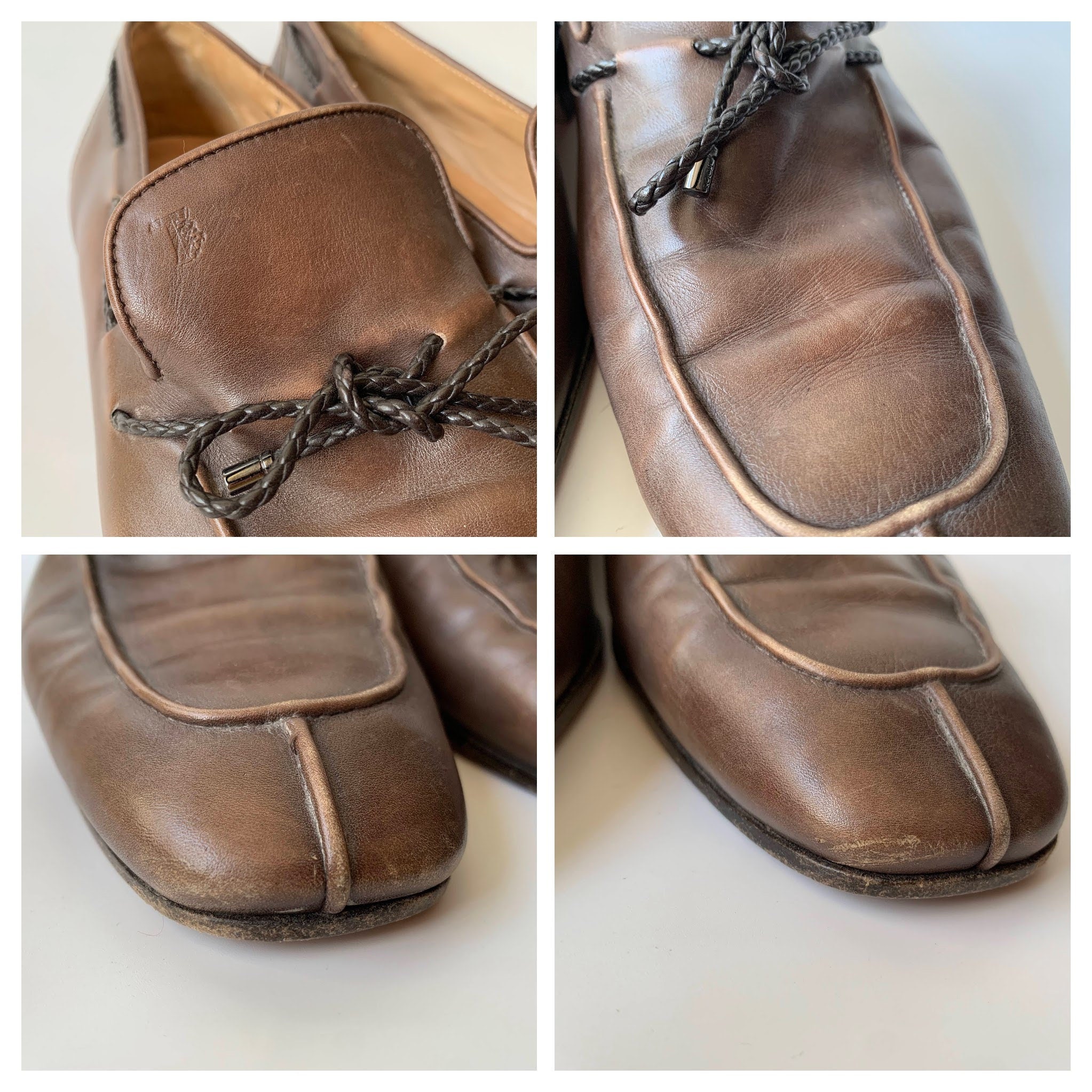 Condition: These brown leather shoes were much loved and show some scratches and marks on the leather surface which I have tried to capture in the close up photos. There is some fading of the leather around the caps and the laces.