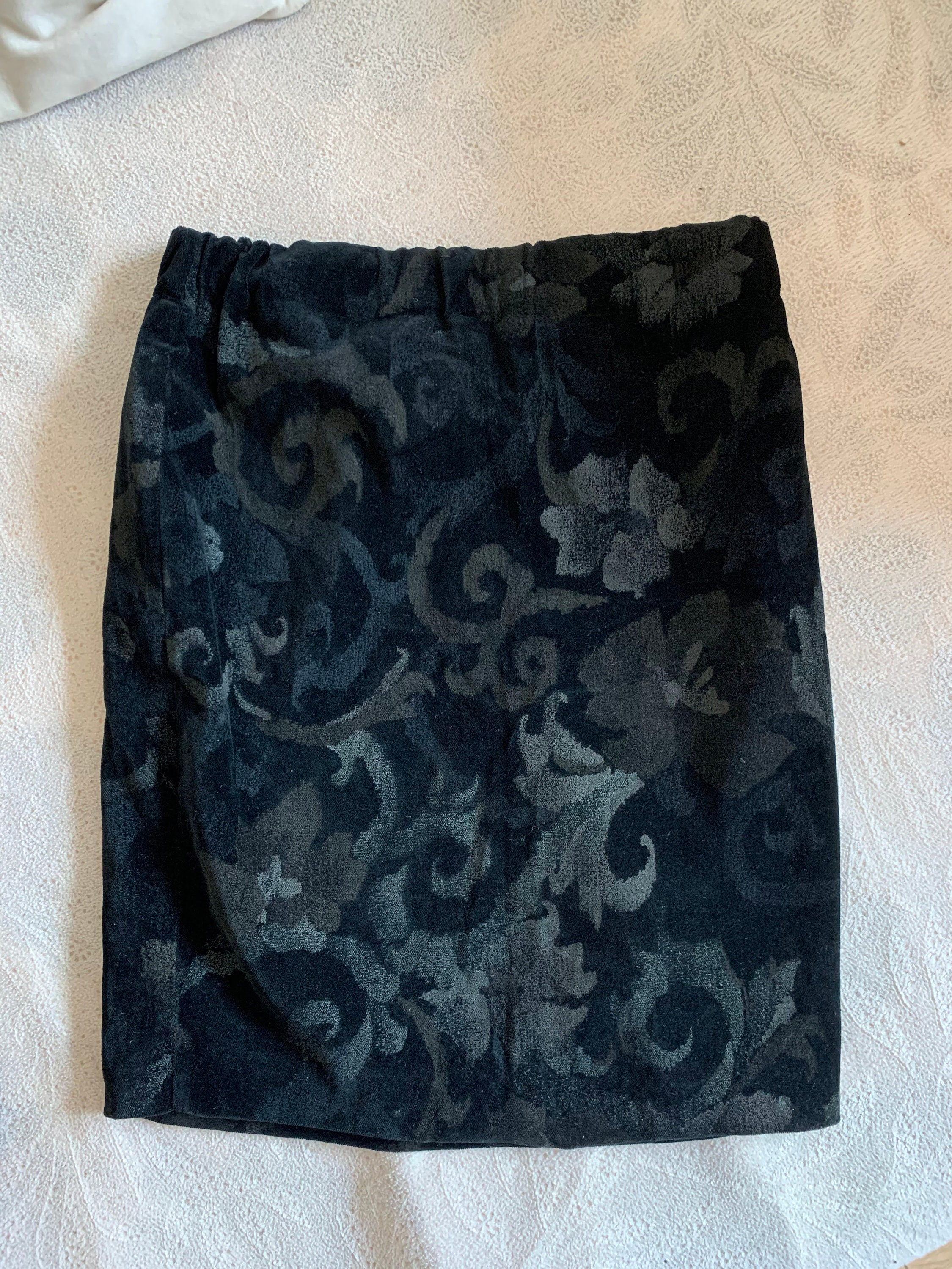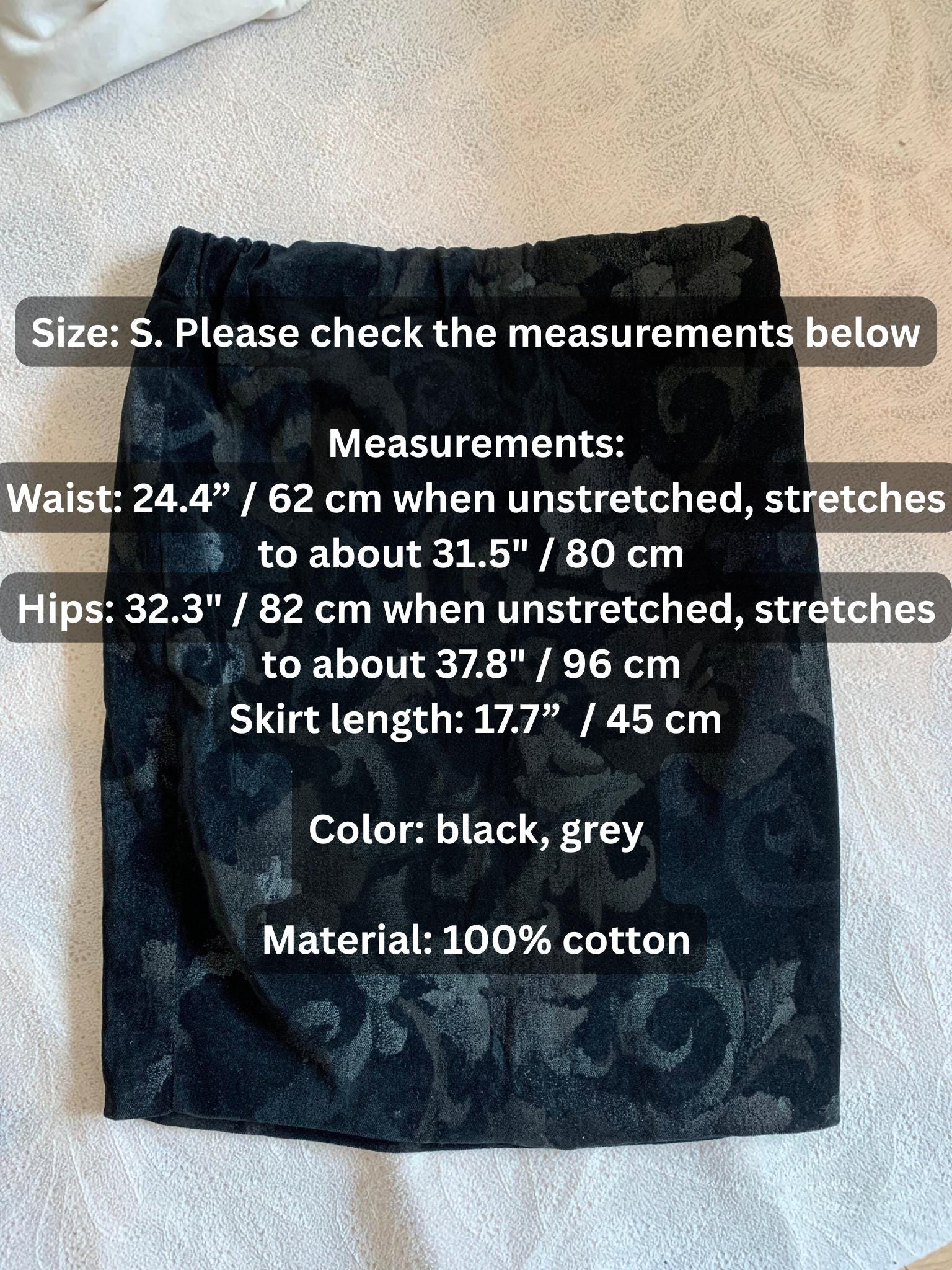 This is a vintage 90s black velvet skirt made of soft 100% cotton velvet fabric which has a nice stretch. This stretchy pencil skirt has a bodycon silhouette and elastic waistline. It would beautifully wrap your body. This velvet mini skirt has a gorgeous paisley print in shades of grey. This velvet skirt fits above the knees. It has no lining underneath. This vintage velvet skirt was made in Italy. The size marked is S. Please check the measurements below.