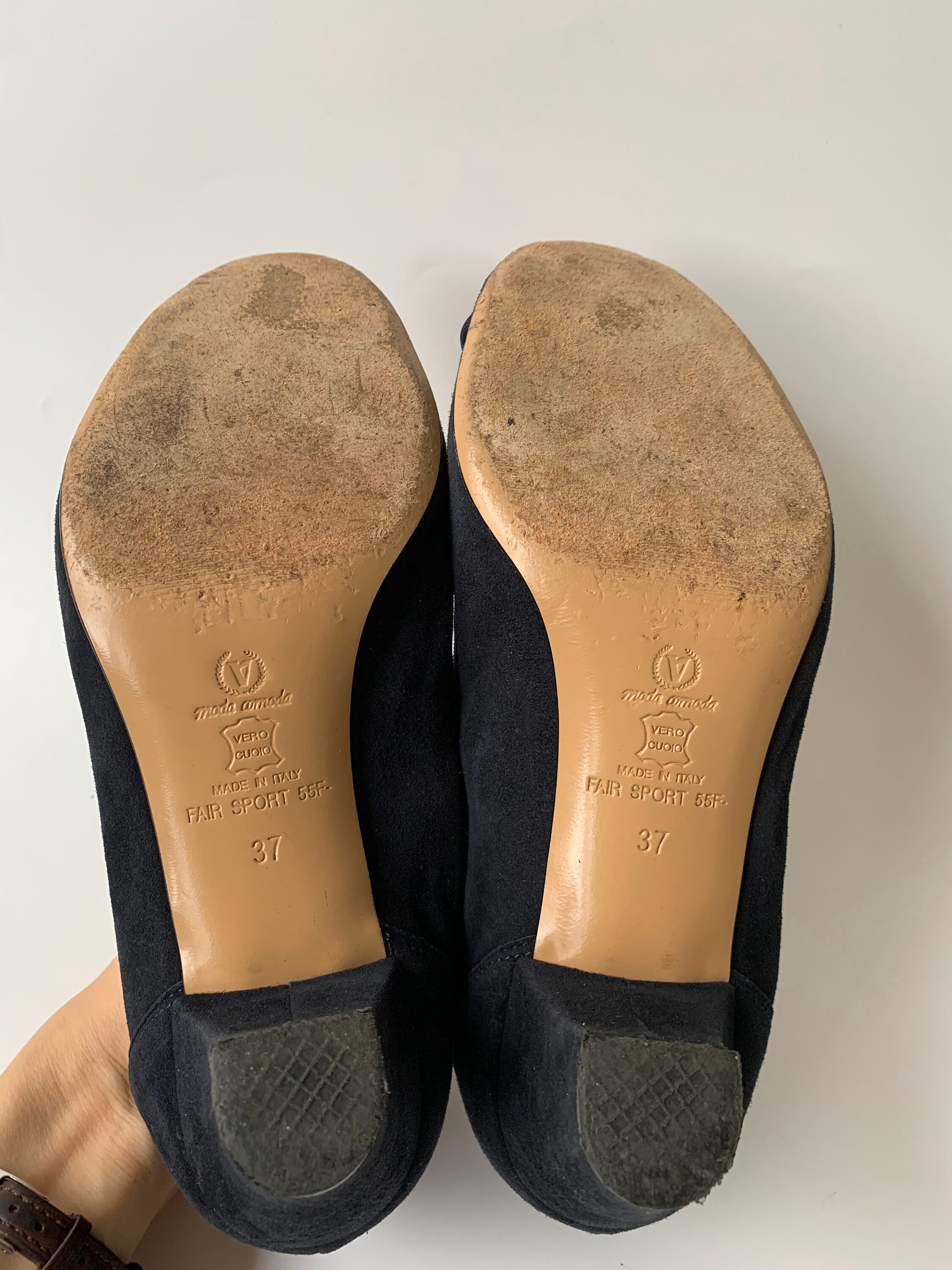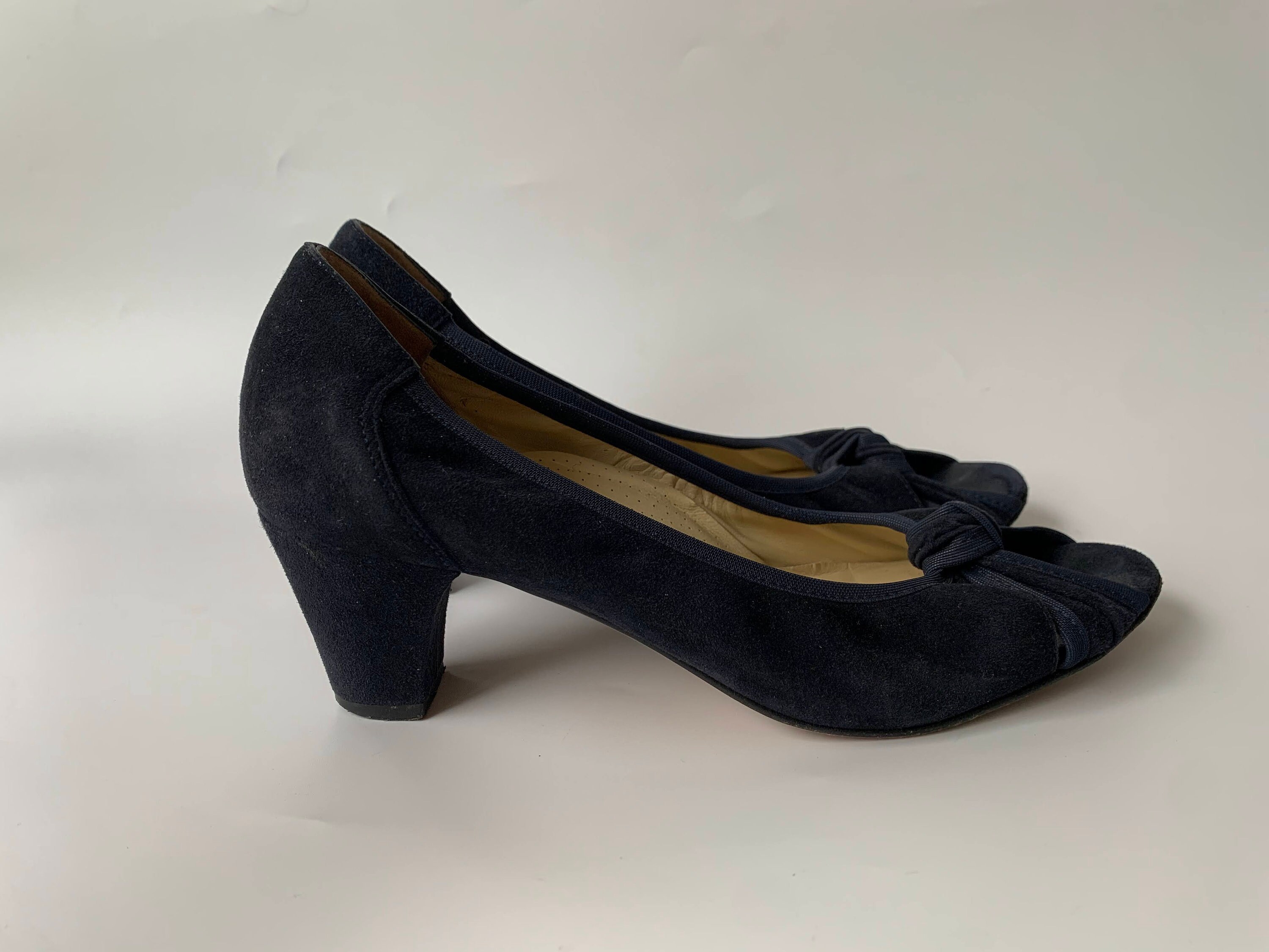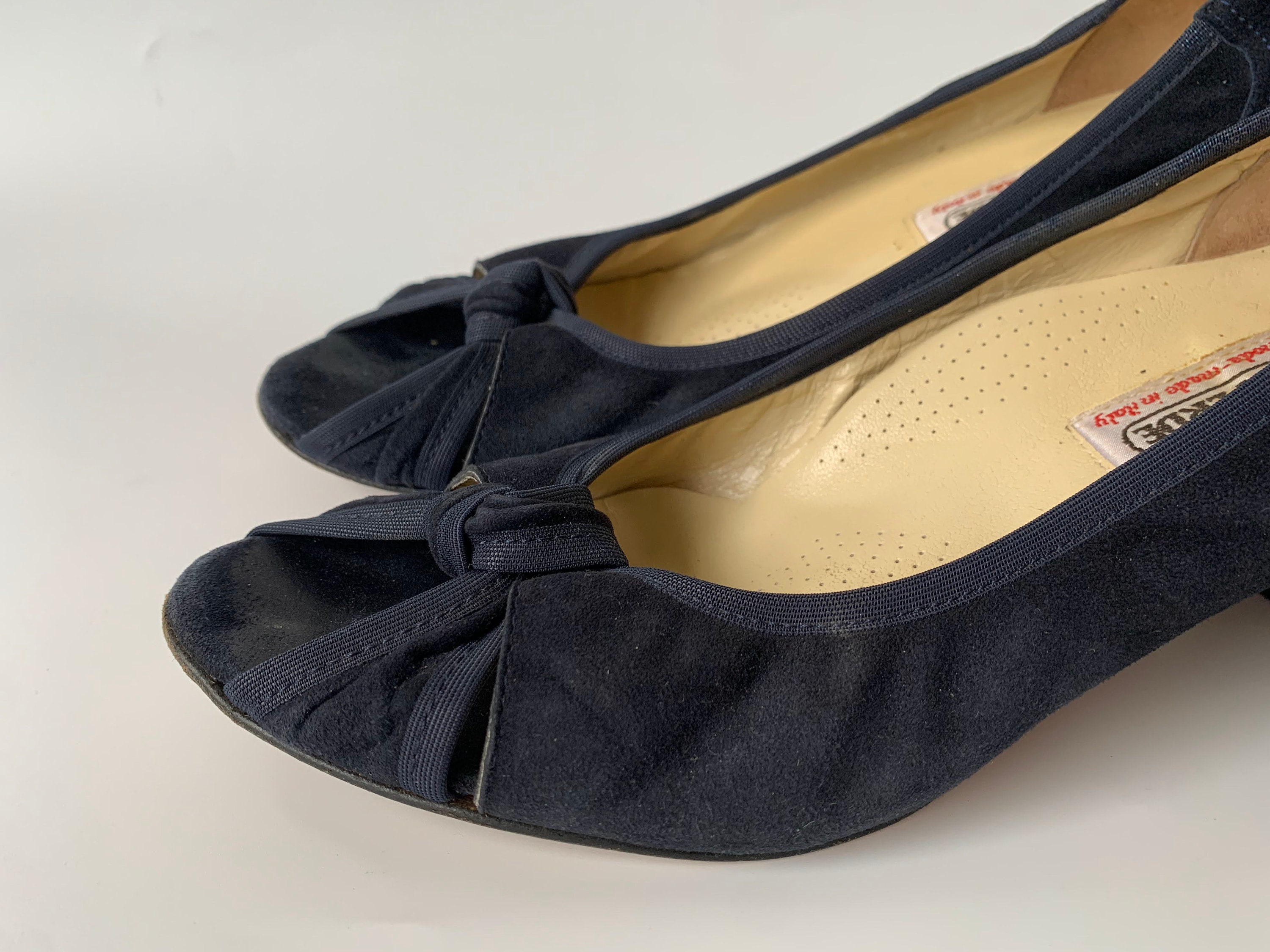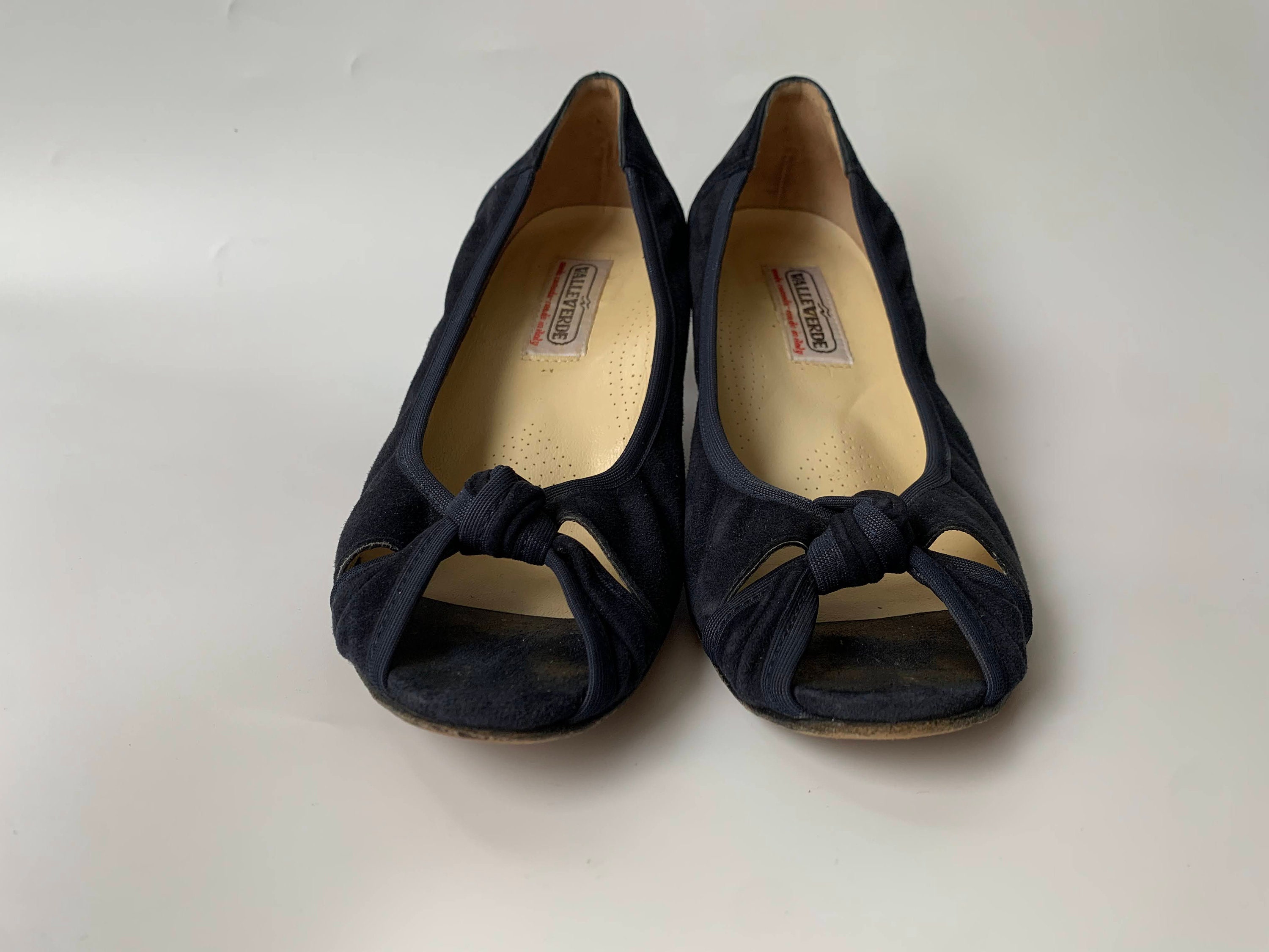 These are pretty vintage suede leather peep toe, make of soft suede leather in navy blue color. These real leather slip on shoes have leather soles and leather insoles. They were made in Italy by ValleVerde. These navy blue pumps have knot decoration at the toes and closed heels. These suede leather sandals are perfect to wear in the spring summer season at the office or just when going out for a walk when you want to feel pretty and yet be comfortable. These high heeled shoes are size EUR 37, which fits like UK 4, US 6. Please check the measurements below.