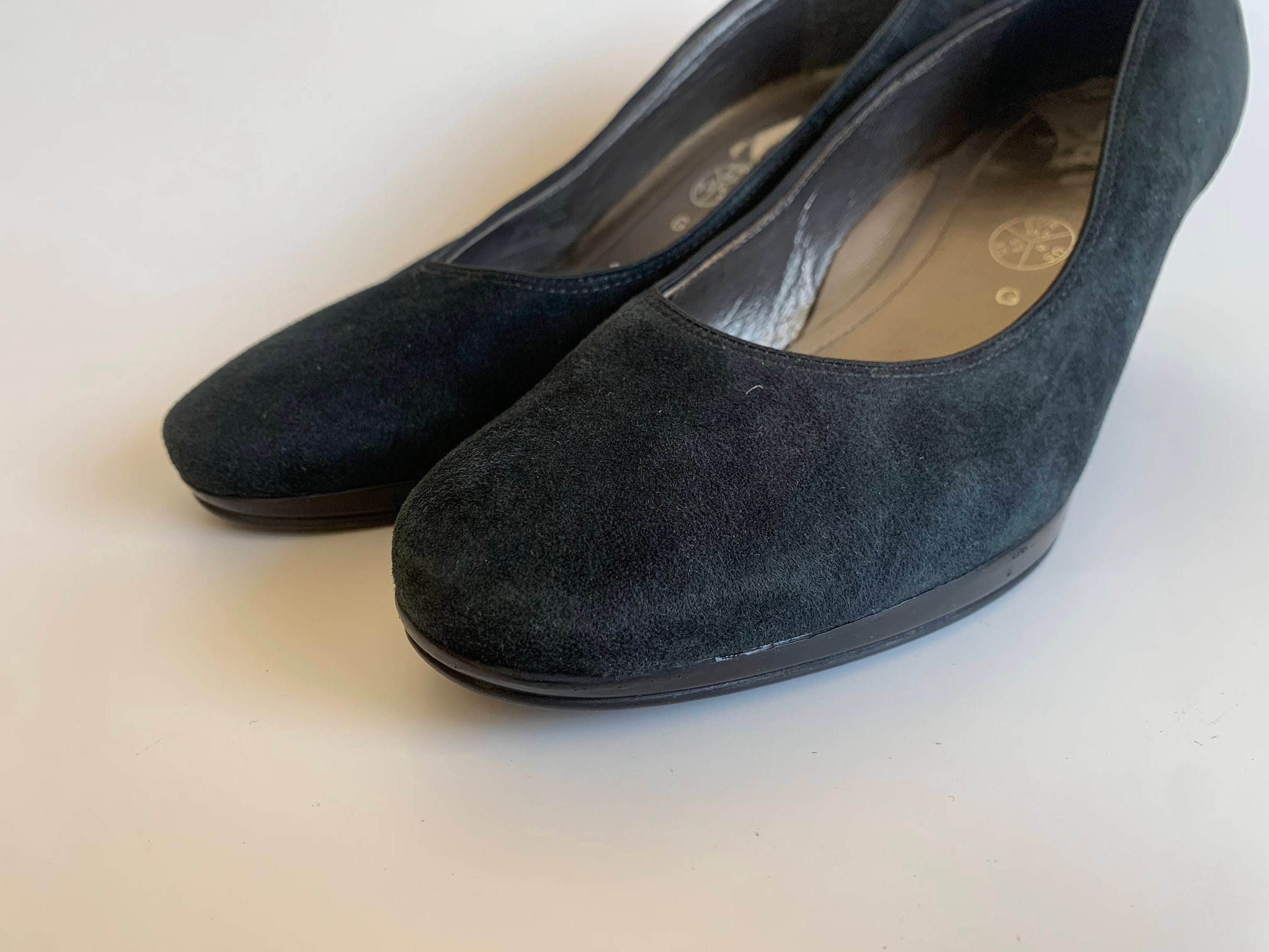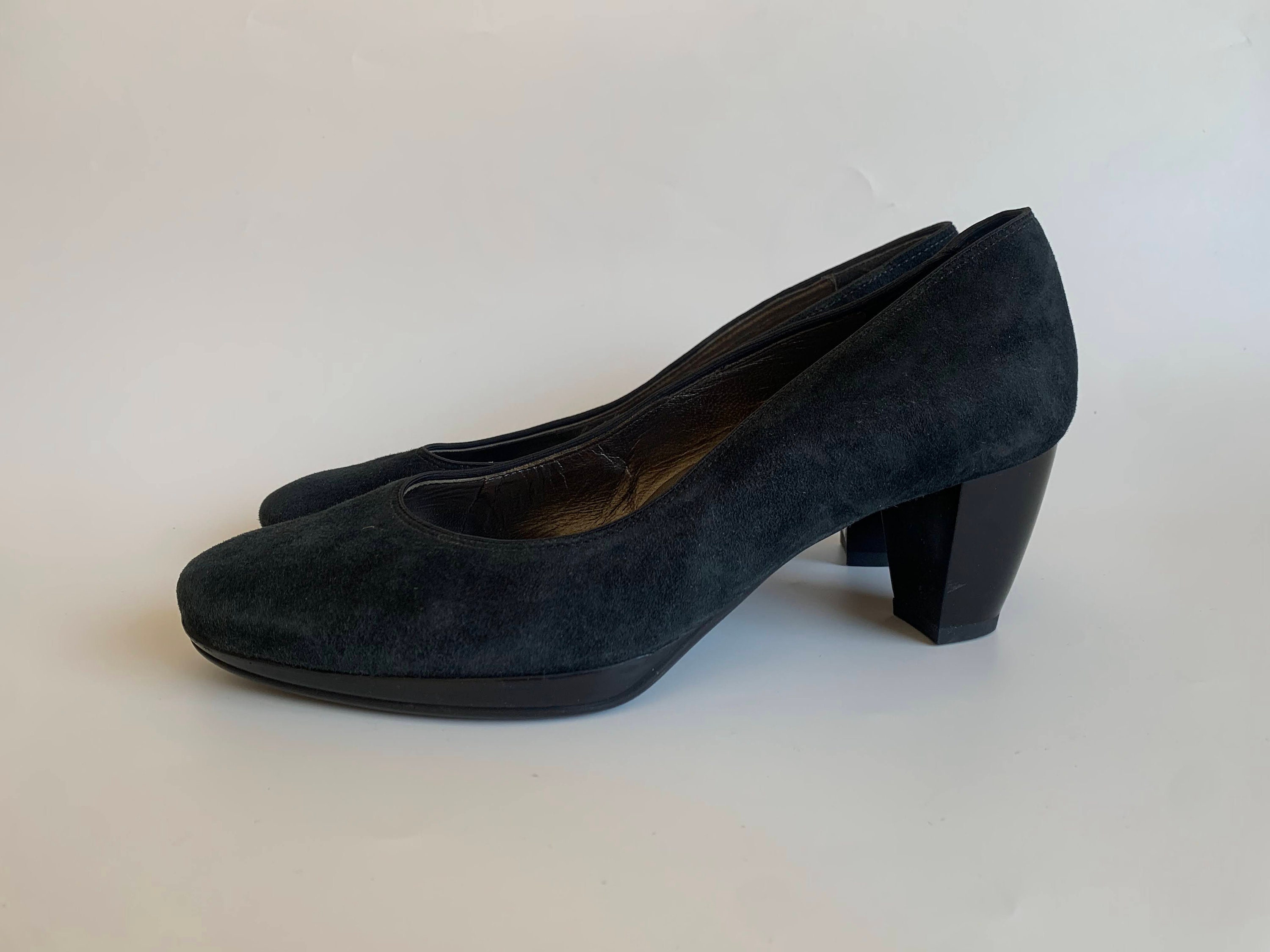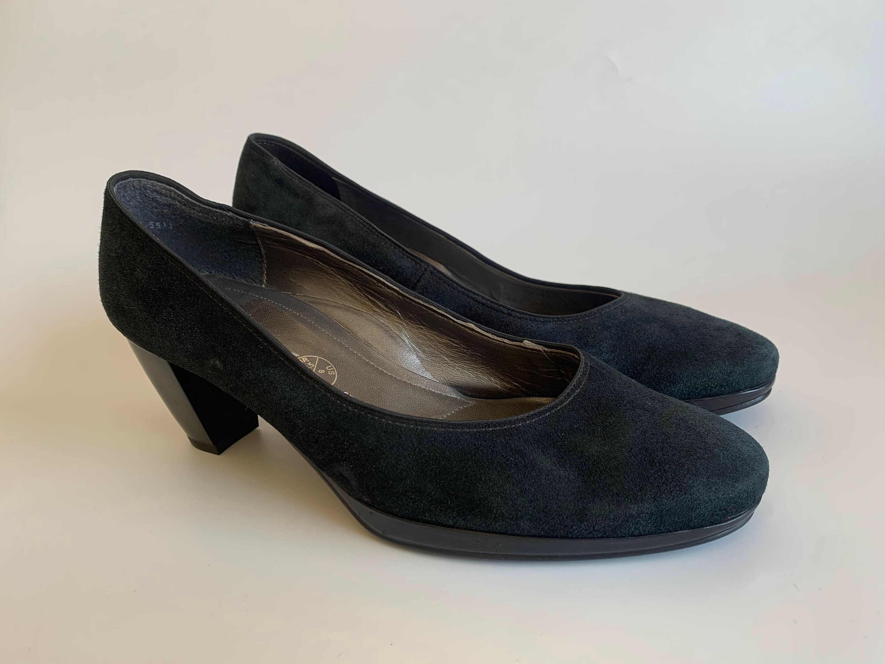 These are vintage heeled shoes for women made of genuine suede leather in black color. These loafer pumps are perfect for the office or academia. With these heeled slip ons you will achieve a business professional look. They are classic and timeless. These black leather pumps are by the brand Ara. The size marked is UK 5 1/2, which corresponds to EUR 38 1/2, US 7 1/2. Please check the measurements below.