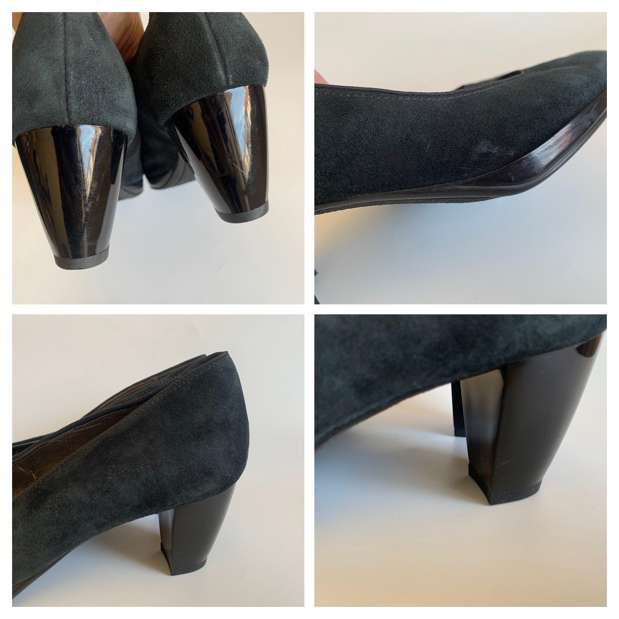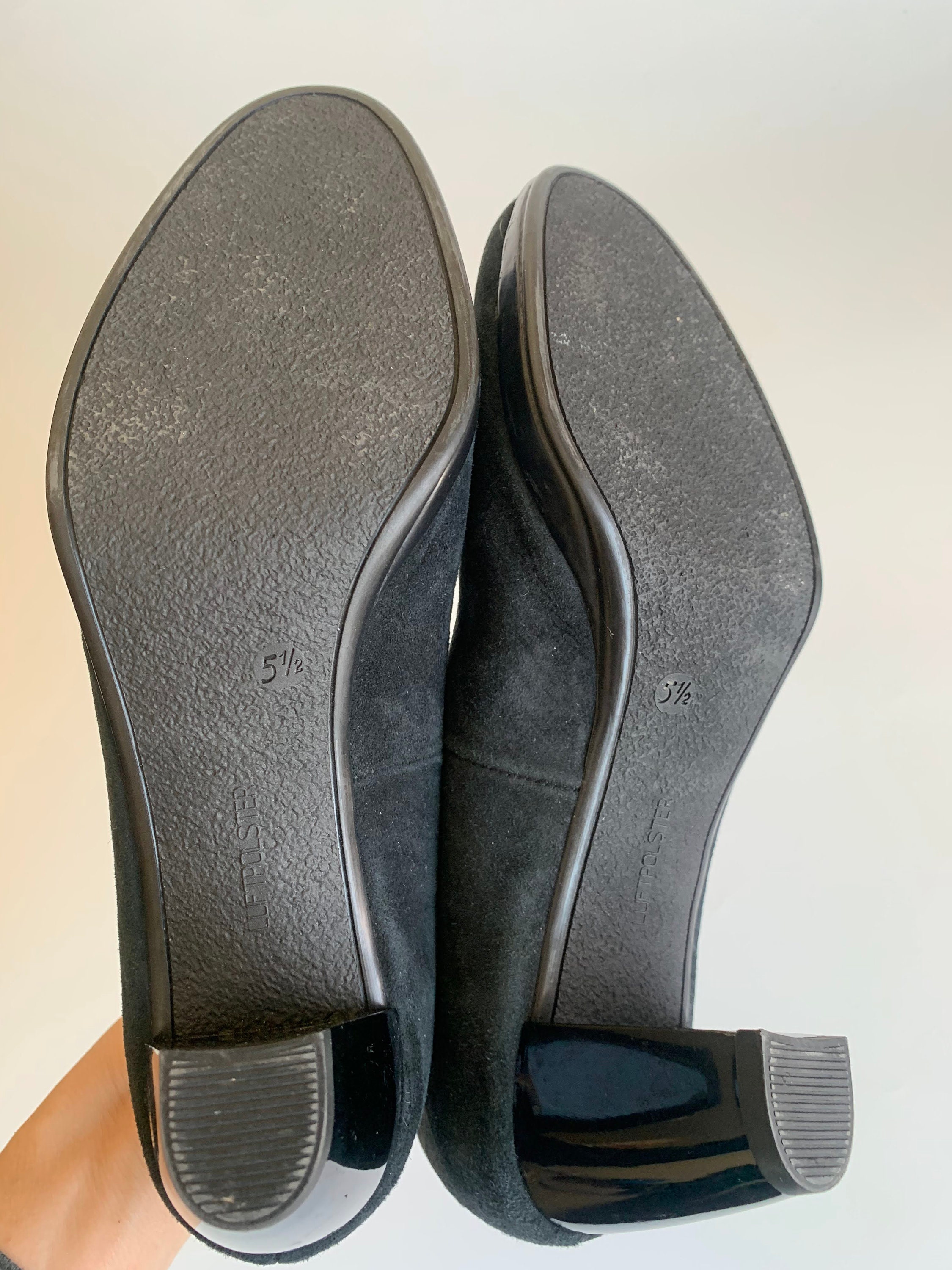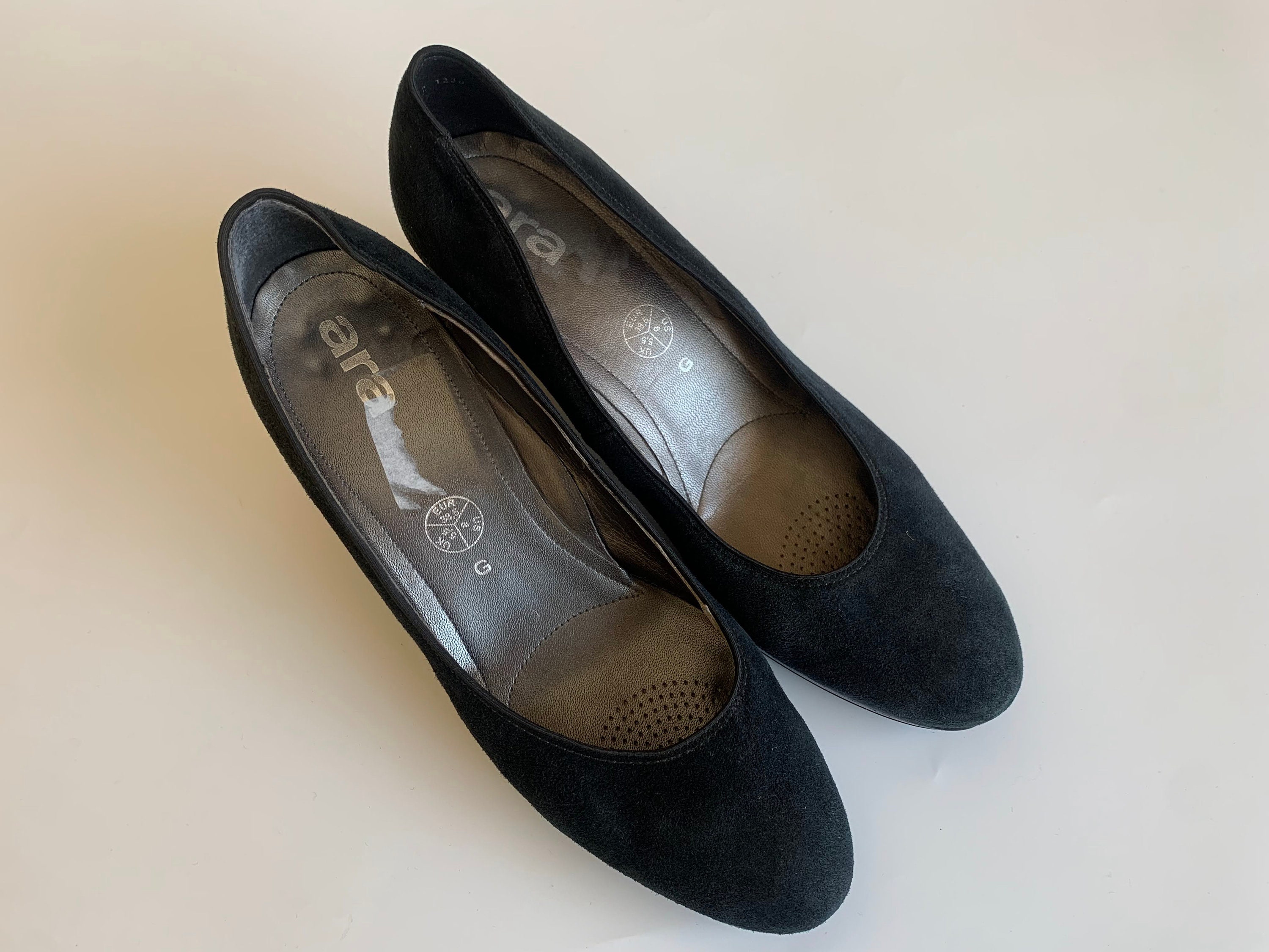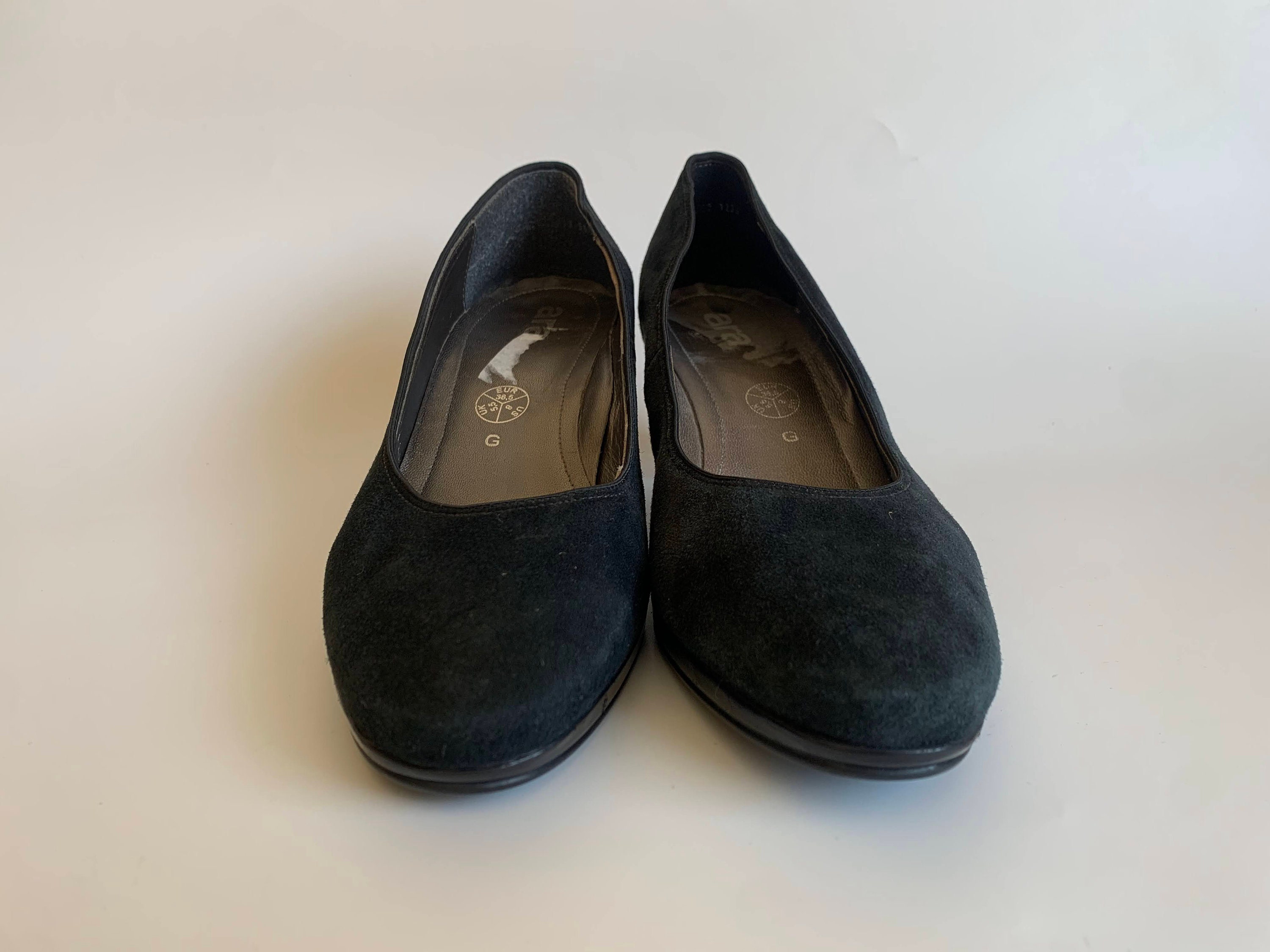 These are vintage heeled shoes for women made of genuine suede leather in black color. These loafer pumps are perfect for the office or academia. With these heeled slip ons you will achieve a business professional look. They are classic and timeless. These black leather pumps are by the brand Ara. The size marked is UK 5 1/2, which corresponds to EUR 38 1/2, US 7 1/2. Please check the measurements below.