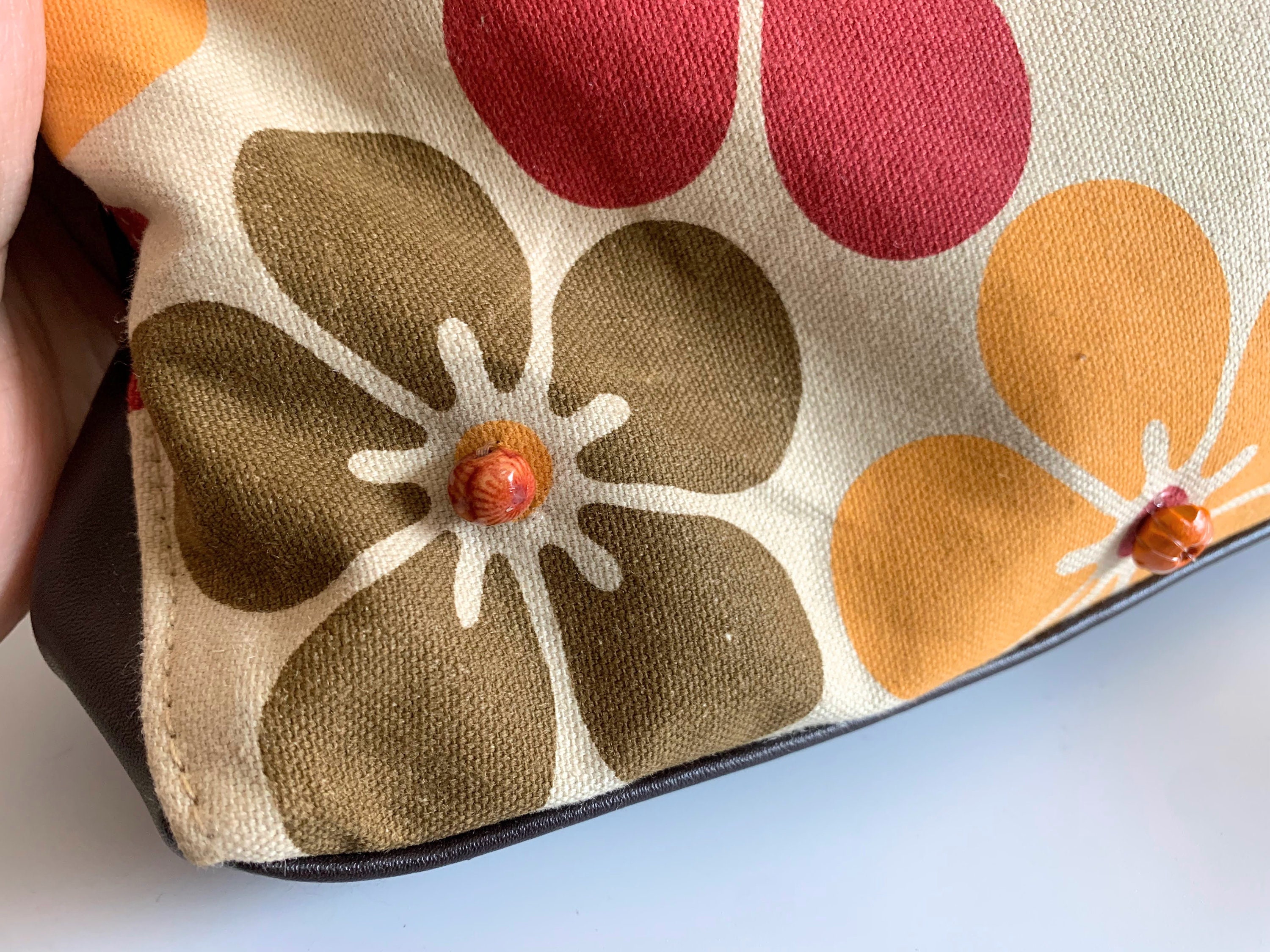 Condition: This vintage floral tote is in overall beautiful vintage condition. The cotton canvas fabric shows some texture due to the wear, but overall well preserved. There are some white marks at the bottom of the purse.