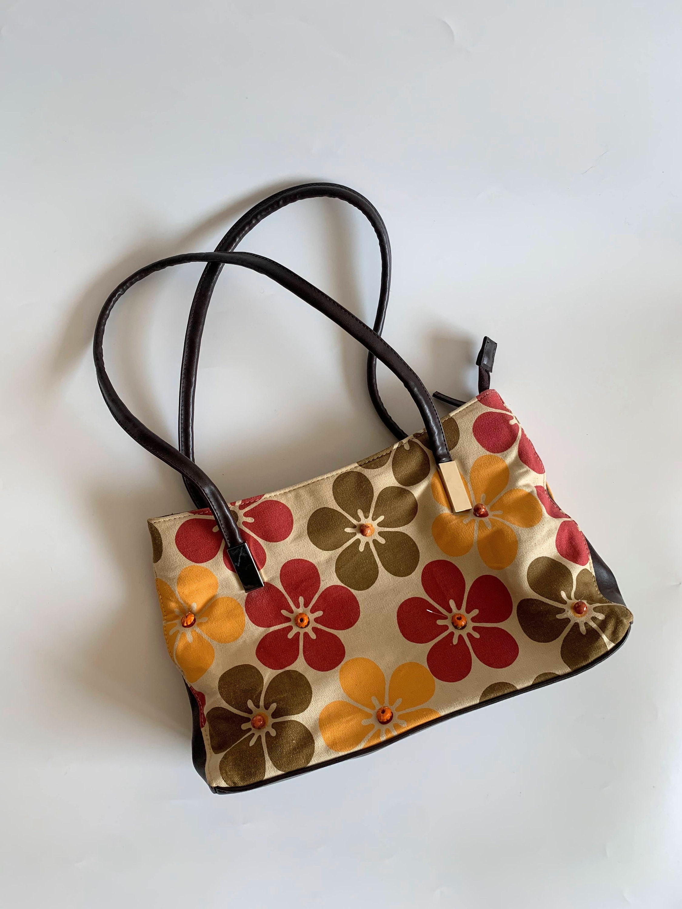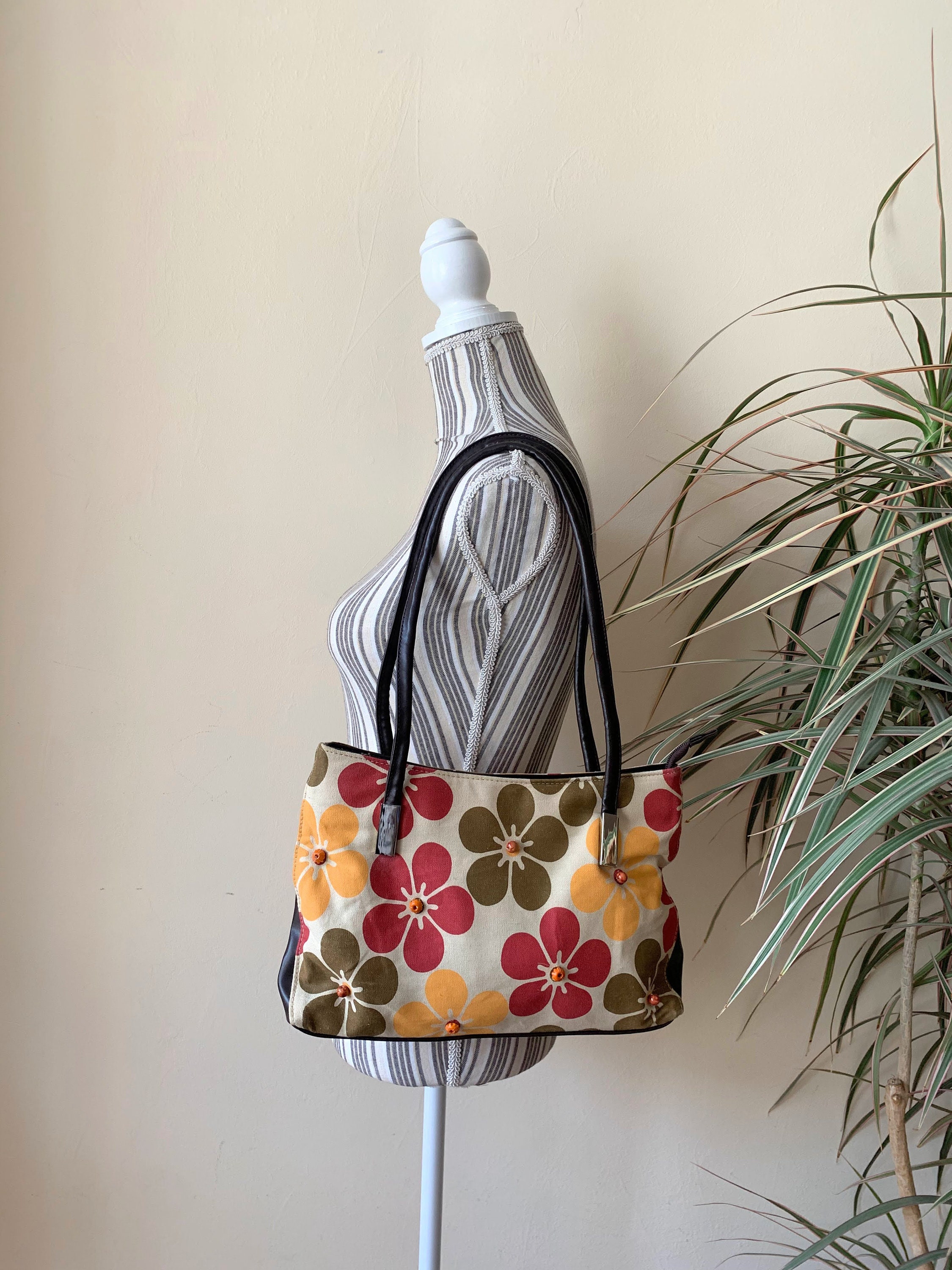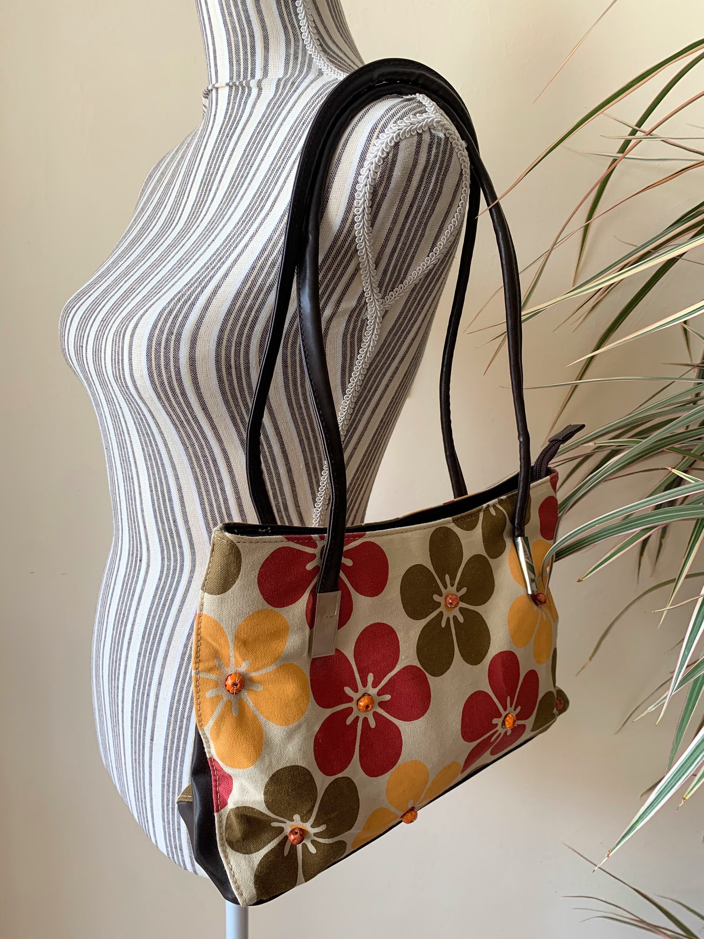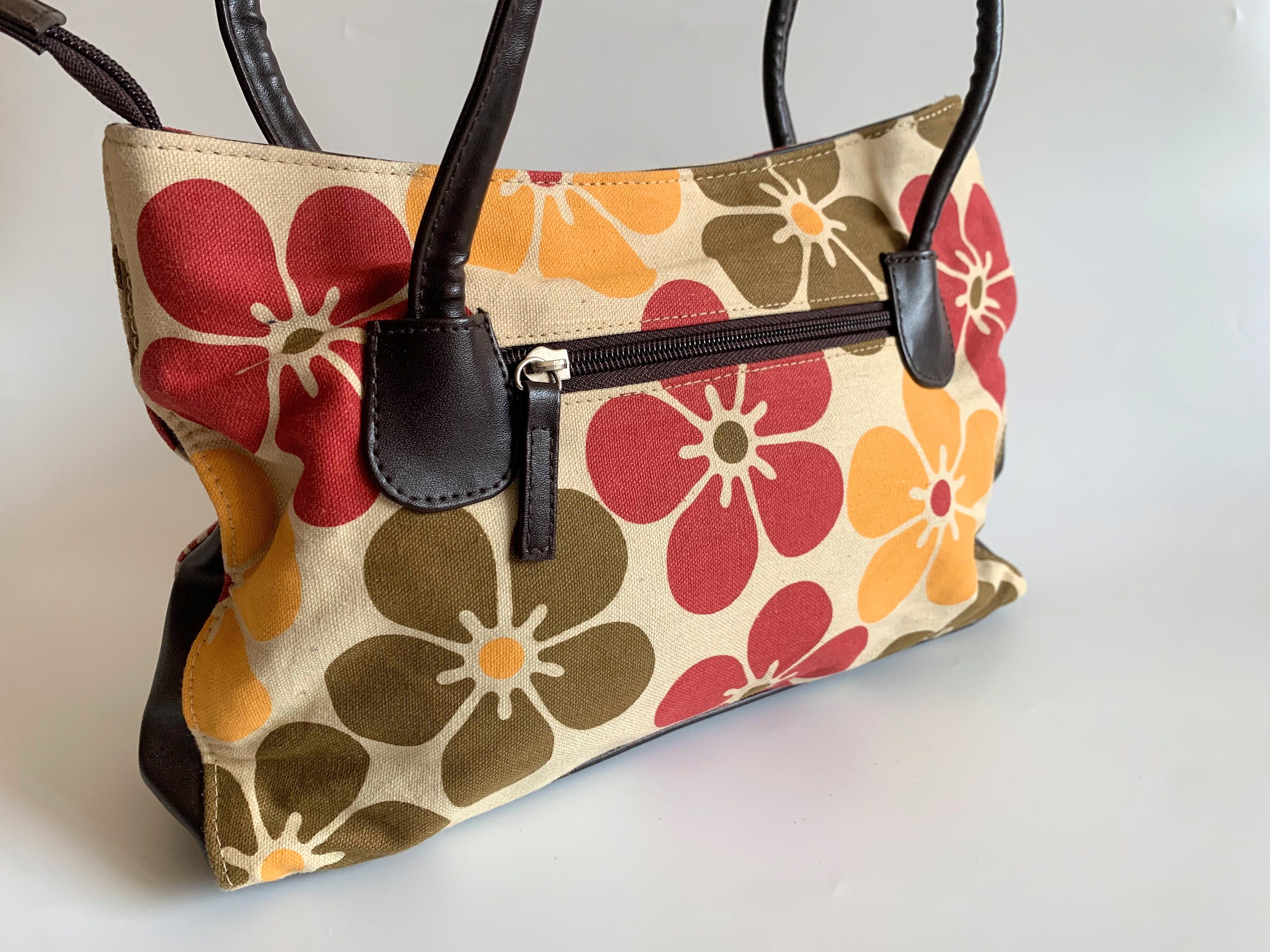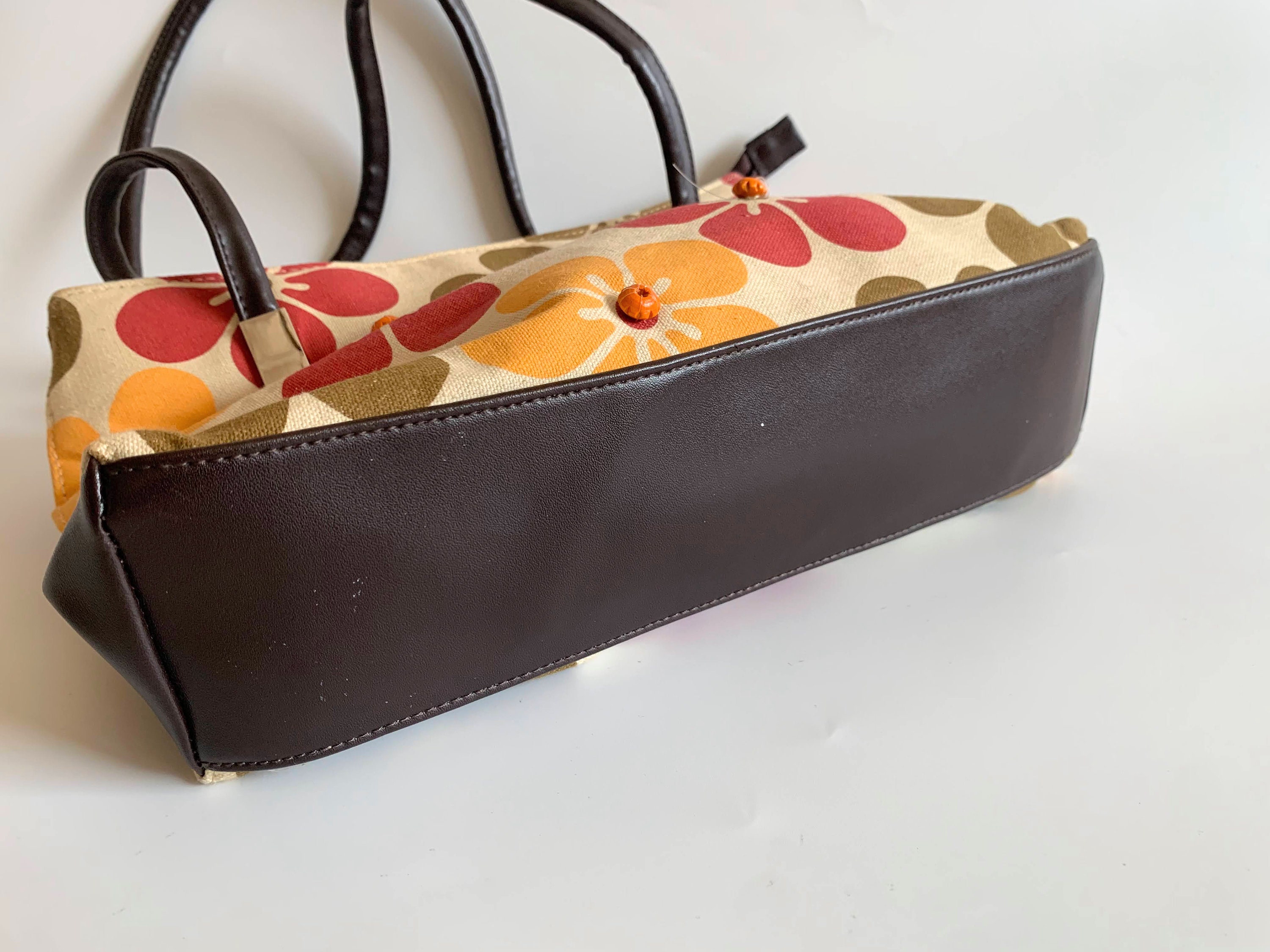 This is a vintage medium size cotton canvas tote bag with top zip closure with abstract floral print with red, green and orange flowers. This boho handbag is made of cotton fabric with faux leather straps and bottom. This baguette shoulder purse has top zip closure. The interior is lined with brown cotton fabric. This medium shoulder purse has one compartment and one slip pocket.