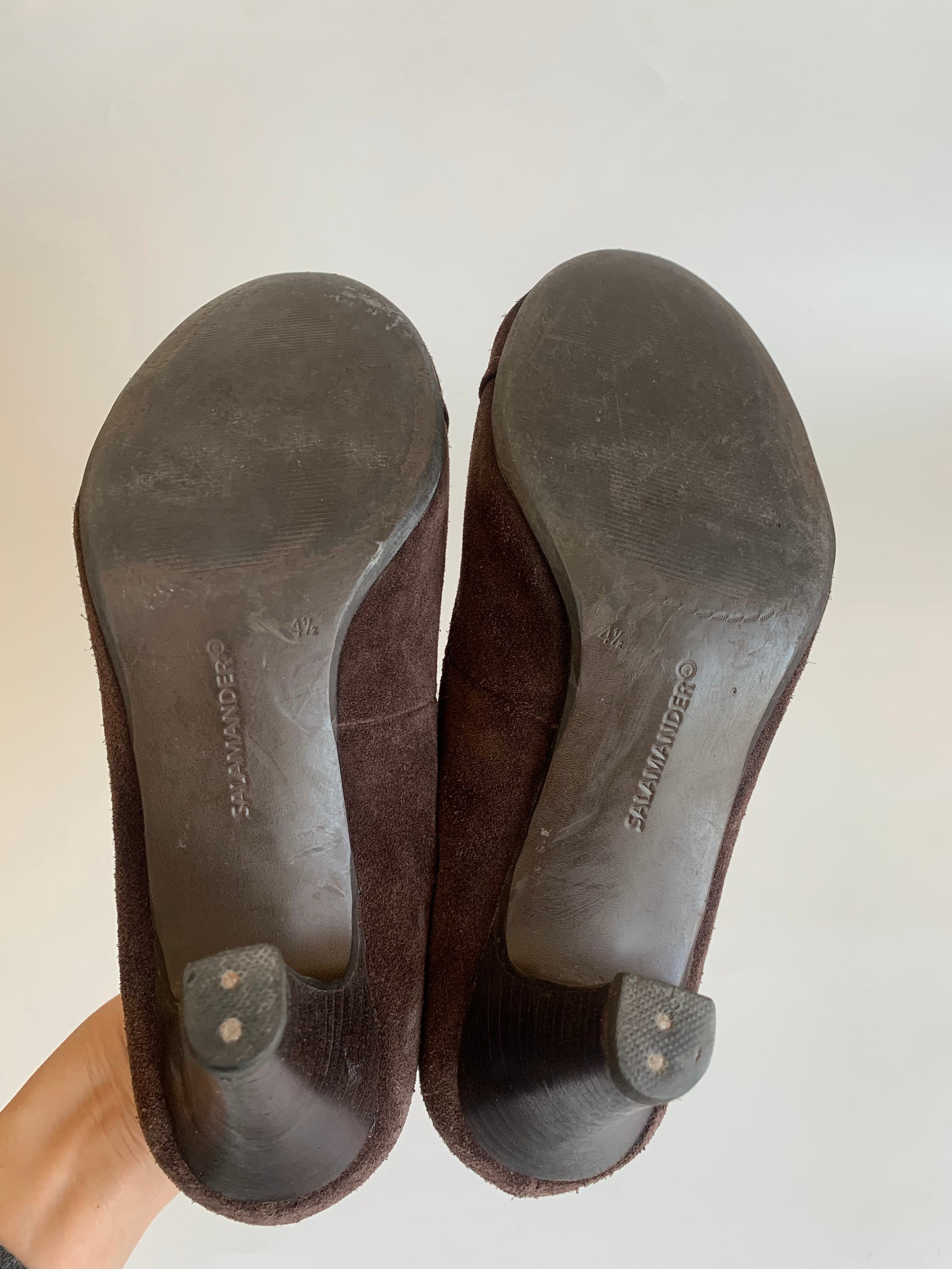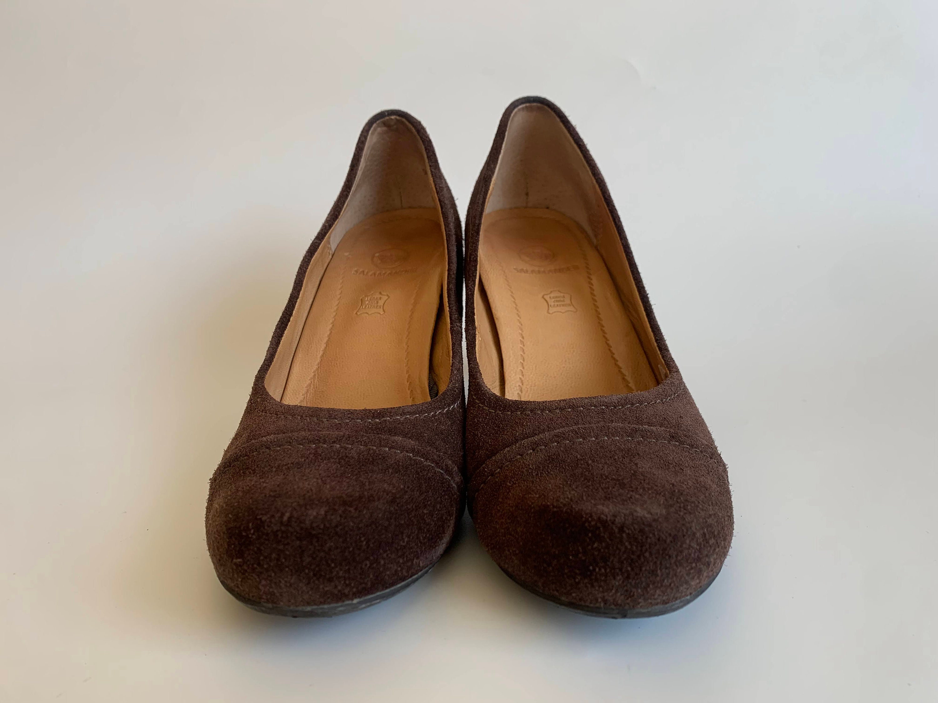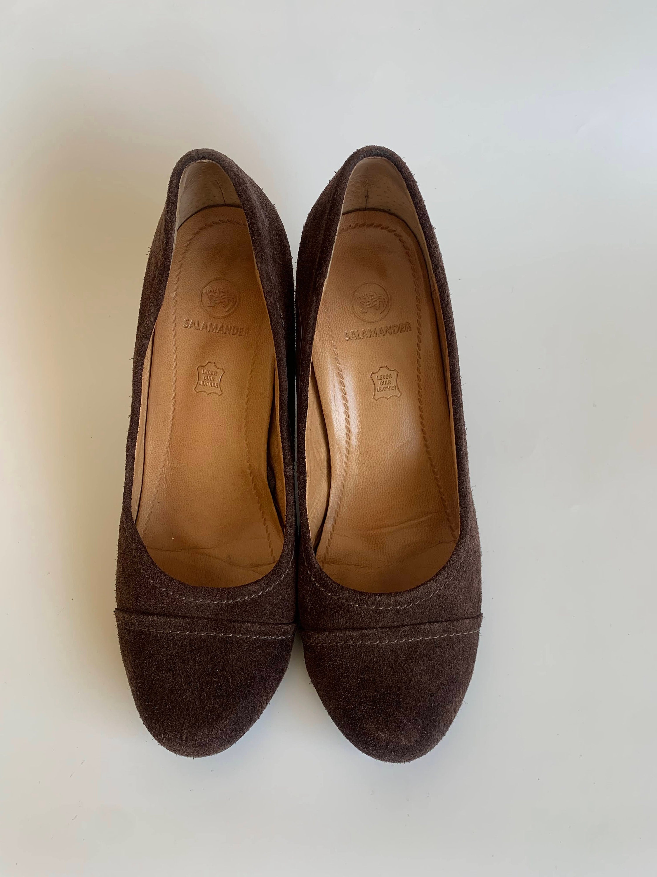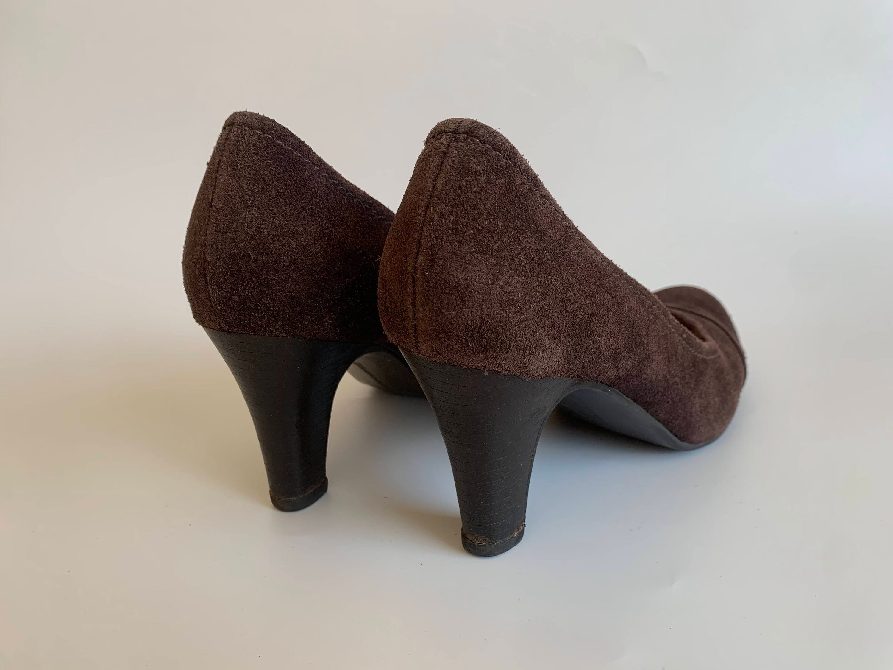 These are vintage high heel shoes for women made of genuine suede leather in warm chocolate brown color. These heeled loafer pumps are perfect for the office or academia. Wonderful nude business shoe to wear daily at work at the office. With these classic heeled slip on shoes you will feel comfortable anywhere. They are classic and timeless, perfect for your day out. These brown suede leather pumps are by the brand Salamander. The size marked is EUR 37 1/2, which corresponds to UK 4 1/2, US 7 . Please check the measurements below.