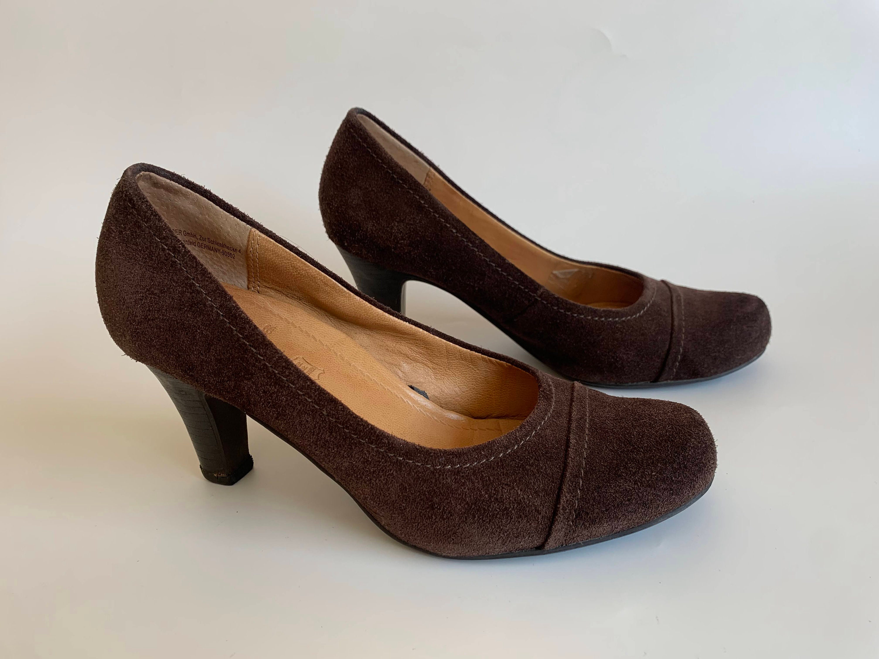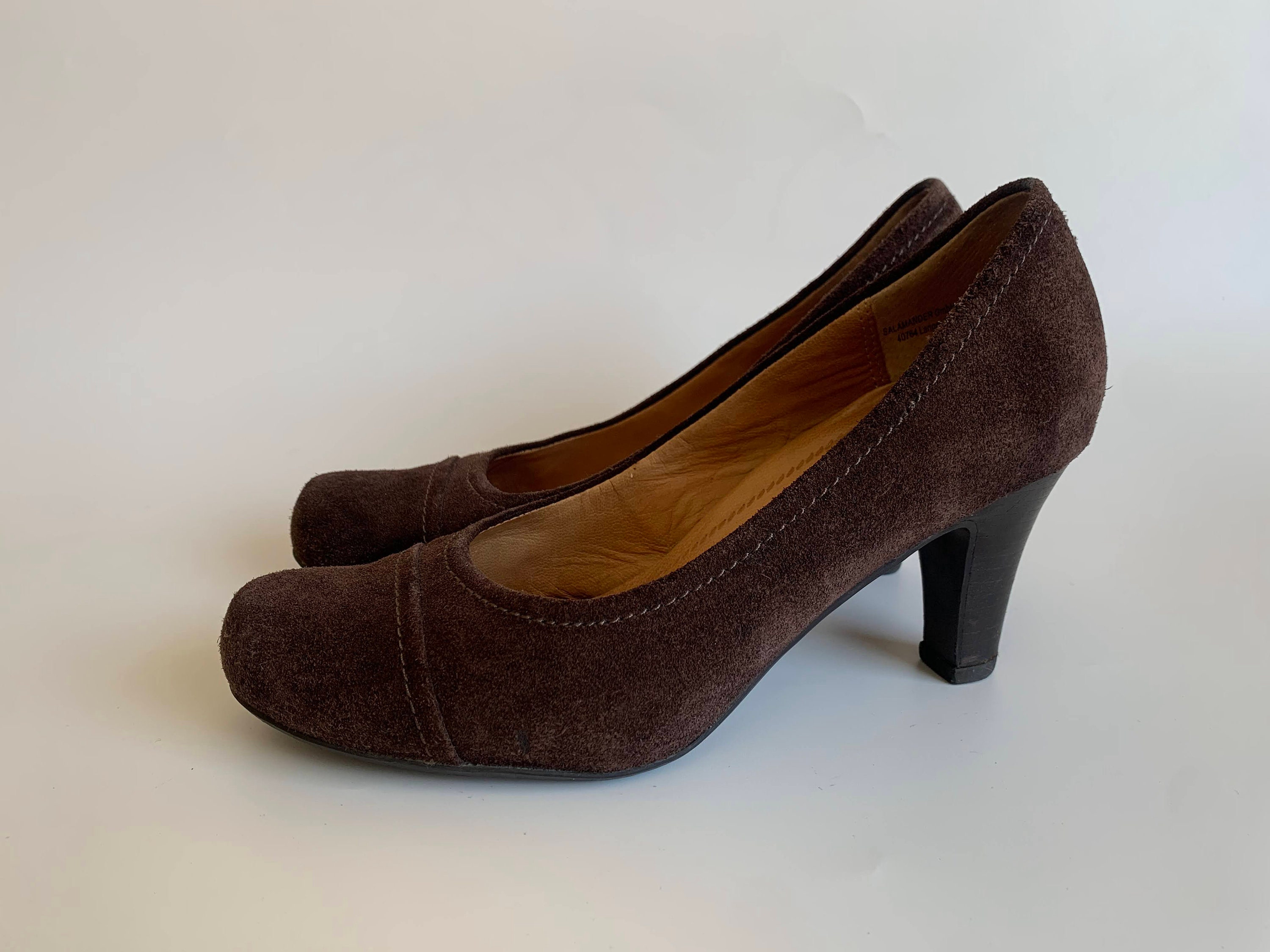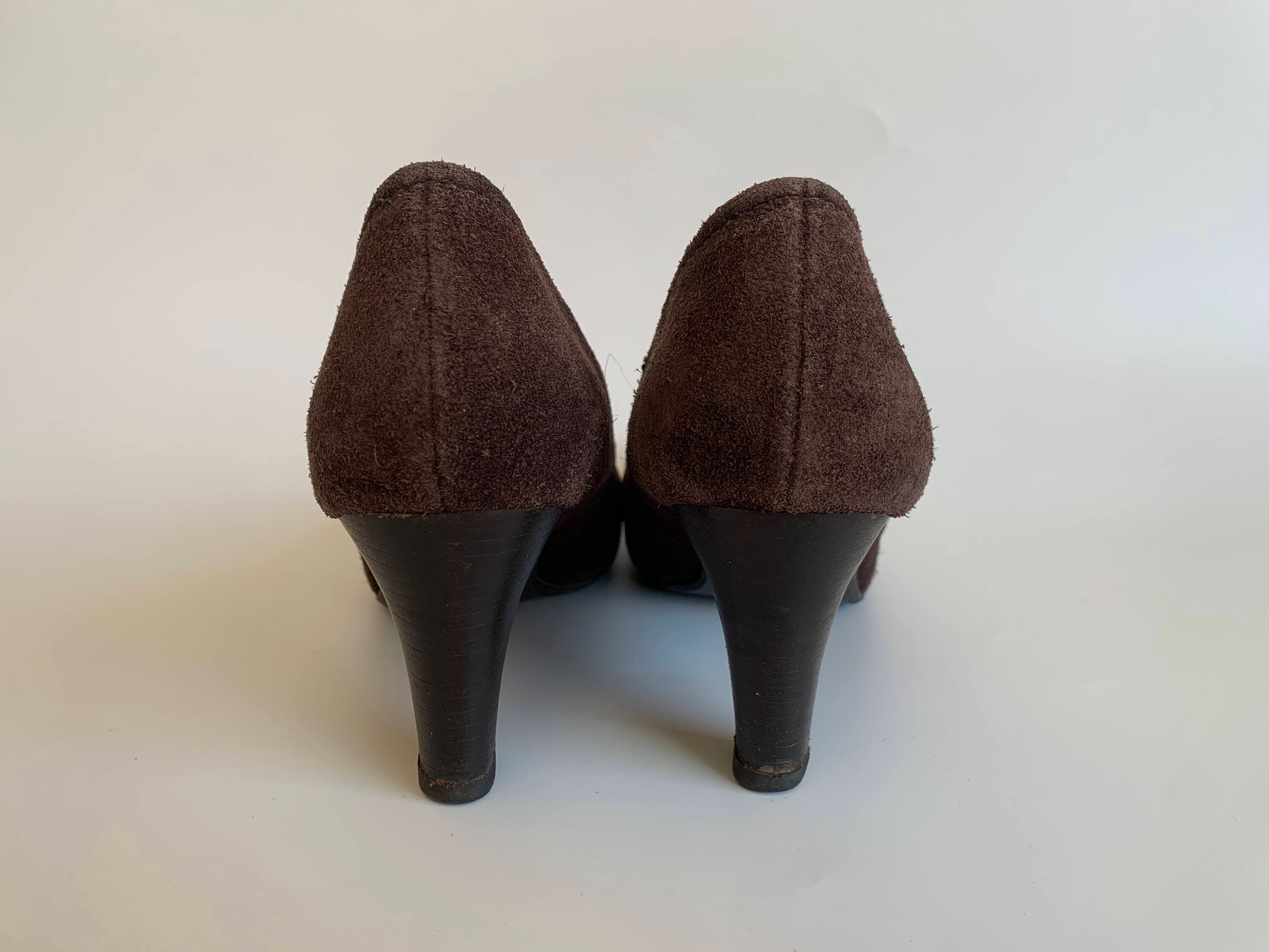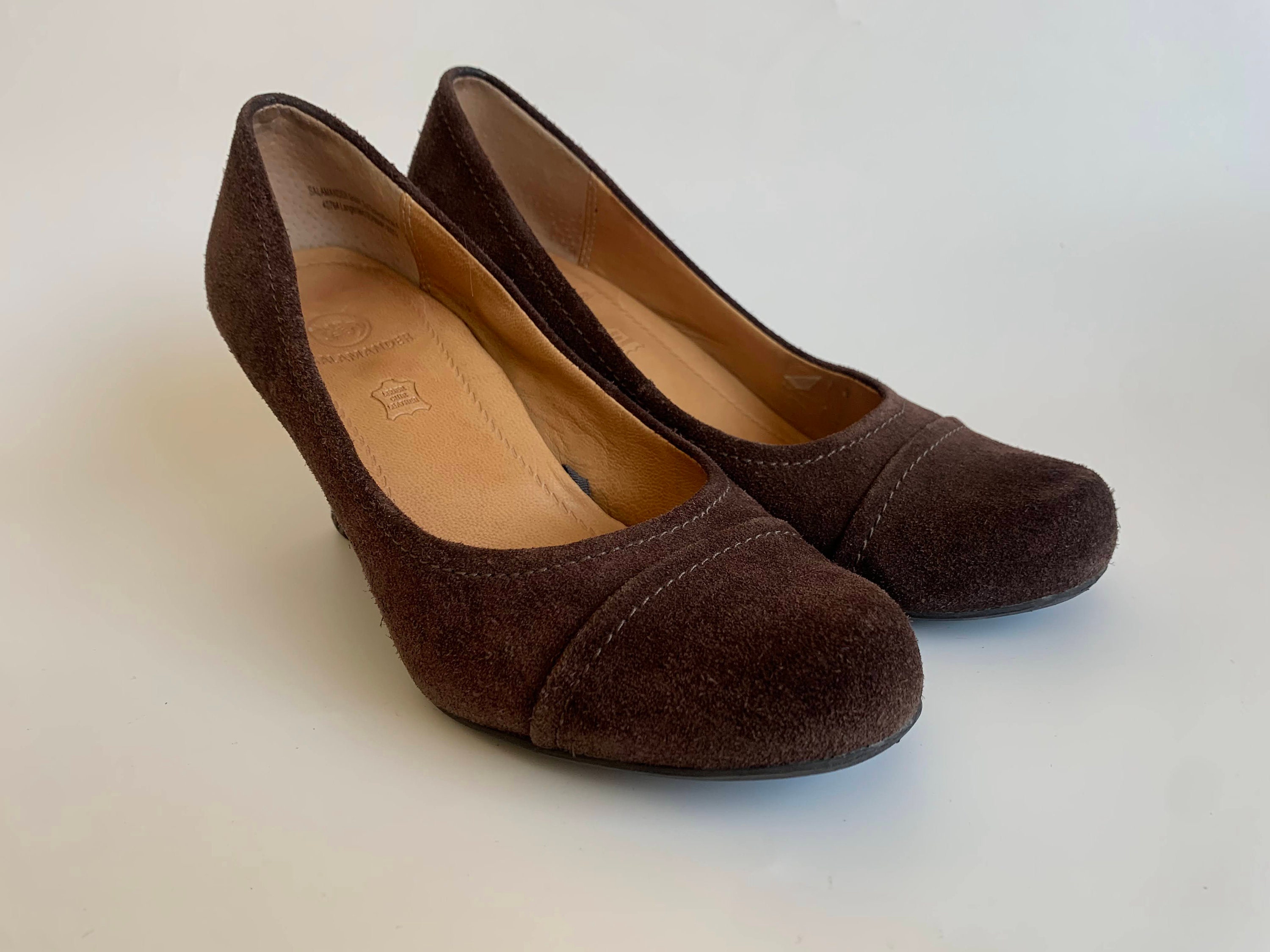 These are vintage high heel shoes for women made of genuine suede leather in warm chocolate brown color. These heeled loafer pumps are perfect for the office or academia. Wonderful nude business shoe to wear daily at work at the office. With these classic heeled slip on shoes you will feel comfortable anywhere. They are classic and timeless, perfect for your day out. These brown suede leather pumps are by the brand Salamander. The size marked is EUR 37 1/2, which corresponds to UK 4 1/2, US 7 . Please check the measurements below.