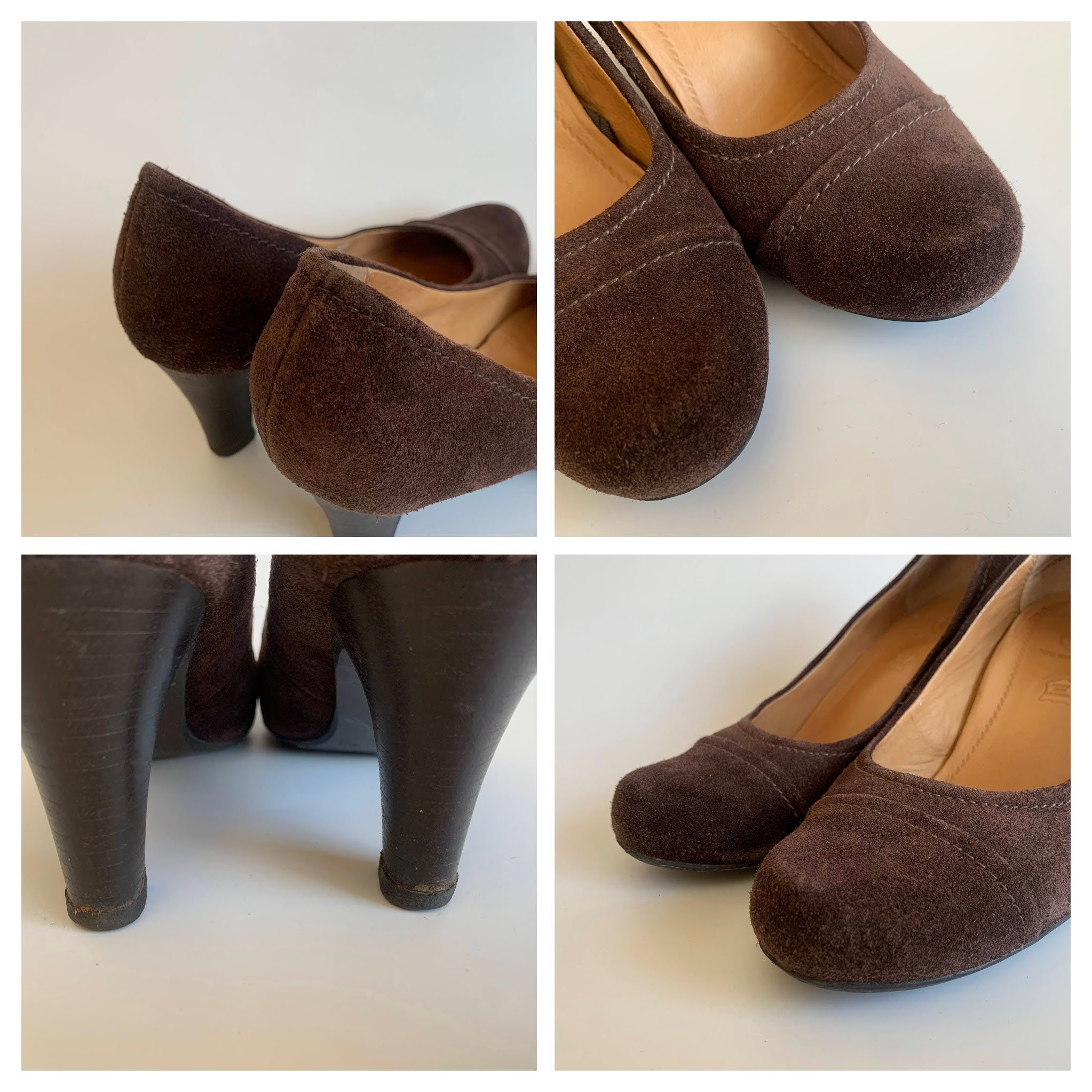 Condition: These suede leather high heel shoes were pre-loved and they show some signs of wear. There are some marks on the suede leather surface typical for vintage suede leather items - there are some marks on the heels and around the toes which appear a shade lighter when exposed to proper light. There are some scratches on the heels close to the caps, which I have tried to capture in the close up photos.