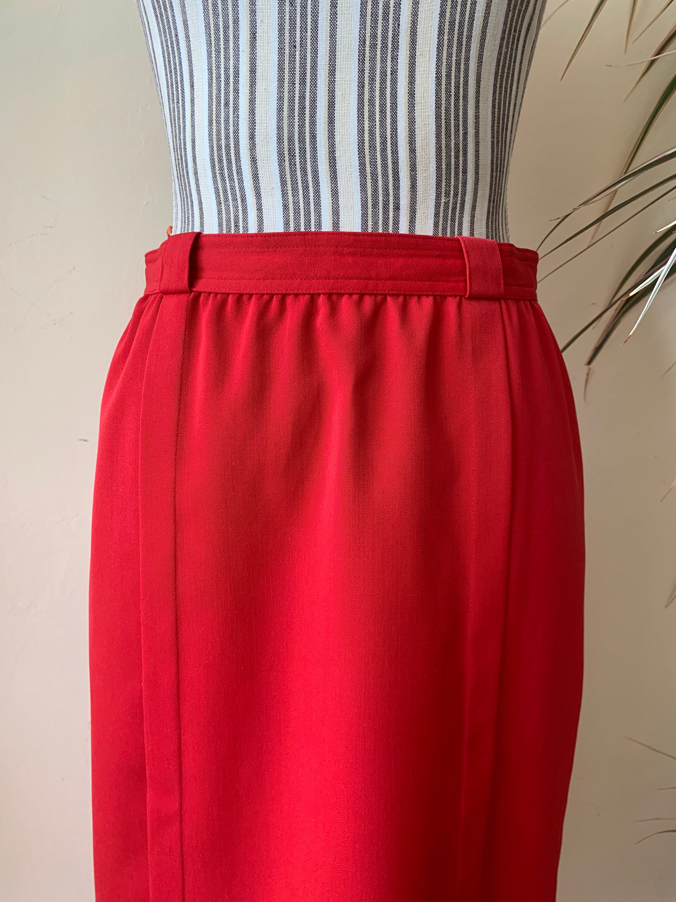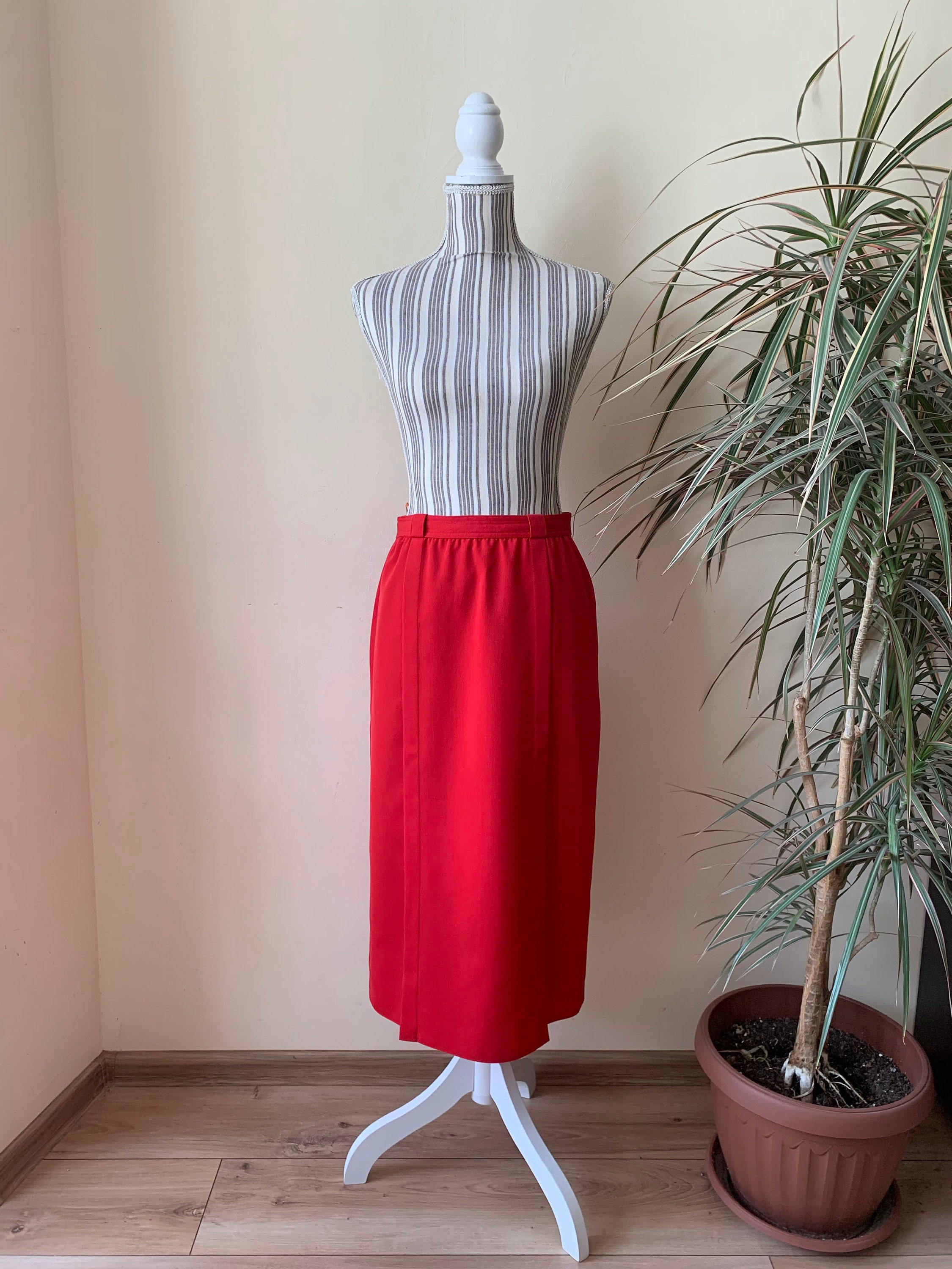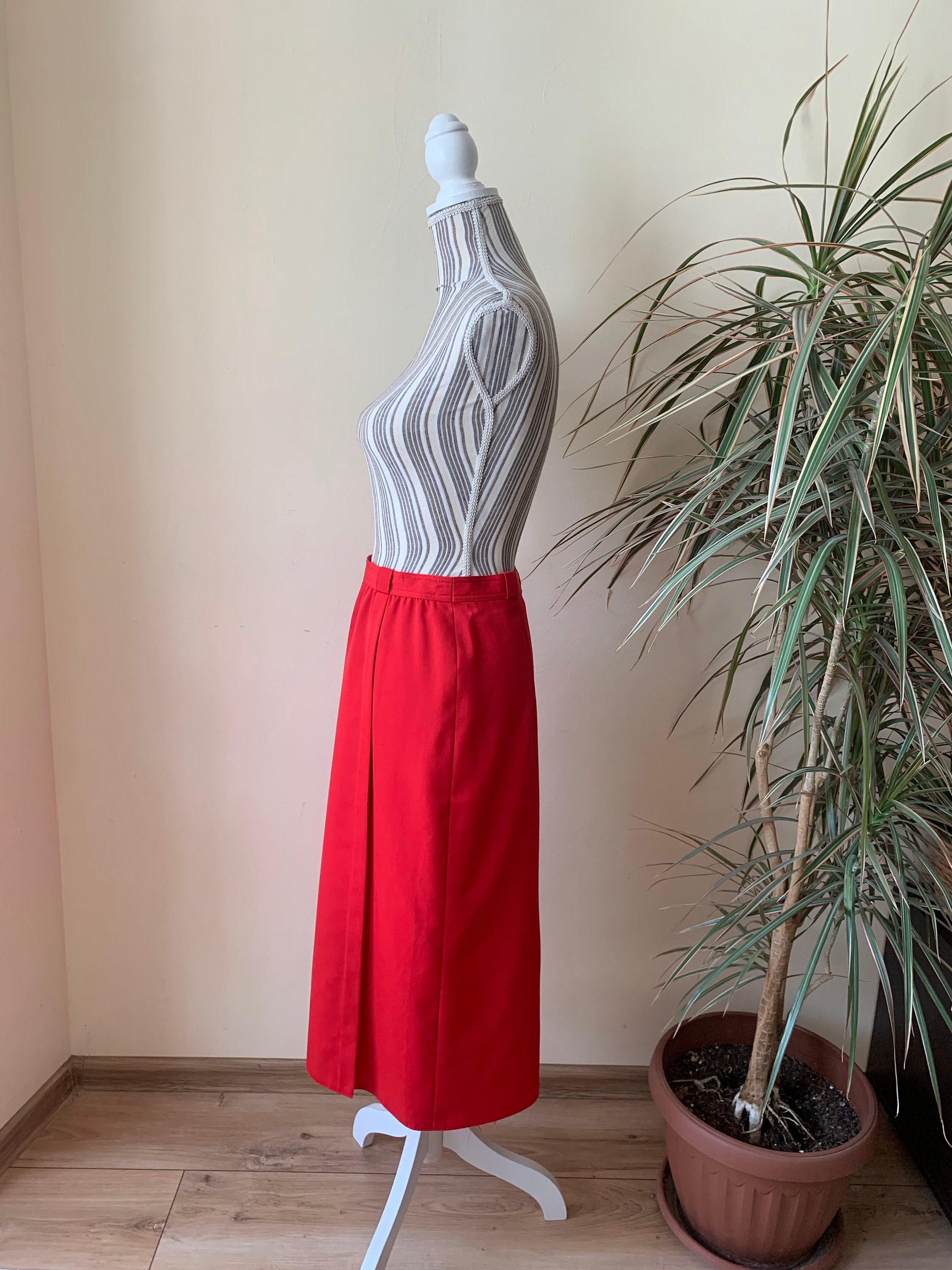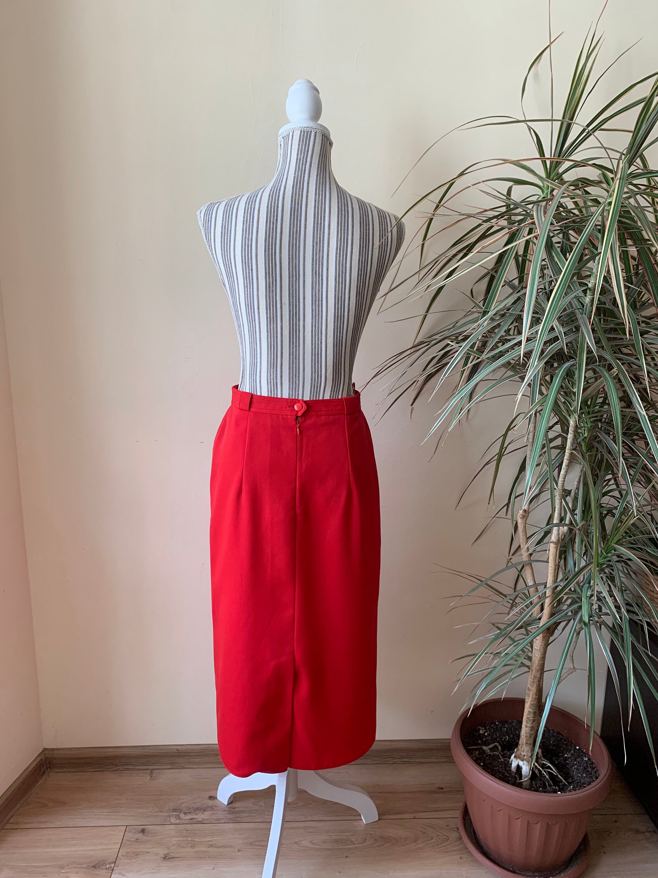 This is a lovely bright lipstick red straight midi skirt from the 80s. This vintage pencil skirt has a high waist with two pleats at the front and back zip and button closure. This mid calf midi skirt has a pencil silhouette, it is simple in shape and yet the stunning color will get all eyes on you. This retro midi skirt reaches to about mid calf depending on your hight. It is made of polyester wool blend fabric which has no stretch (55% polyester, 45% wool) . This red long skirt has a straight minimalistic silhouette which enhances your waistline and beautifully embraces your hips and thighs. This basic minimalist long skirt is perfect for the office, business or casual attire. Ideal for the fall and spring season. This longline skirt has a polyester lining underneath. This minimalist skirt was made in West Germany by the brand Issel. The size of this red midi skirt is 38, which fits like size M. Please check the measurements below.