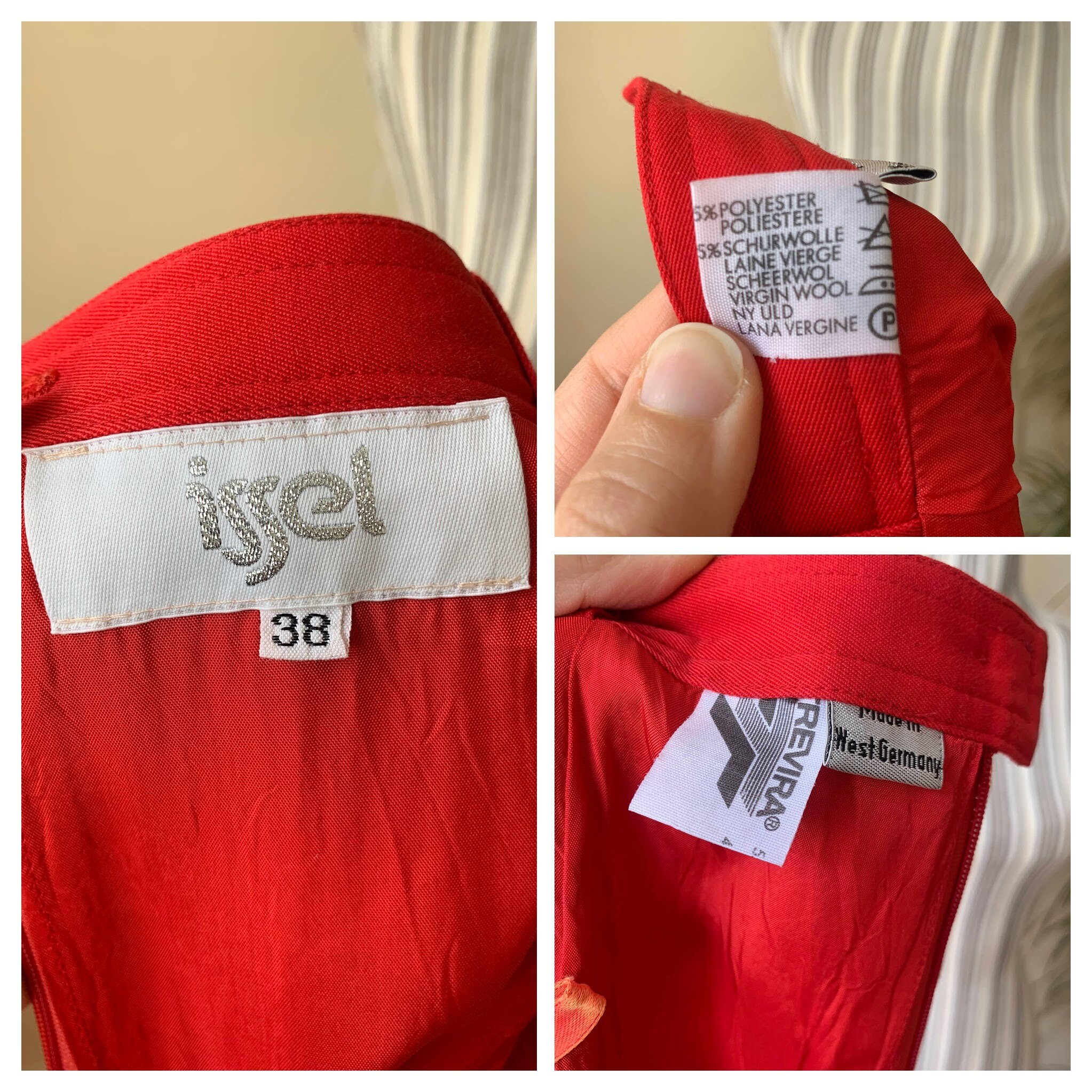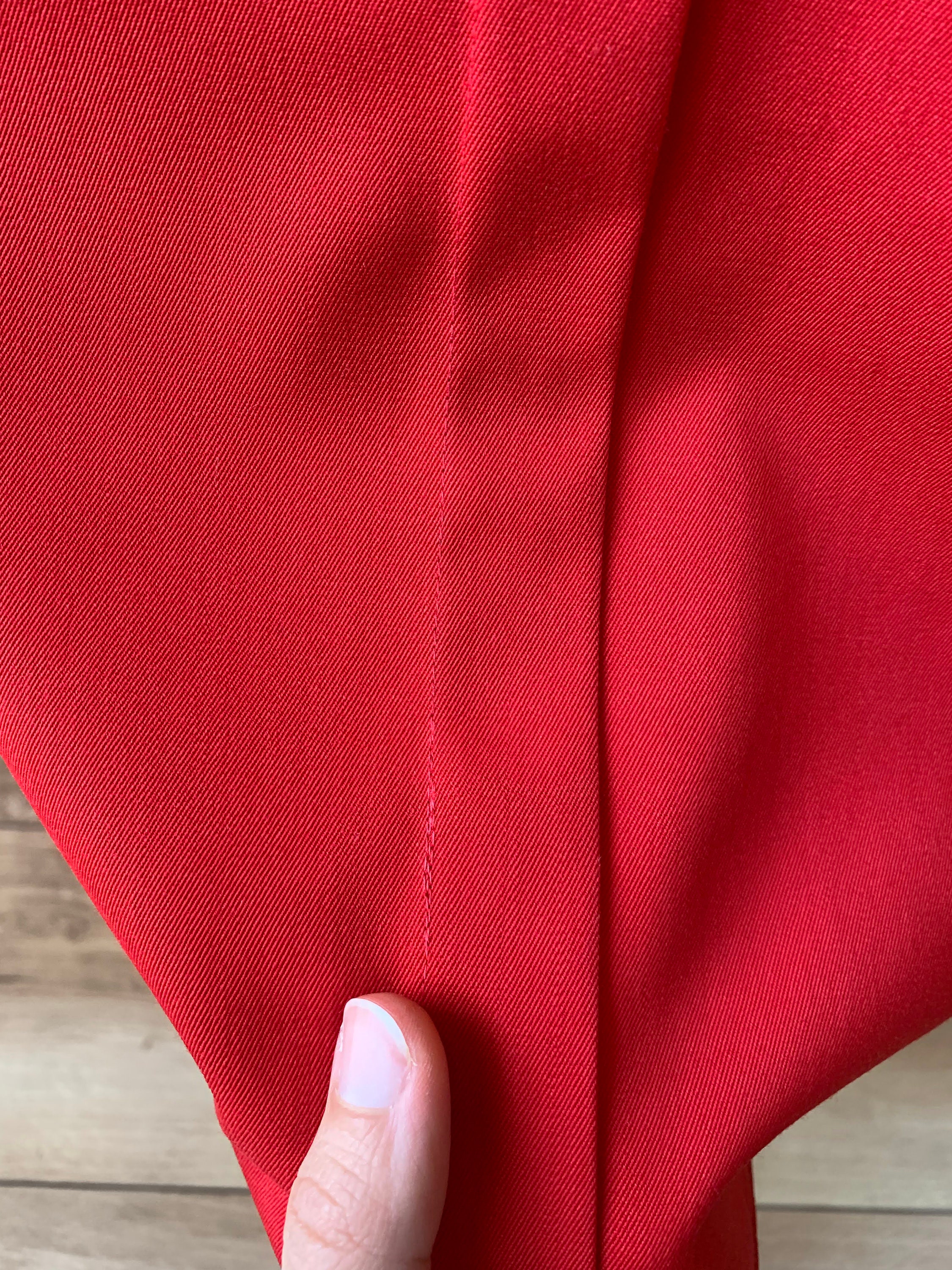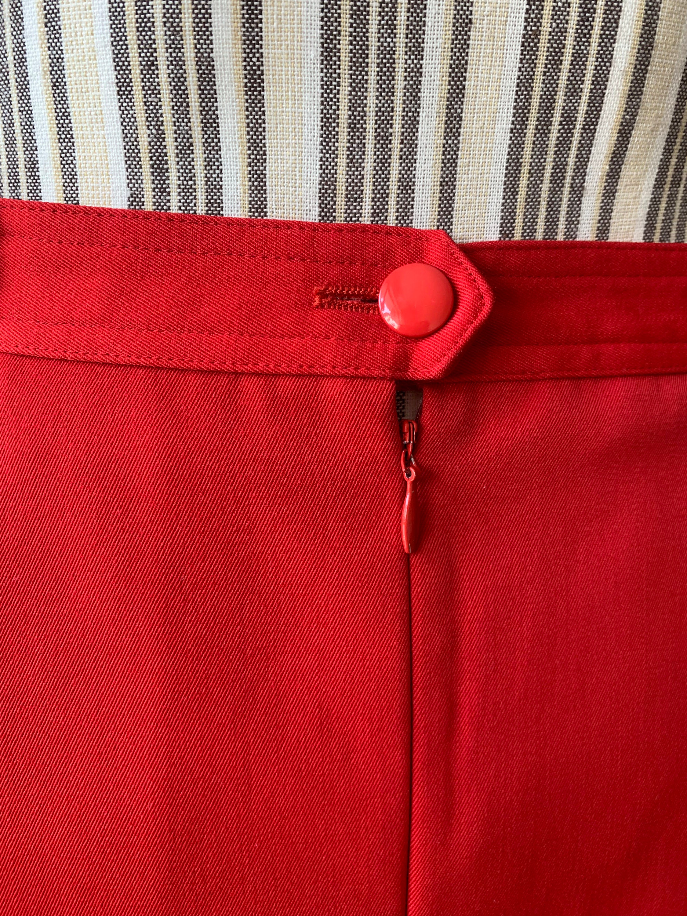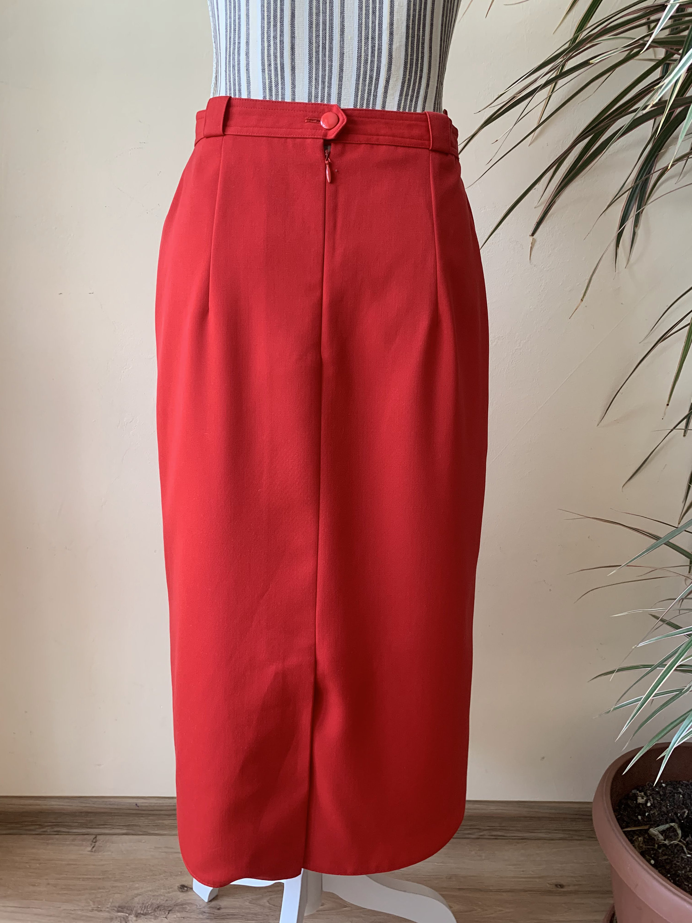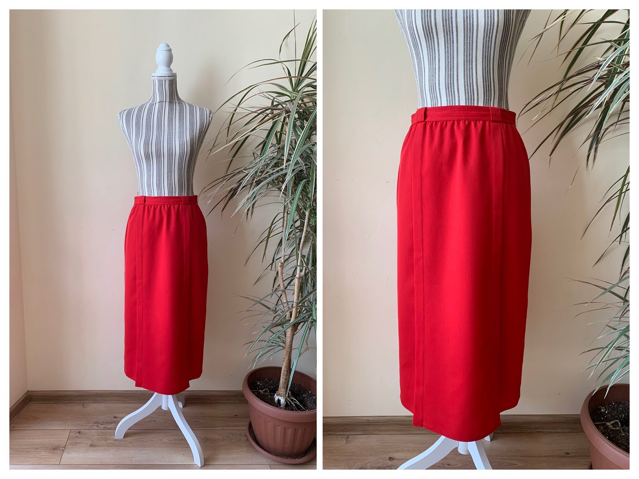 This is a lovely bright lipstick red straight midi skirt from the 80s. This vintage pencil skirt has a high waist with two pleats at the front and back zip and button closure. This mid calf midi skirt has a pencil silhouette, it is simple in shape and yet the stunning color will get all eyes on you. This retro midi skirt reaches to about mid calf depending on your hight. It is made of polyester wool blend fabric which has no stretch (55% polyester, 45% wool) . This red long skirt has a straight minimalistic silhouette which enhances your waistline and beautifully embraces your hips and thighs. This basic minimalist long skirt is perfect for the office, business or casual attire. Ideal for the fall and spring season. This longline skirt has a polyester lining underneath. This minimalist skirt was made in West Germany by the brand Issel. The size of this red midi skirt is 38, which fits like size M. Please check the measurements below.