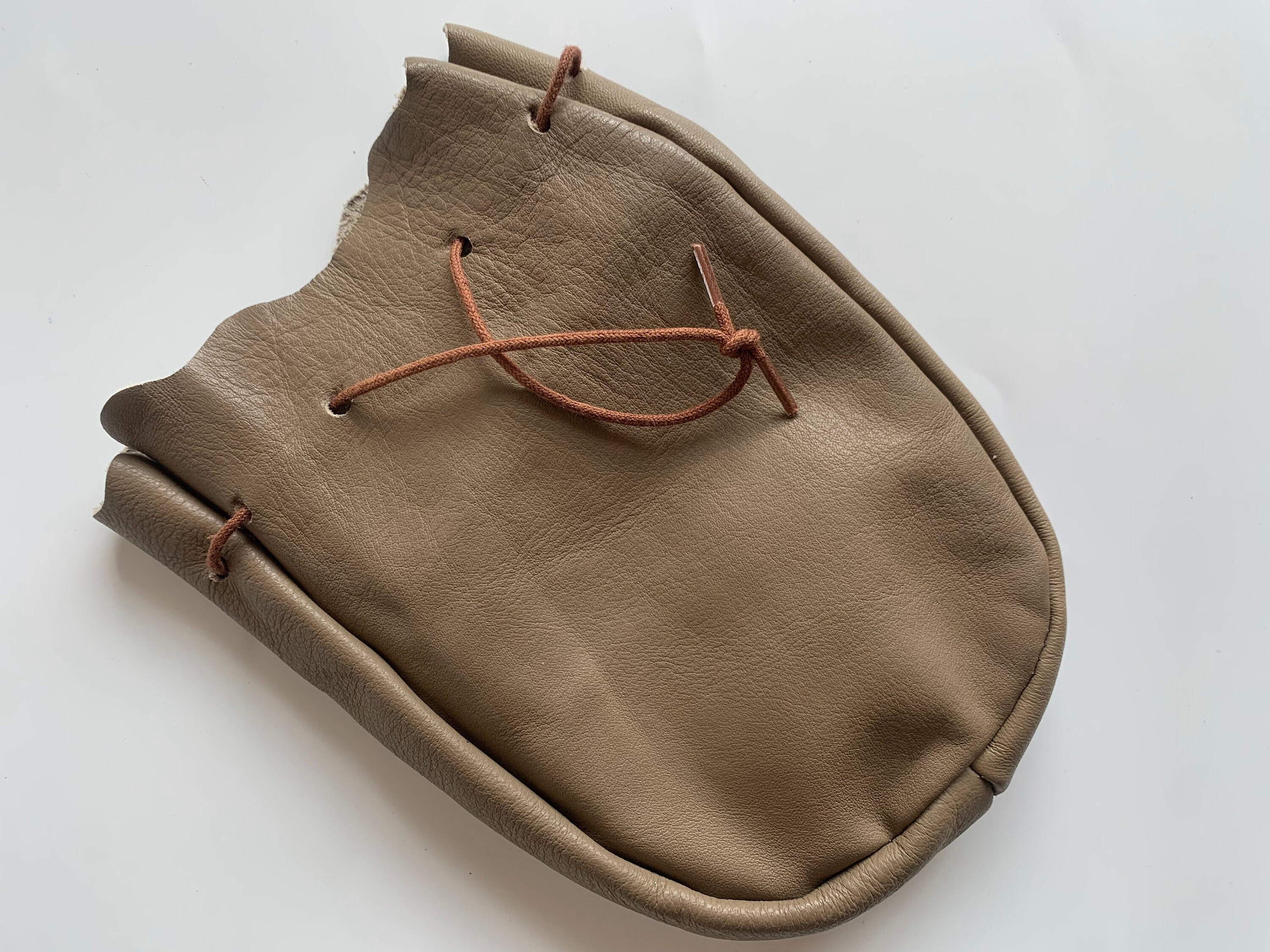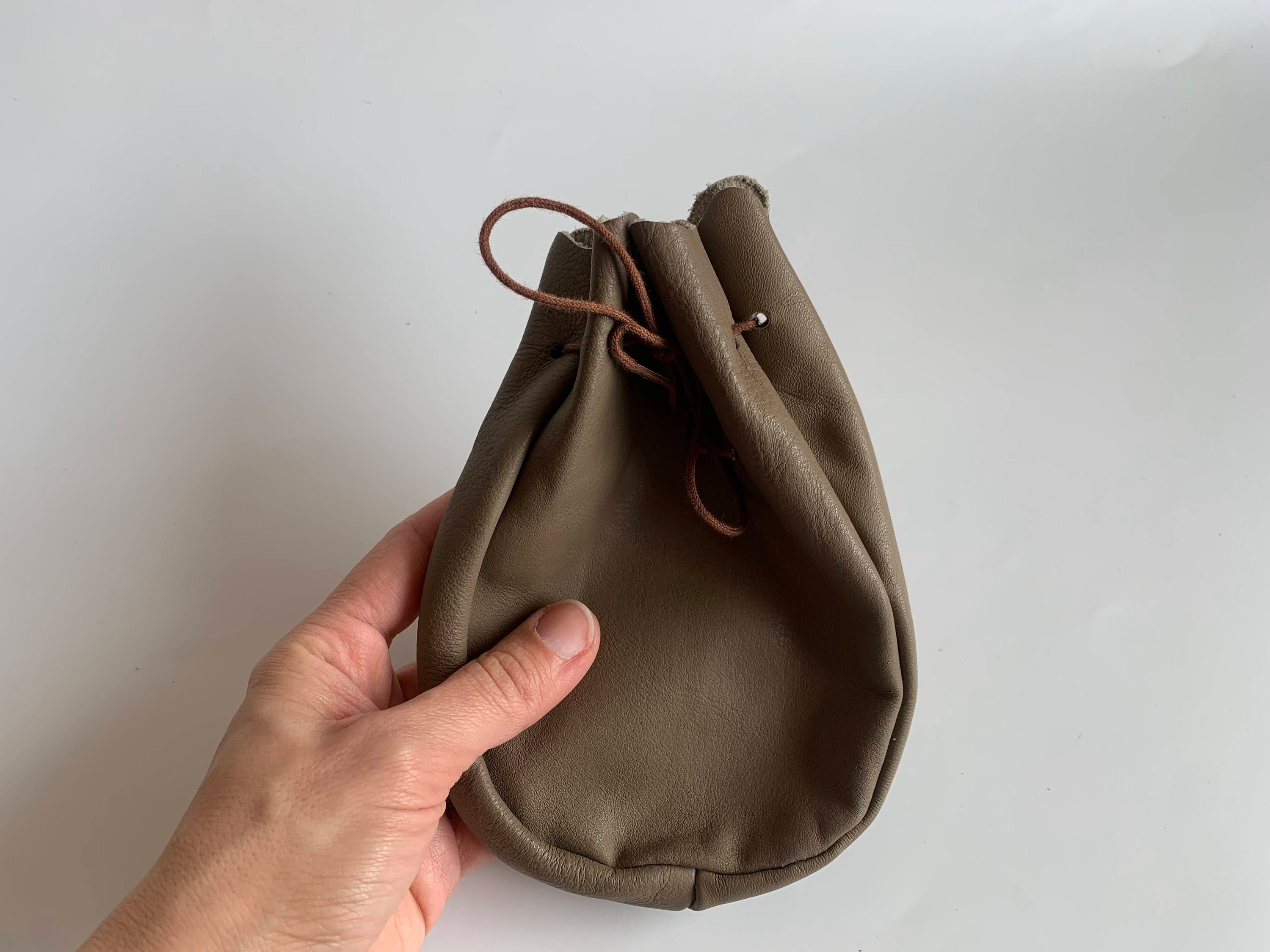 This is a vintage 80s simple and super cute taupe color soft leather coin purse with drawstring closure. This miniature money pouch has one compartment. As there is no lining inside, you can feel the suede leather inside. This small leather drawstring pouch can be used as a money pouch, dice pouch, jewelry bag, you name it.