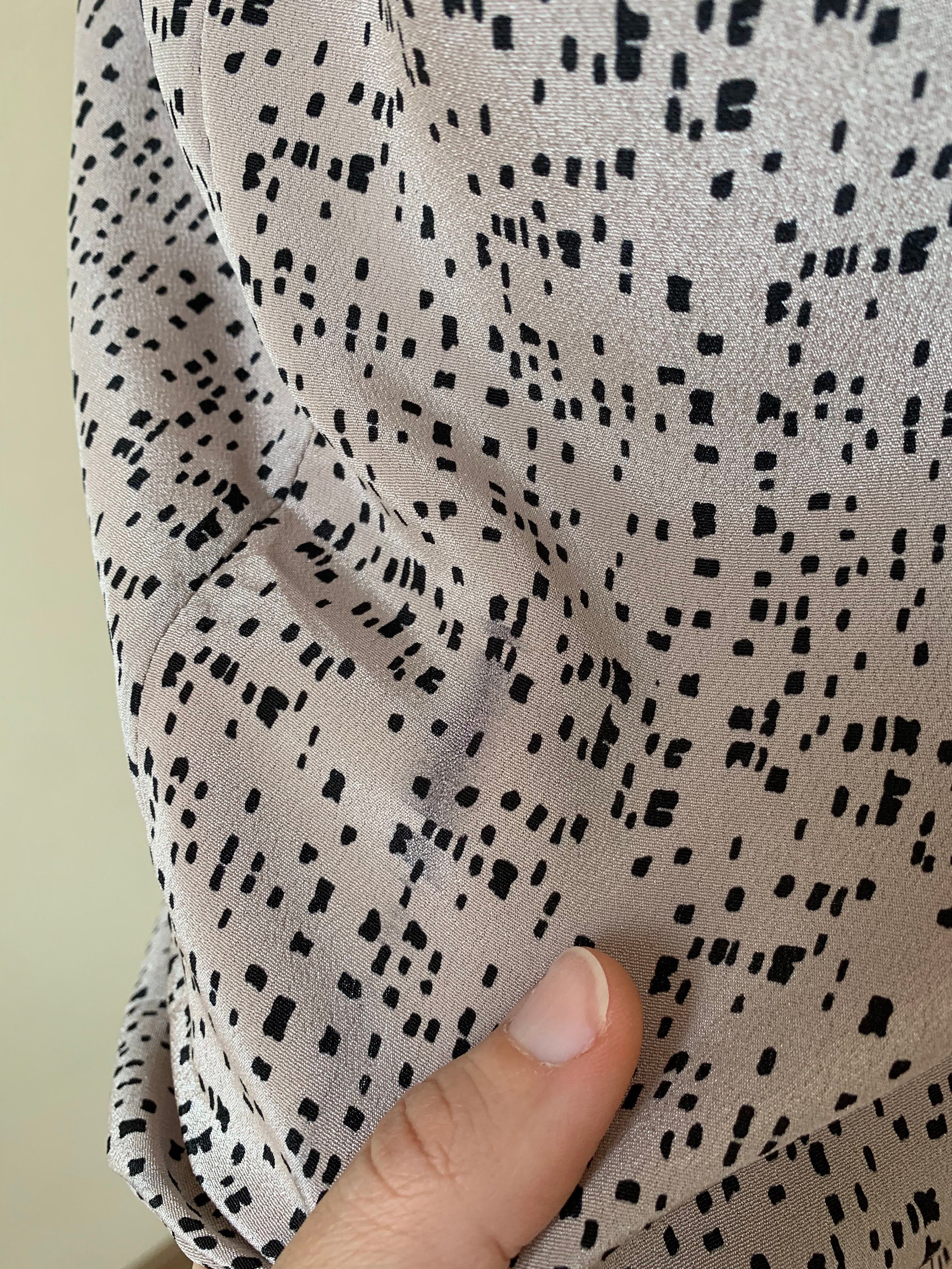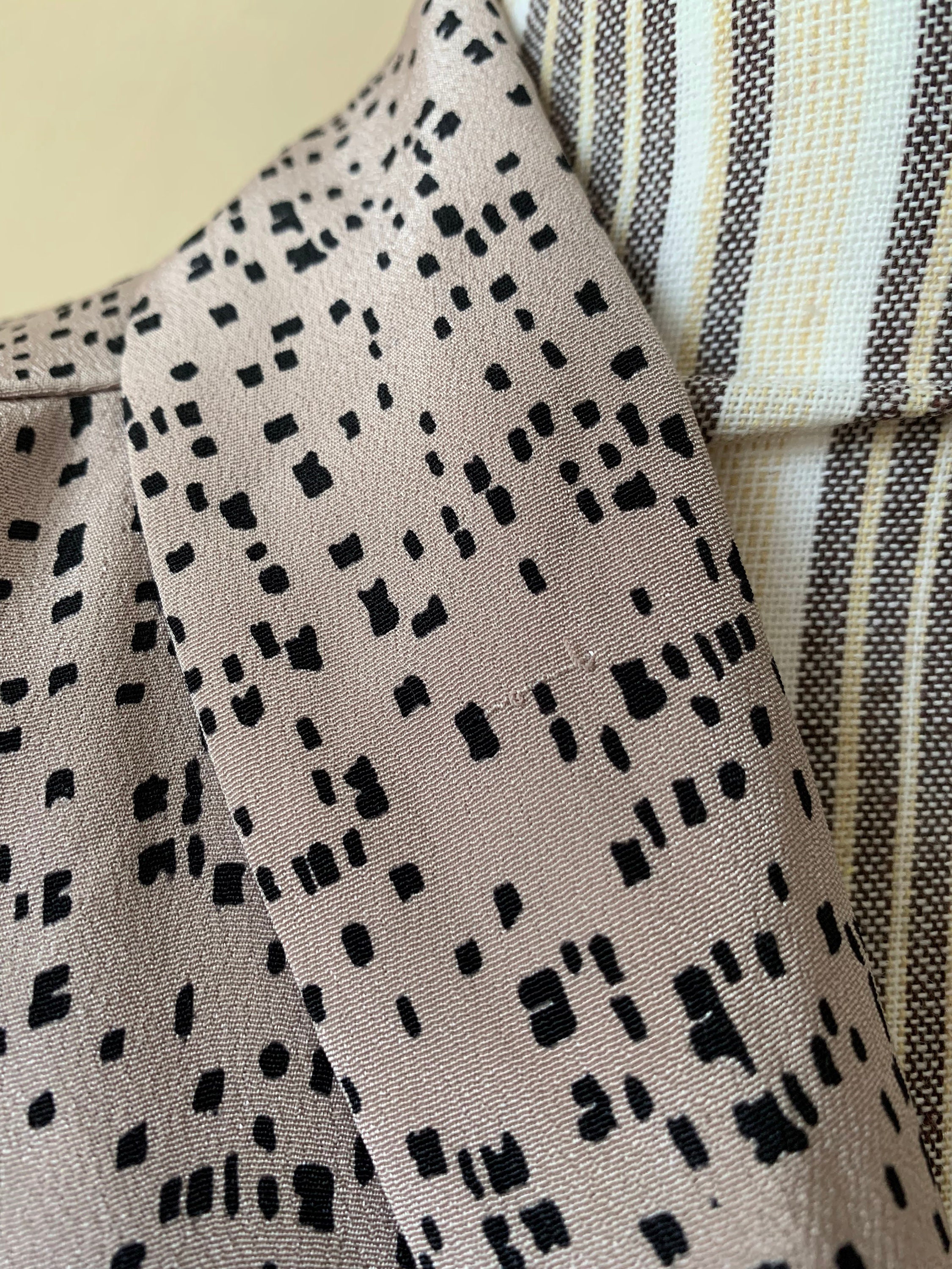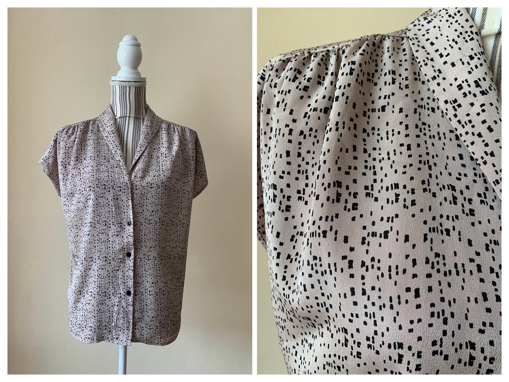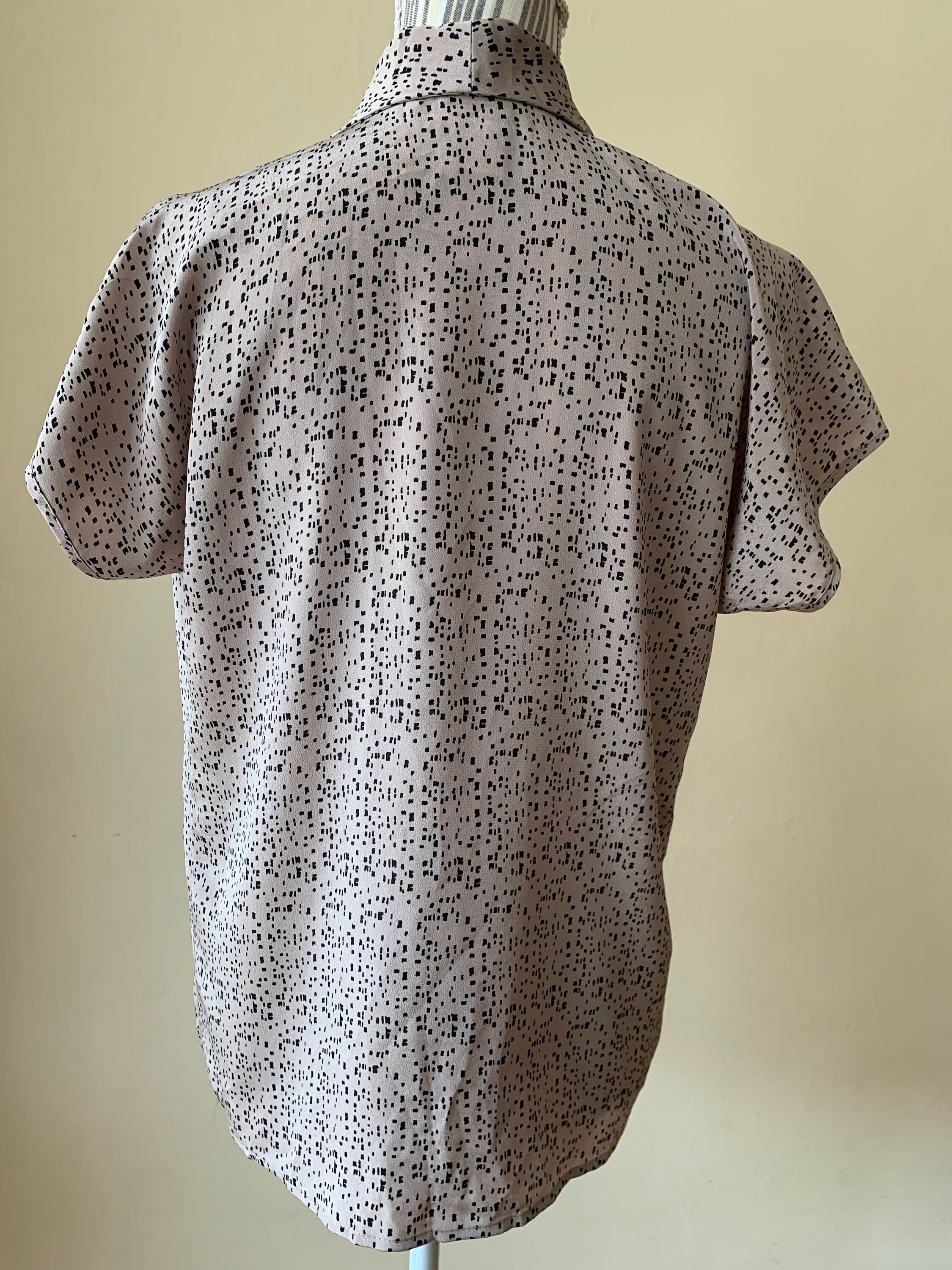 This is a vintage 80s geometric novelty print secretary shirt for women. This office blouse is in champagne beige color with black detailing. This feminine blouse has a relaxed fit silhouette and pleats at the shoulders. This oversized button up shirt is made of flowy lightweight 100% polyester fabric which has a beautiful shine when exposed to light. The size marked is 10 (I believe UK 10, which fits like EUR 36, US 6). This loose fit elegant blouse fits like size M. Please check the measurements below.