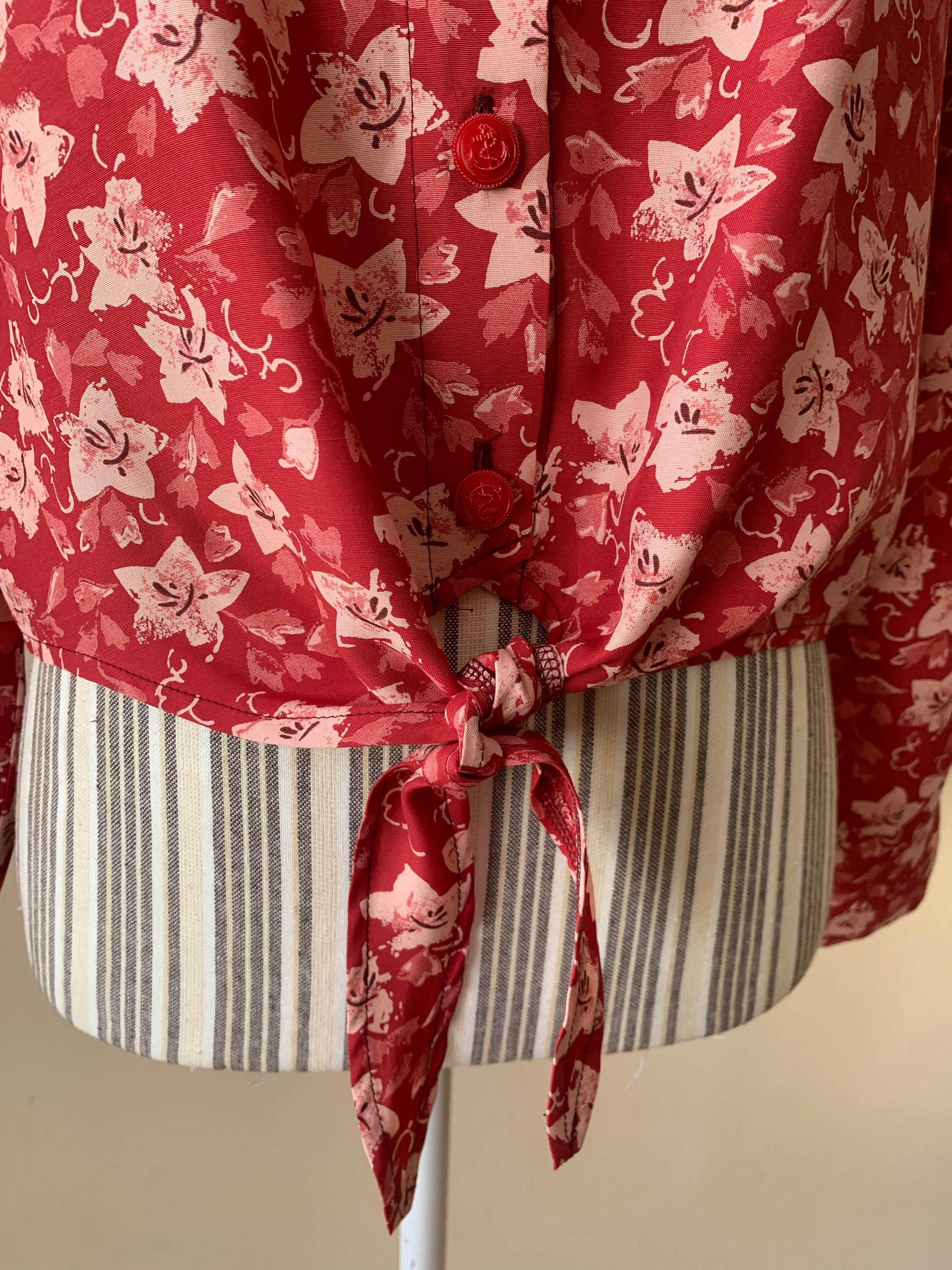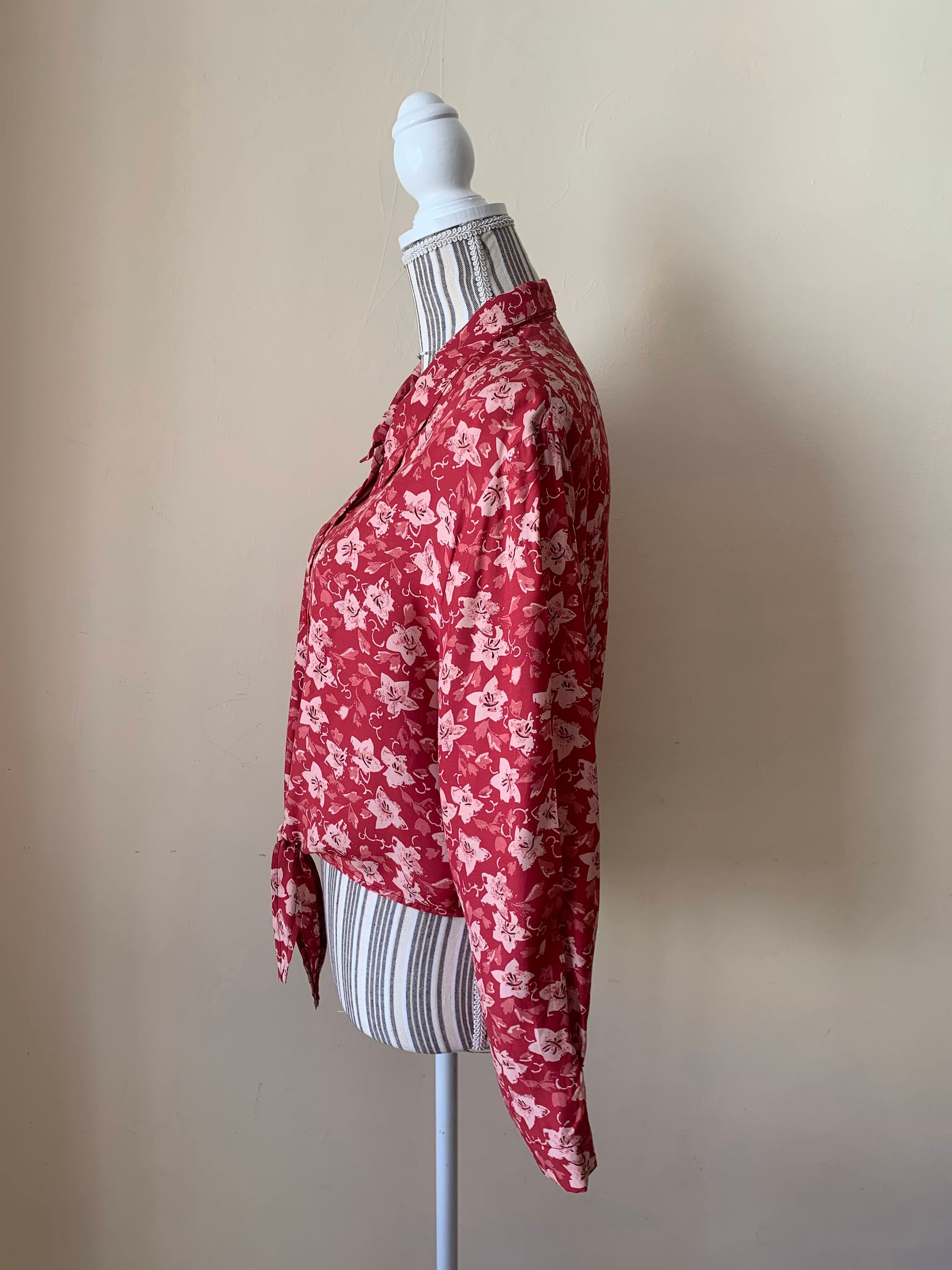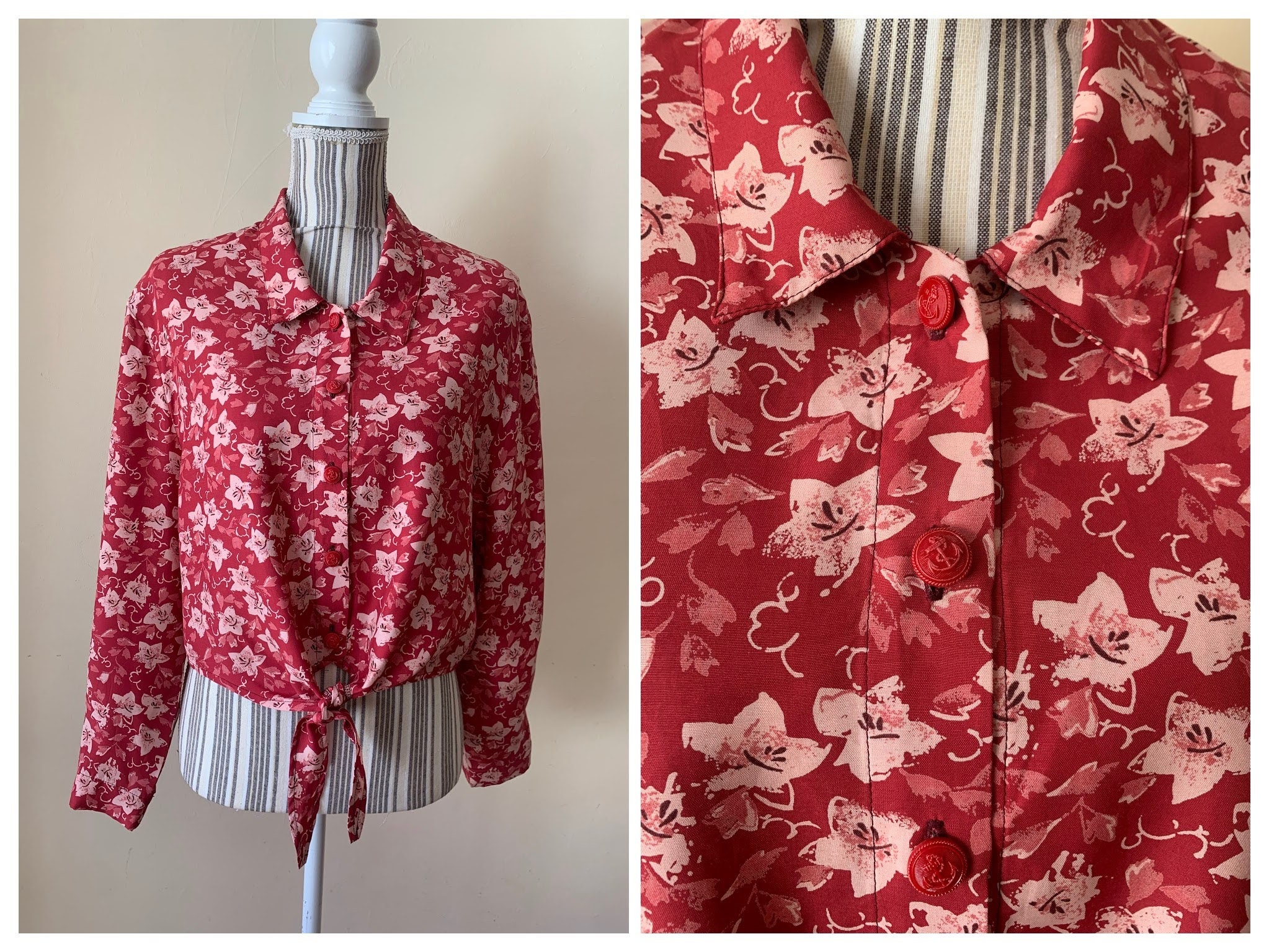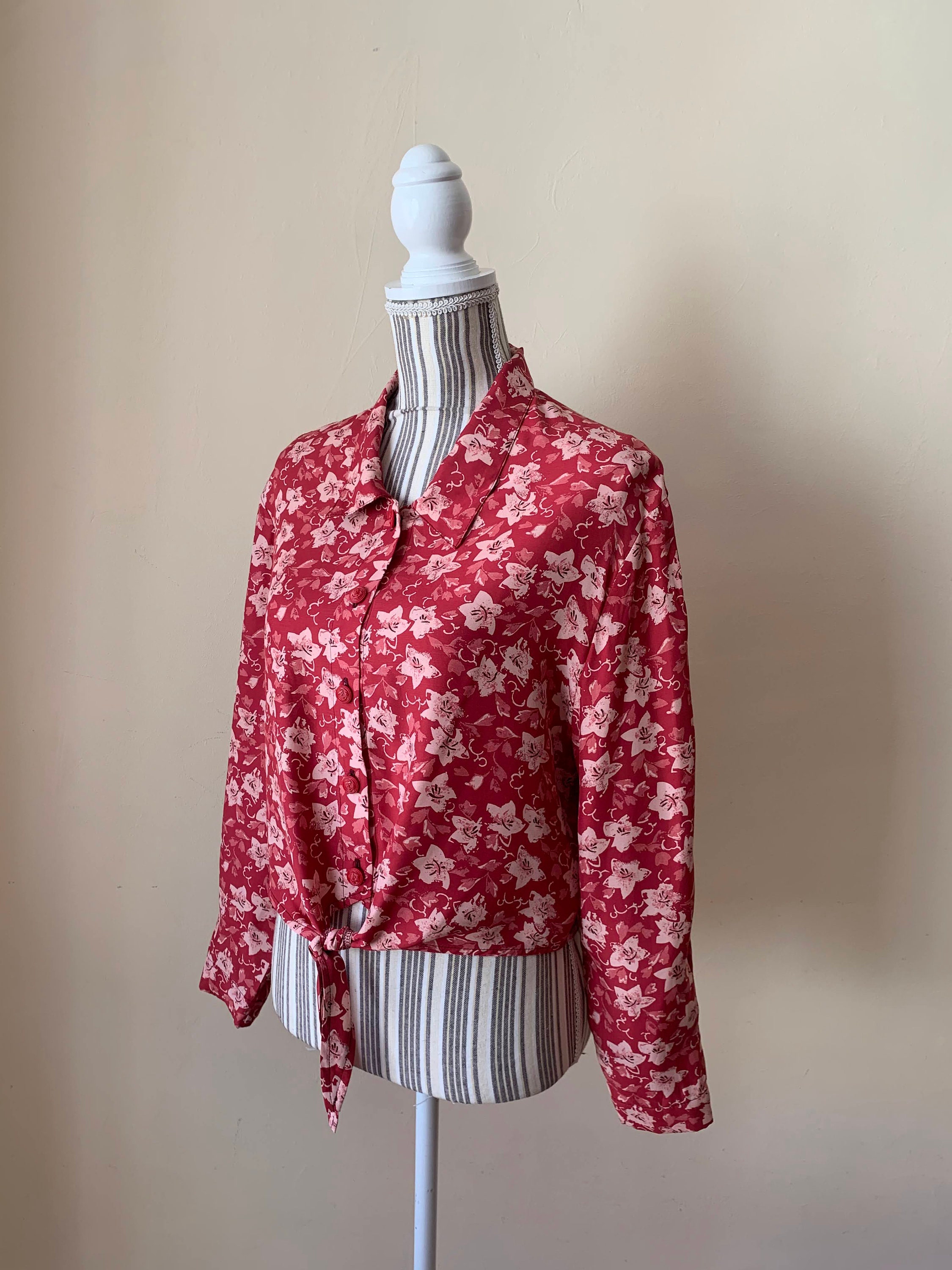This is a vintage 90s red floral button front shirt for women which ties at the front. Be unique and get all eyes on you with this pretty sexy button front cropped shirt. This tie front crop top has cut red buttons with anchors. The print of this long sleeve collared shirt represents small pink flowers on bold red background. The silhouette of this red button front top is relaxed. This loose fit blouse has no tags or labels. The fabric feels like viscose, it is lightweight and has a nice flow, it is perfect for the spring summer season. There is no size marked, however this tropical print shirt fits like size M or L.